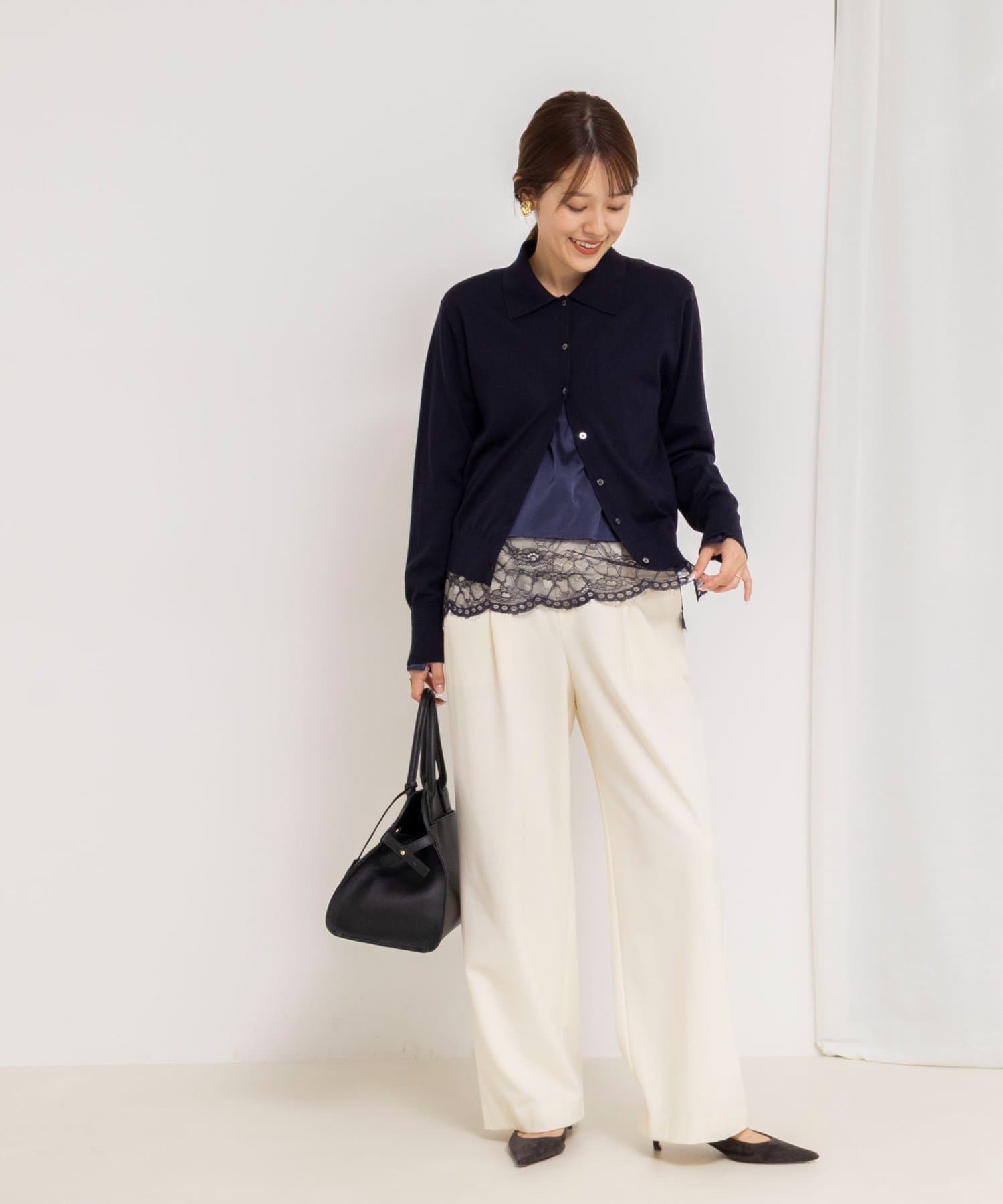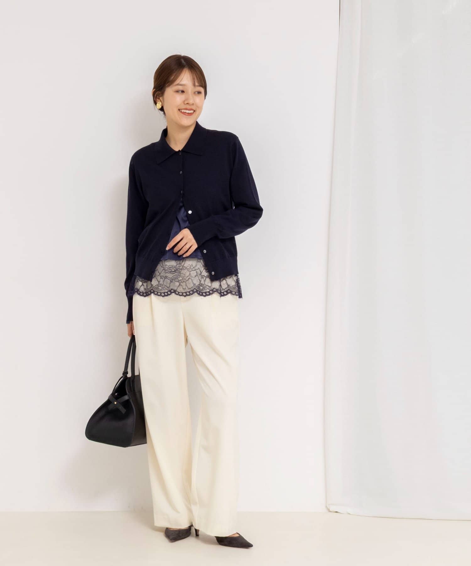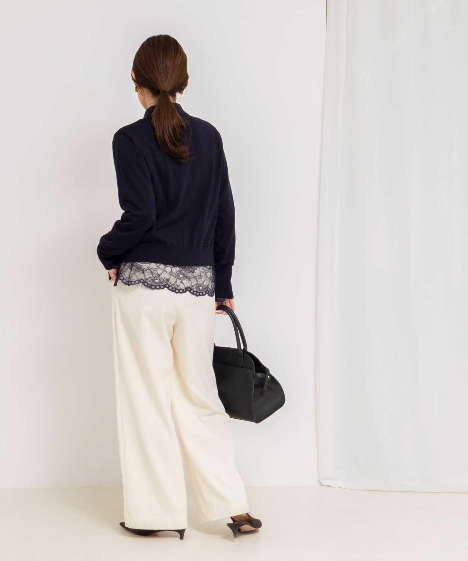 ・あえて衿ぐりは広めにし、合わせるニットの衿ぐりを選ばないラインに