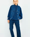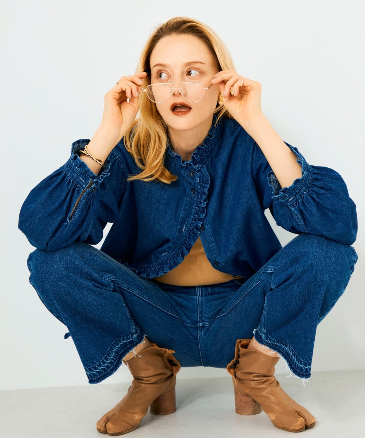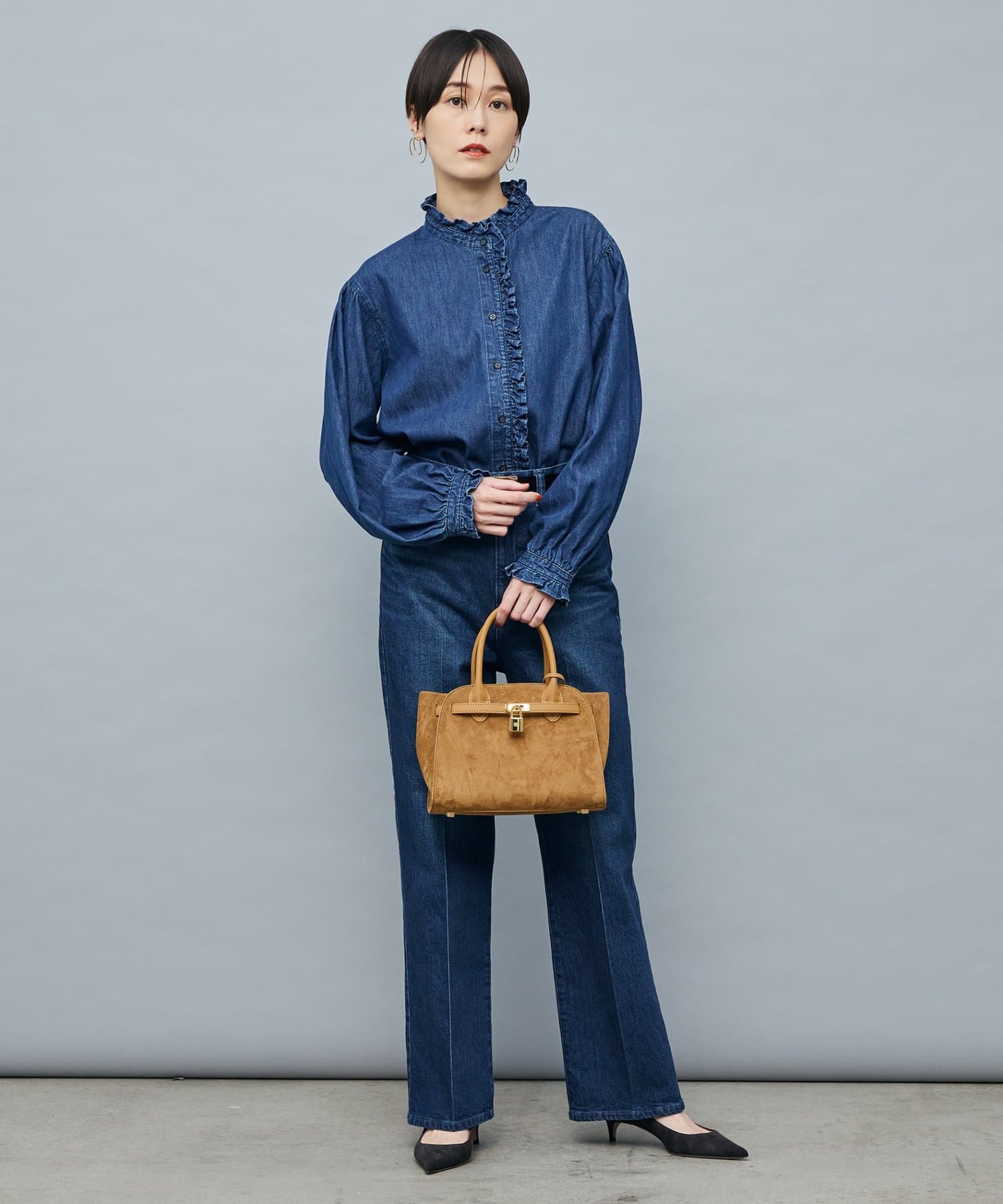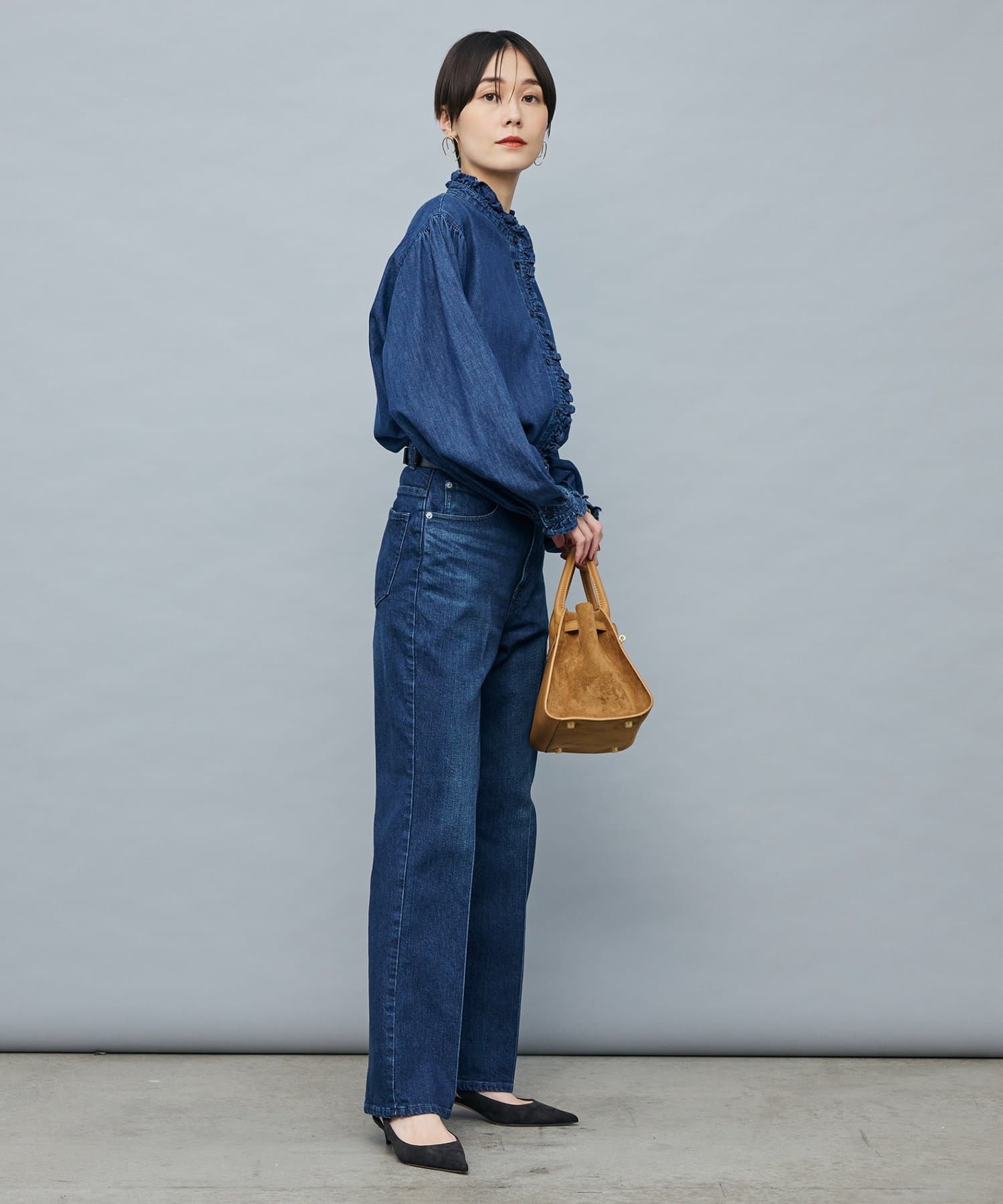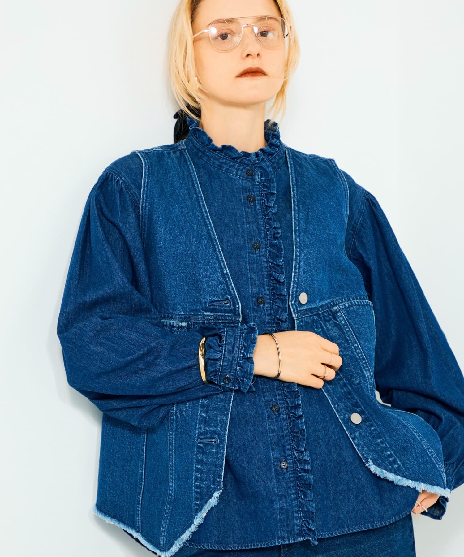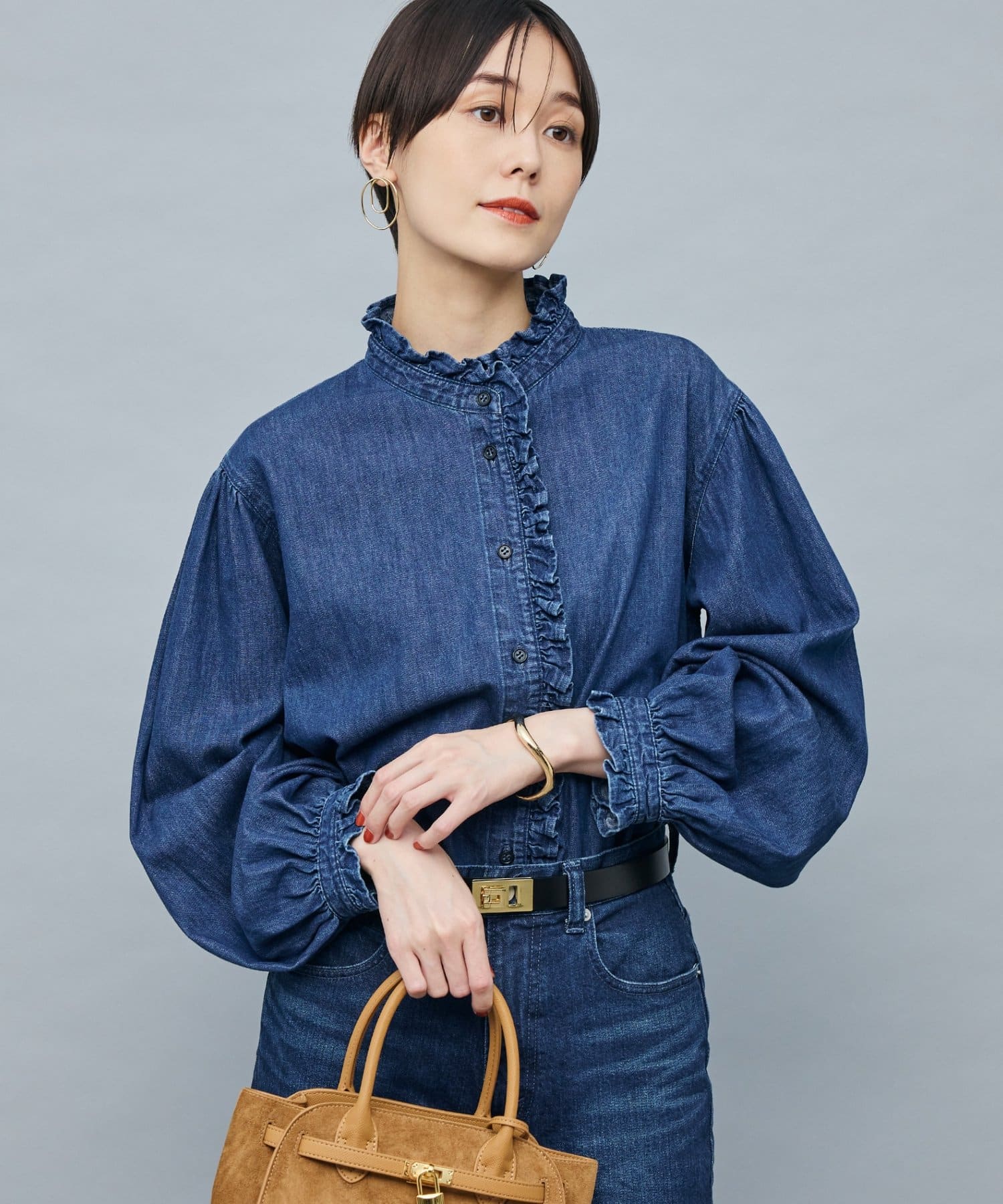 ・袖のボリュームとスタンドフリルがポイントのデニムシャツ