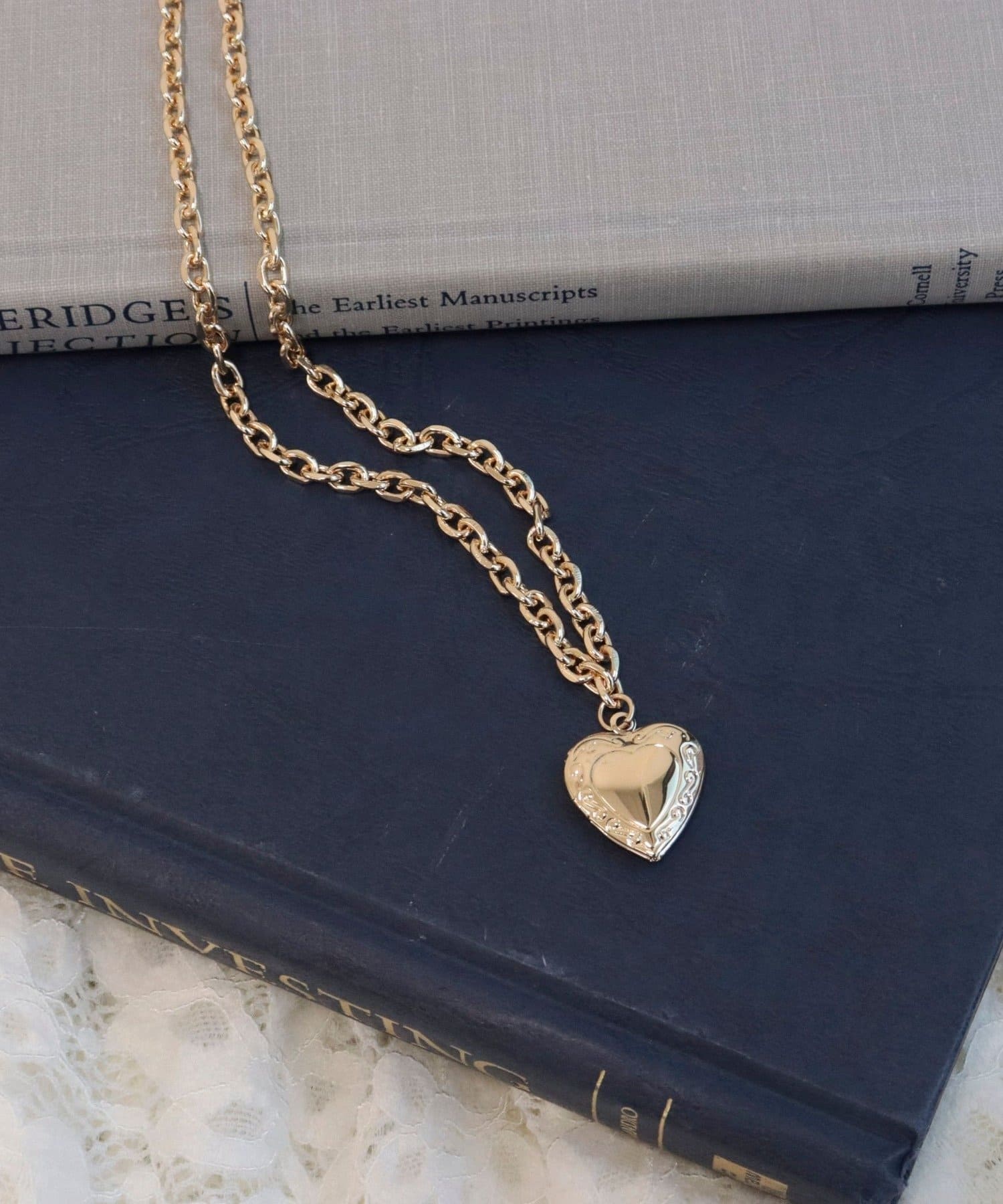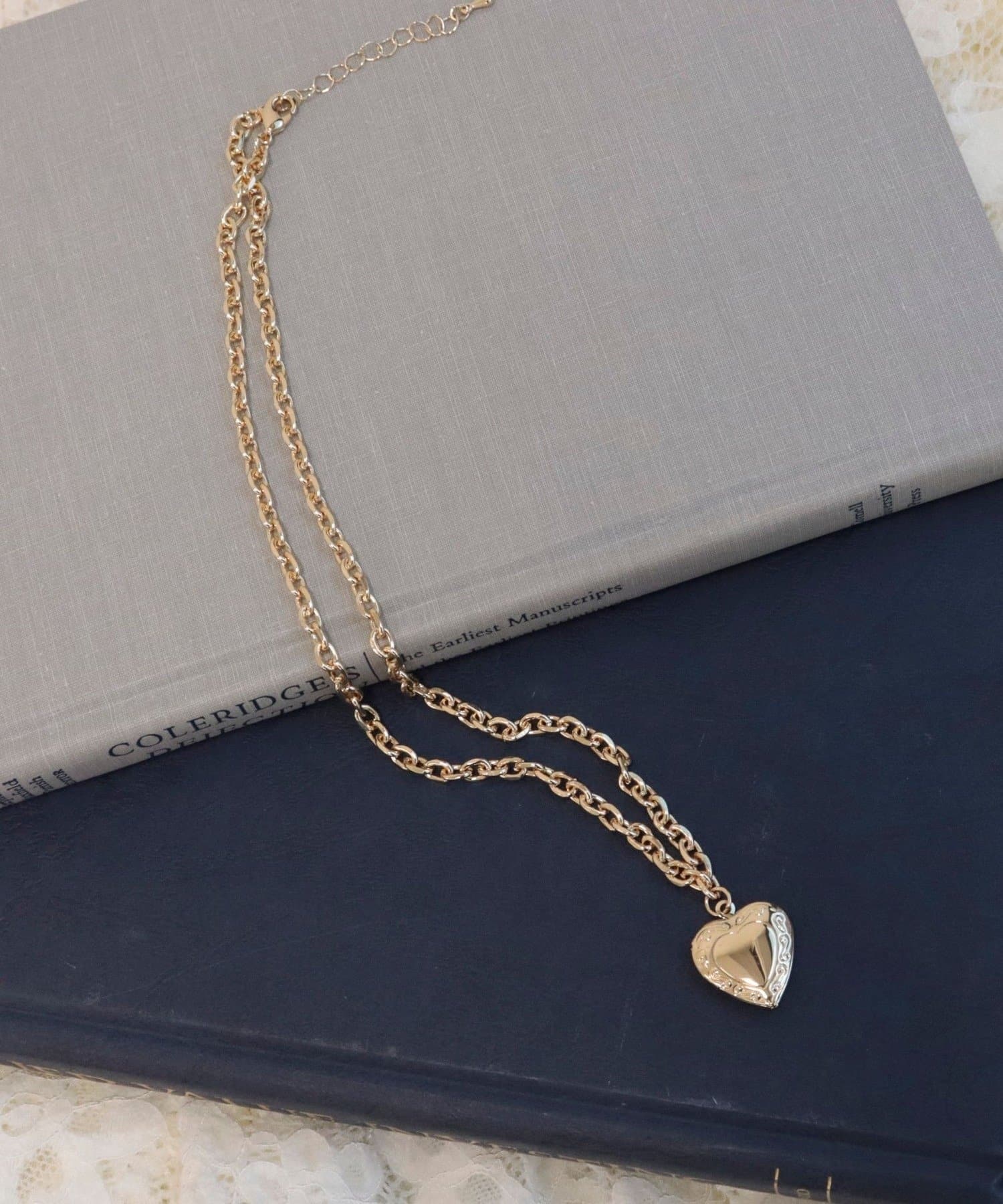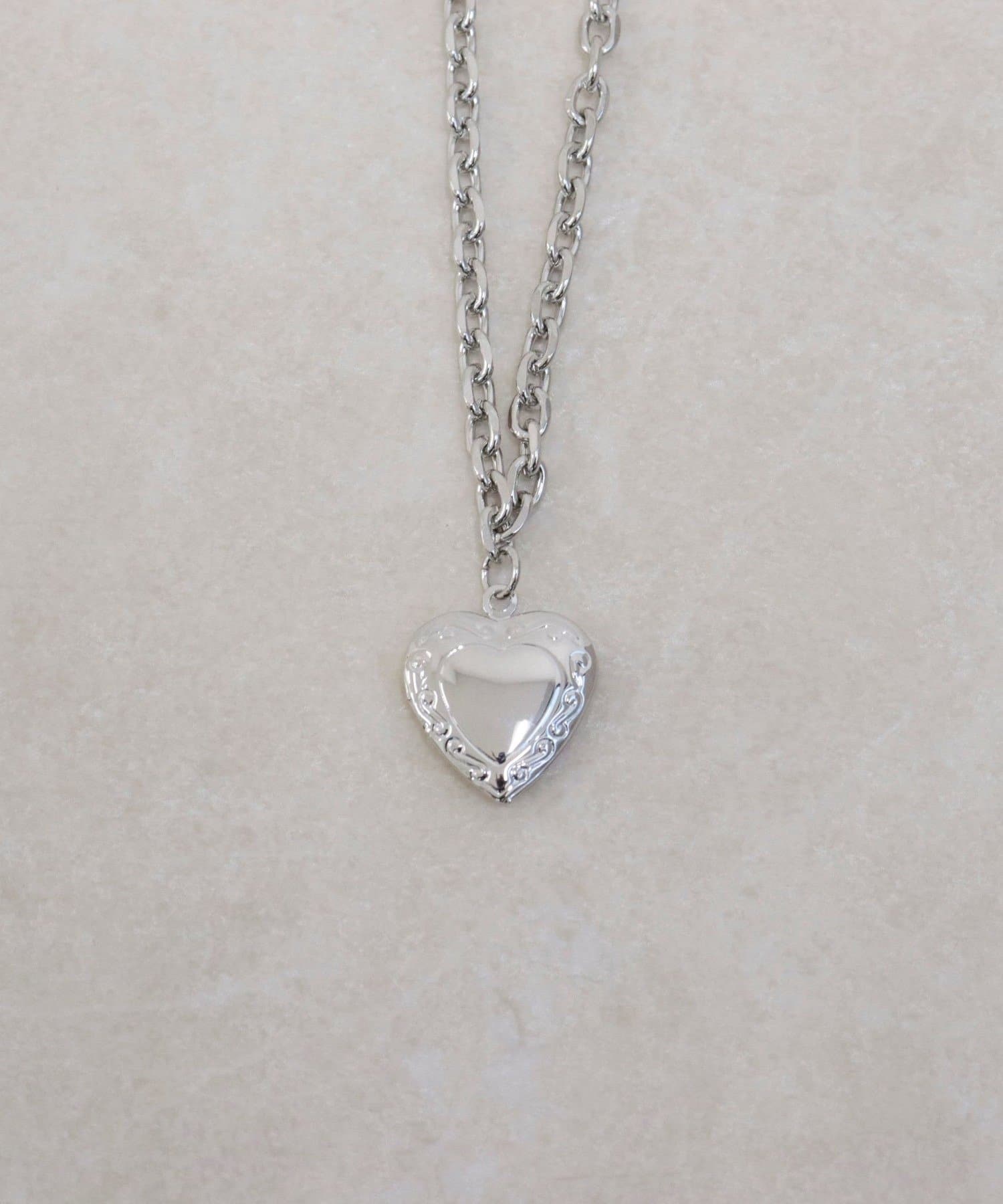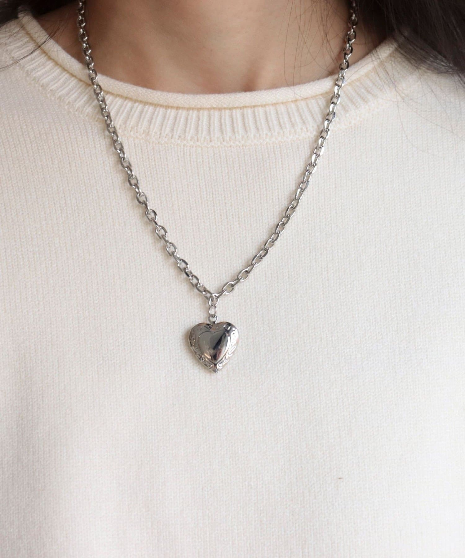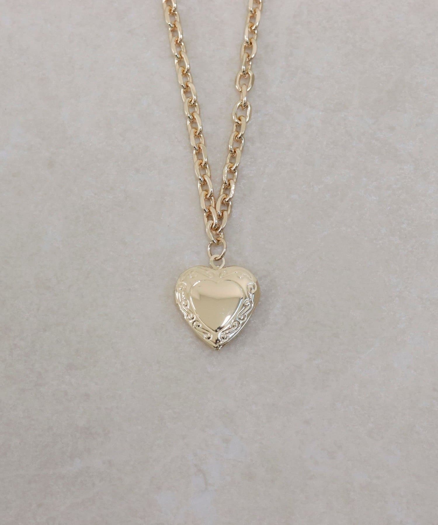 ・ボリューム感のあるチェーンが首元にさりげない存在感を添えるハートロケットペンダント