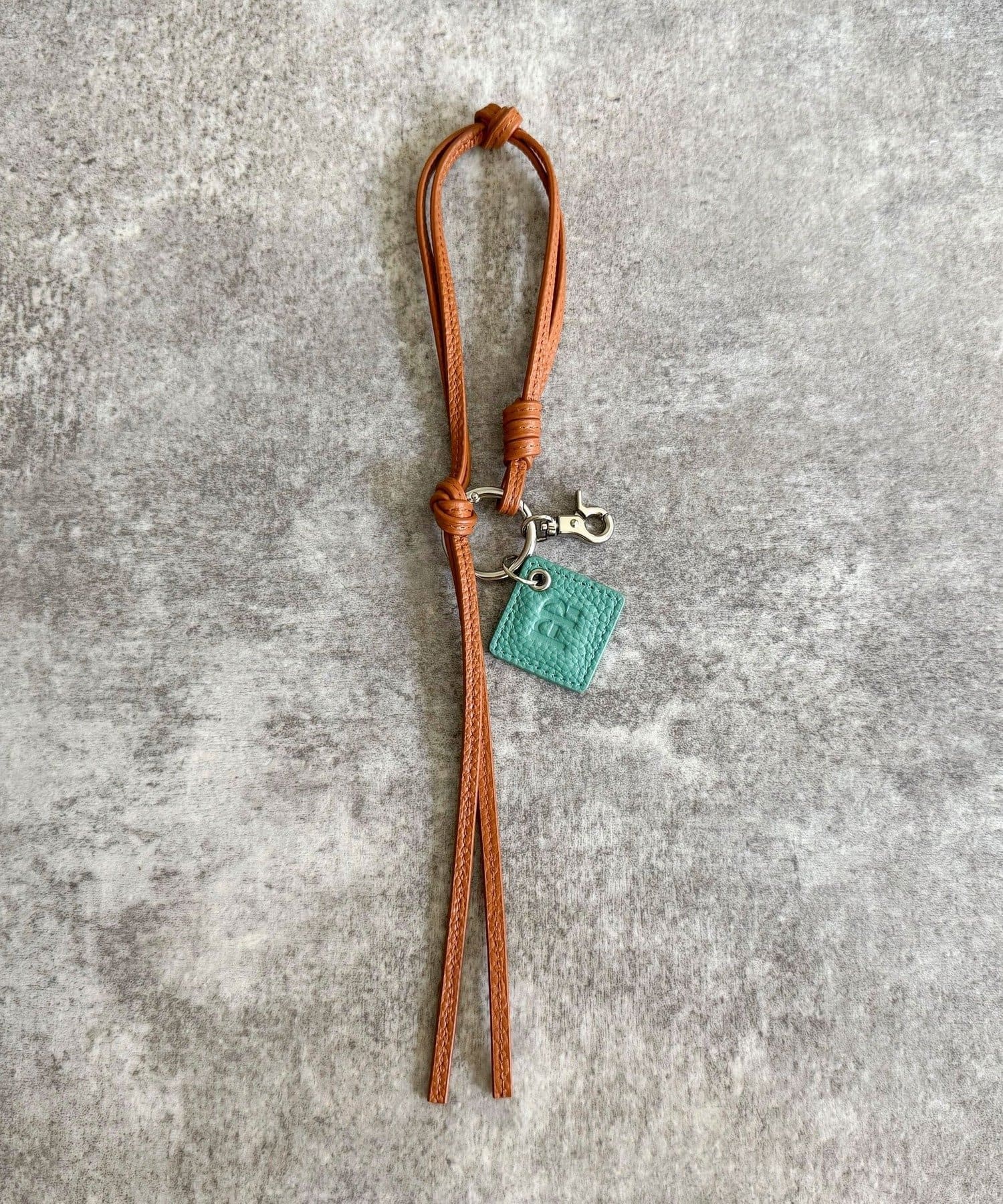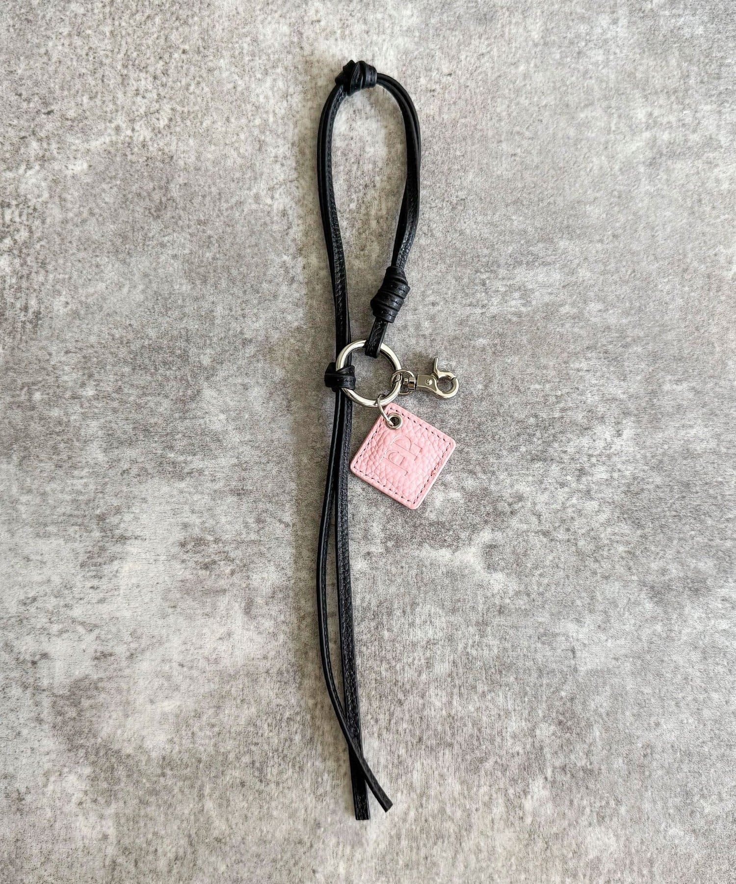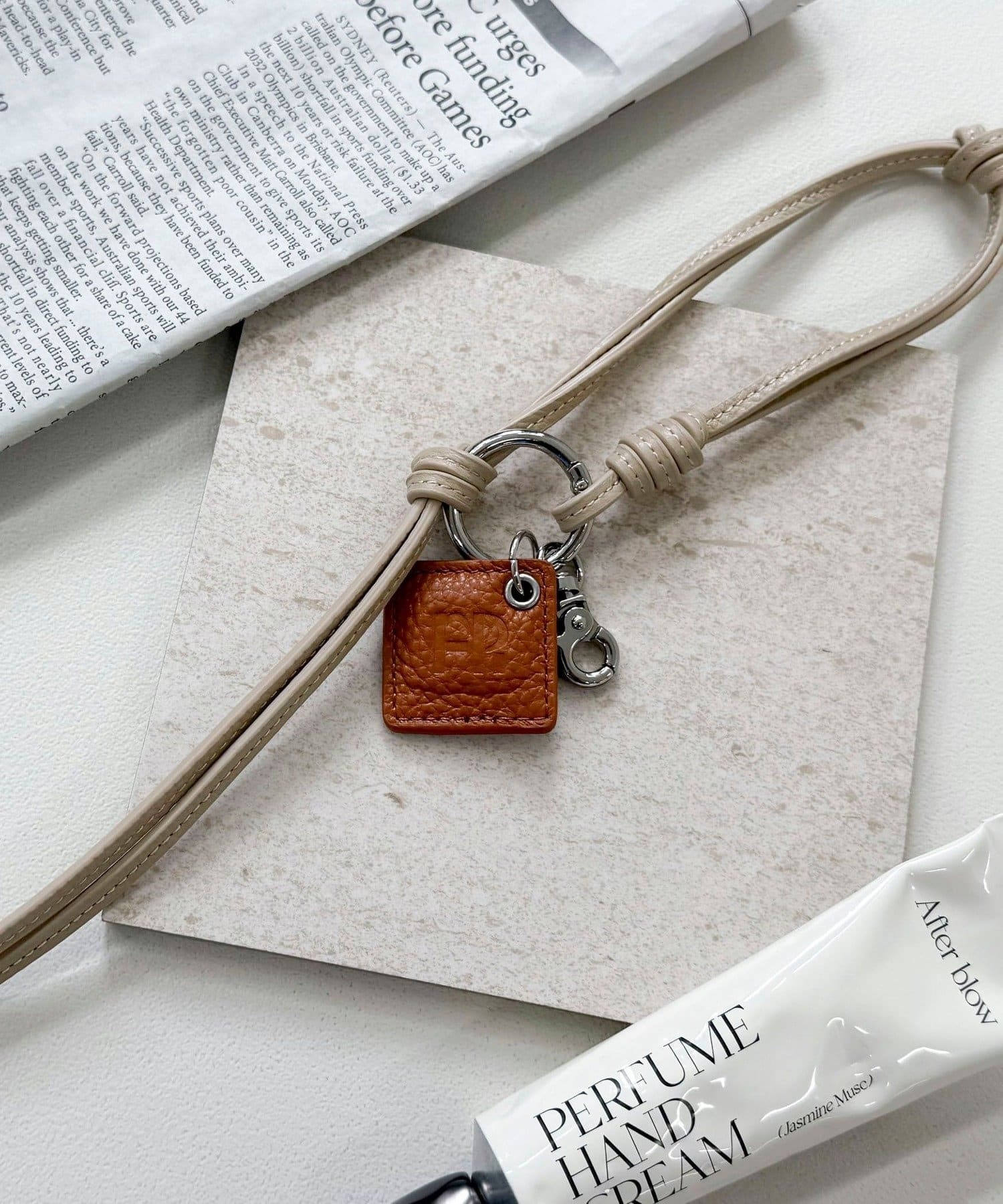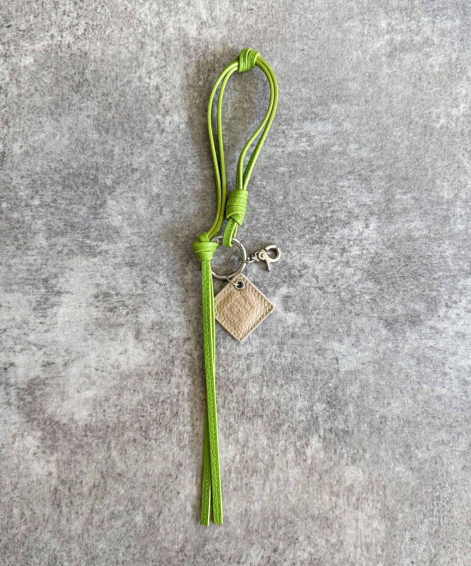 ・FRの型押しロゴプレートとタッセルが目を惹くレザーチャームです