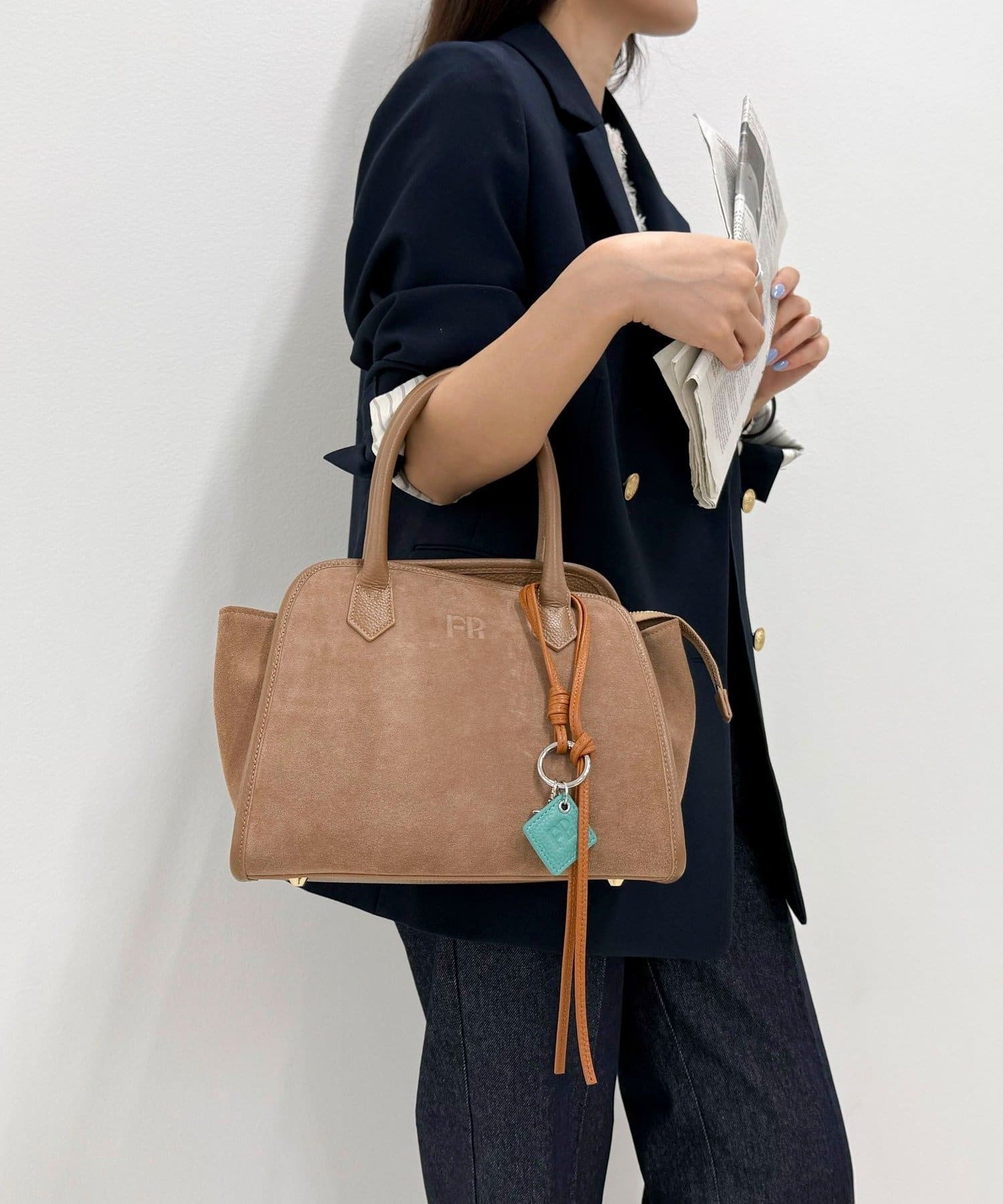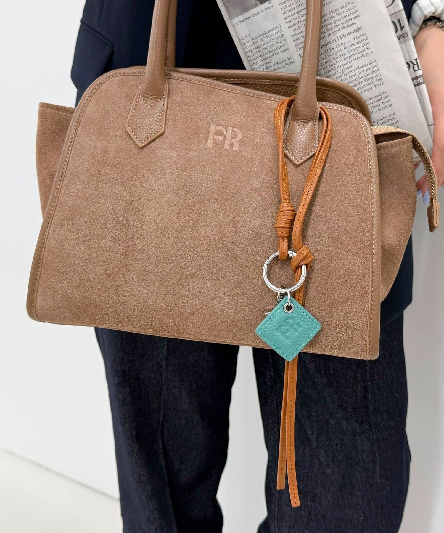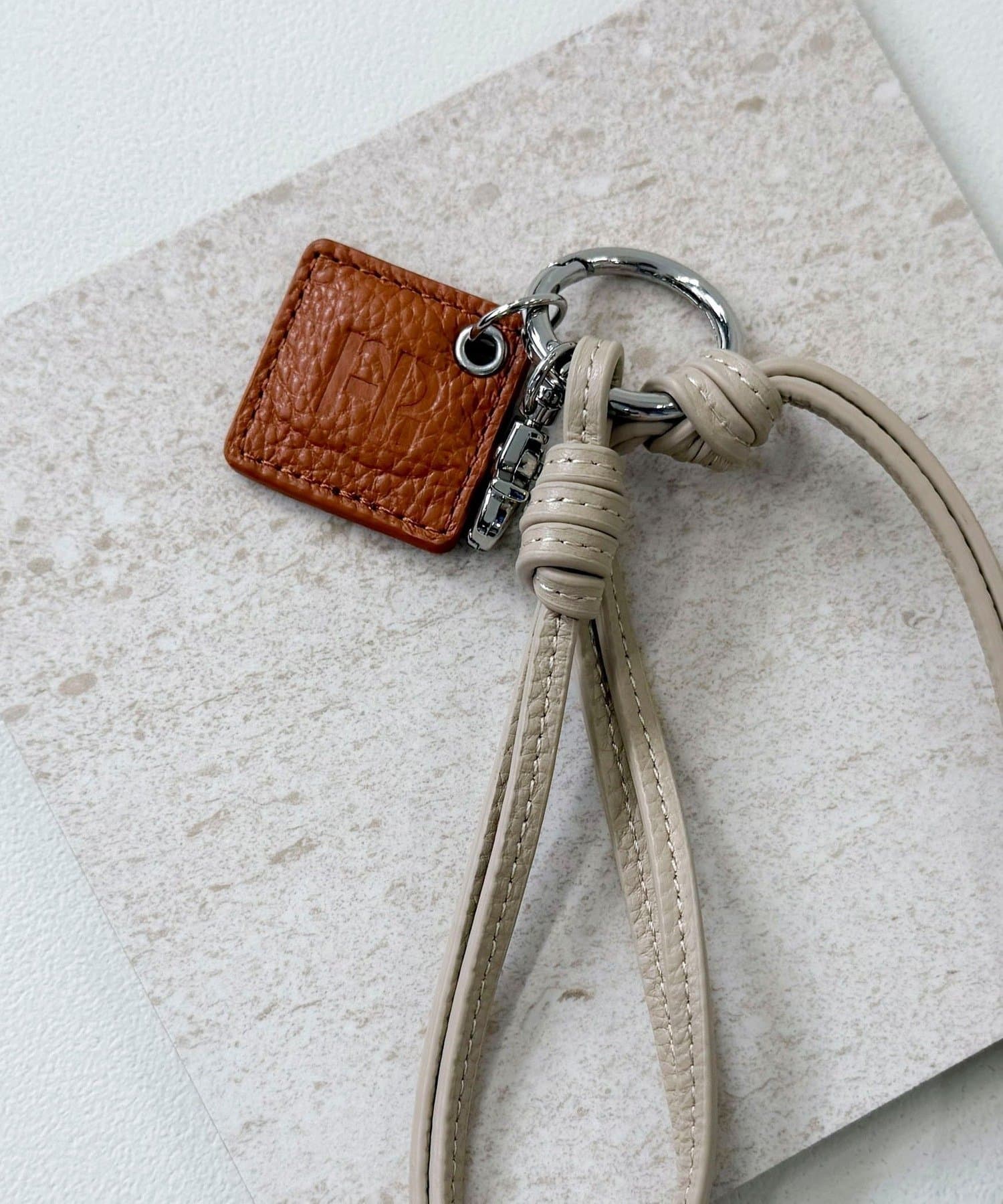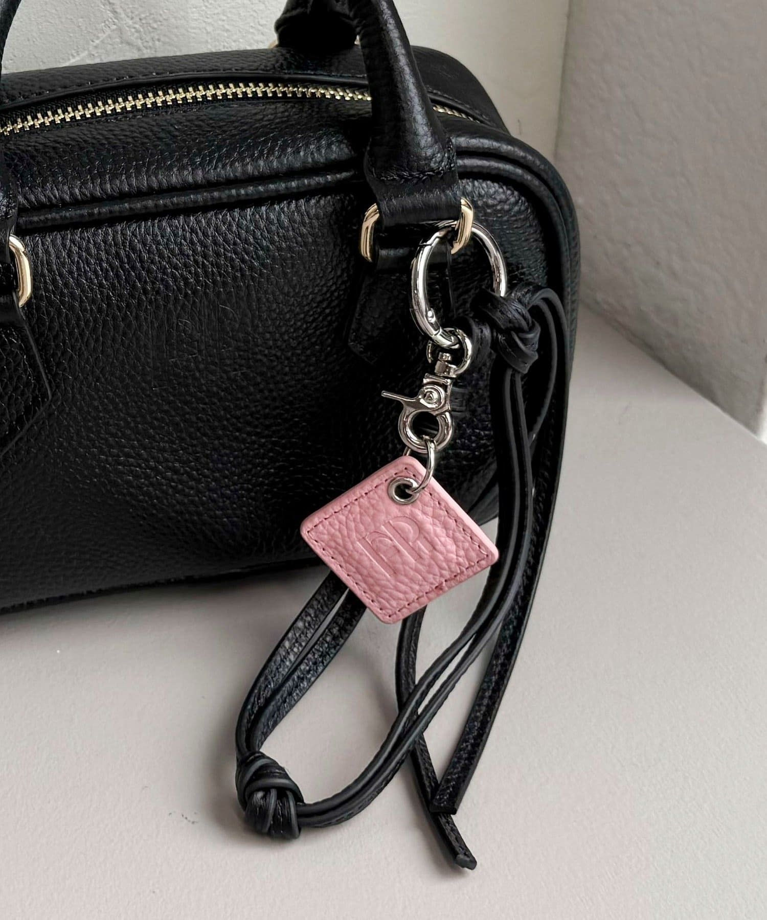 ・FRの型押しロゴプレートとタッセルが目を惹くレザーチャームです