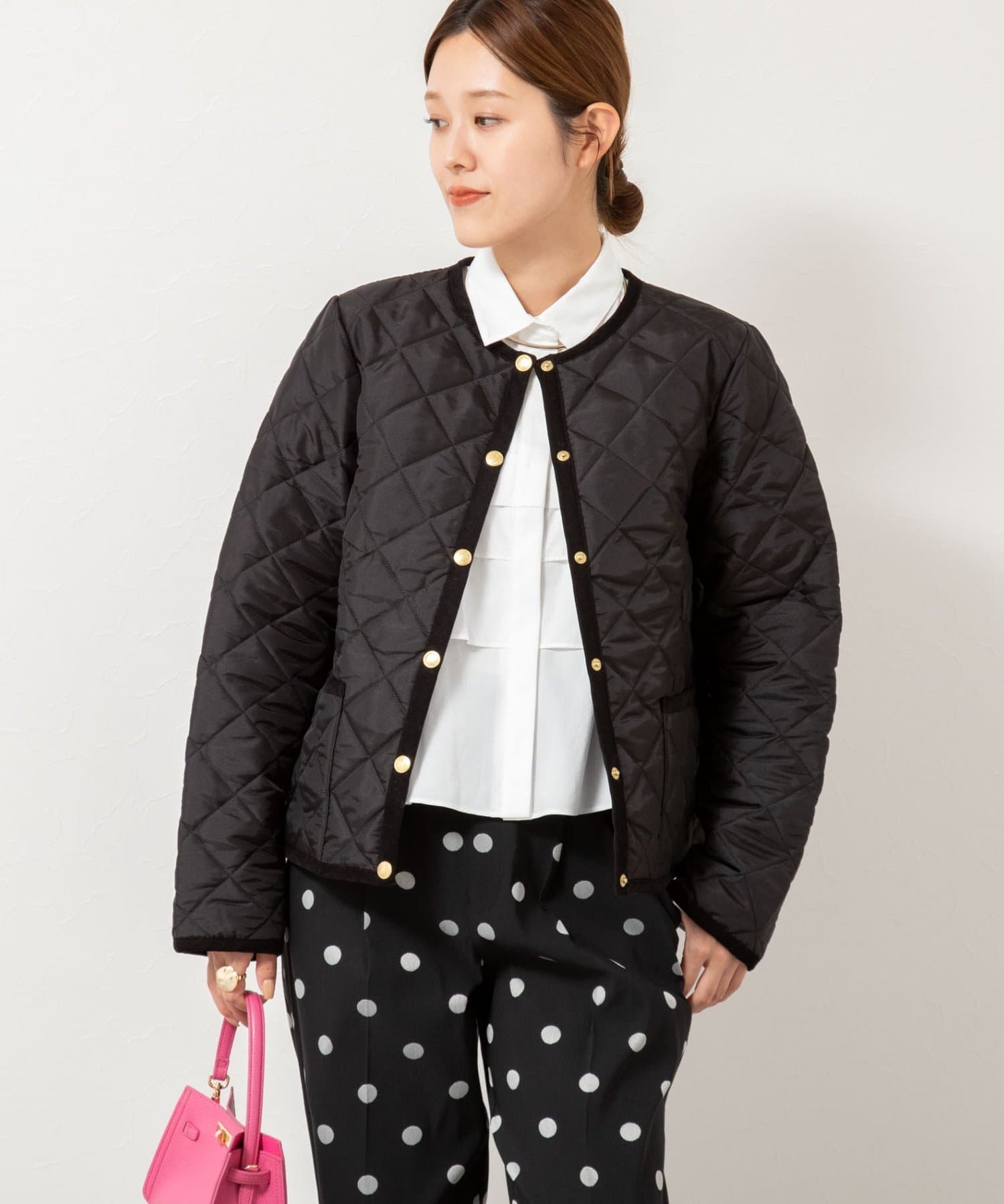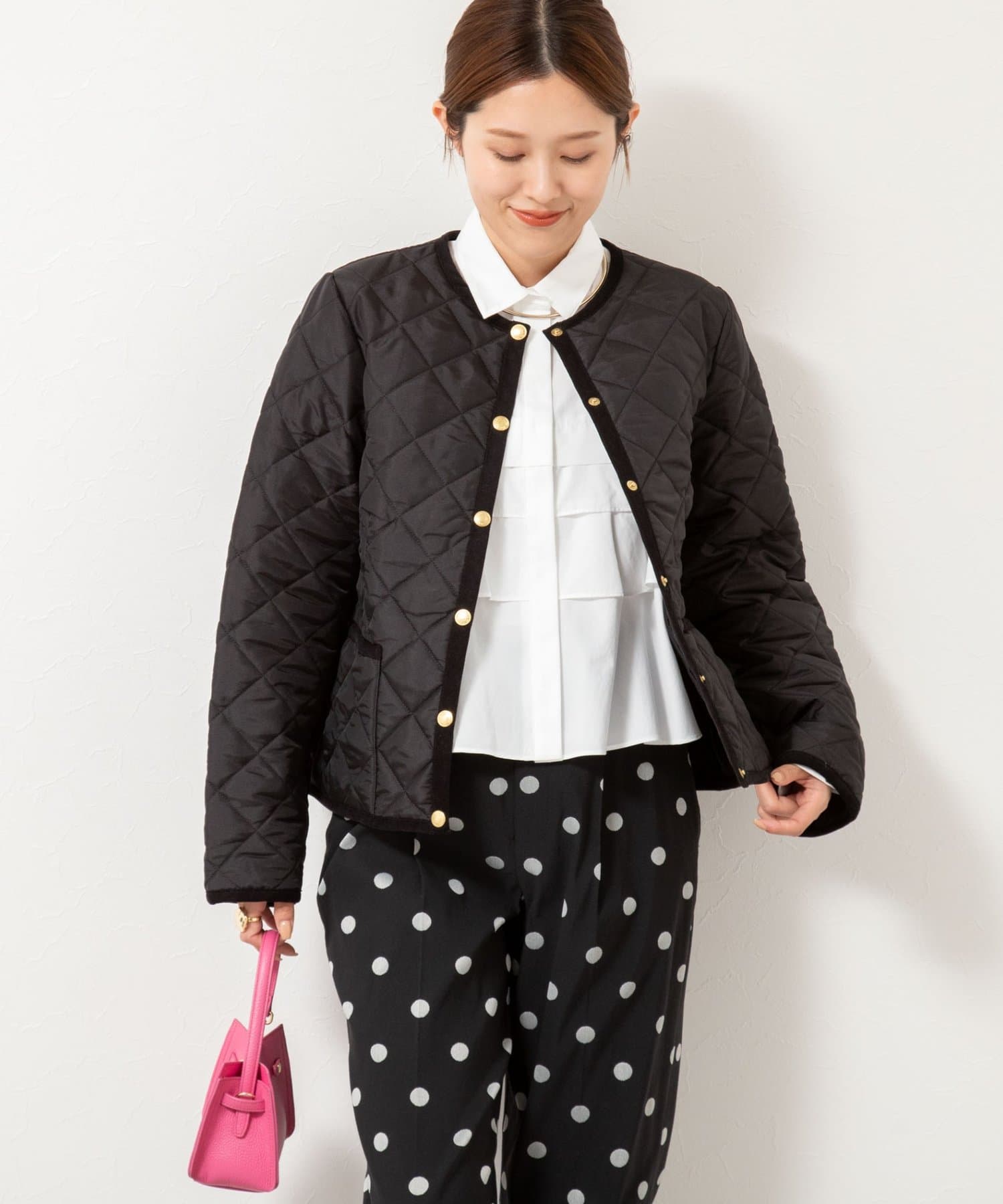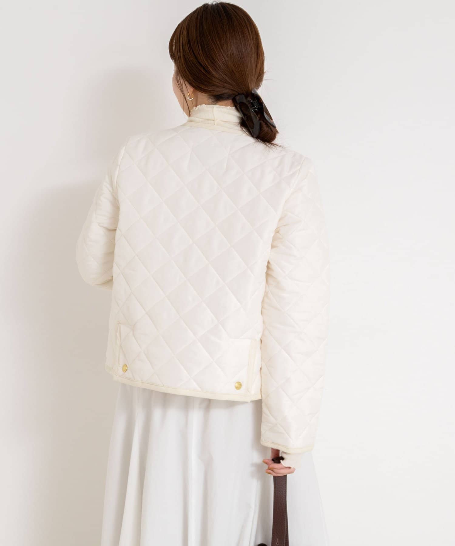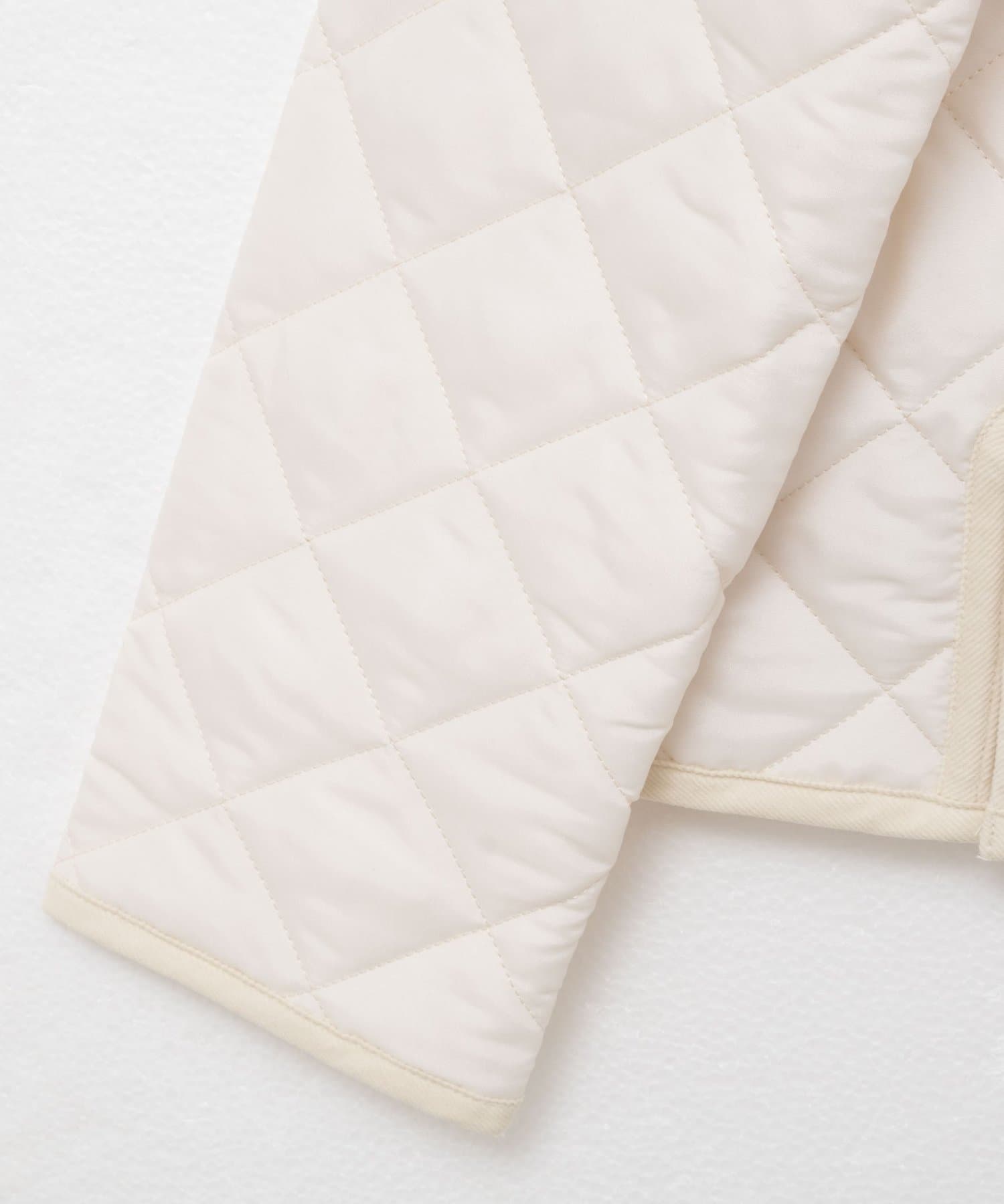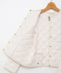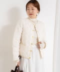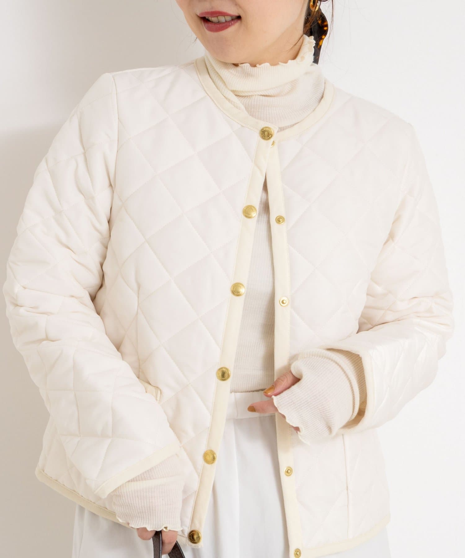・ショート丈でノーカラーのキルティングジャケットは、繊細なコーデュロイ製のパイピングや、あたたかみのあるゴールドのドットボタンで、リュクスなムードが魅力