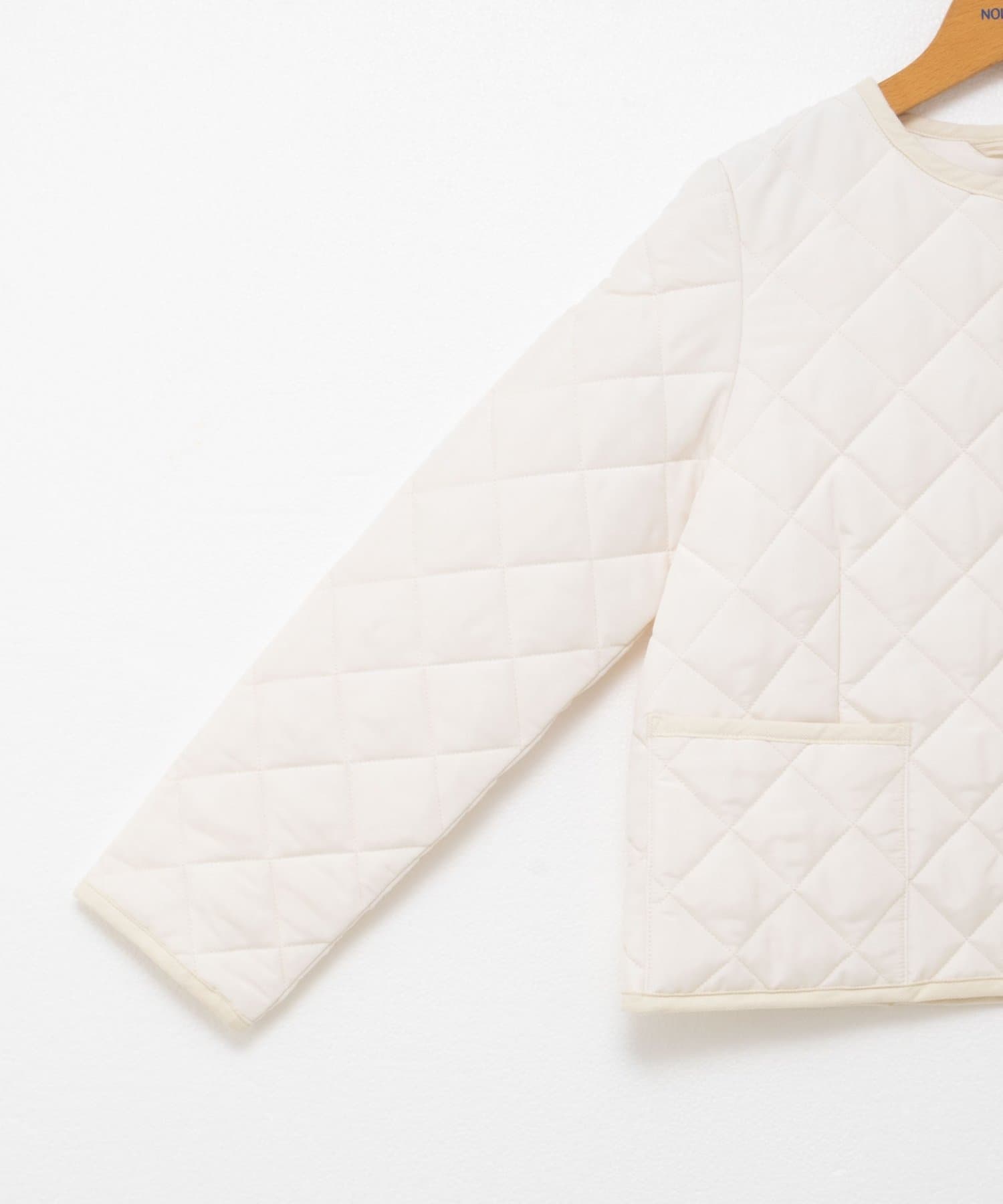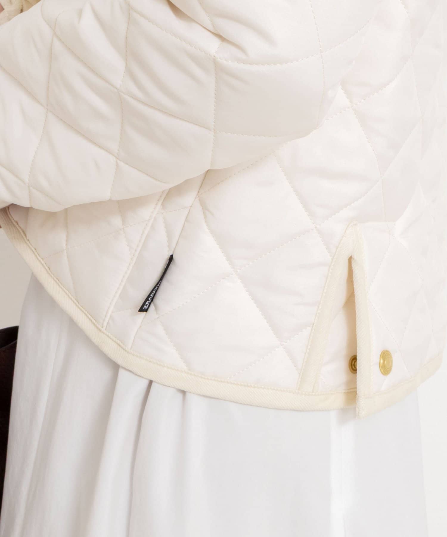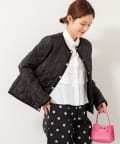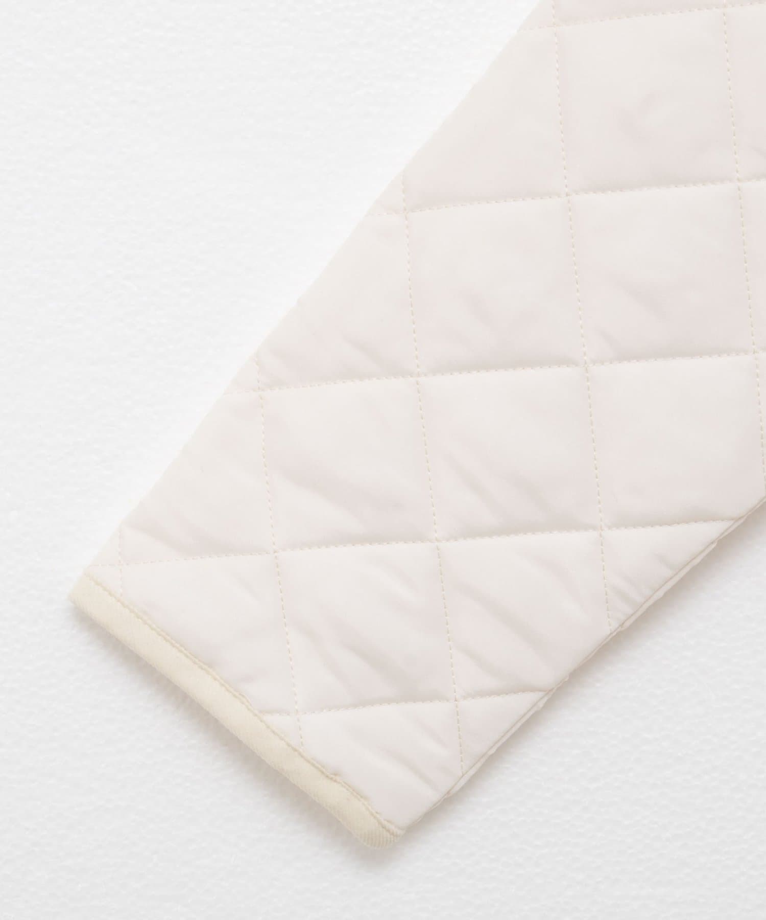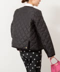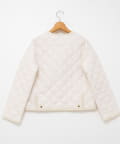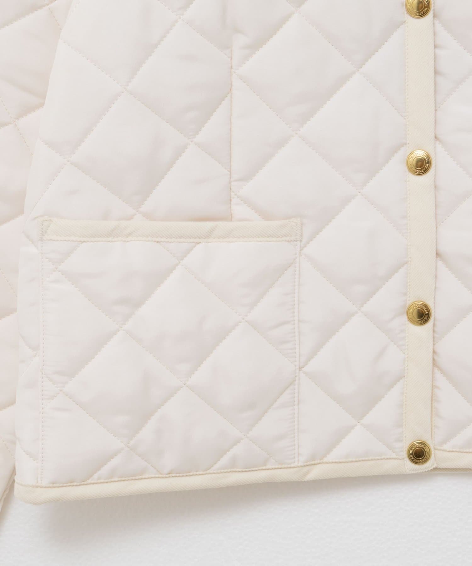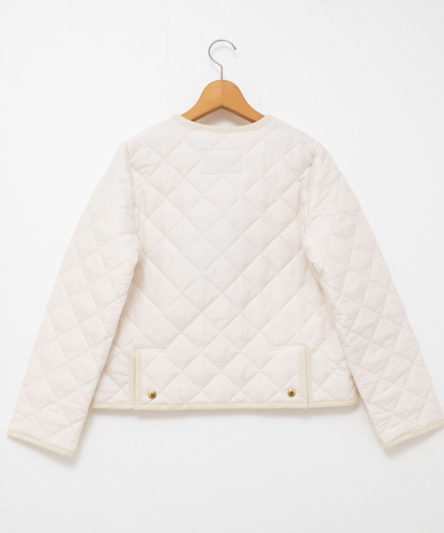 ・ショート丈でノーカラーのキルティングジャケットは、繊細なコーデュロイ製のパイピングや、あたたかみのあるゴールドのドットボタンで、リュクスなムードが魅力
