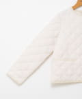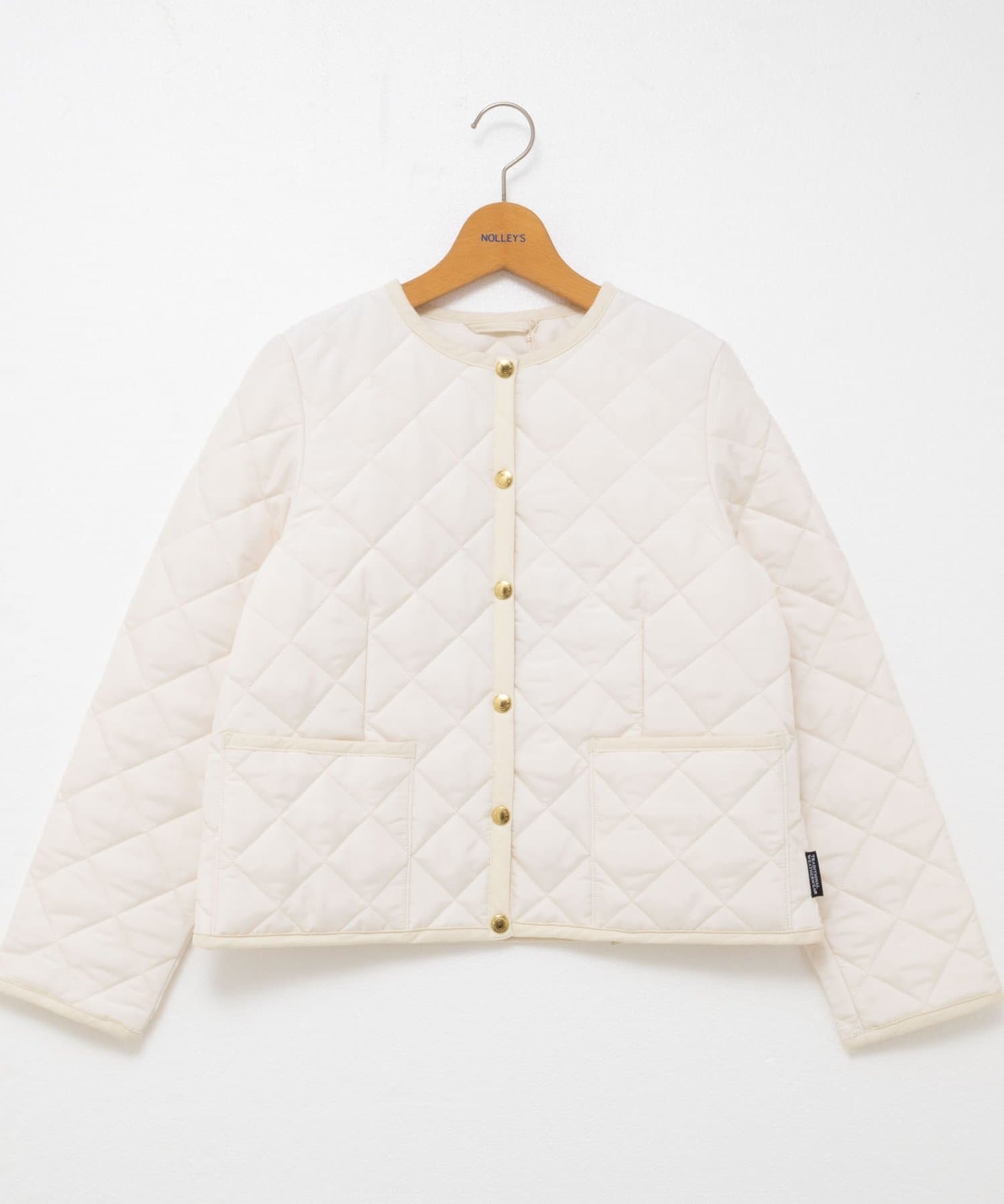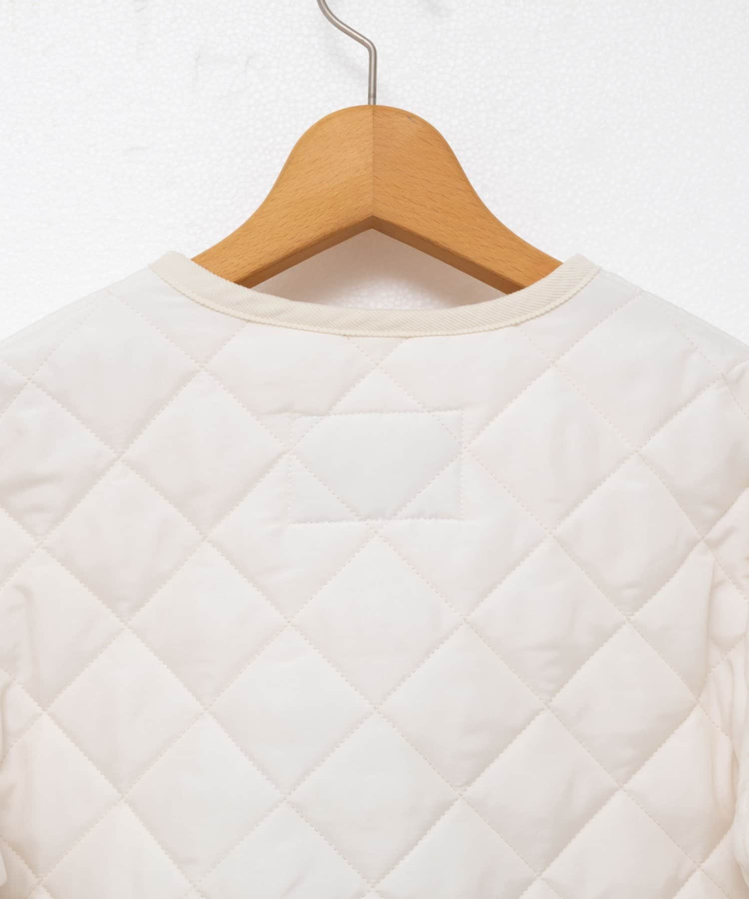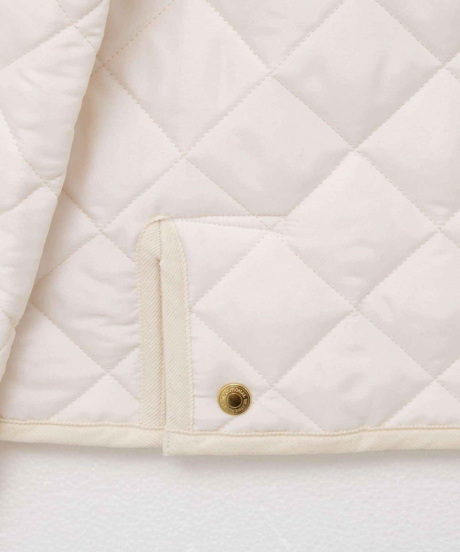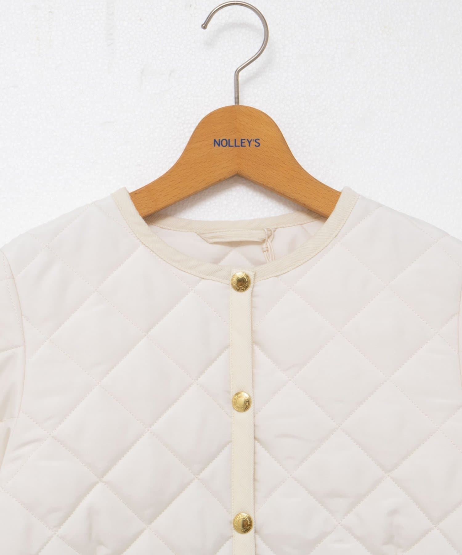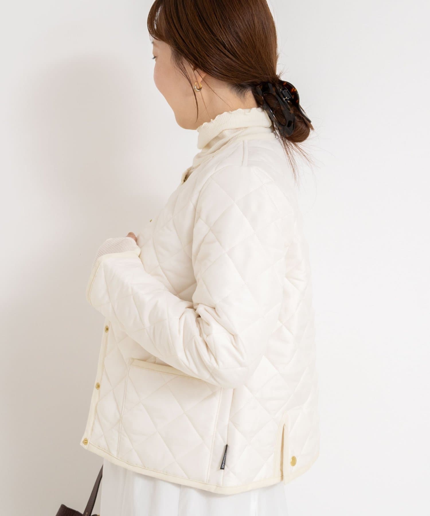 ・ショート丈でノーカラーのキルティングジャケットは、繊細なコーデュロイ製のパイピングや、あたたかみのあるゴールドのドットボタンで、リュクスなムードが魅力