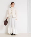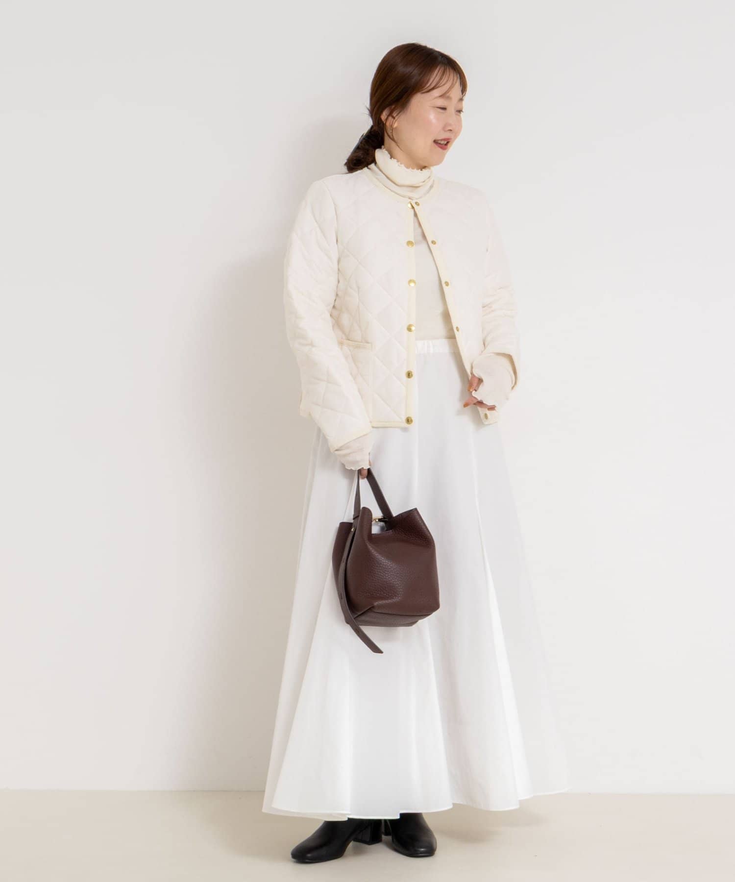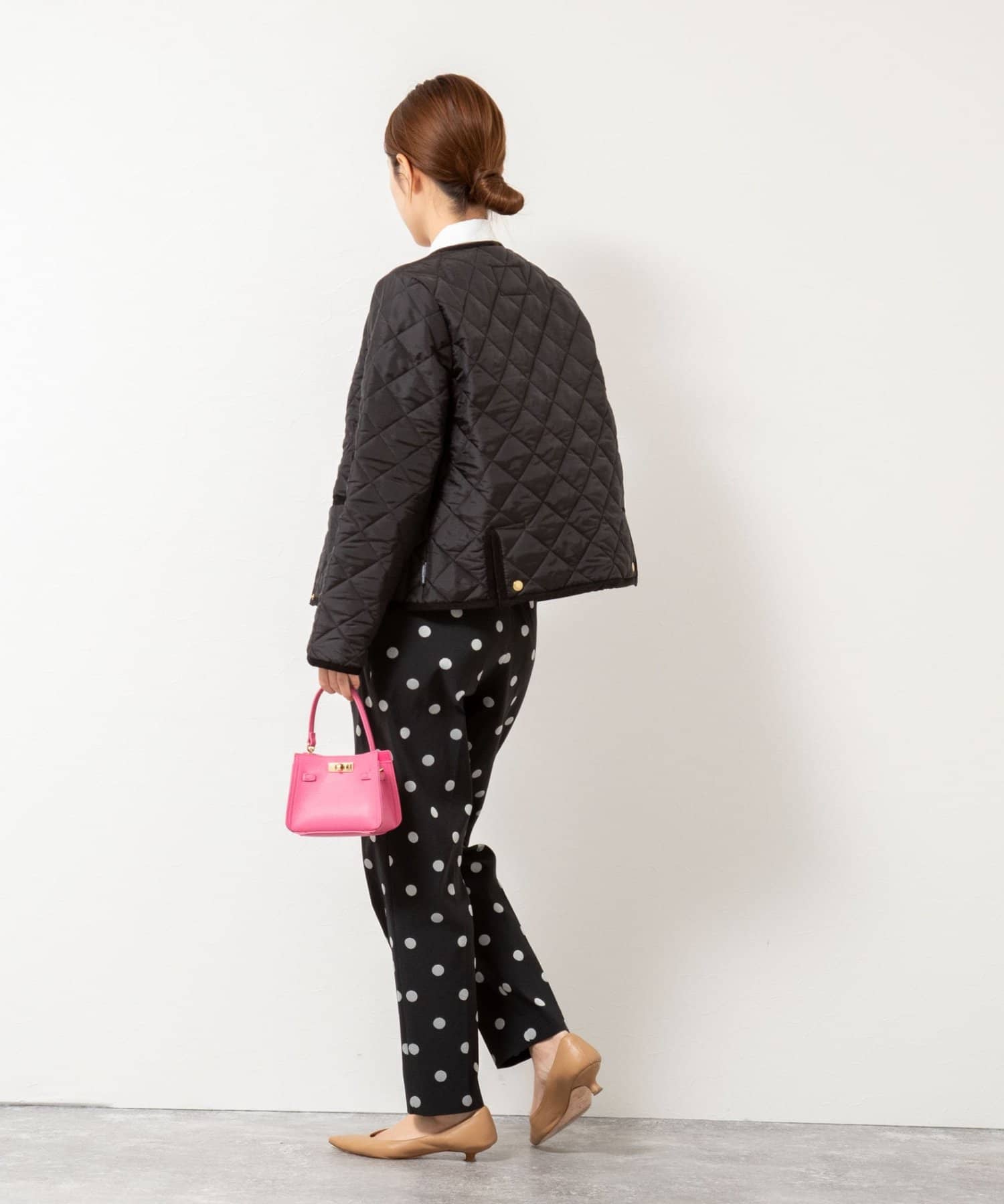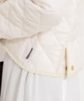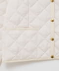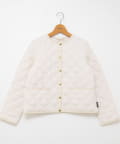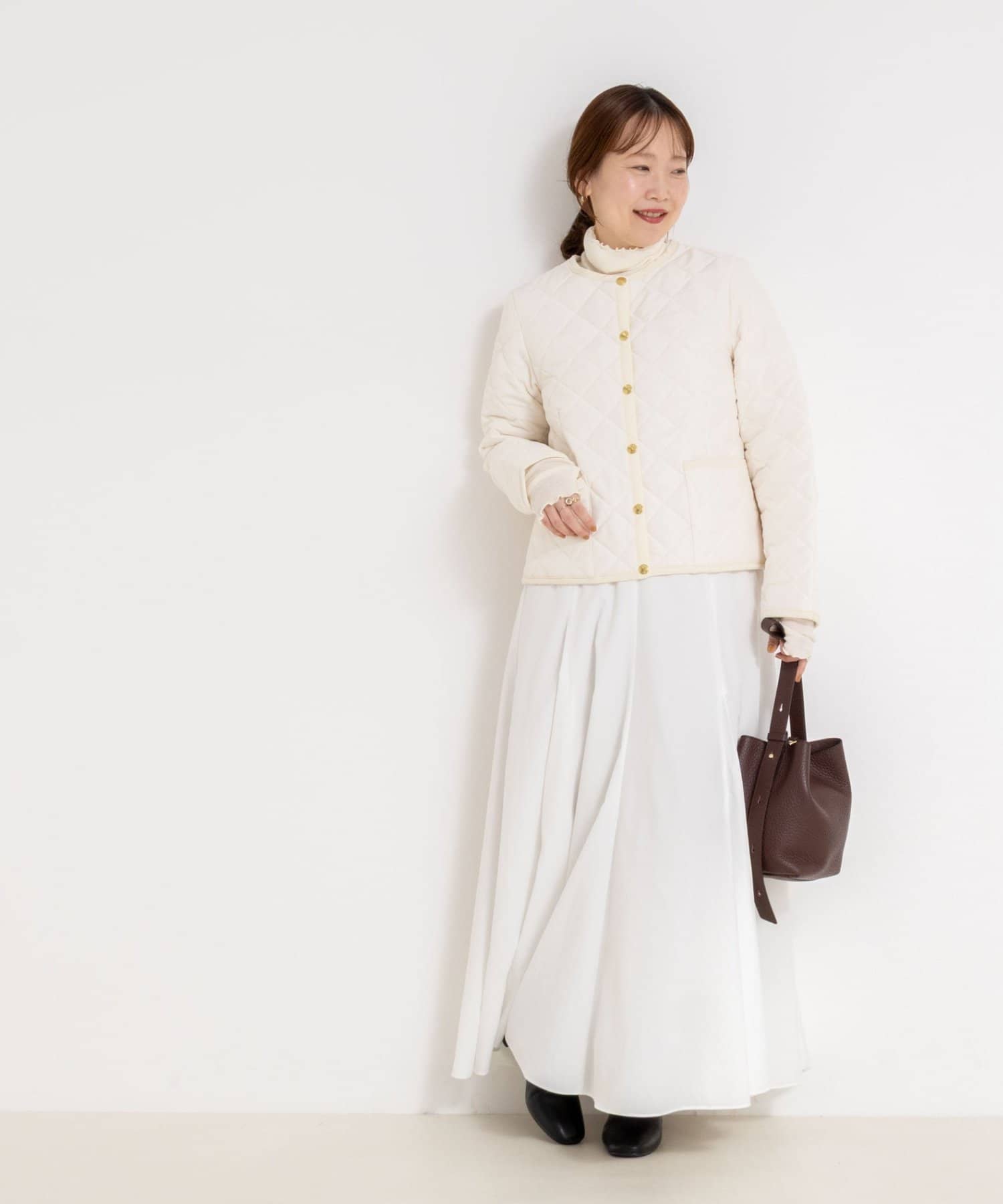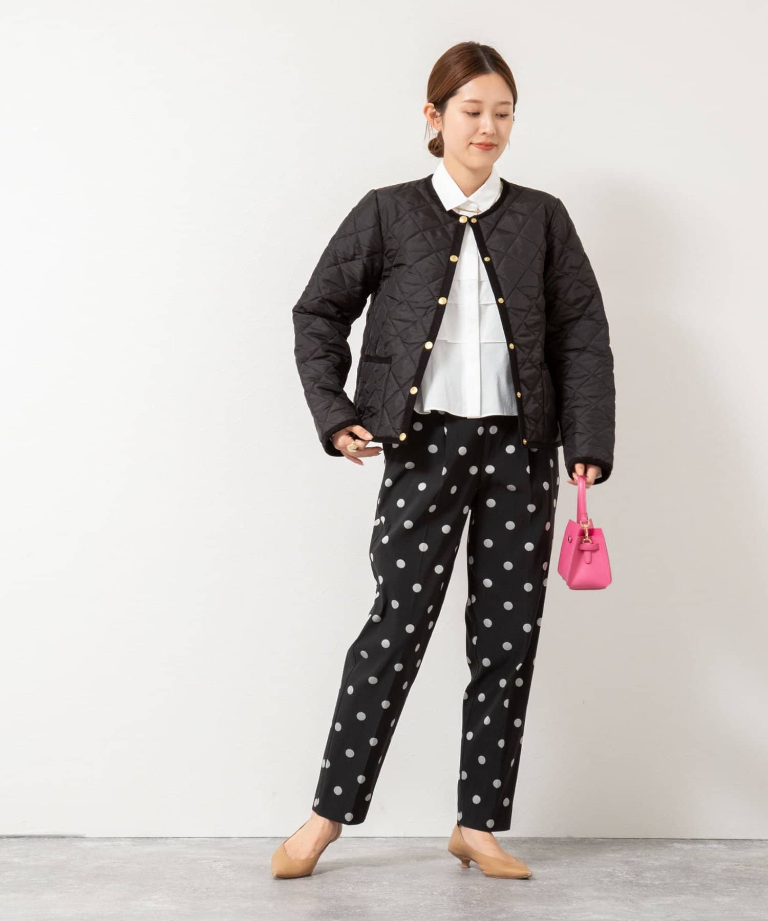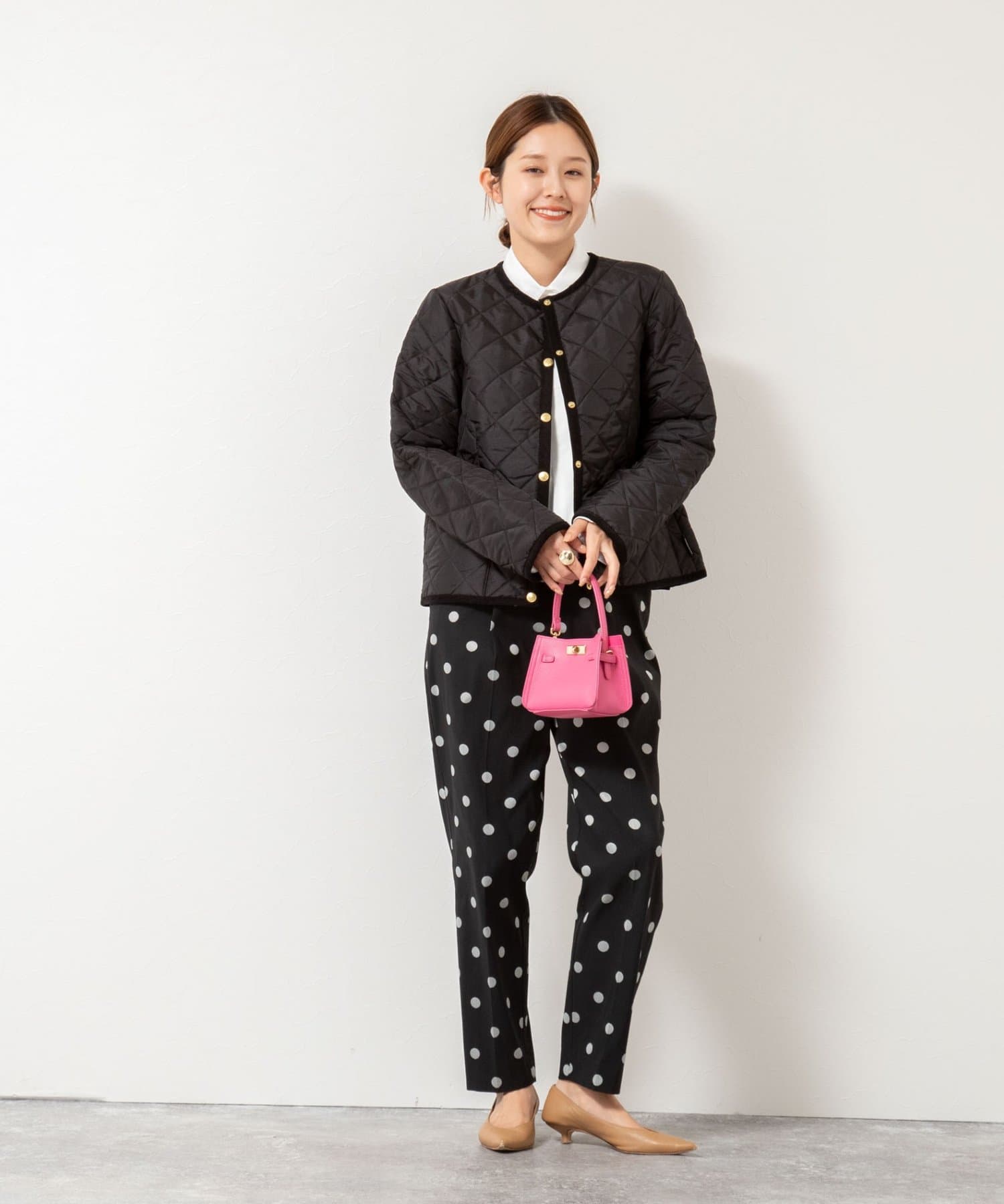 ・ショート丈でノーカラーのキルティングジャケットは、繊細なコーデュロイ製のパイピングや、あたたかみのあるゴールドのドットボタンで、リュクスなムードが魅力