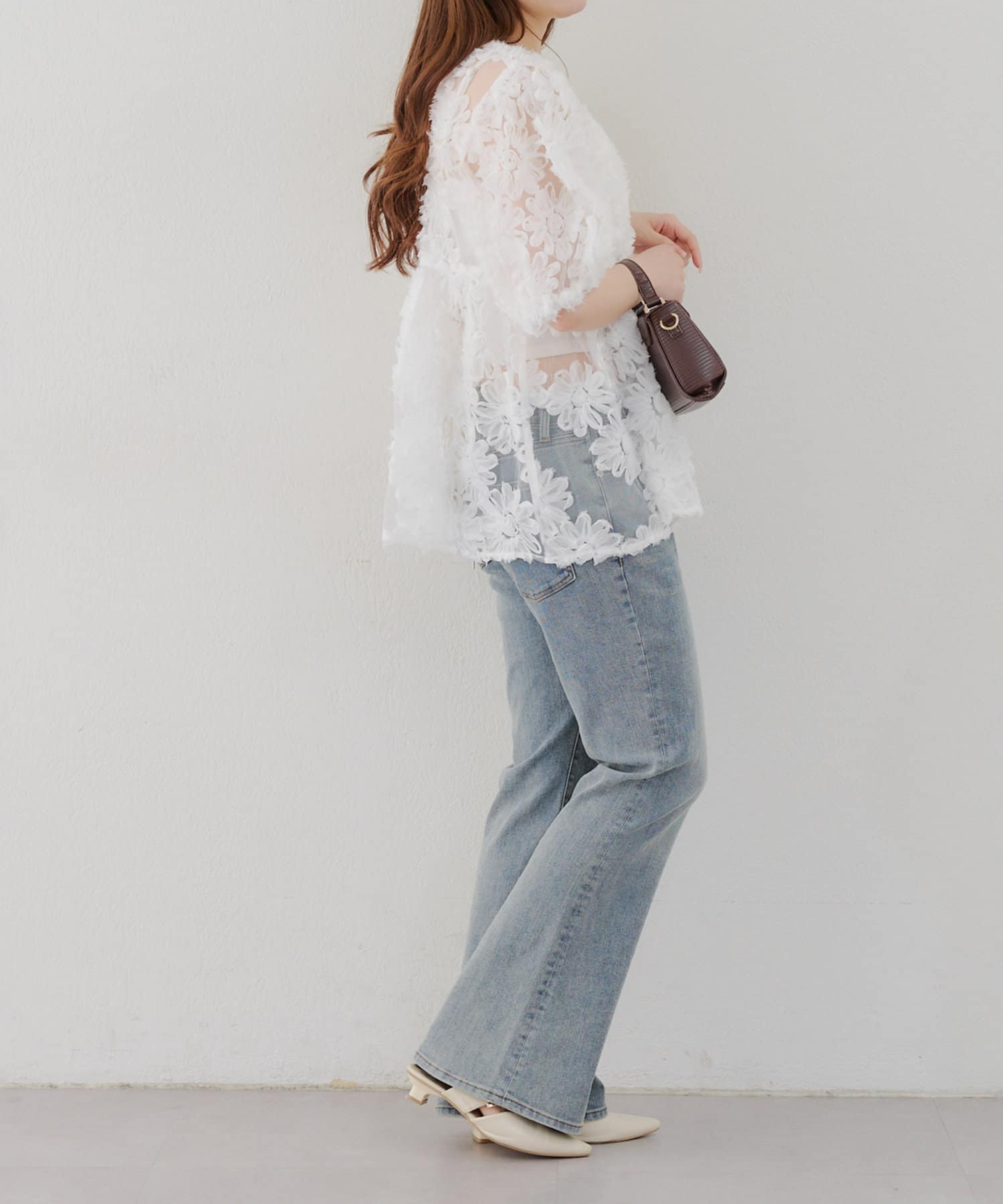 ・フェミニンな印象のトップスなので、デニムと合わせて大人カジュアルコーデがトレンドライクなコーデに。