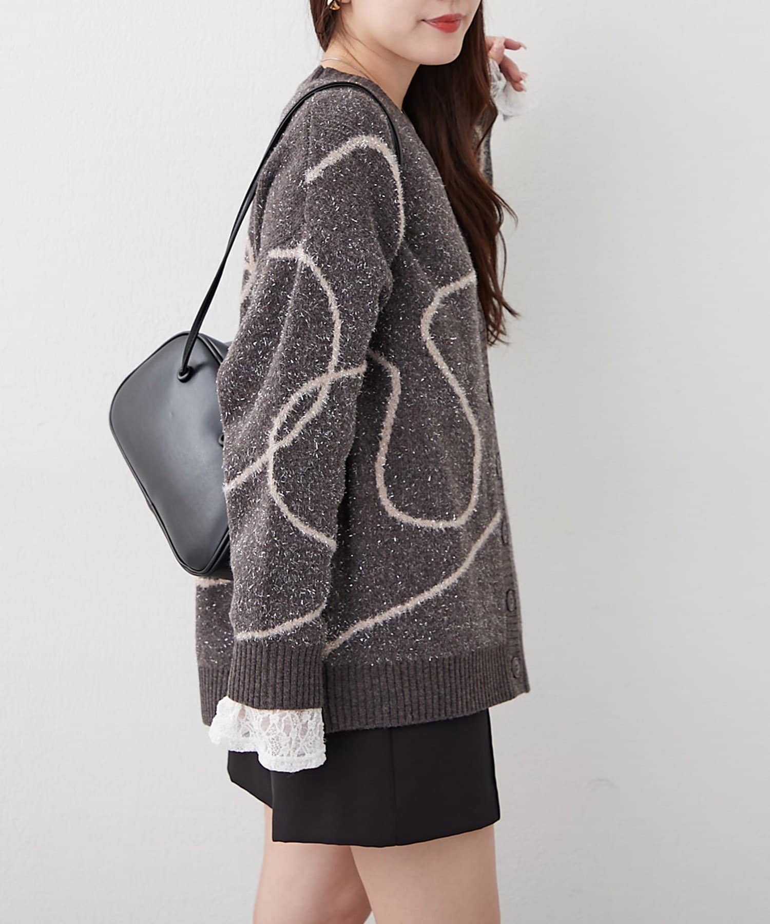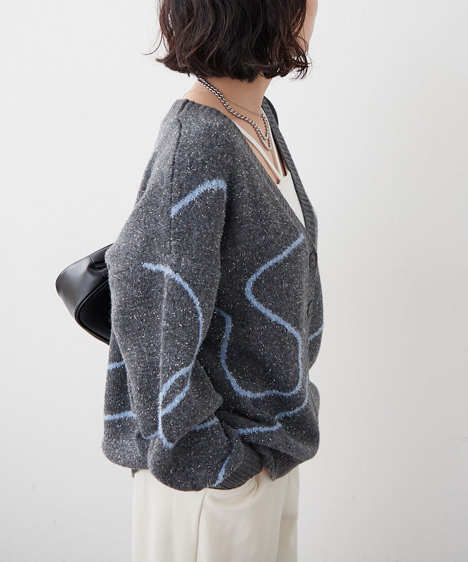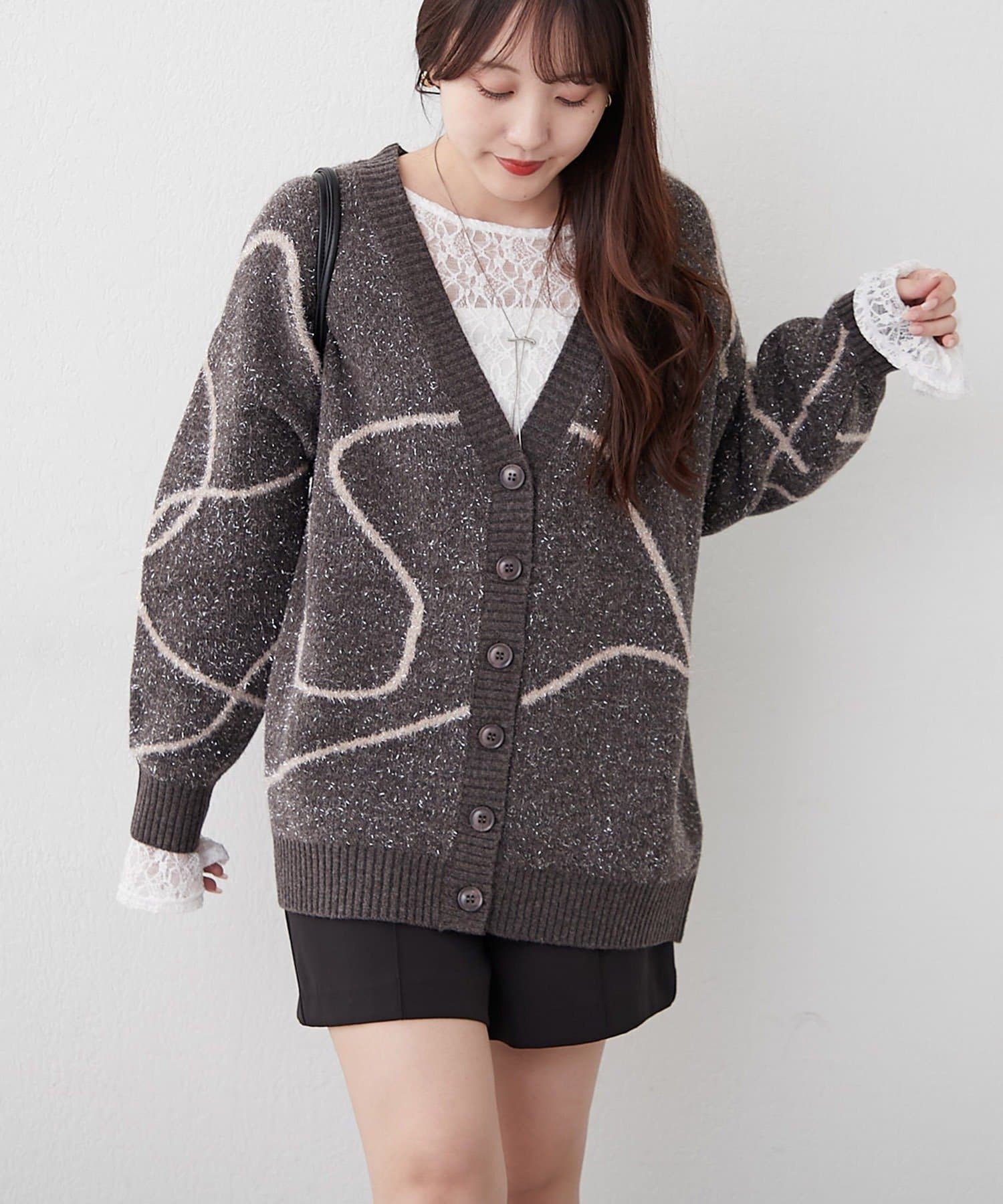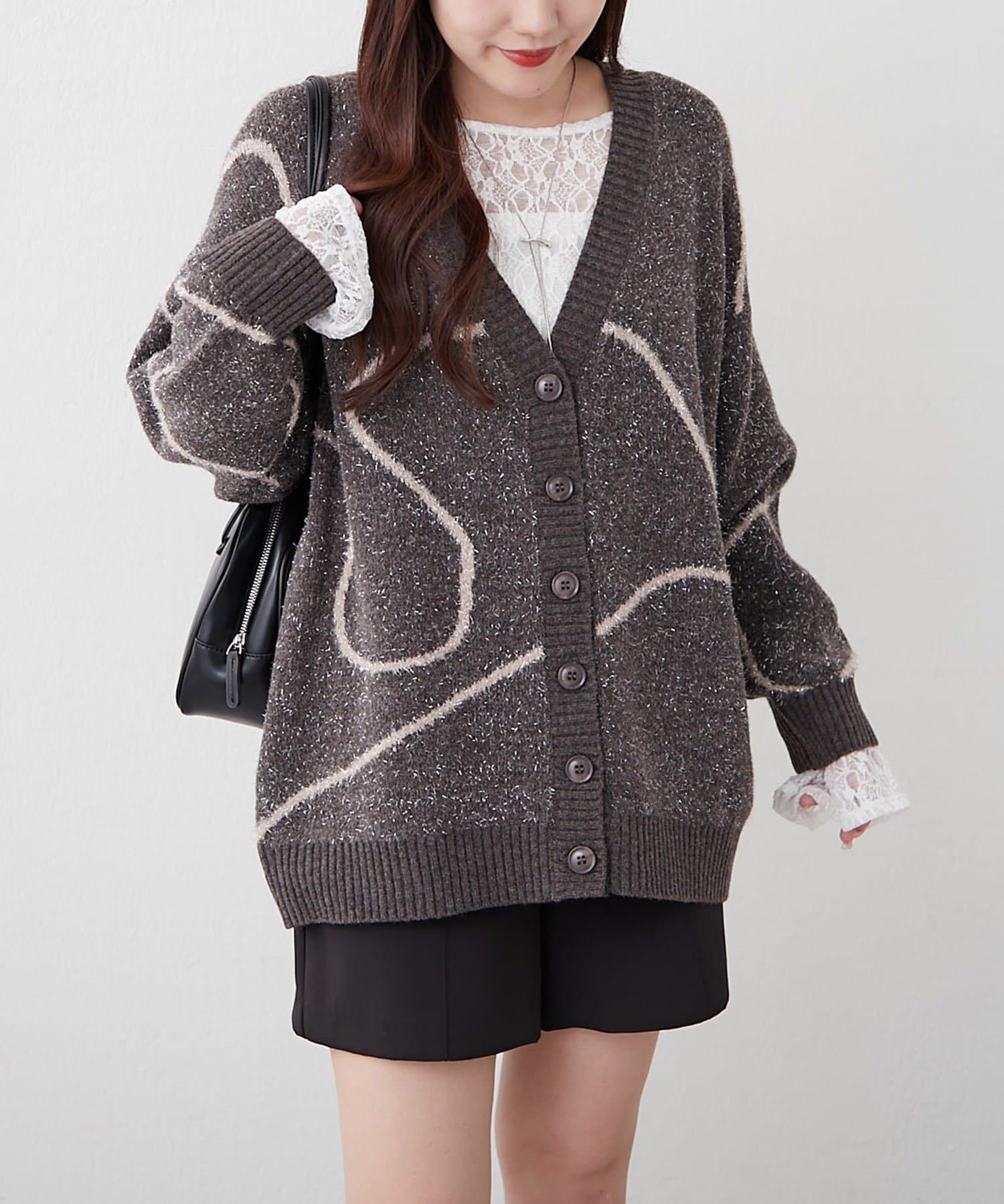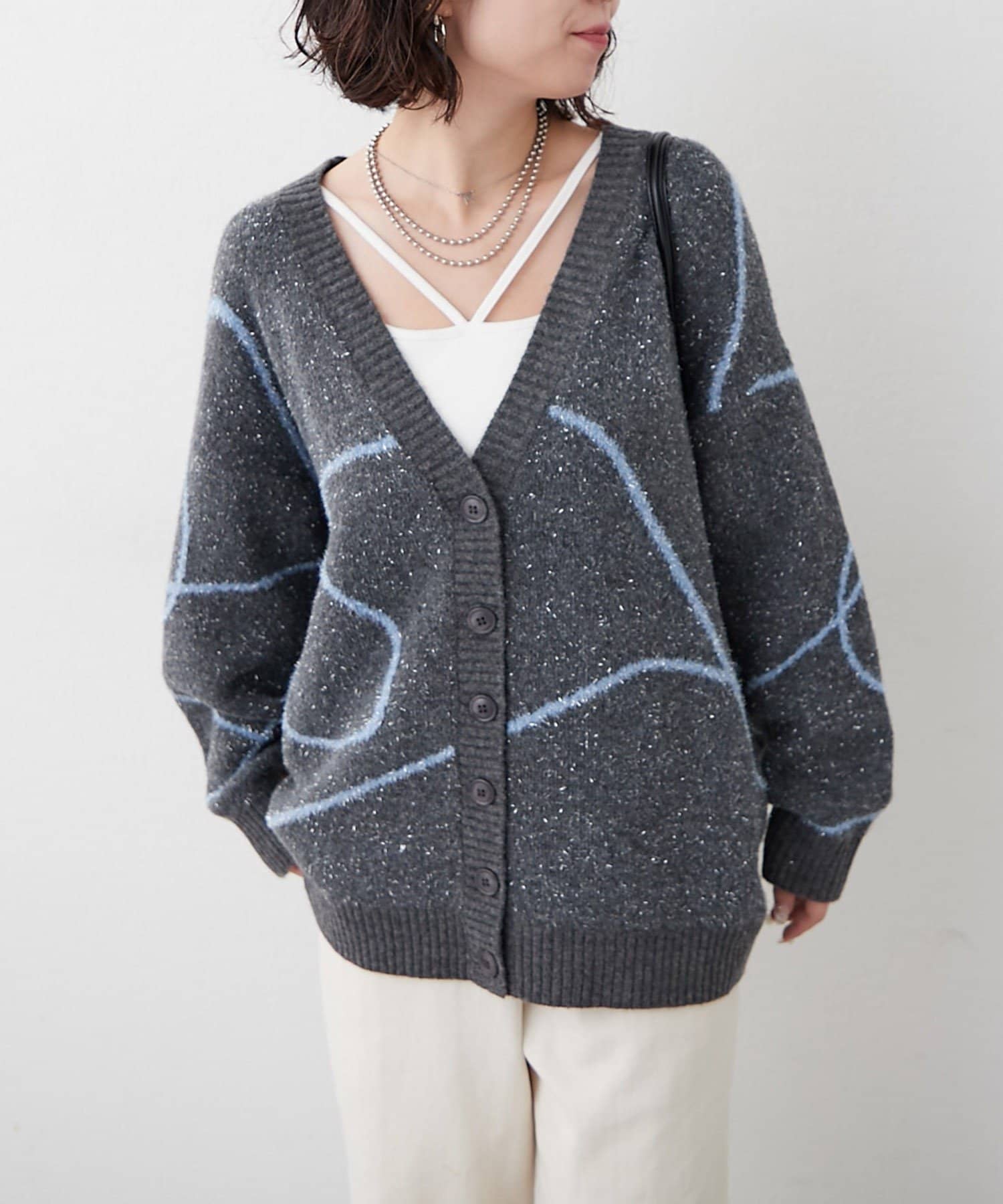 ・ラメ素材がさりげなくきらめく♪ウェーブライン柄がおしゃれなVネックカーディガン