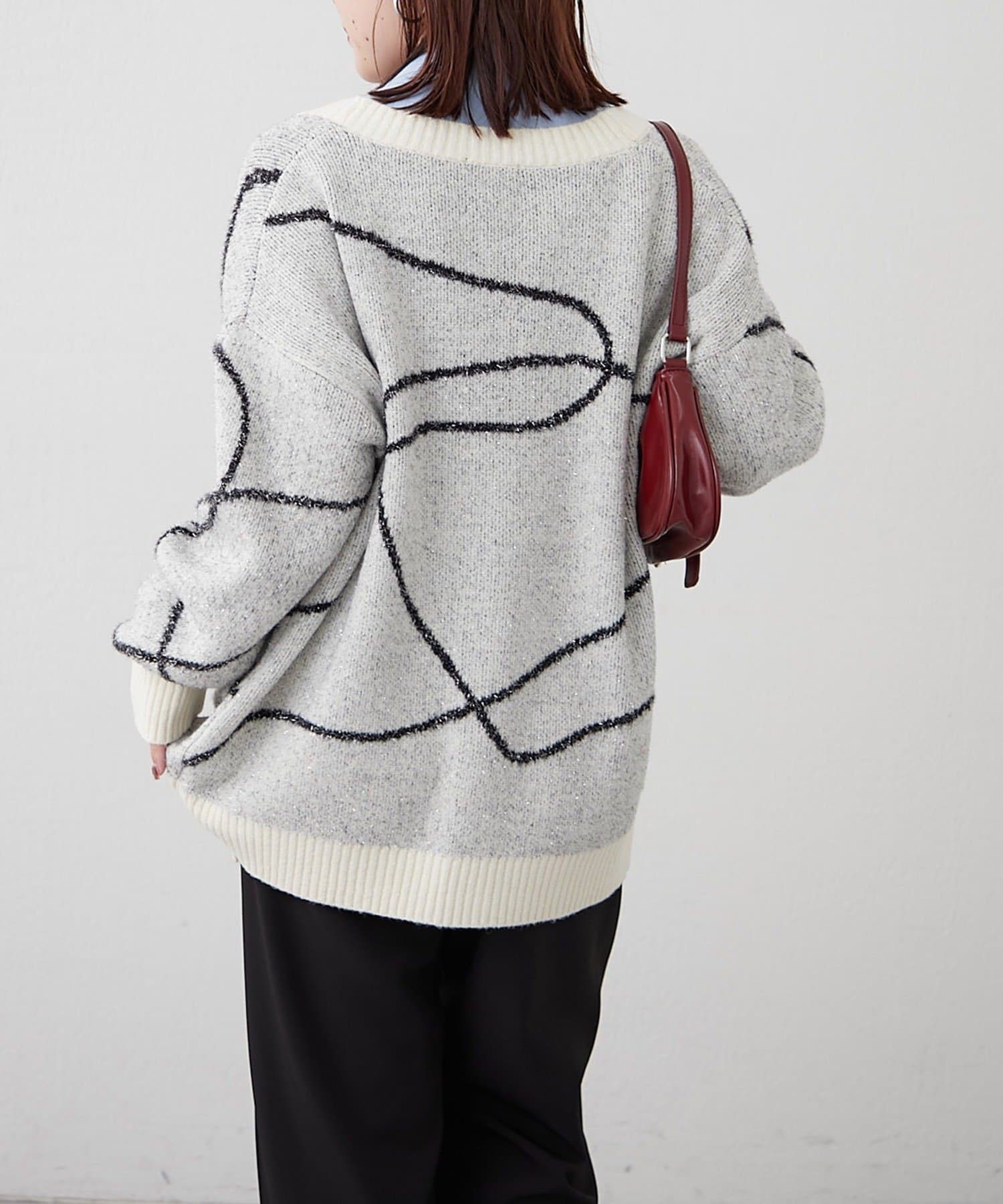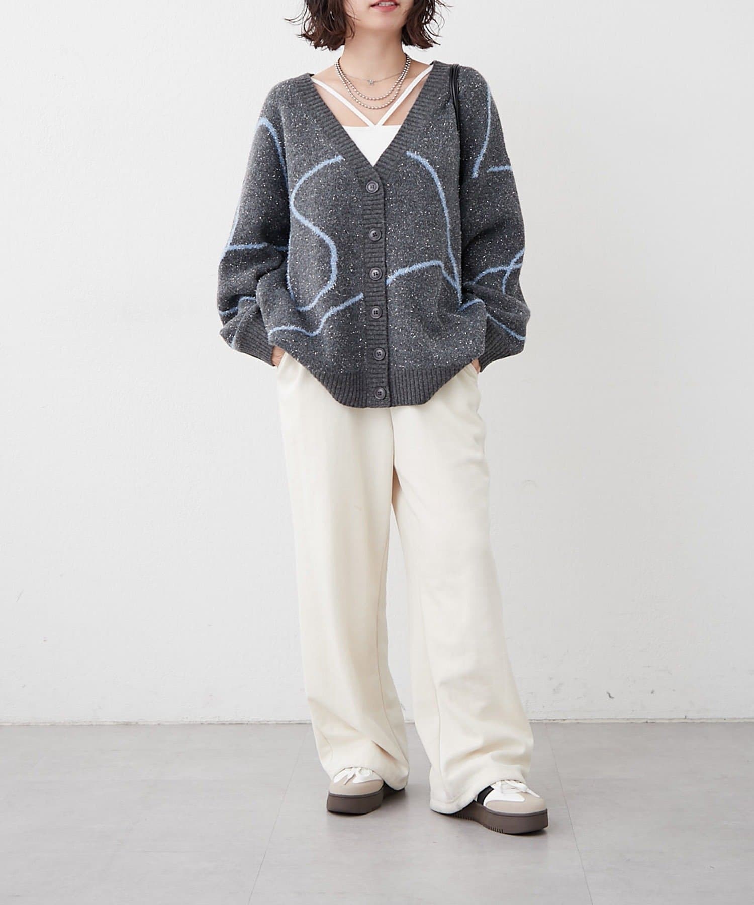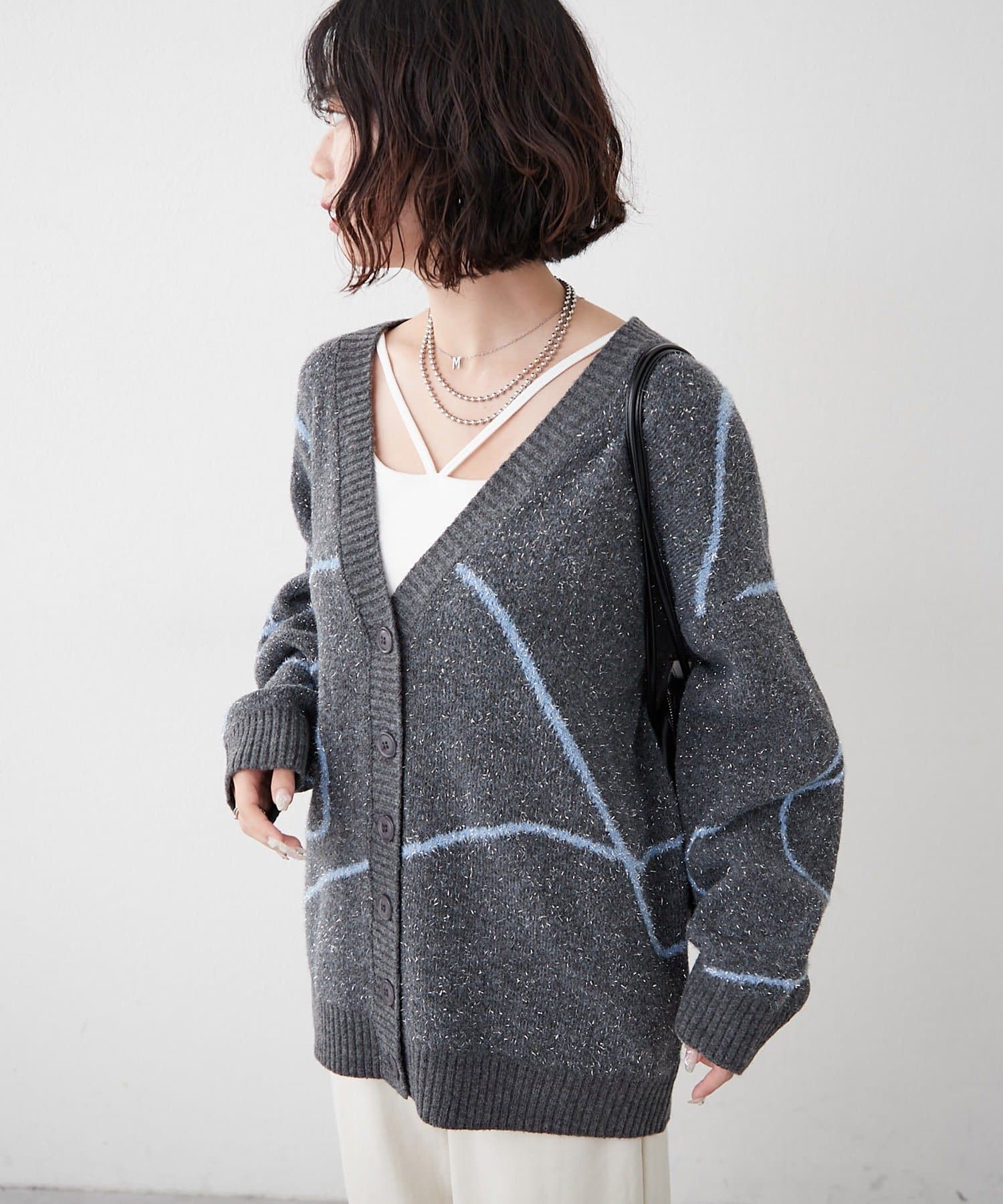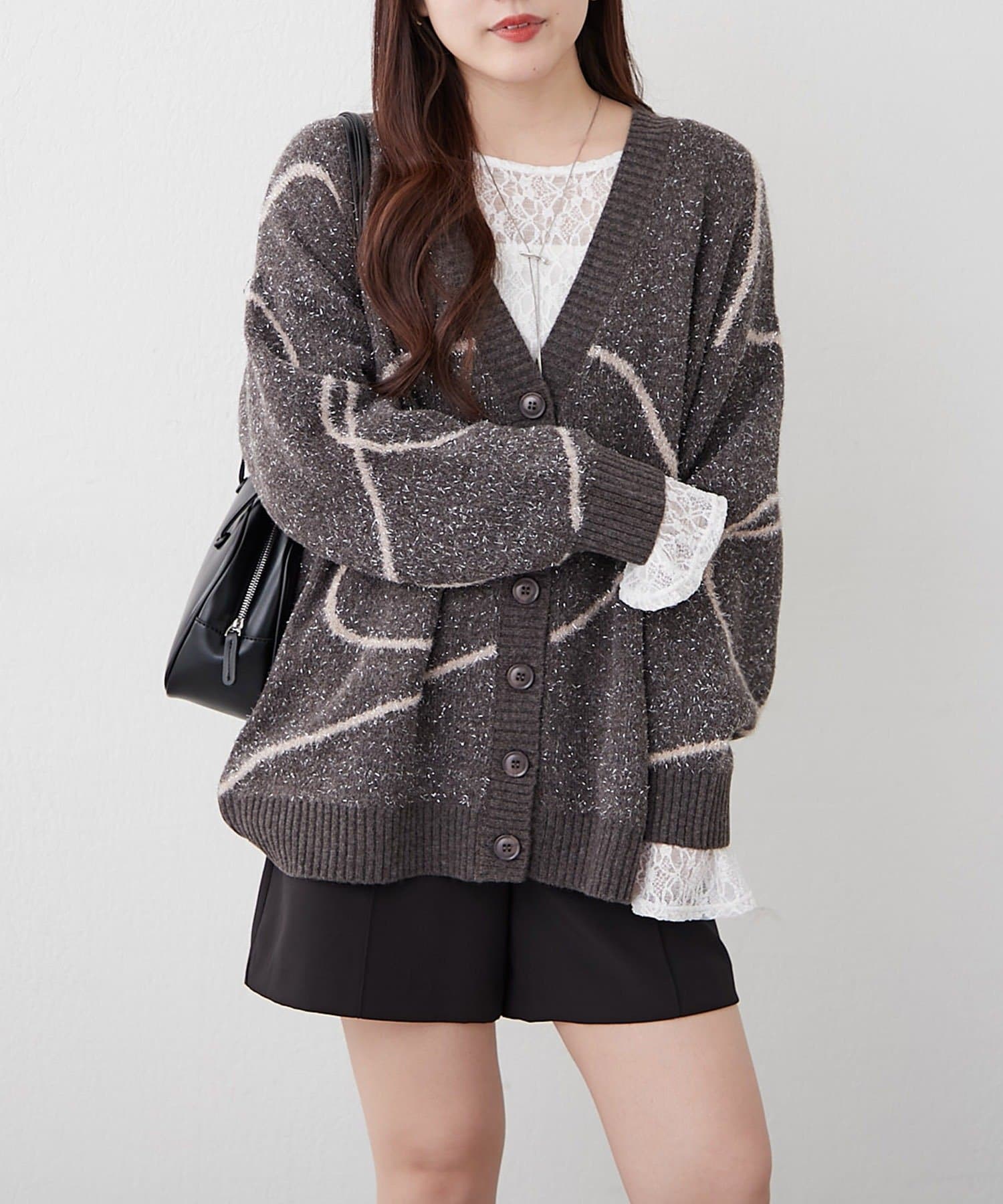 ・ラメ素材がさりげなくきらめく♪ウェーブライン柄がおしゃれなVネックカーディガン