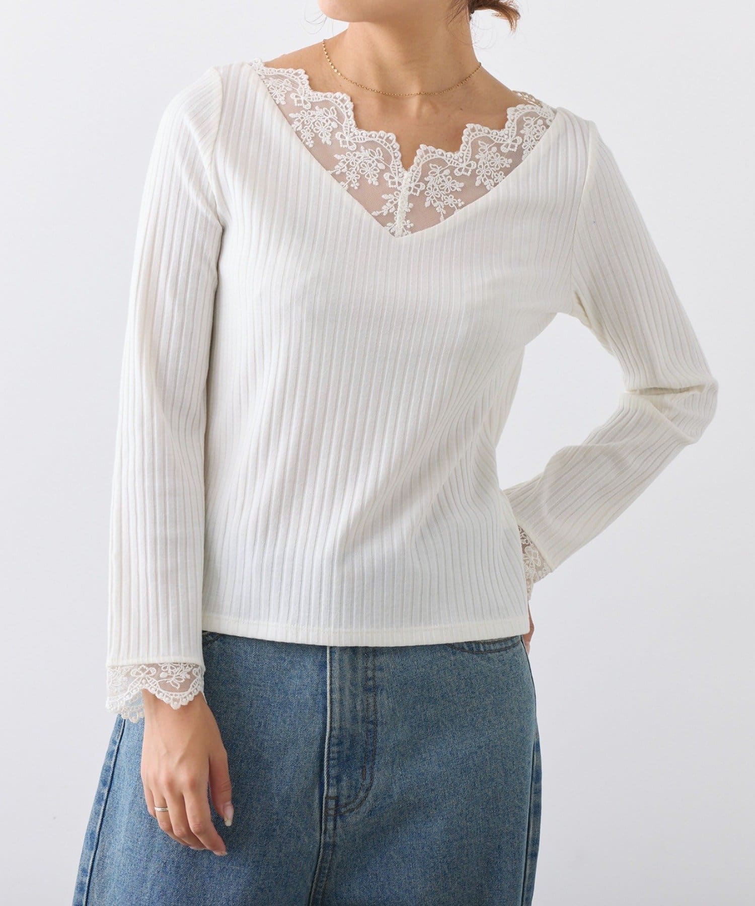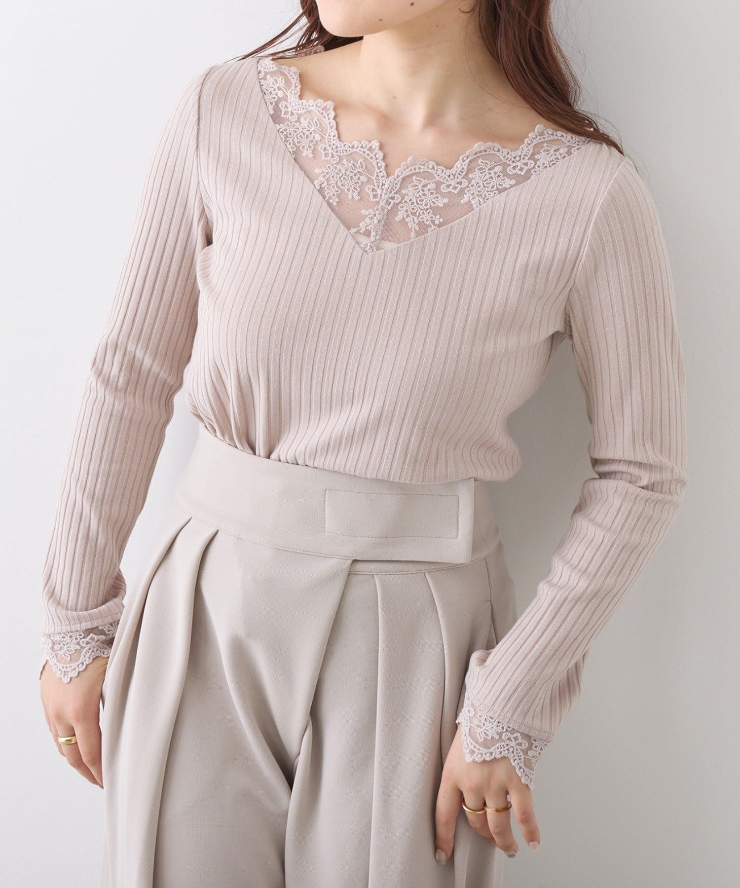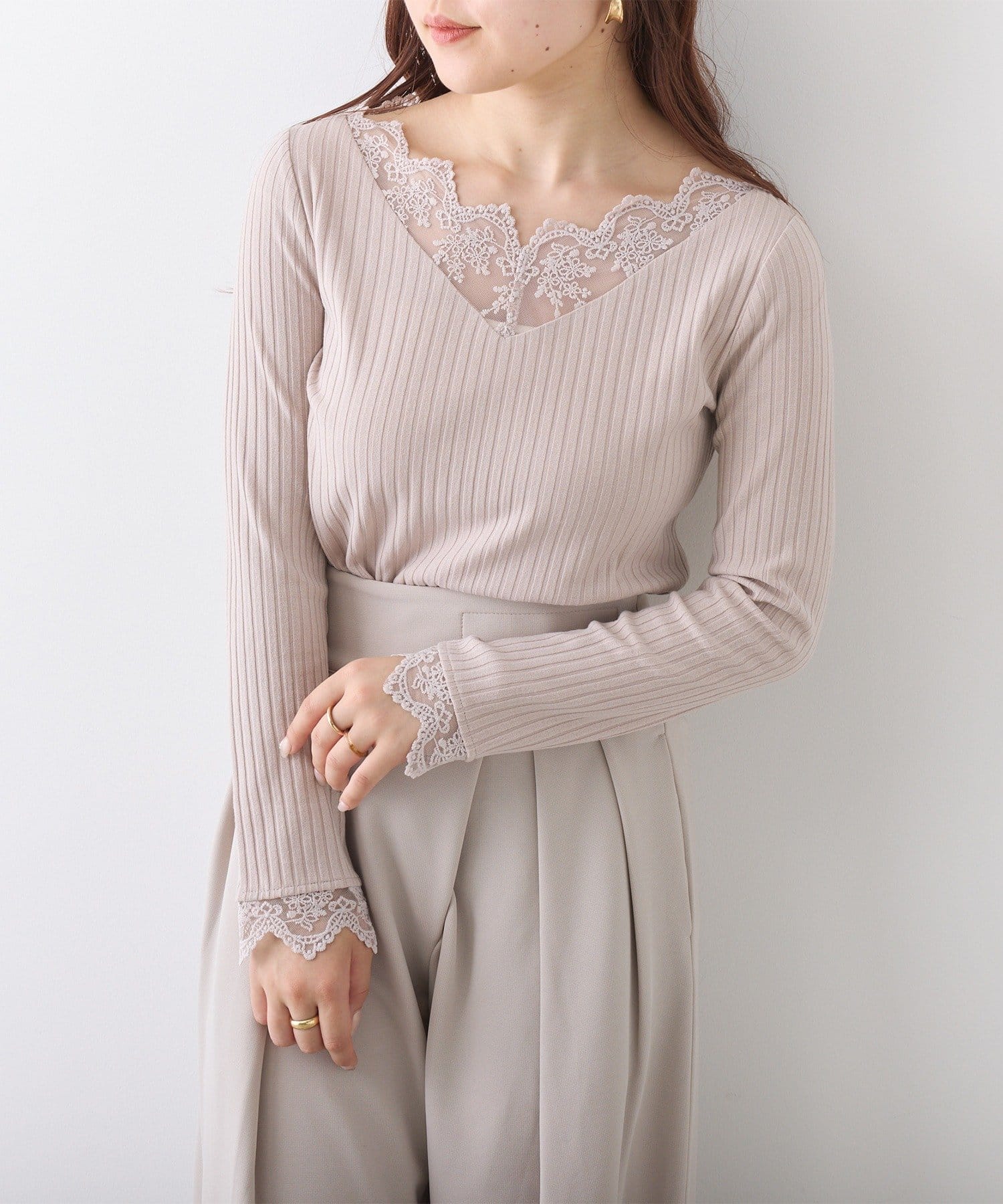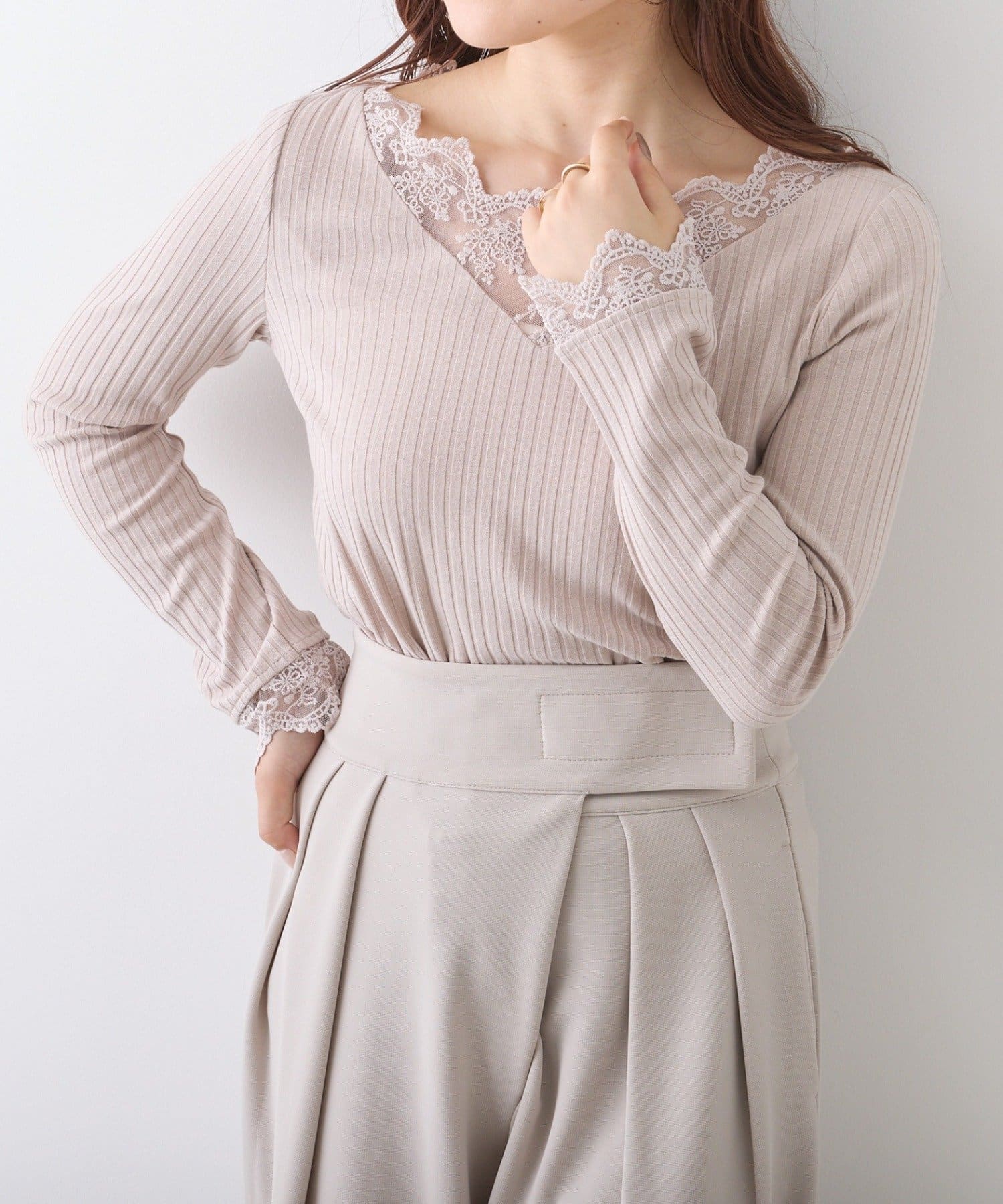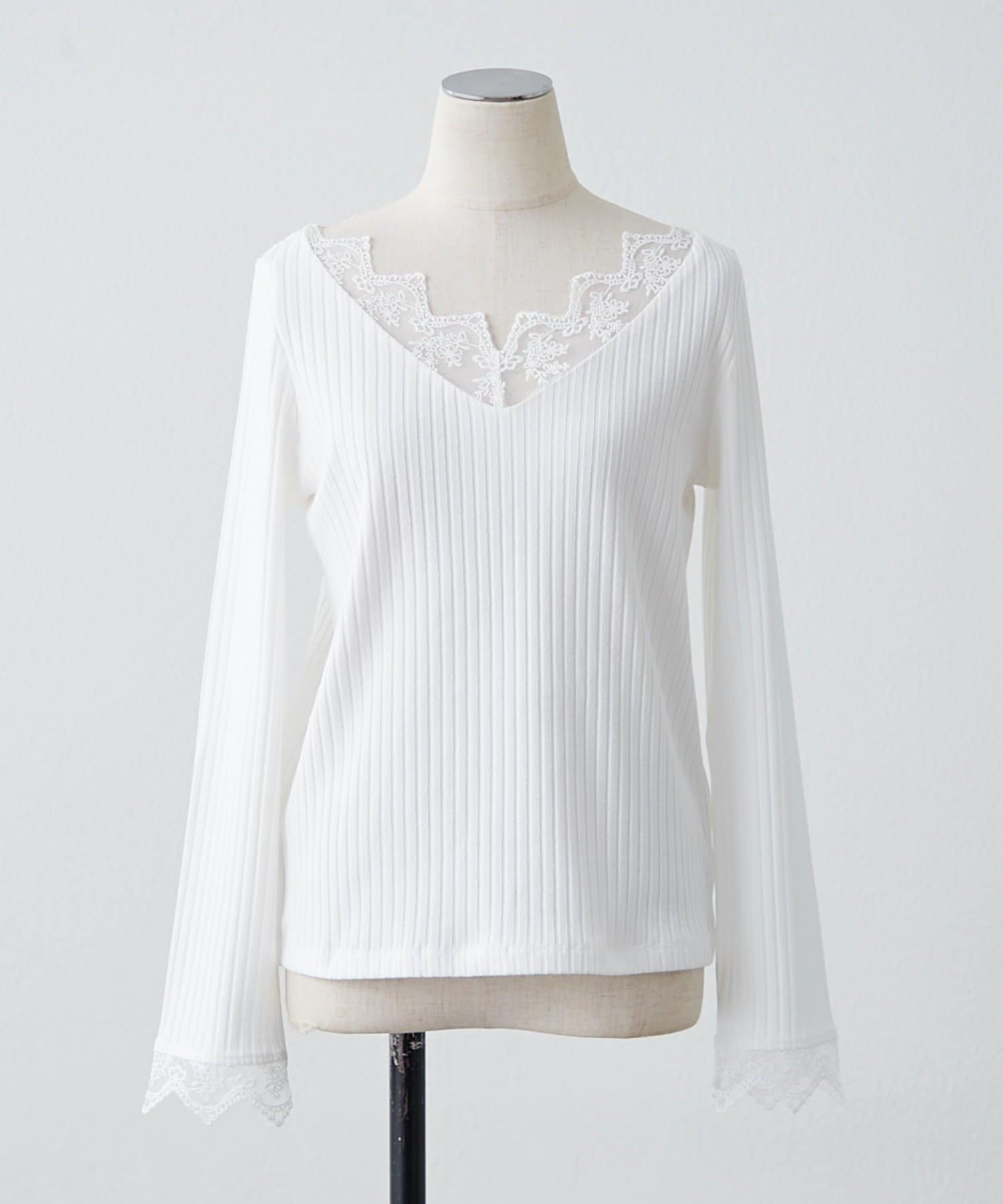 ・上品なレース使いが魅力の長袖プルオーバー。Vネックがデコルテを美しく見せ、女性らしさを引き立てます。