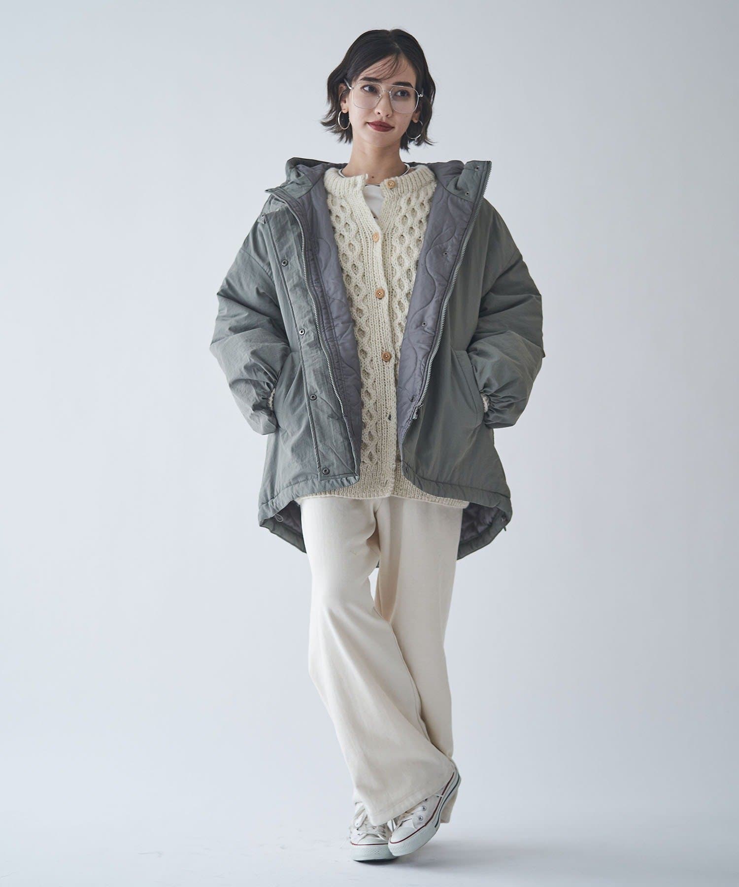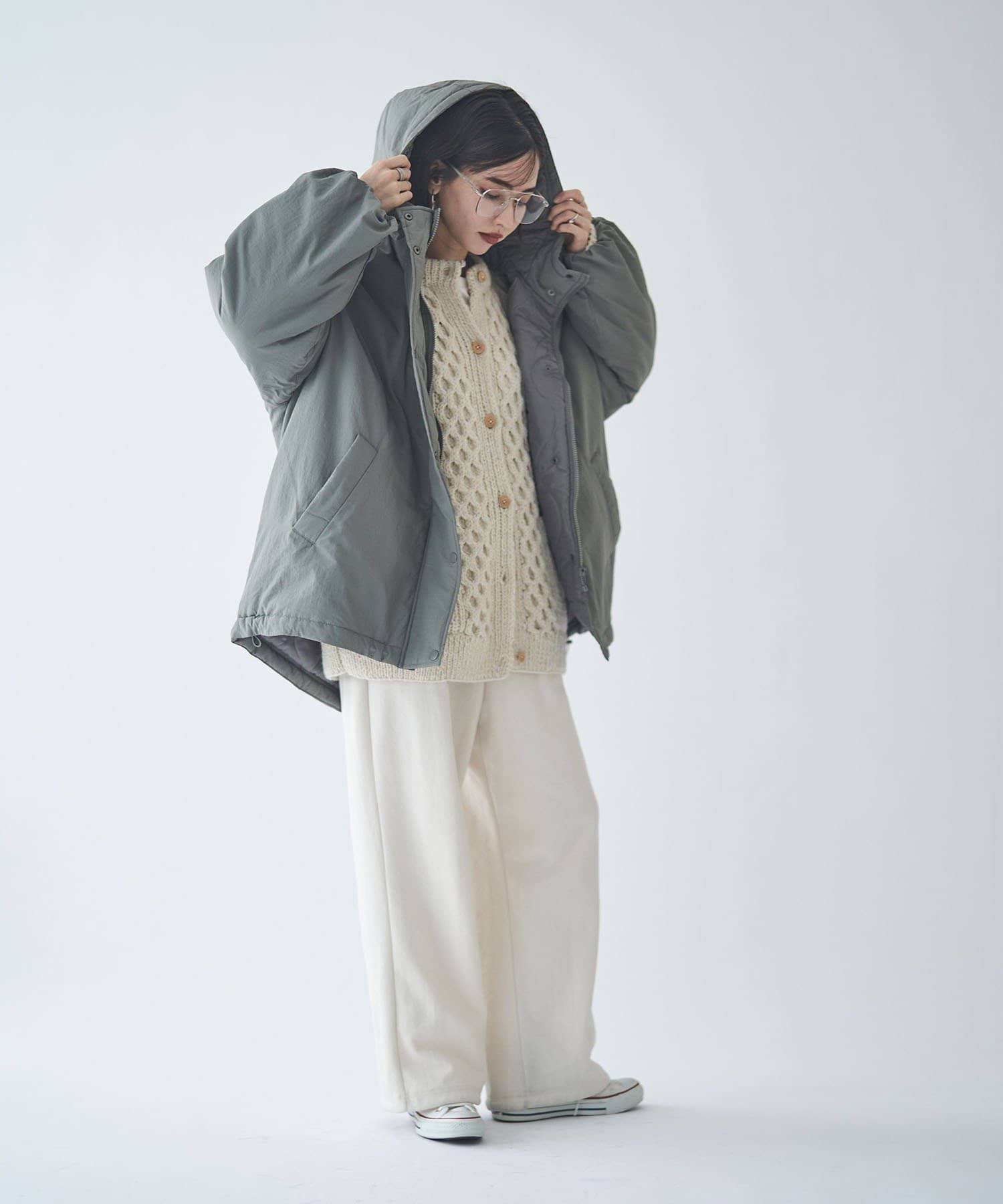 また、ゆったりシルエットなので、中に厚手のニット等を何枚も重ね着するなら良いかもしれません。
