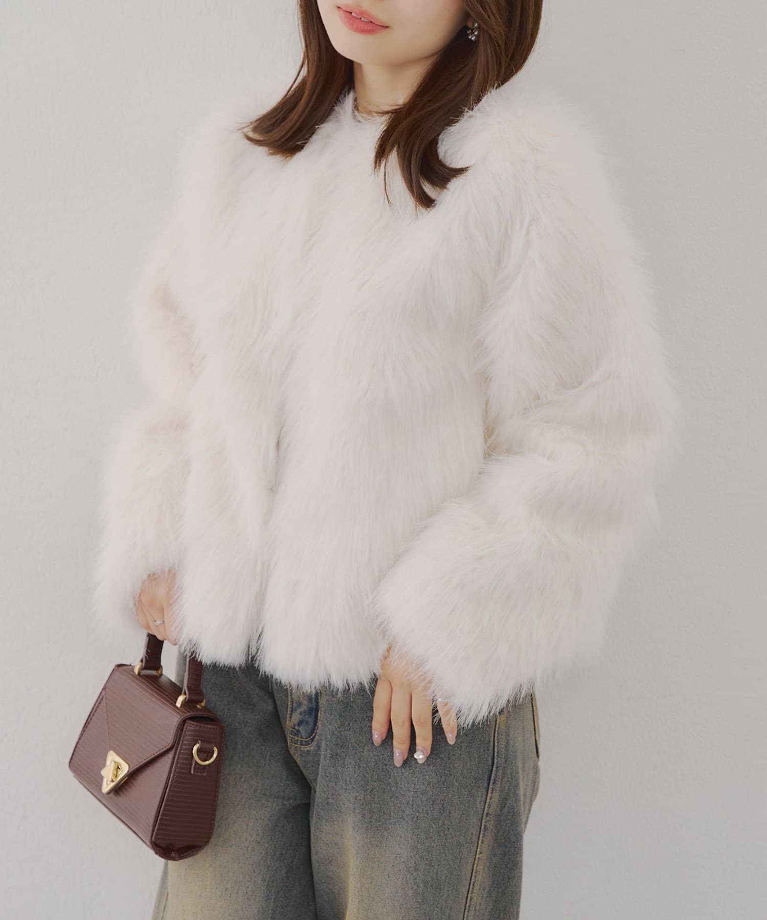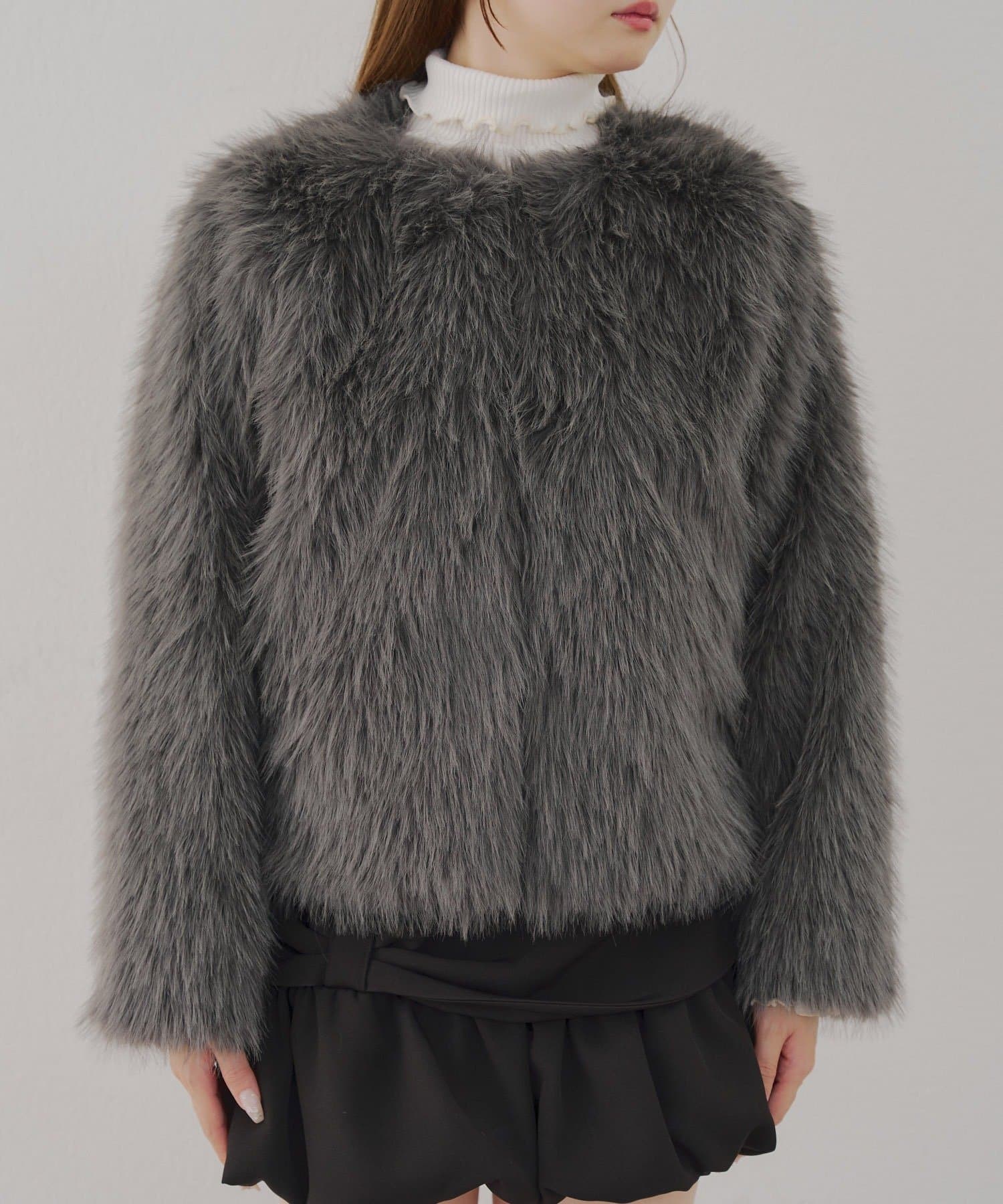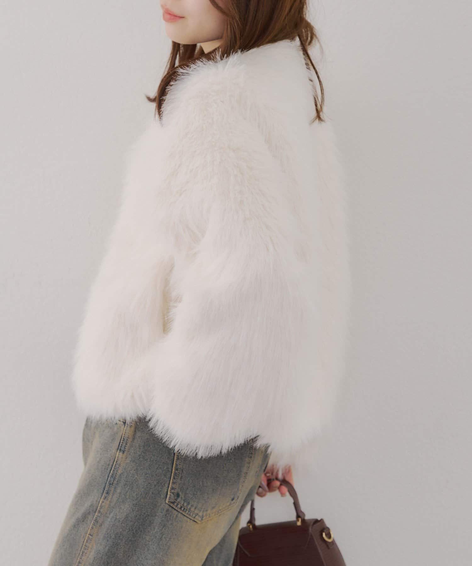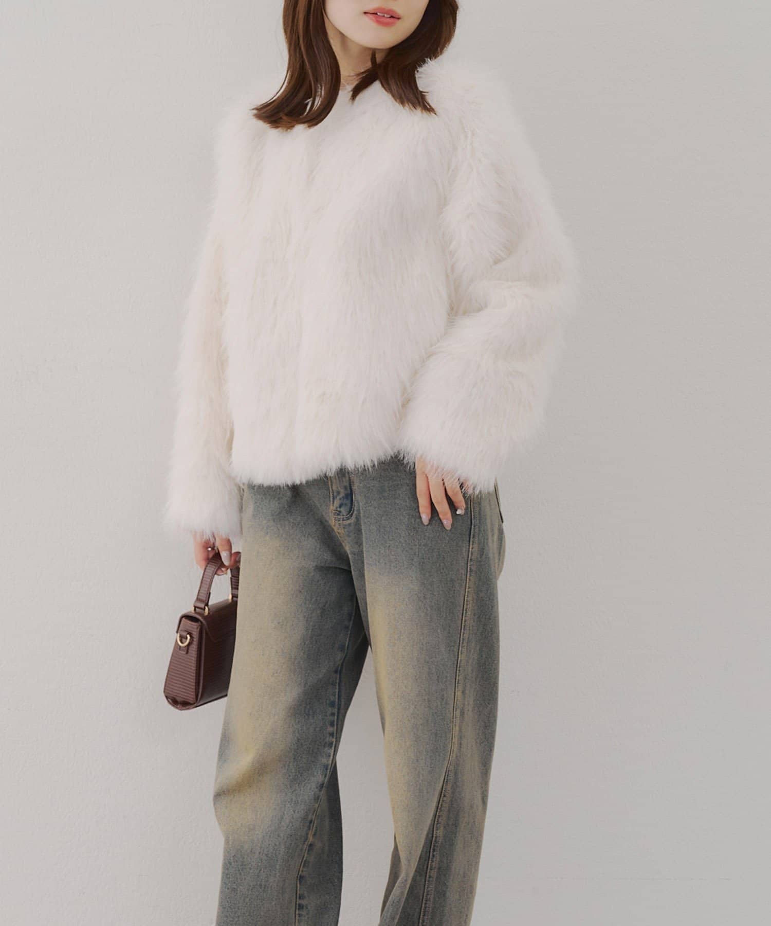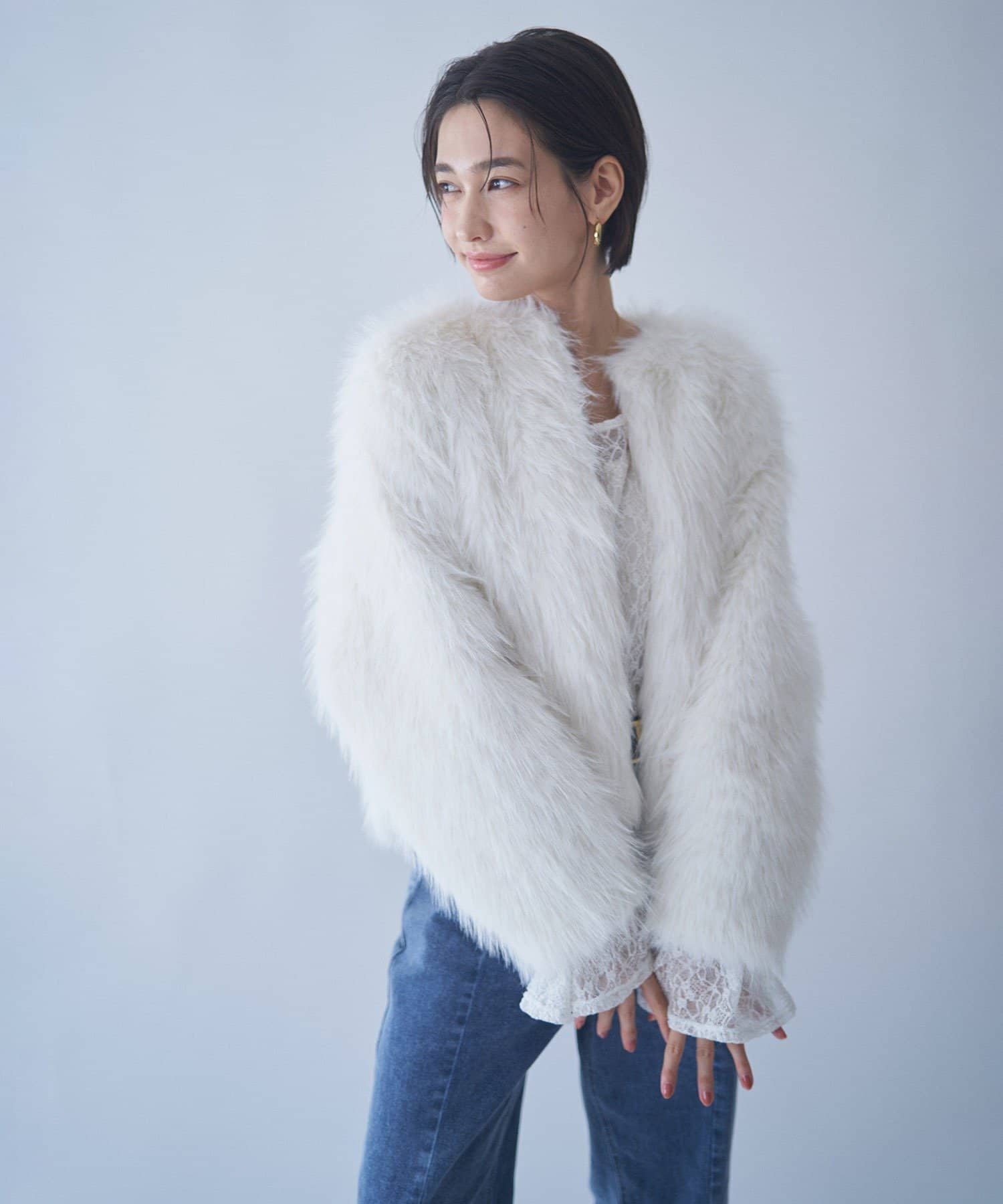 ・存在感のあるフェイクファーを使用したノーカラージャケット