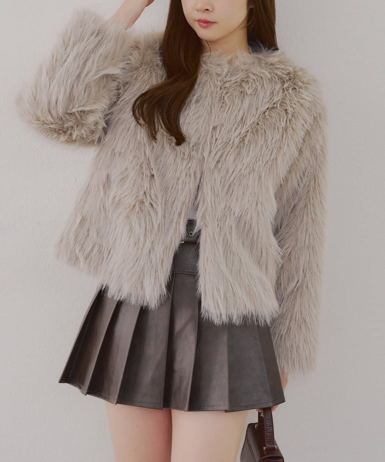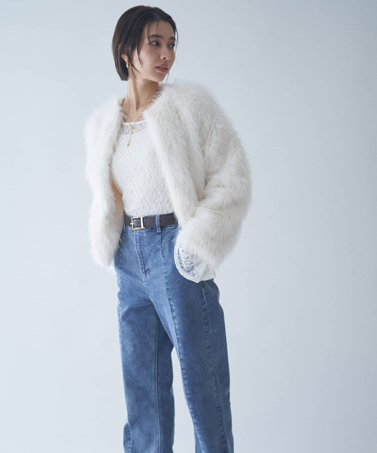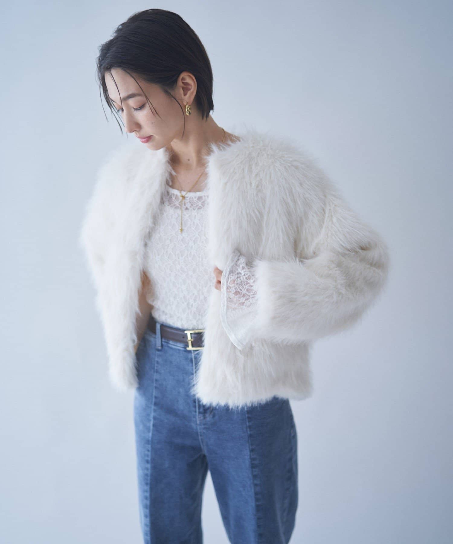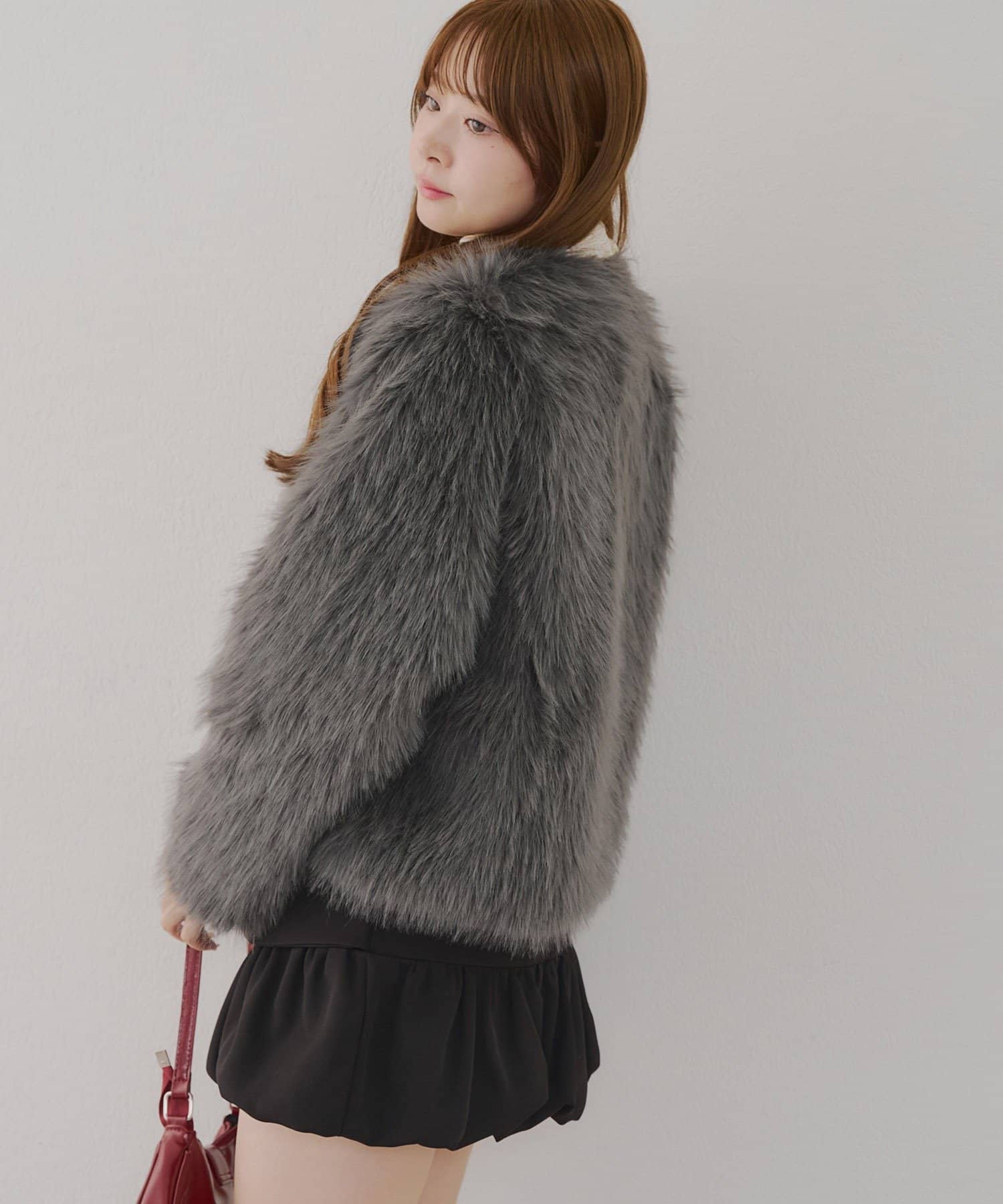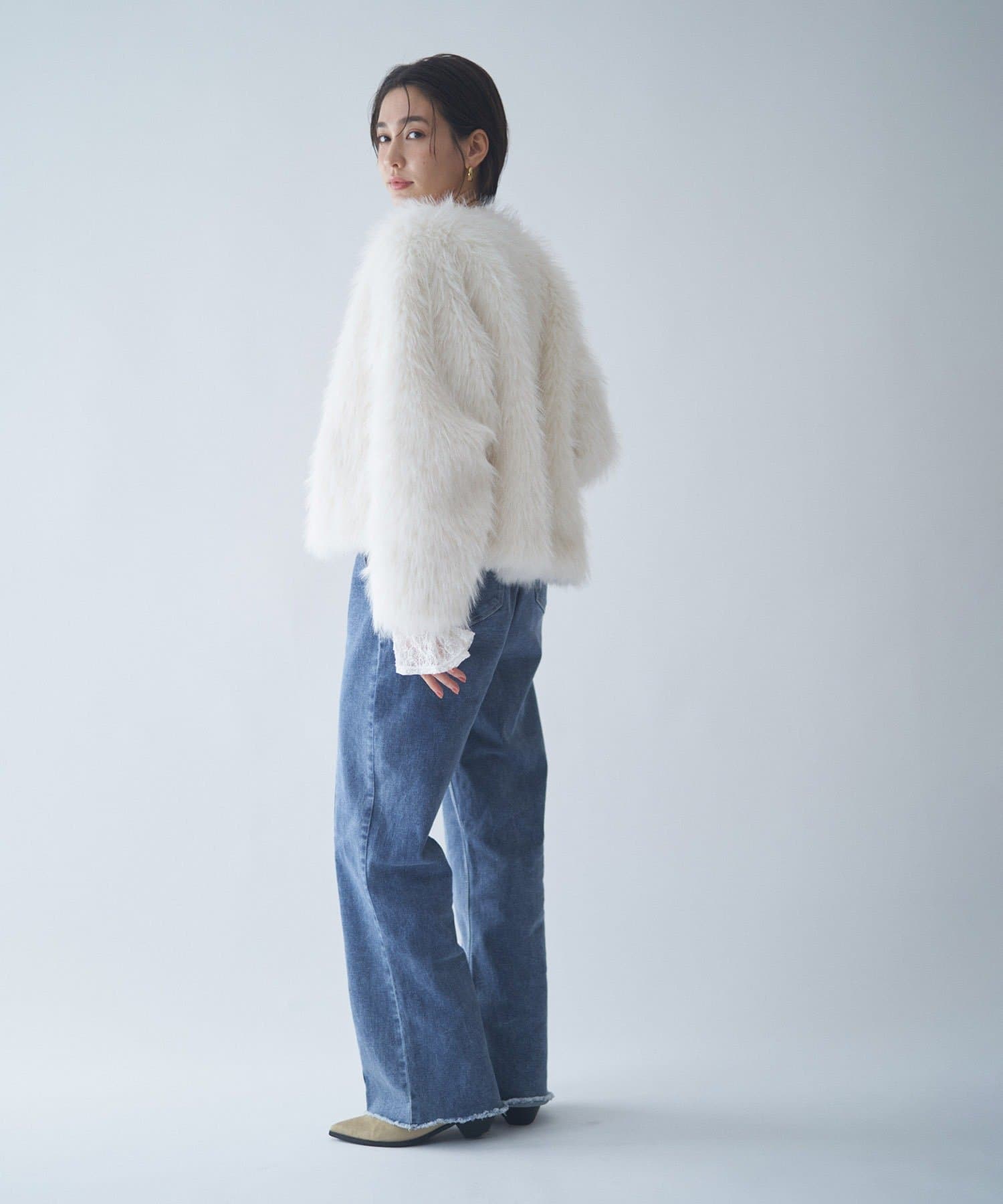・存在感のあるフェイクファーを使用したノーカラージャケット