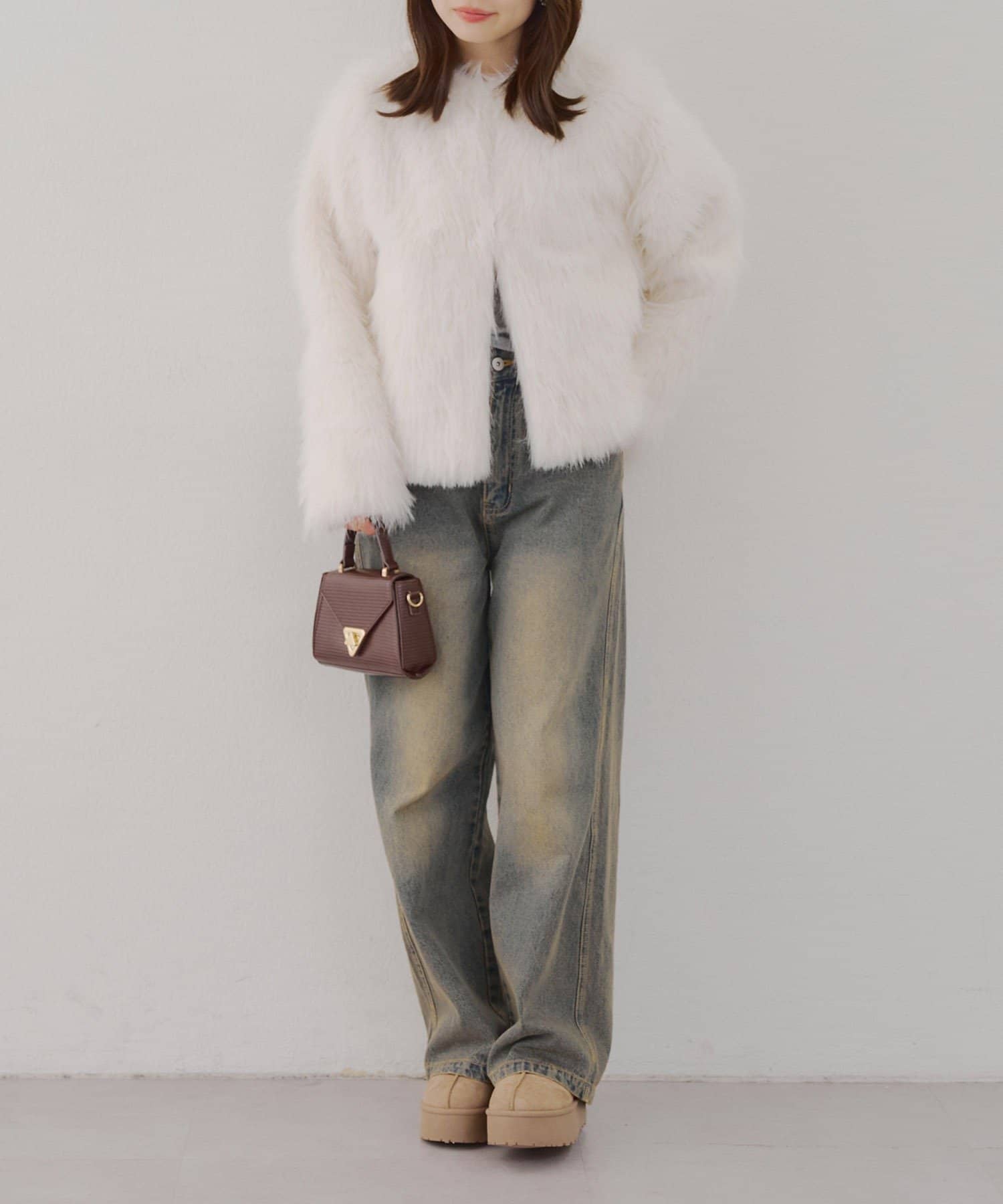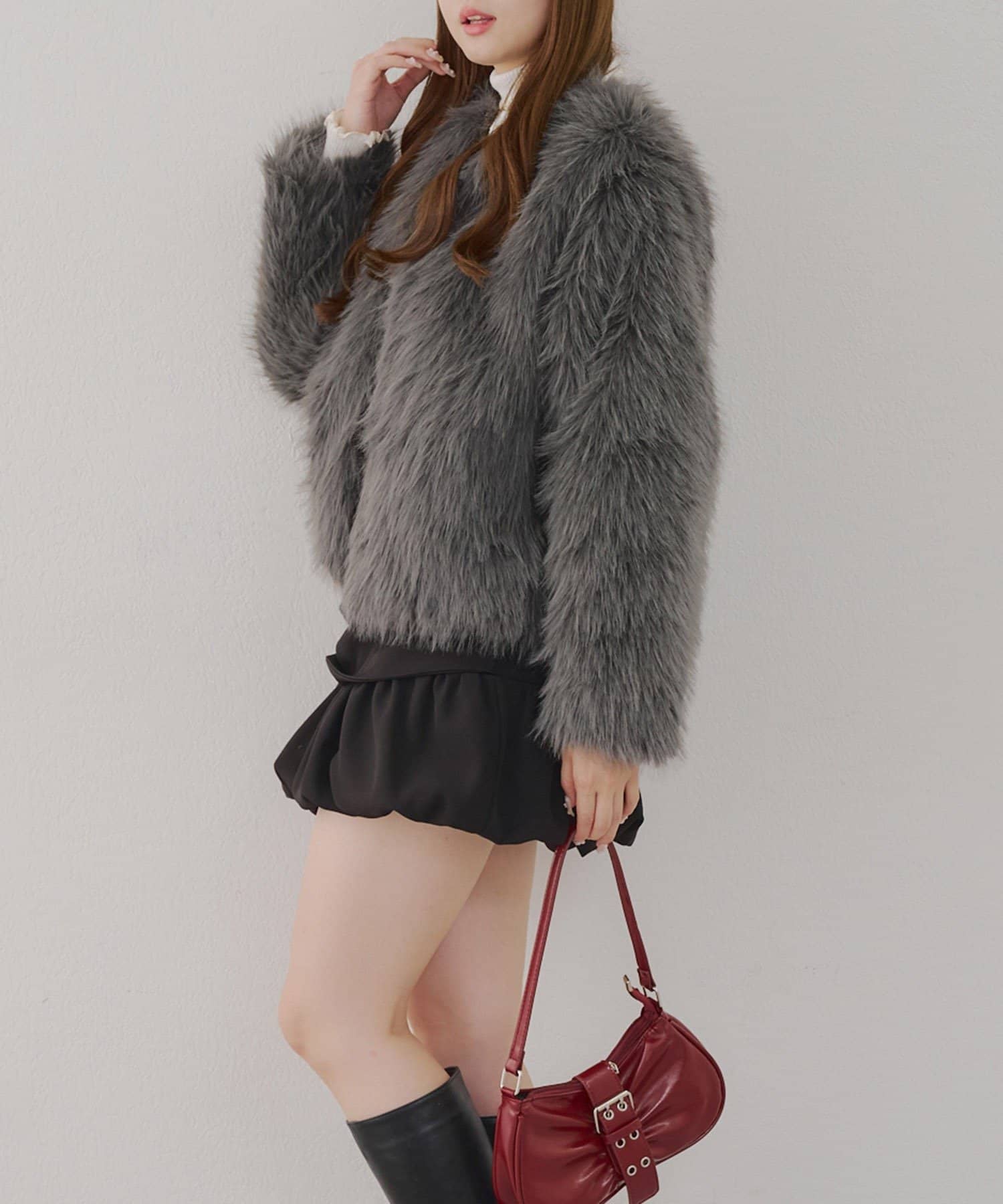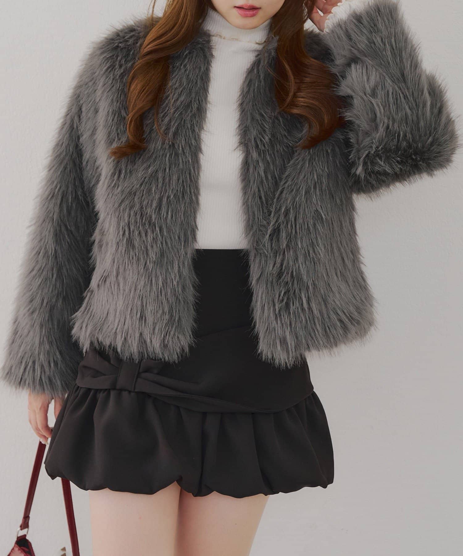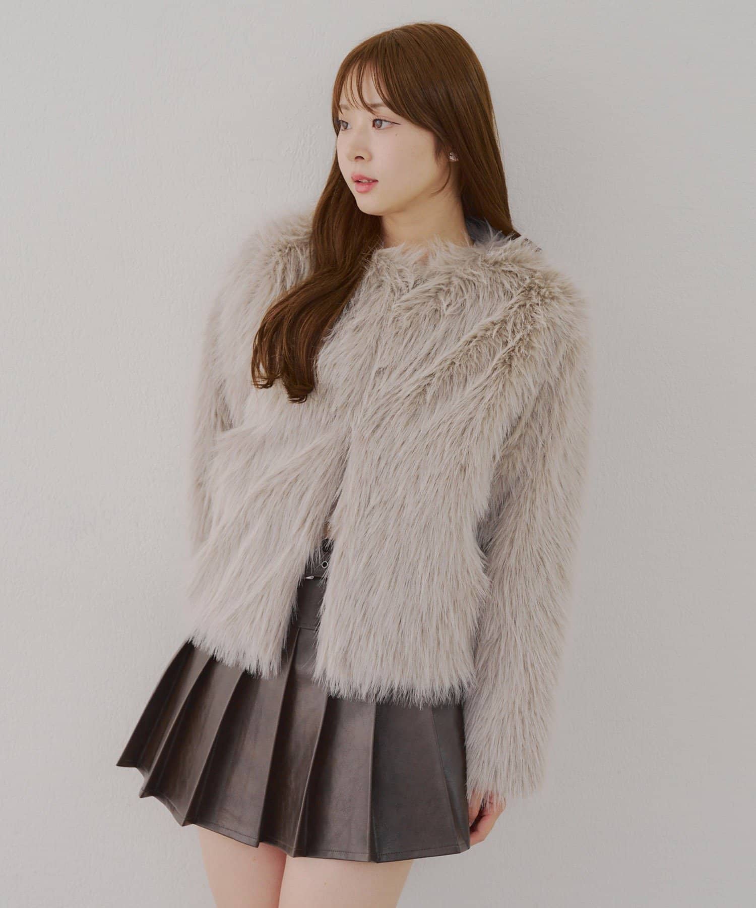 ・存在感のあるフェイクファーを使用したノーカラージャケット