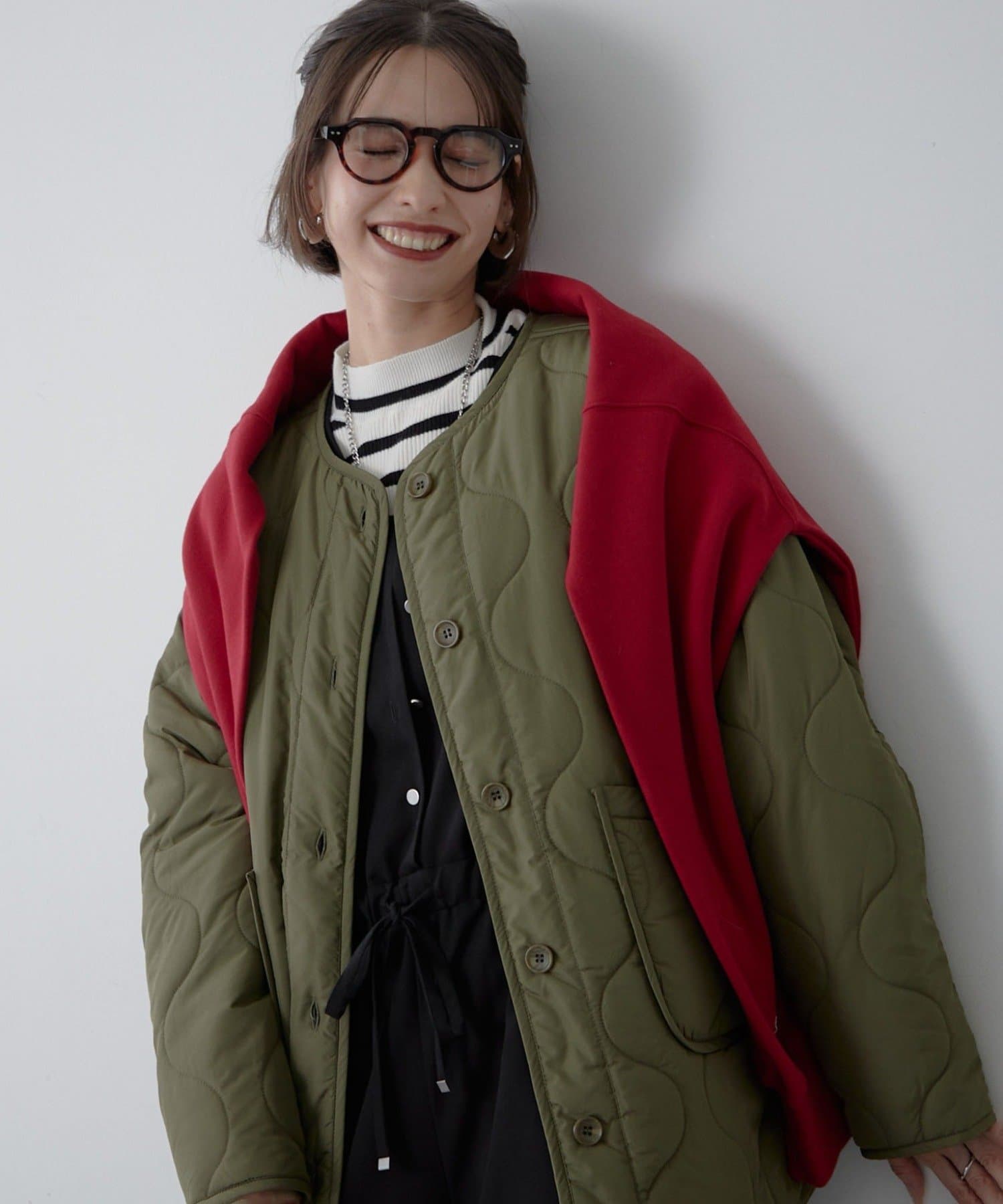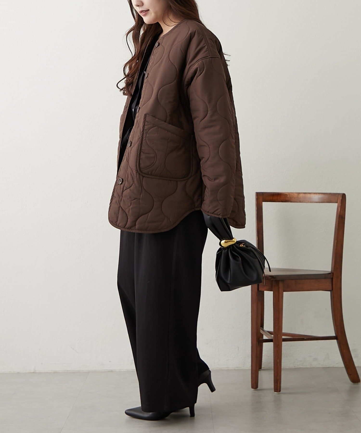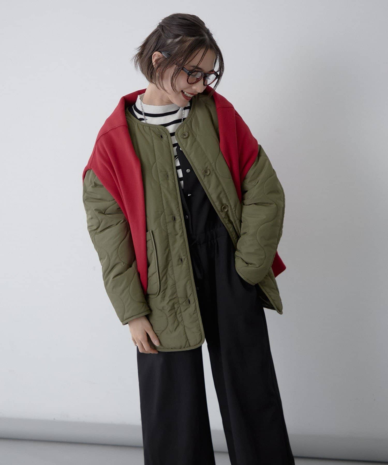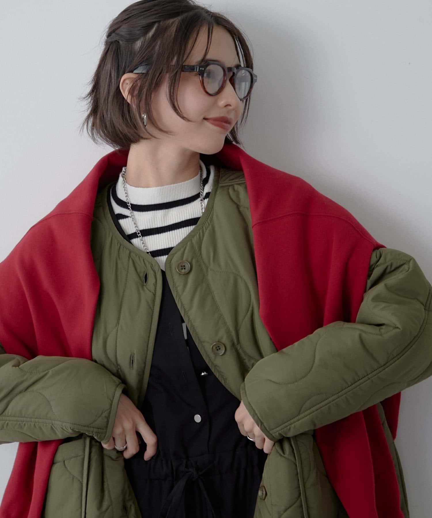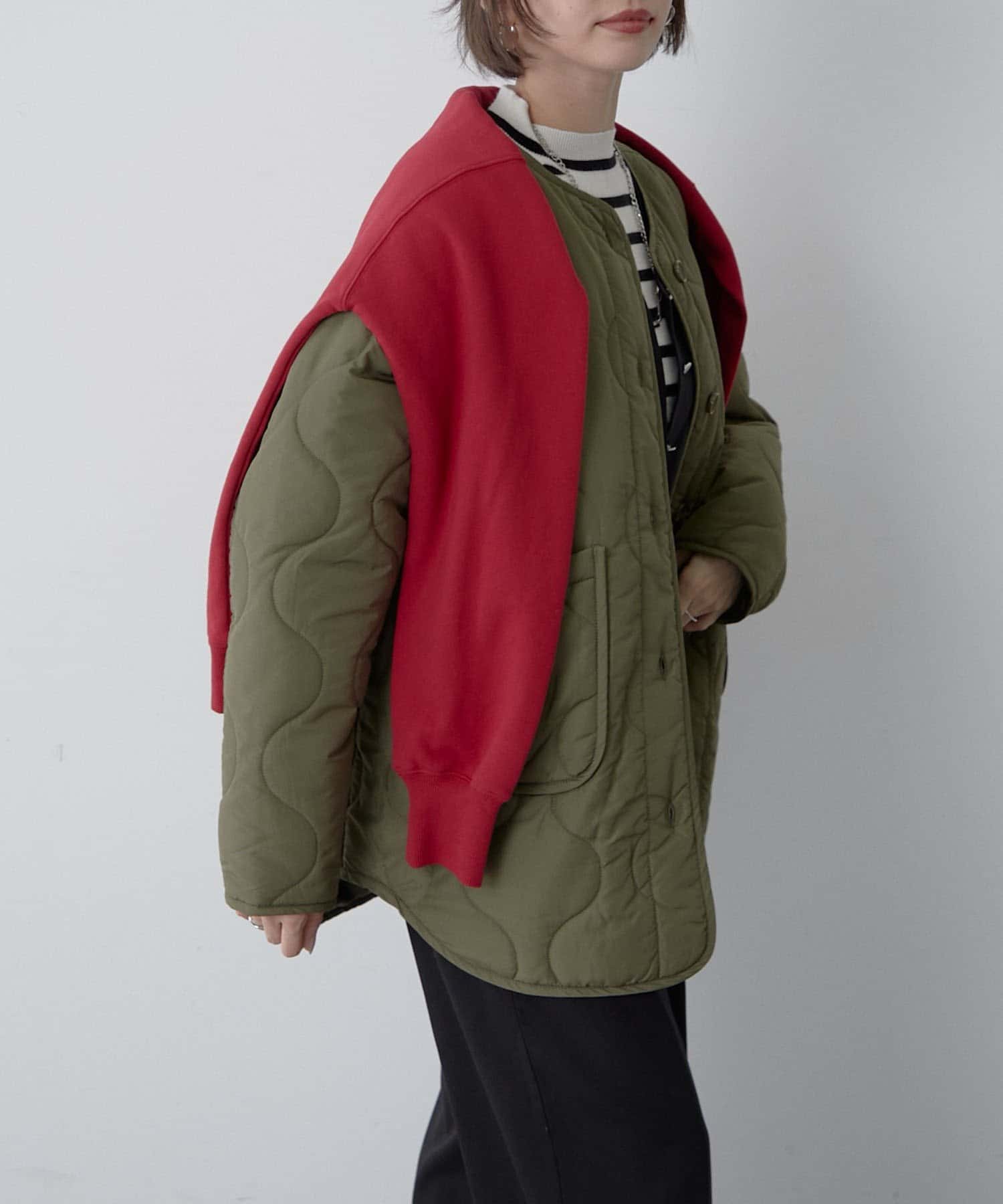 ・軽さと防寒に優れた秋冬アウターの定番キルト素材を使ったノーカラージャケット。