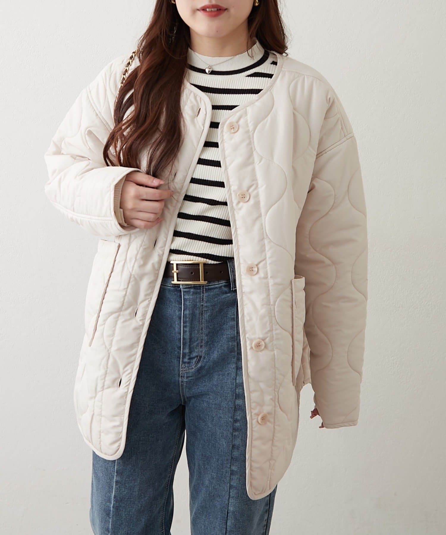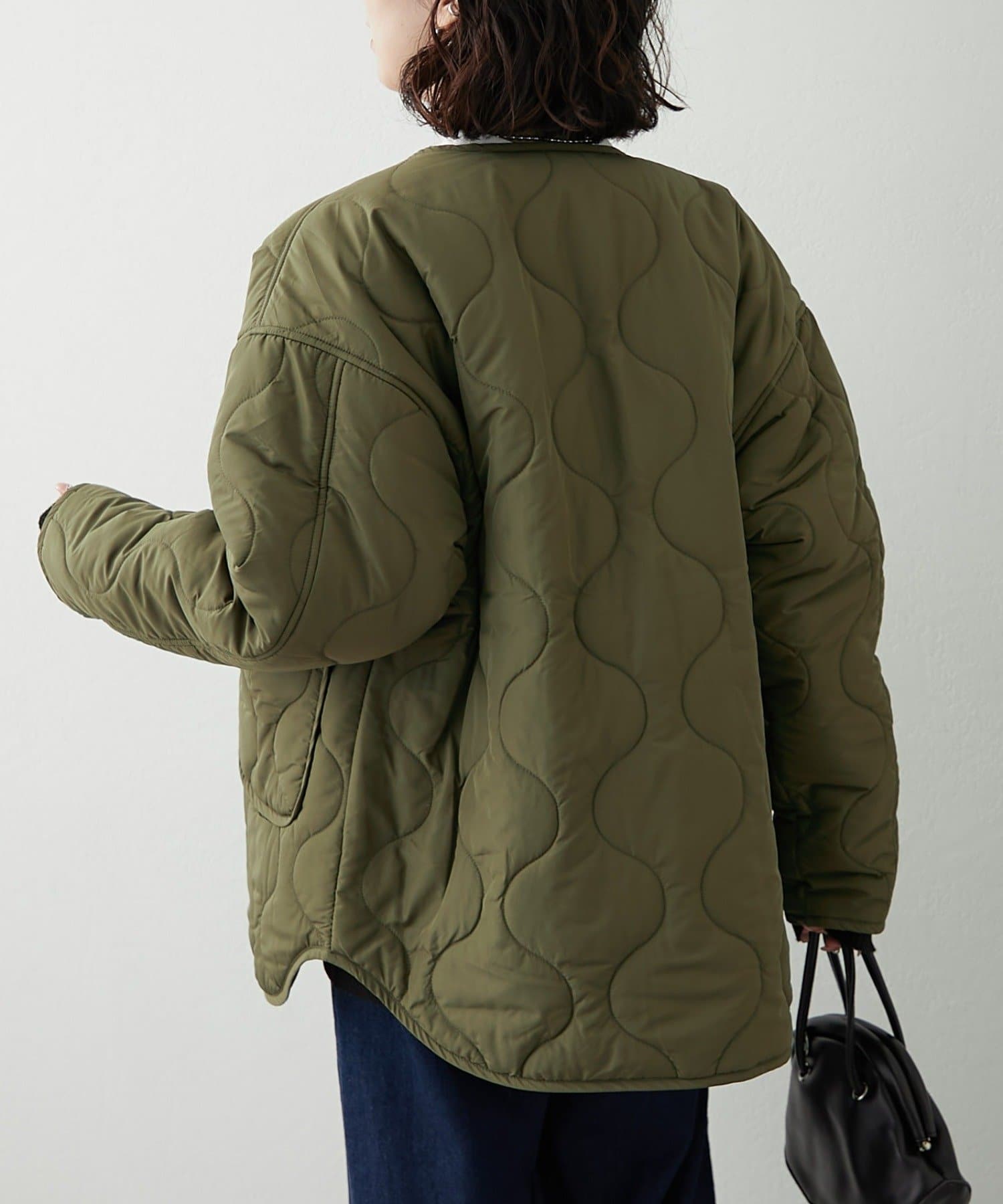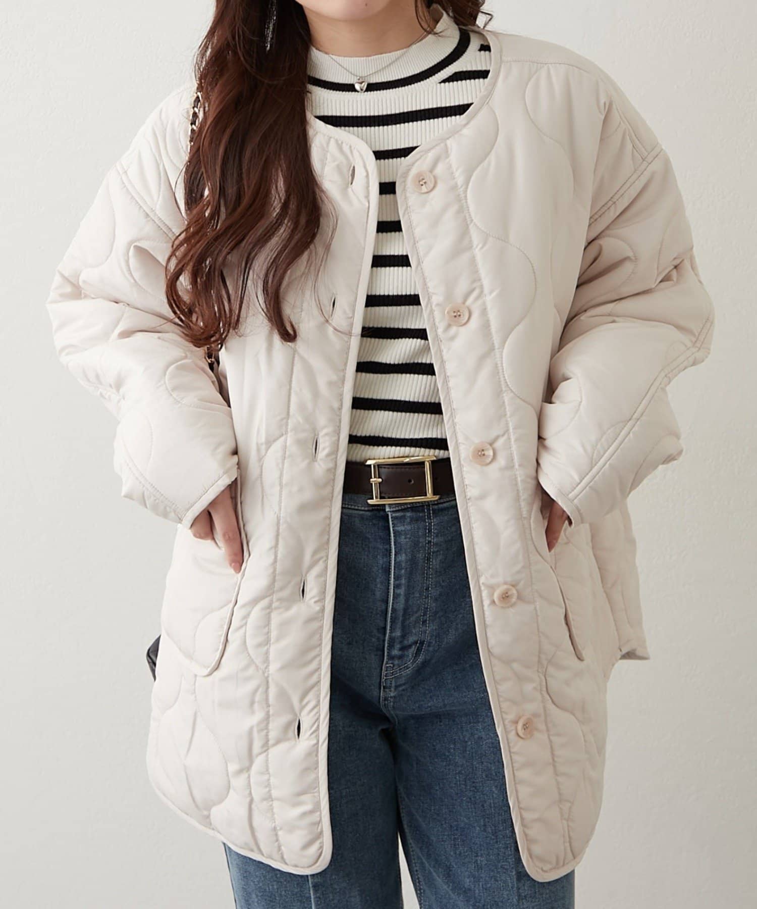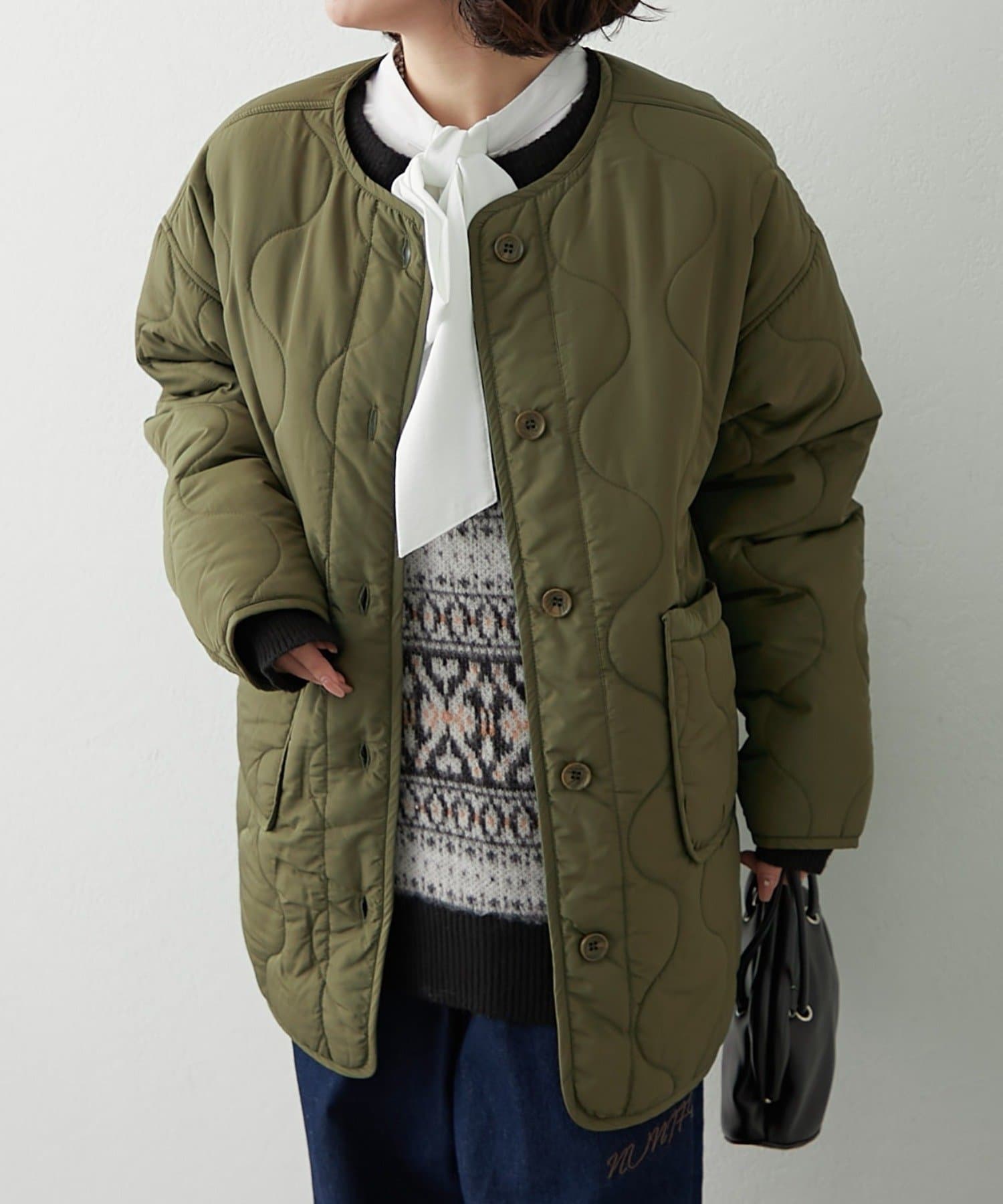 ・軽さと防寒に優れた秋冬アウターの定番キルト素材を使ったノーカラージャケット。