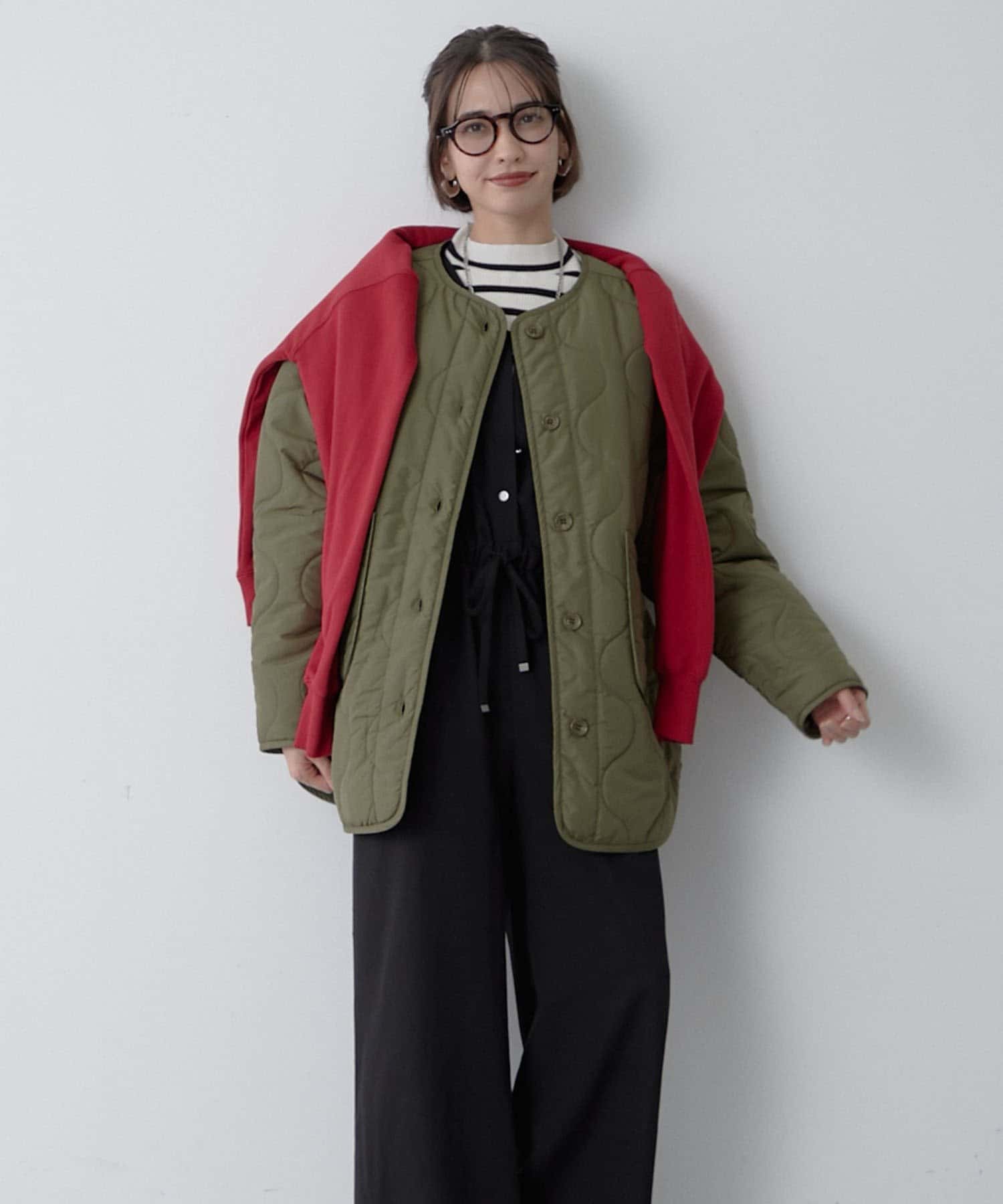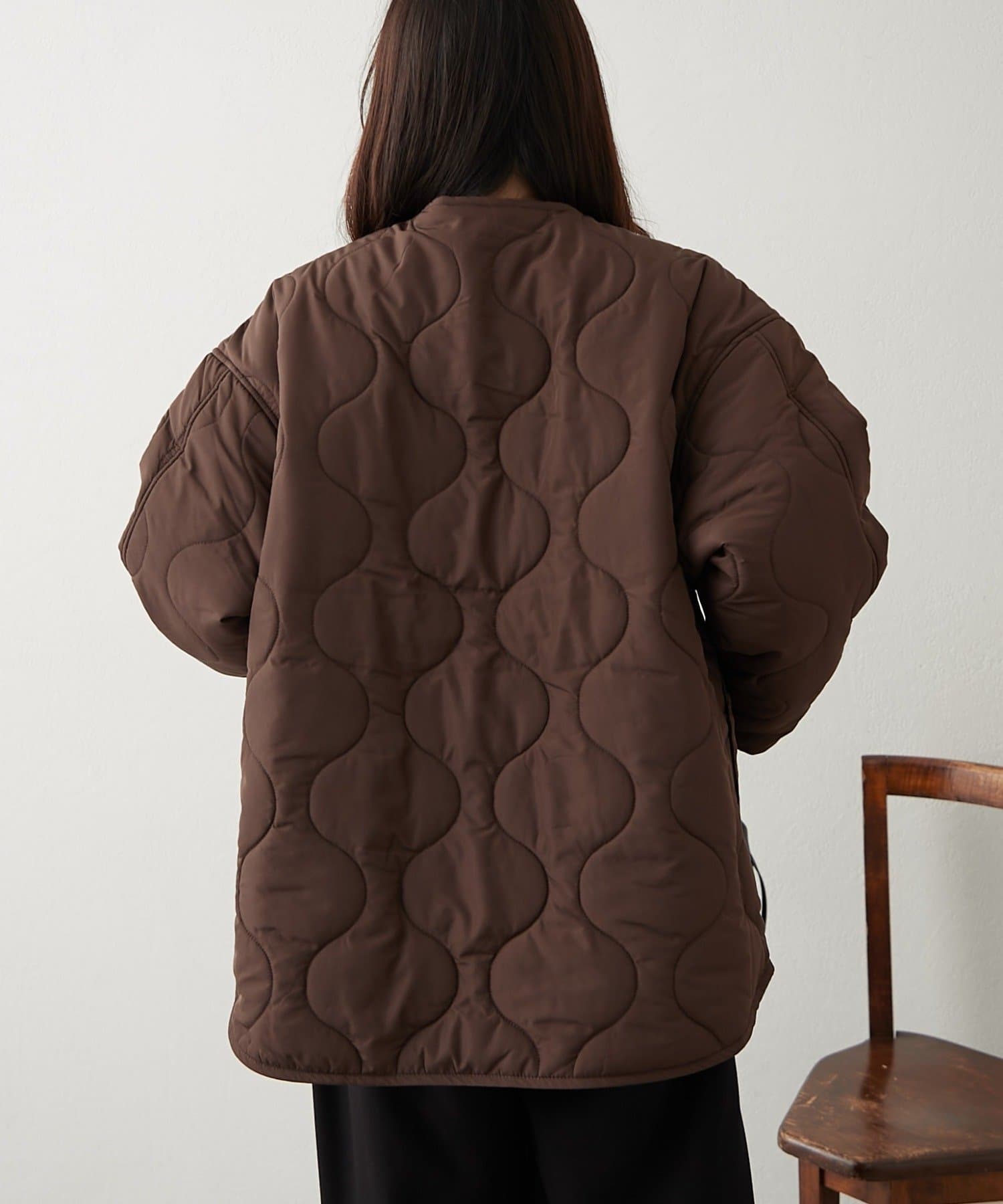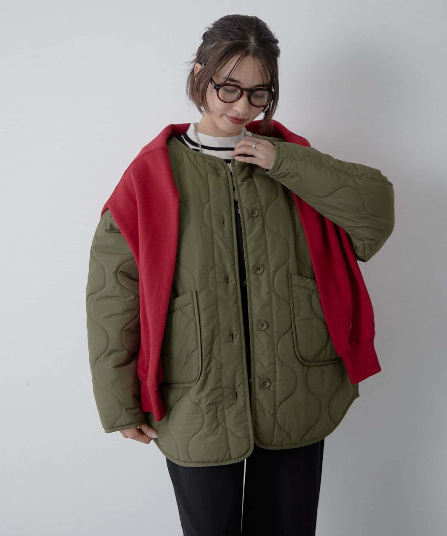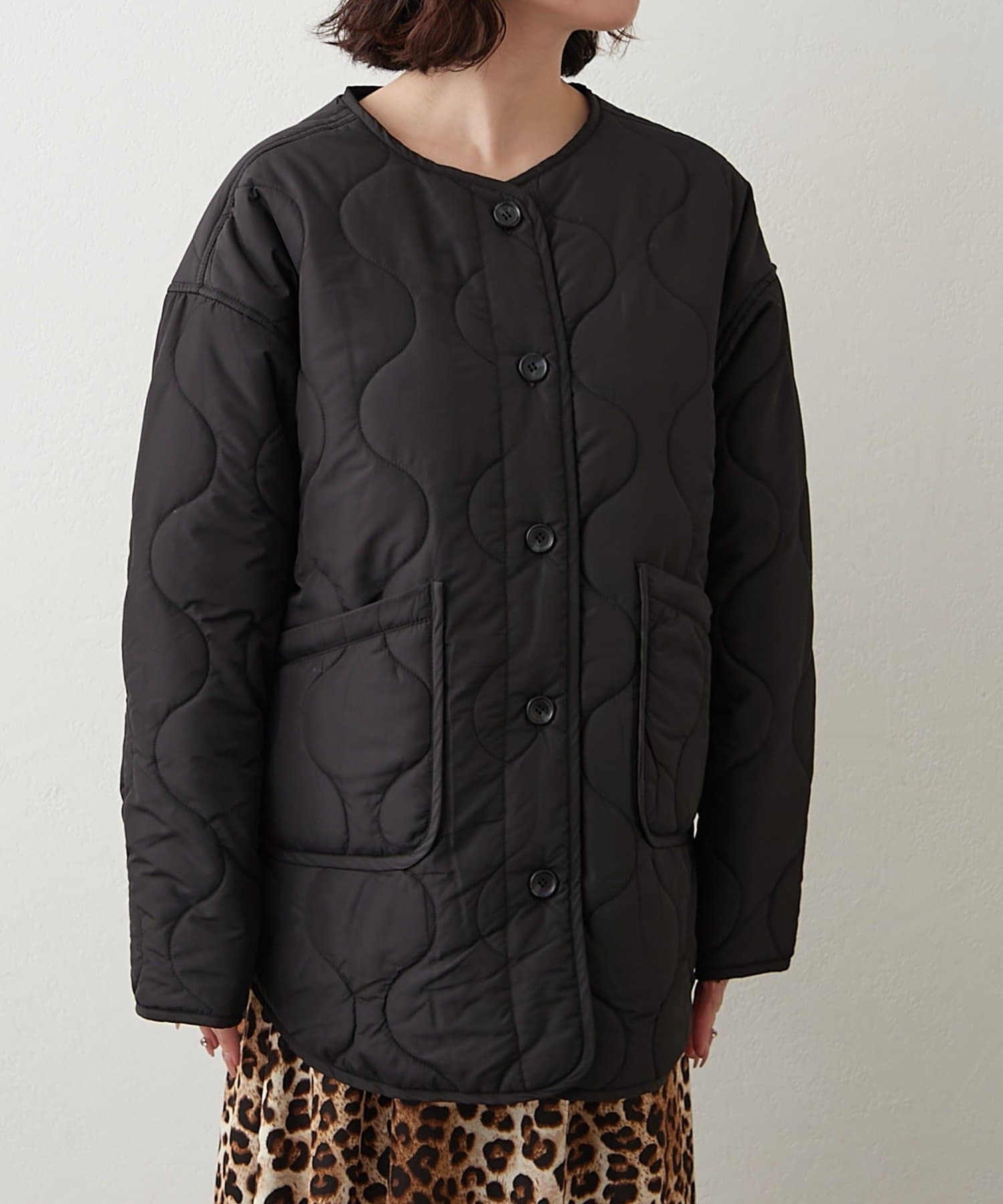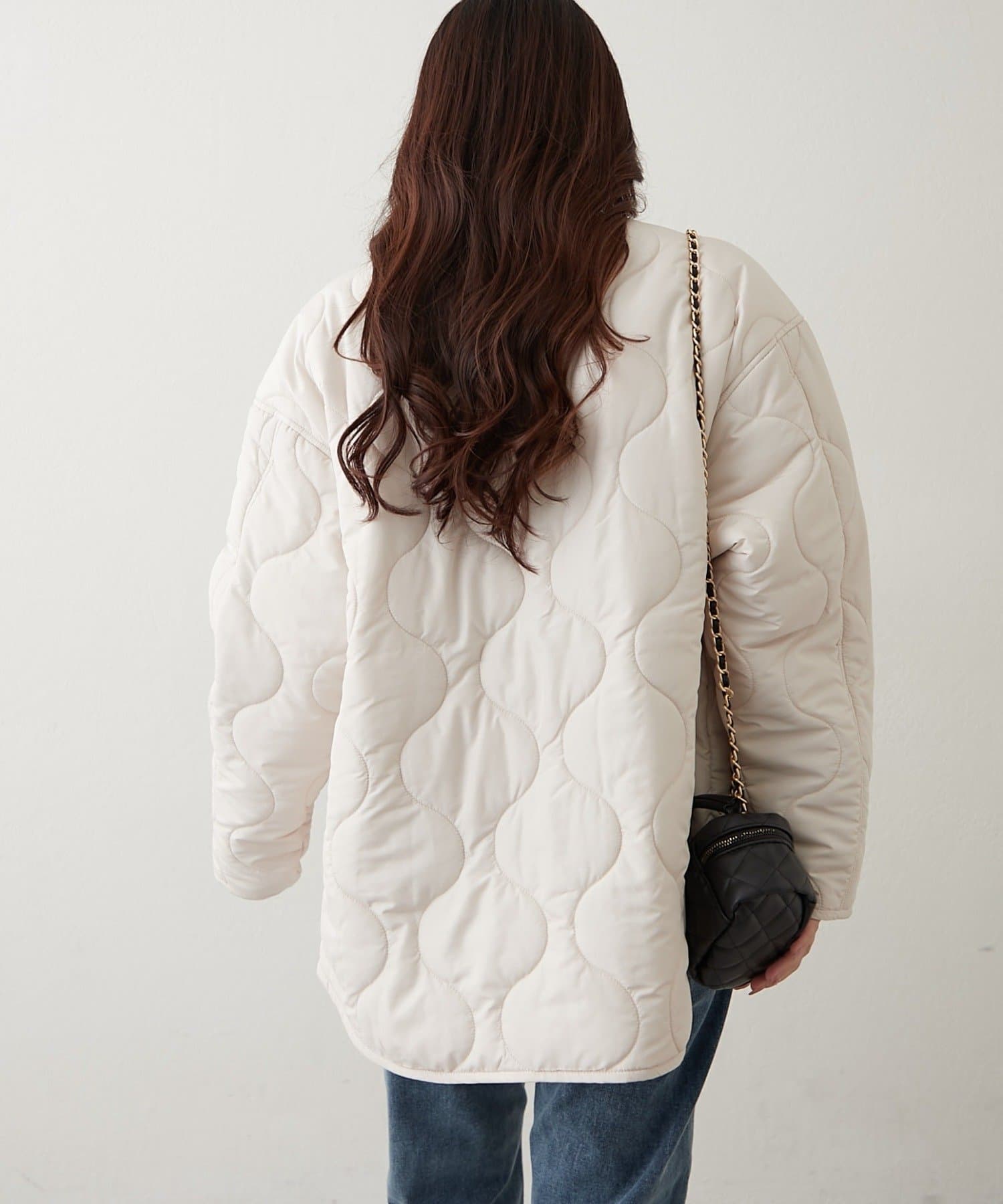 ・軽さと防寒に優れた秋冬アウターの定番キルト素材を使ったノーカラージャケット。