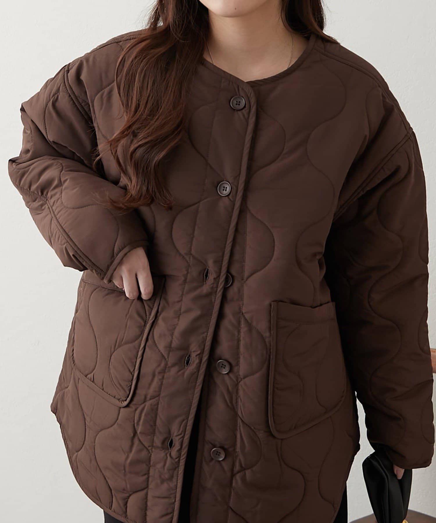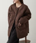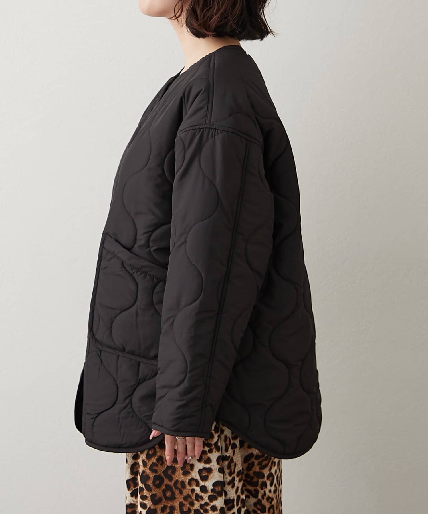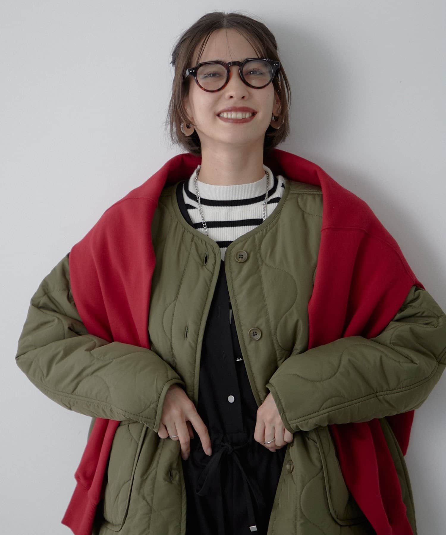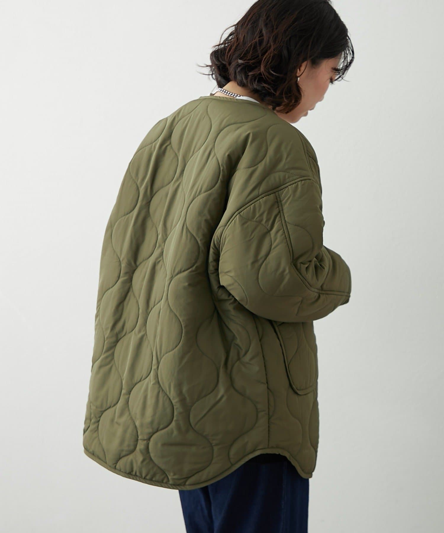 ・軽さと防寒に優れた秋冬アウターの定番キルト素材を使ったノーカラージャケット。