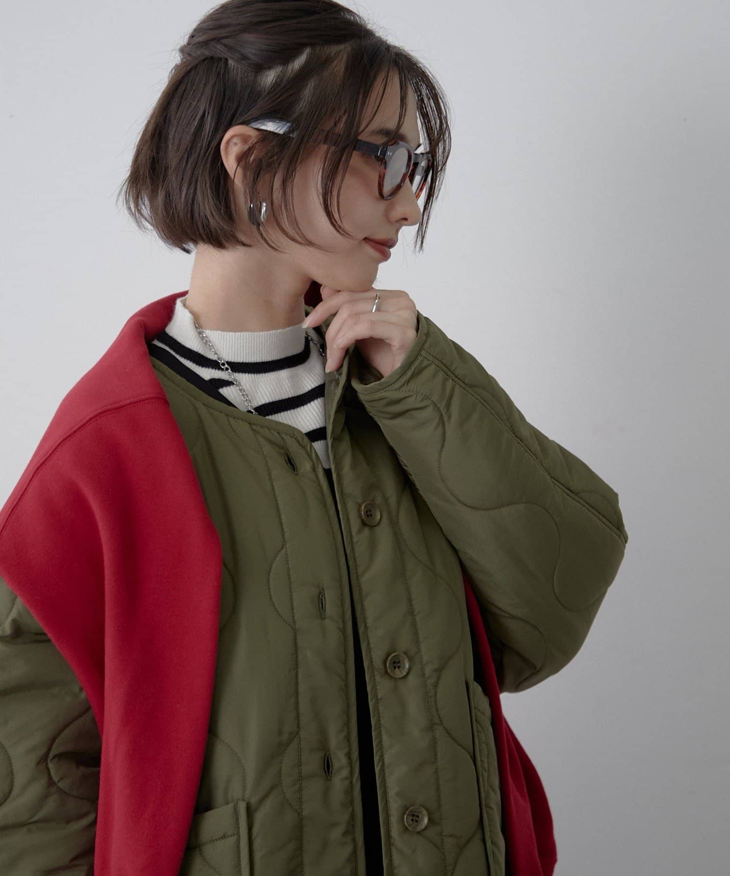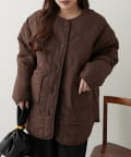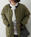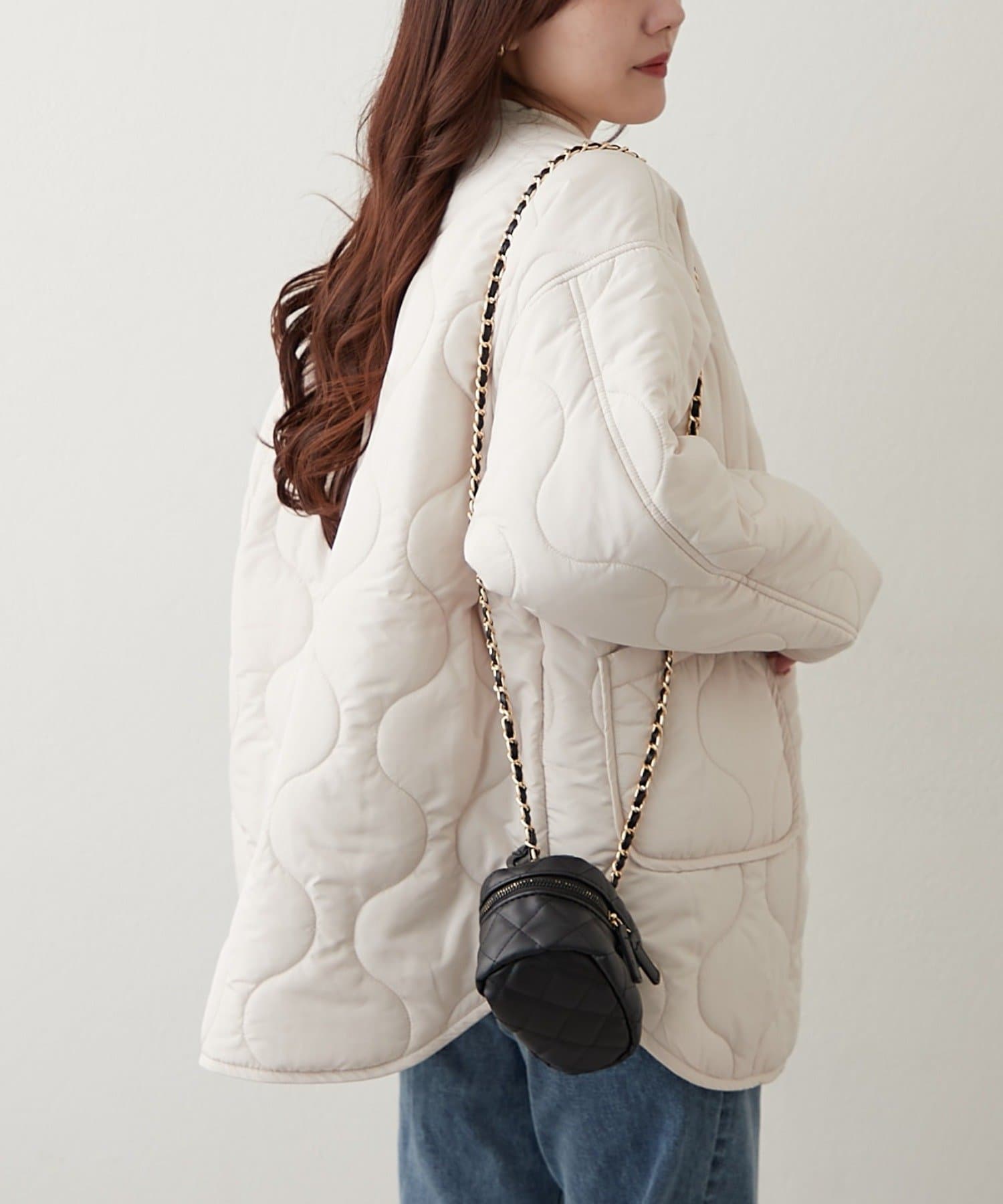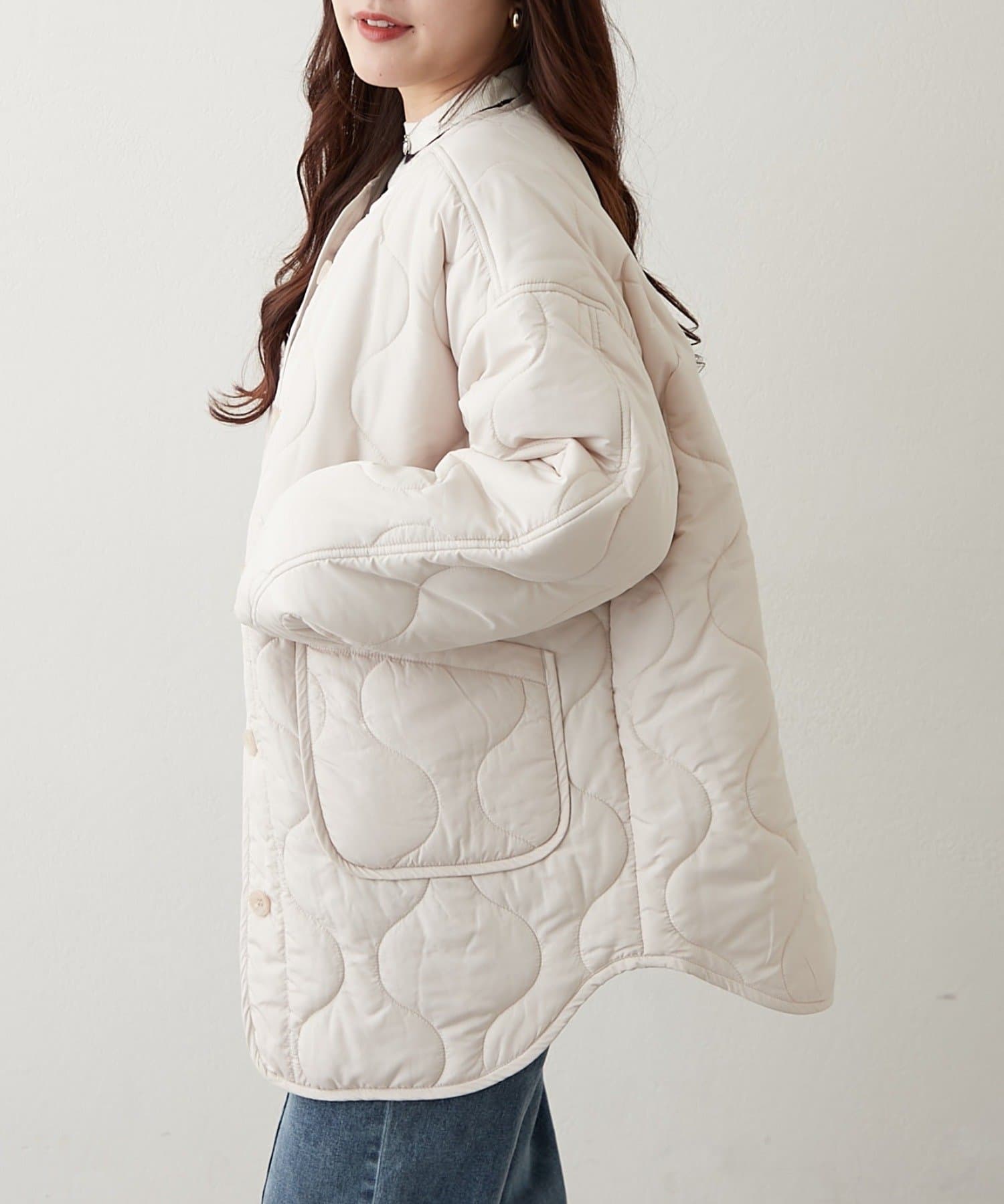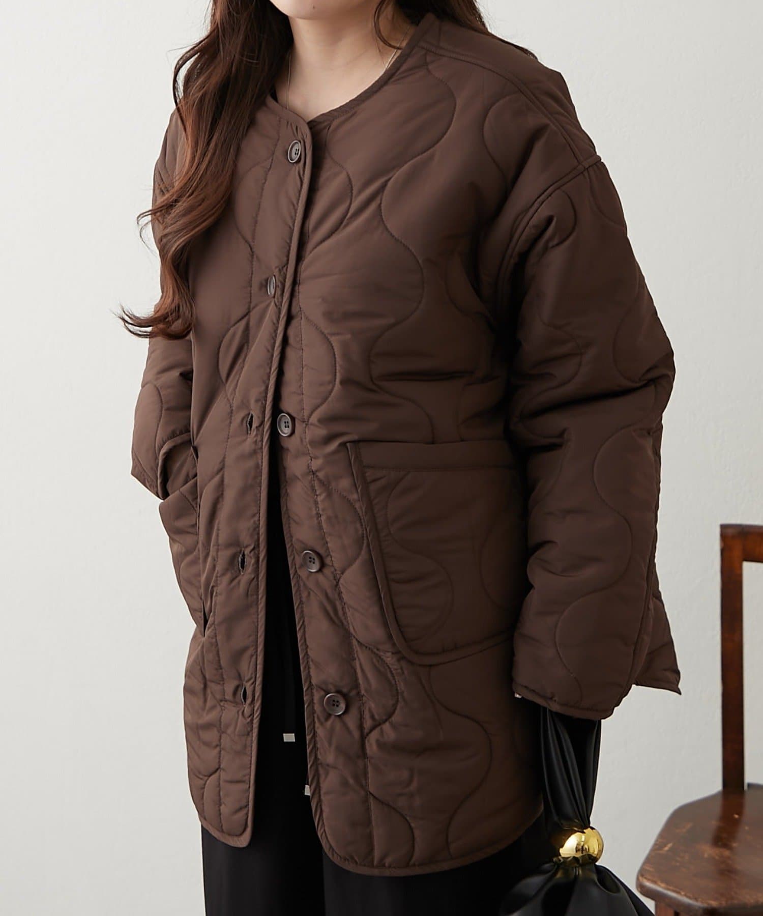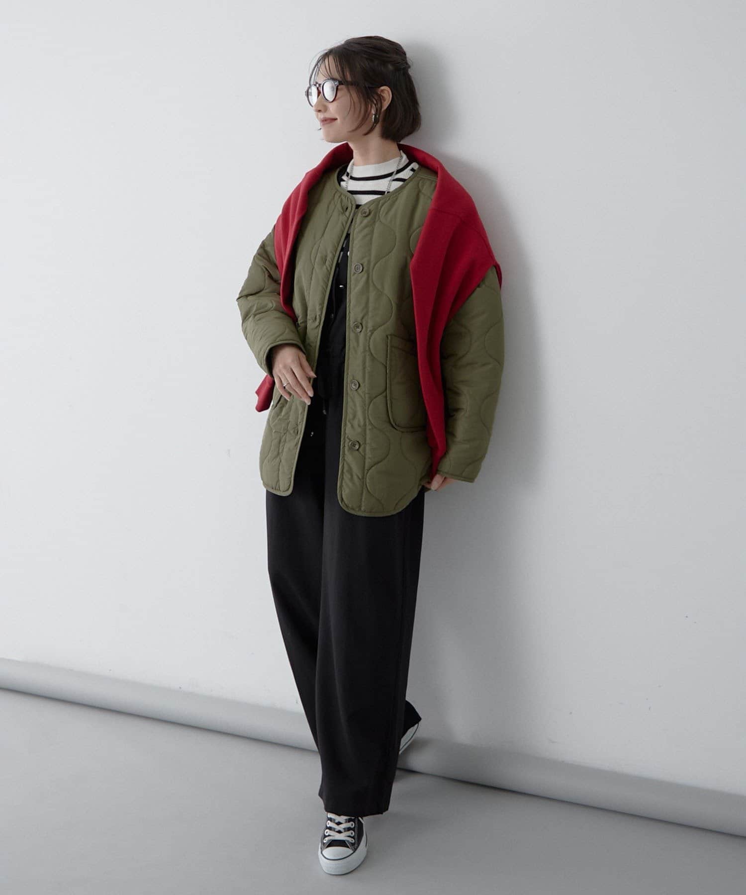 ・軽さと防寒に優れた秋冬アウターの定番キルト素材を使ったノーカラージャケット。