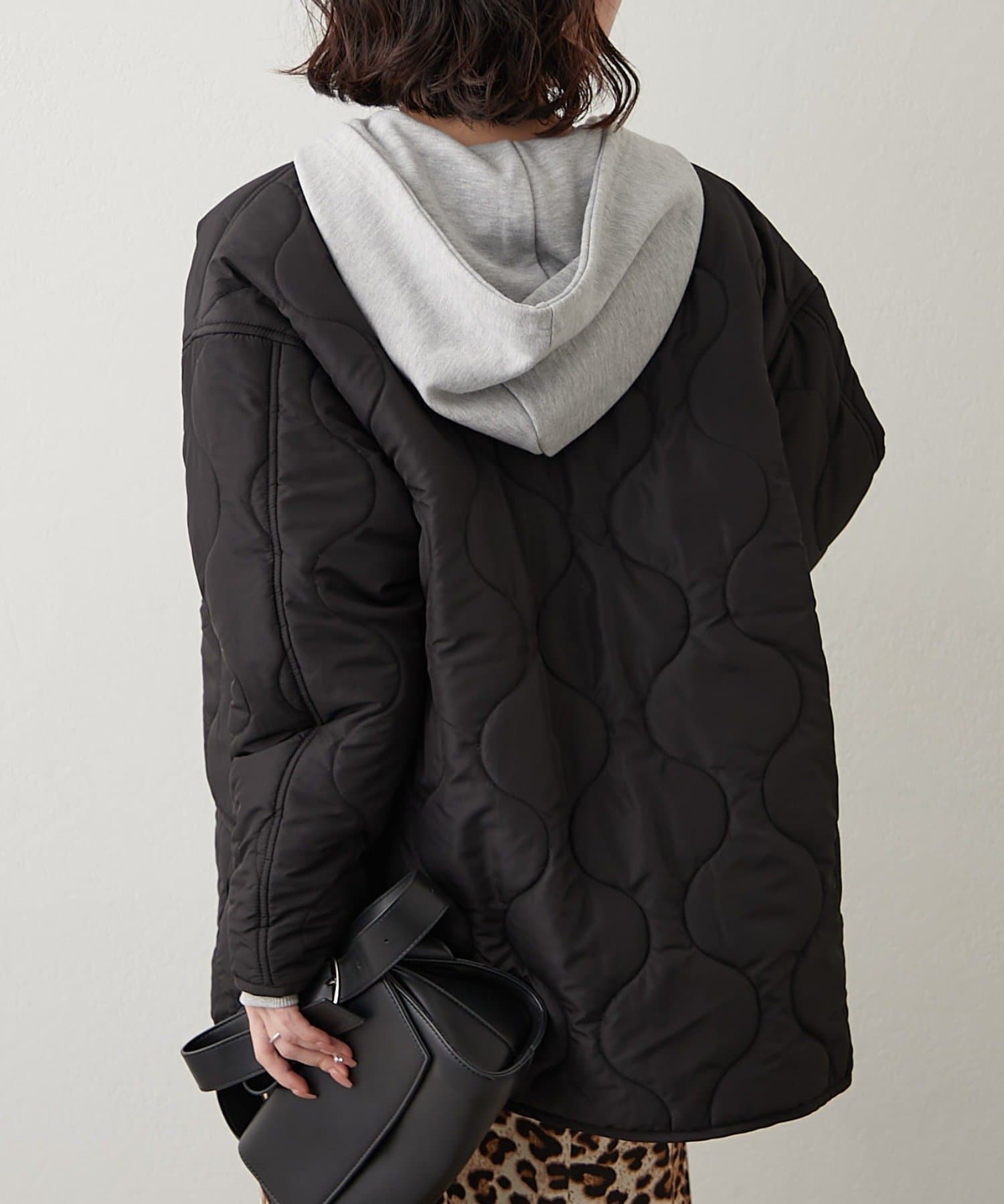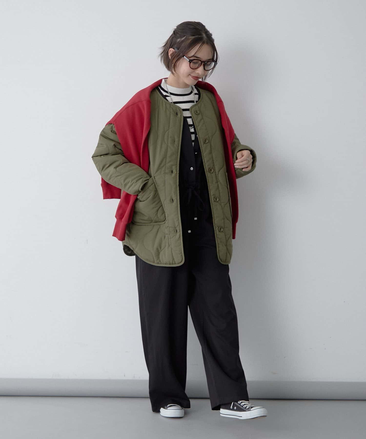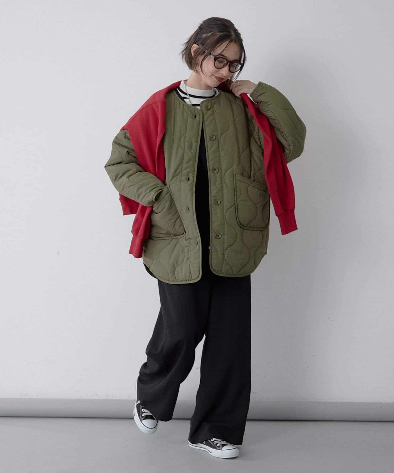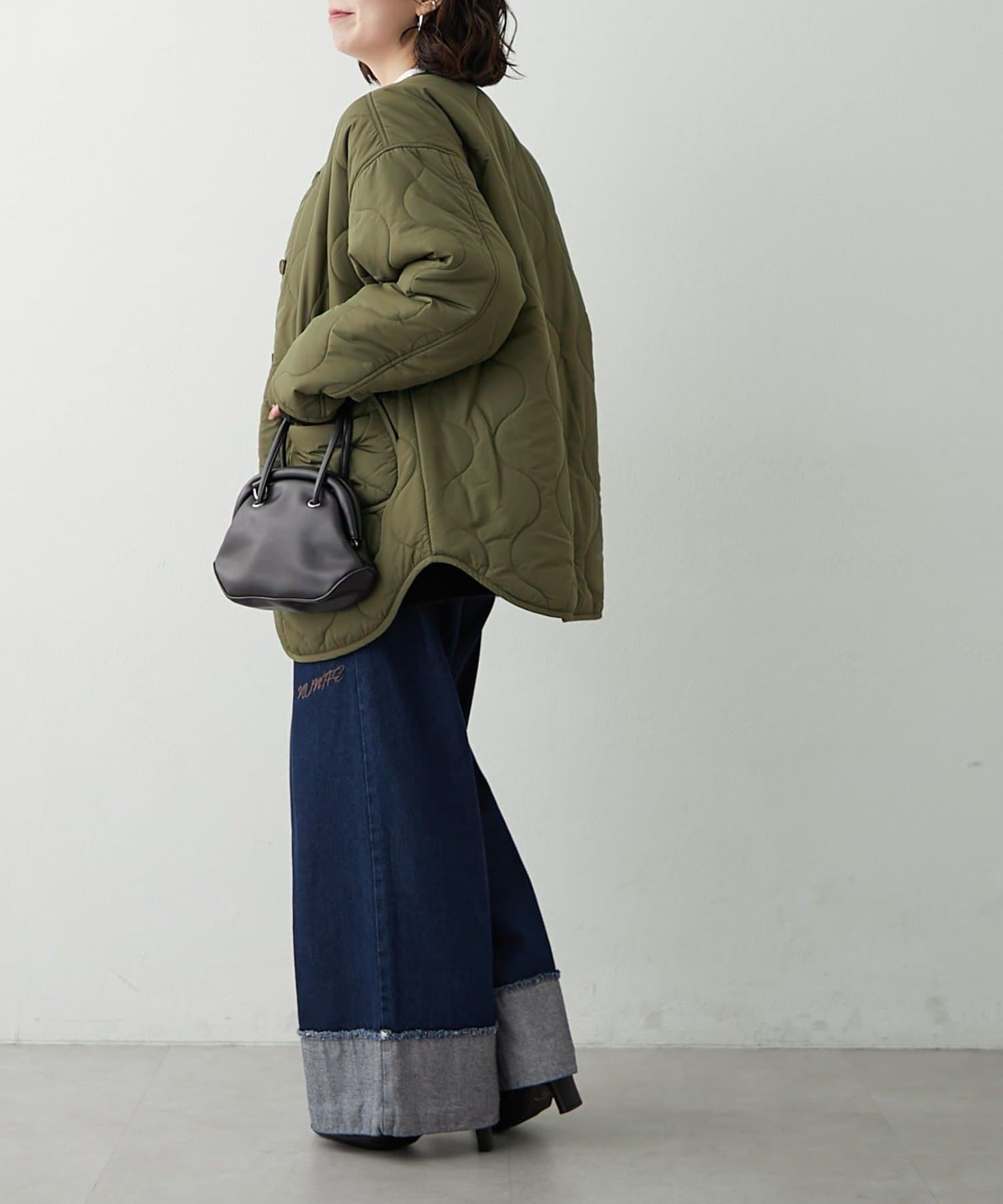 ・軽さと防寒に優れた秋冬アウターの定番キルト素材を使ったノーカラージャケット。