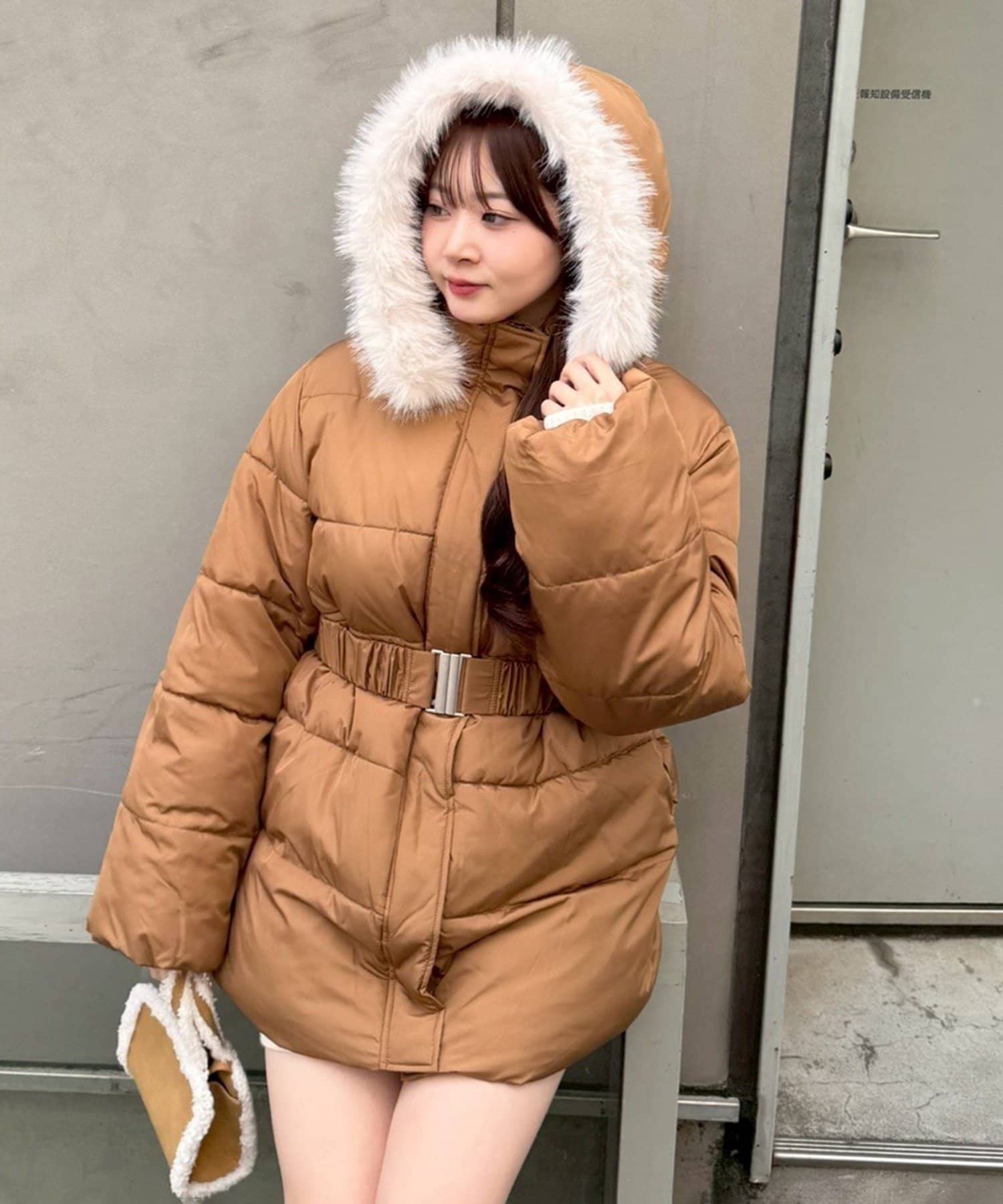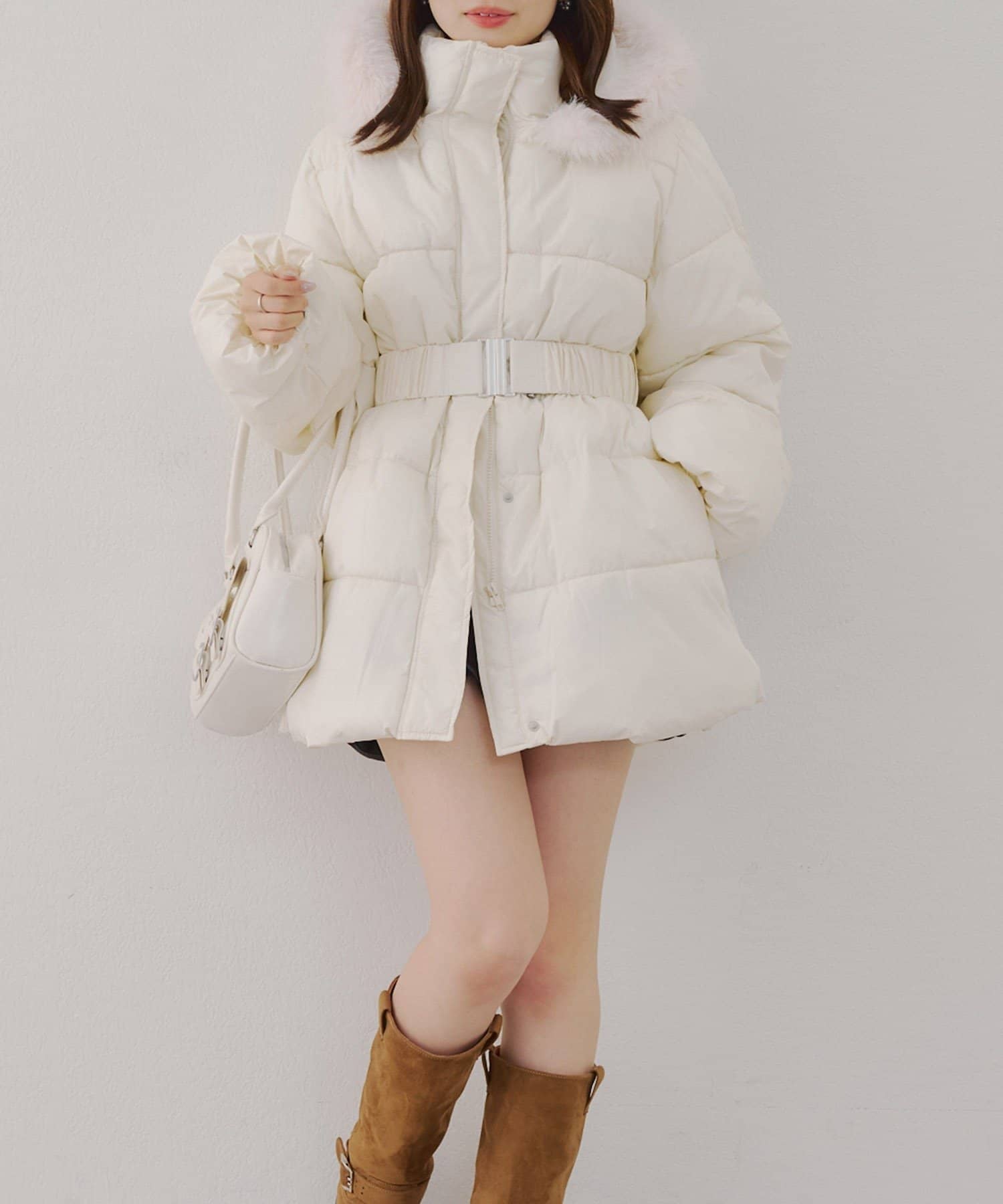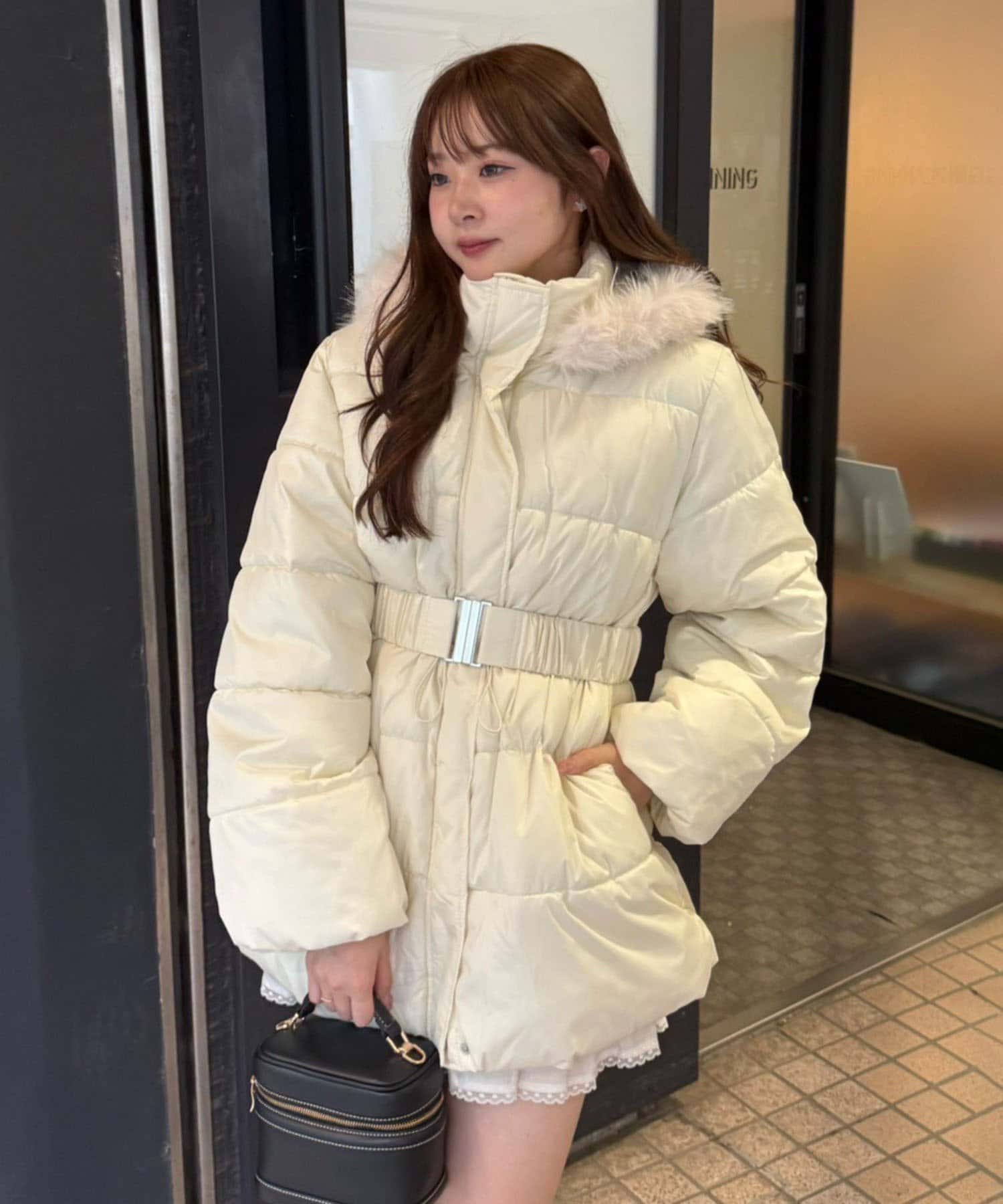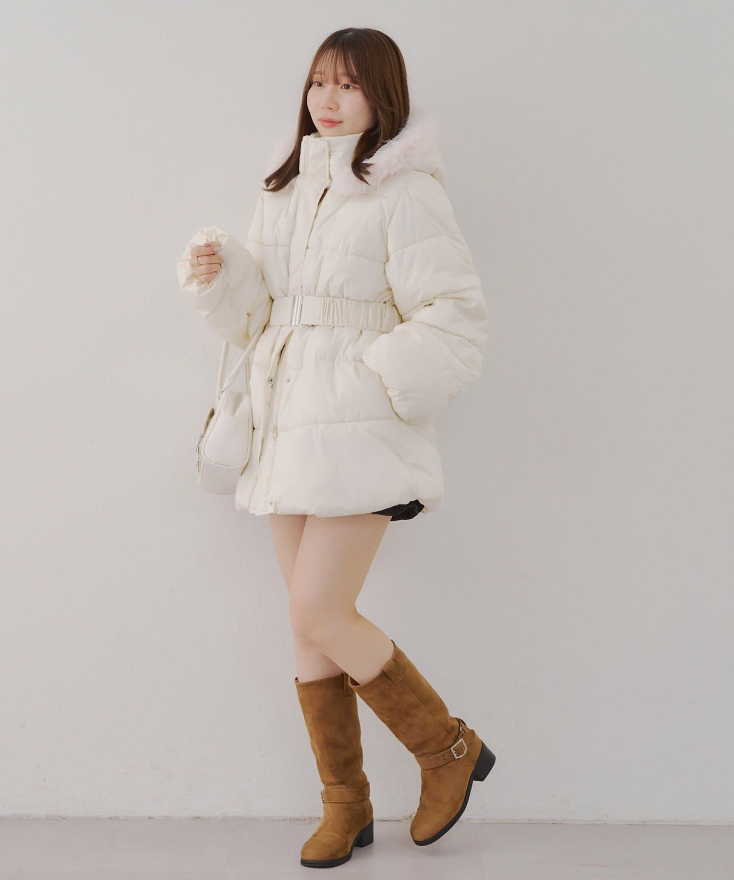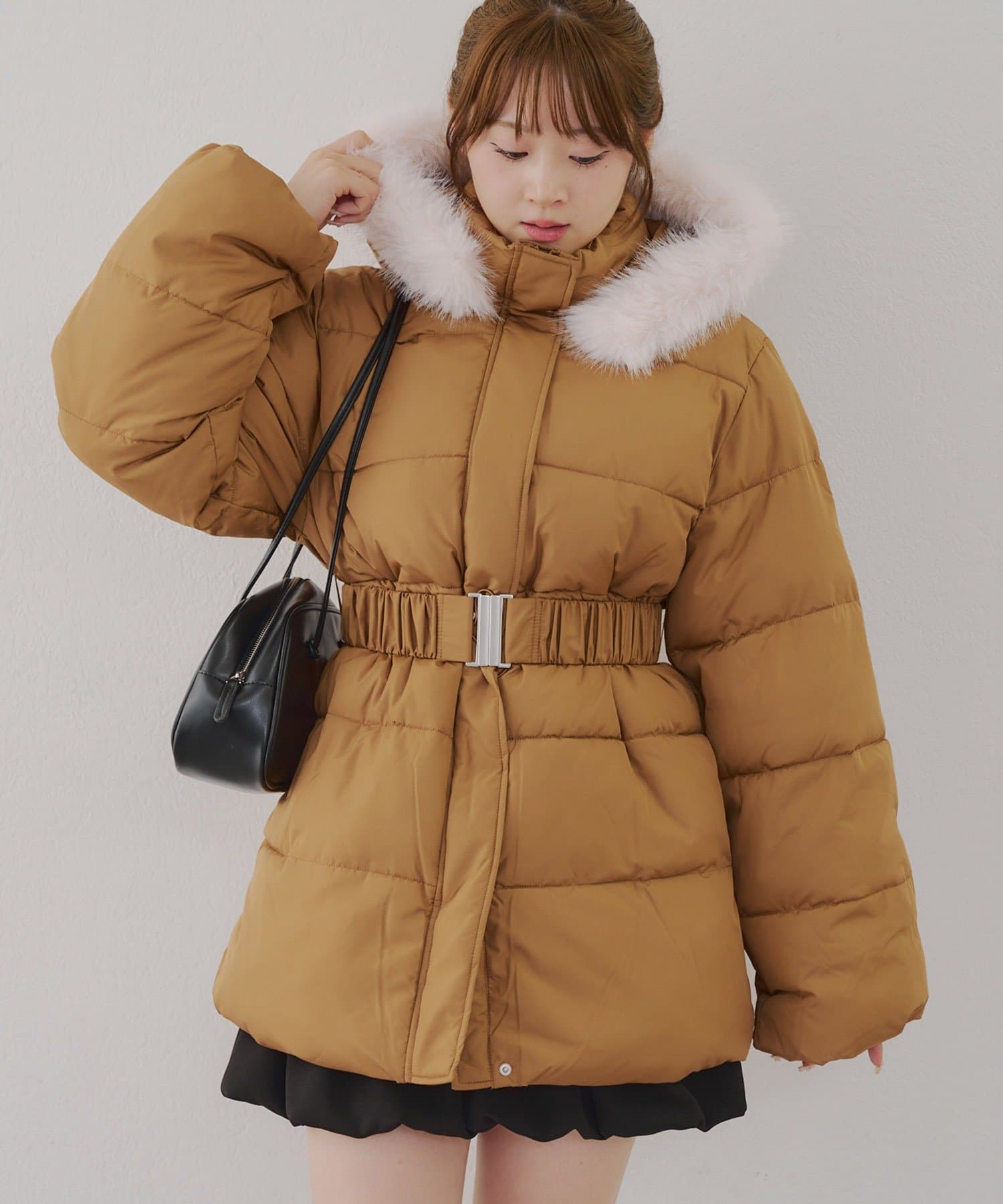 ・暖かさと可愛さを両立する、ベルト付き中綿コート。