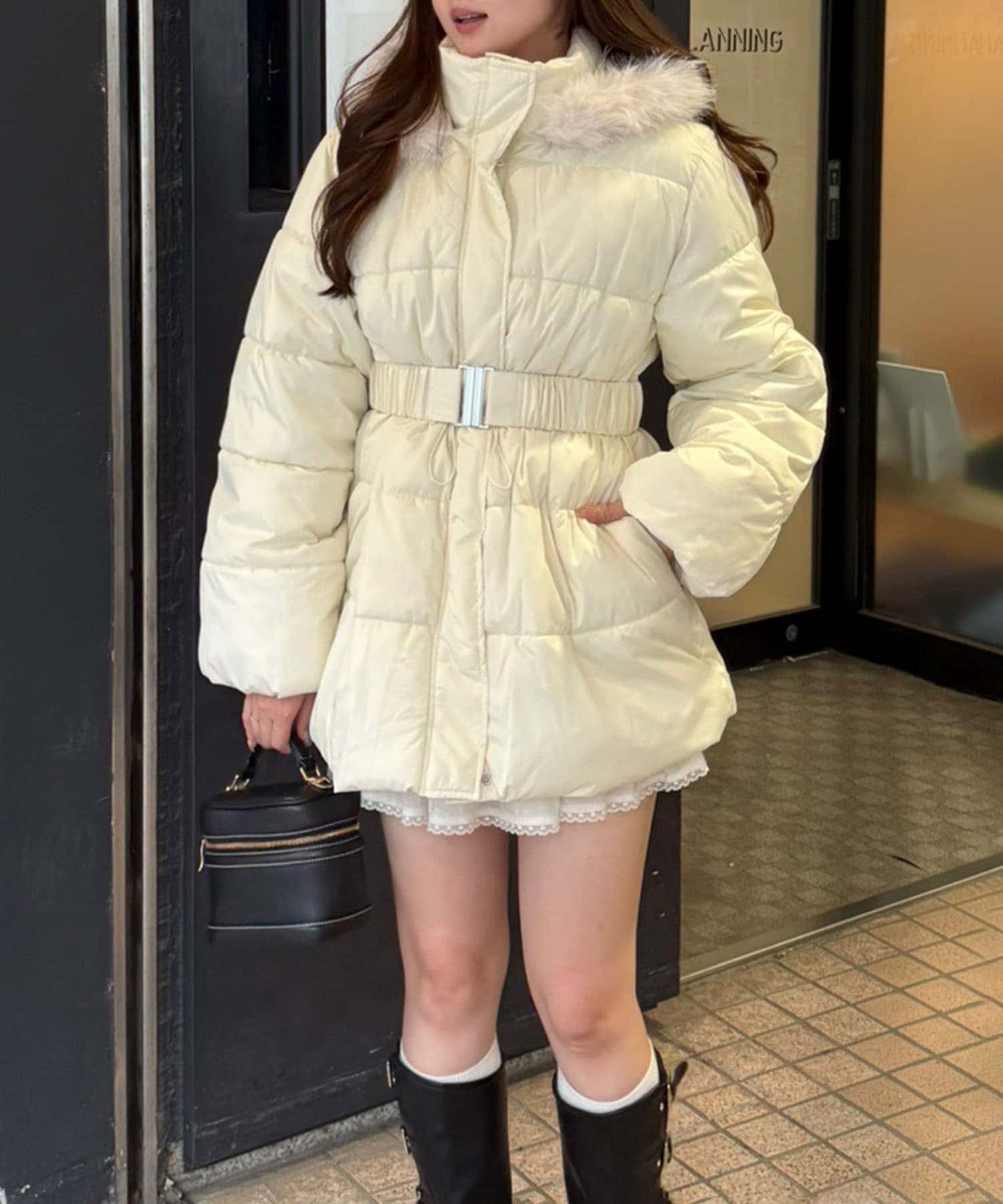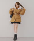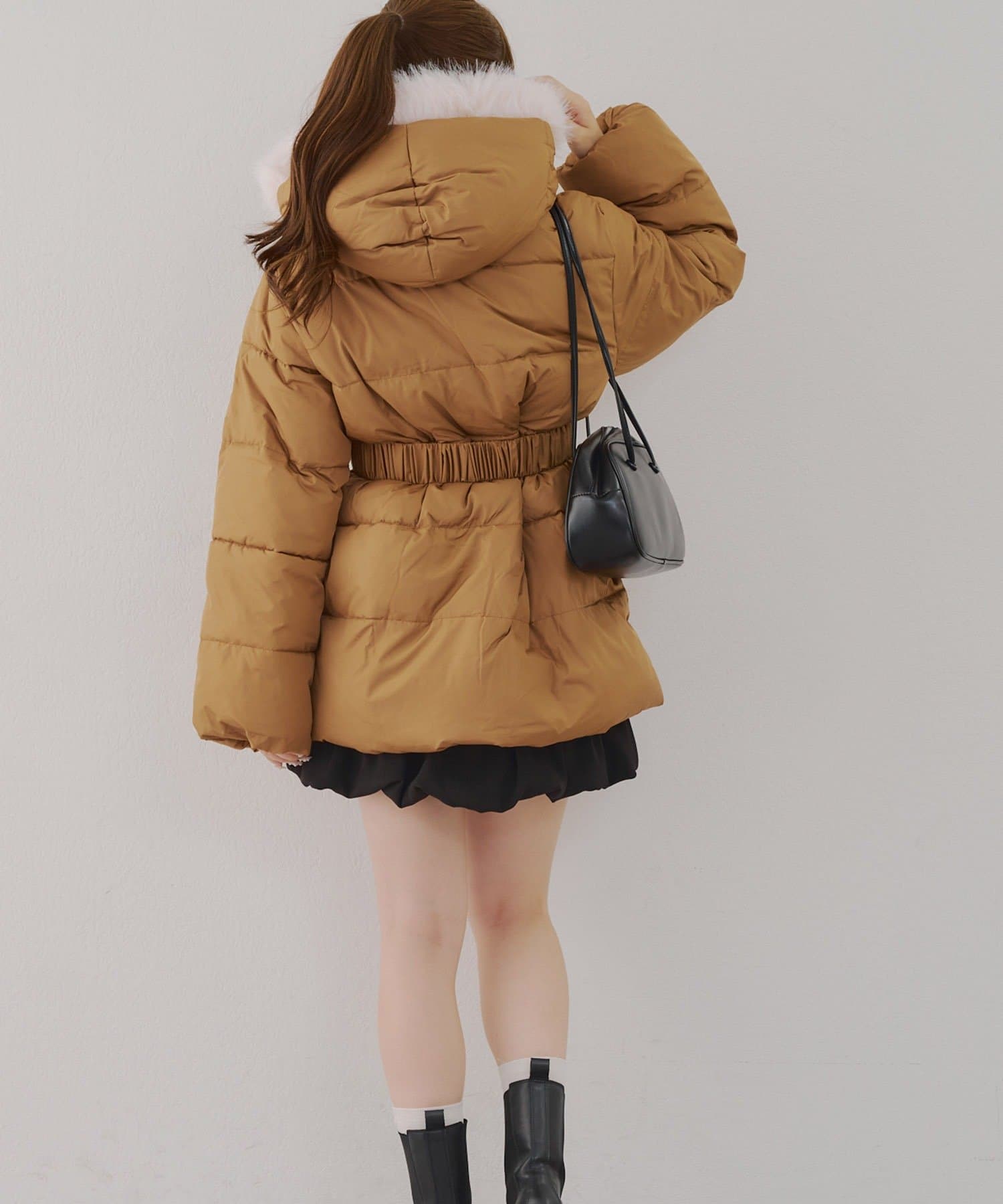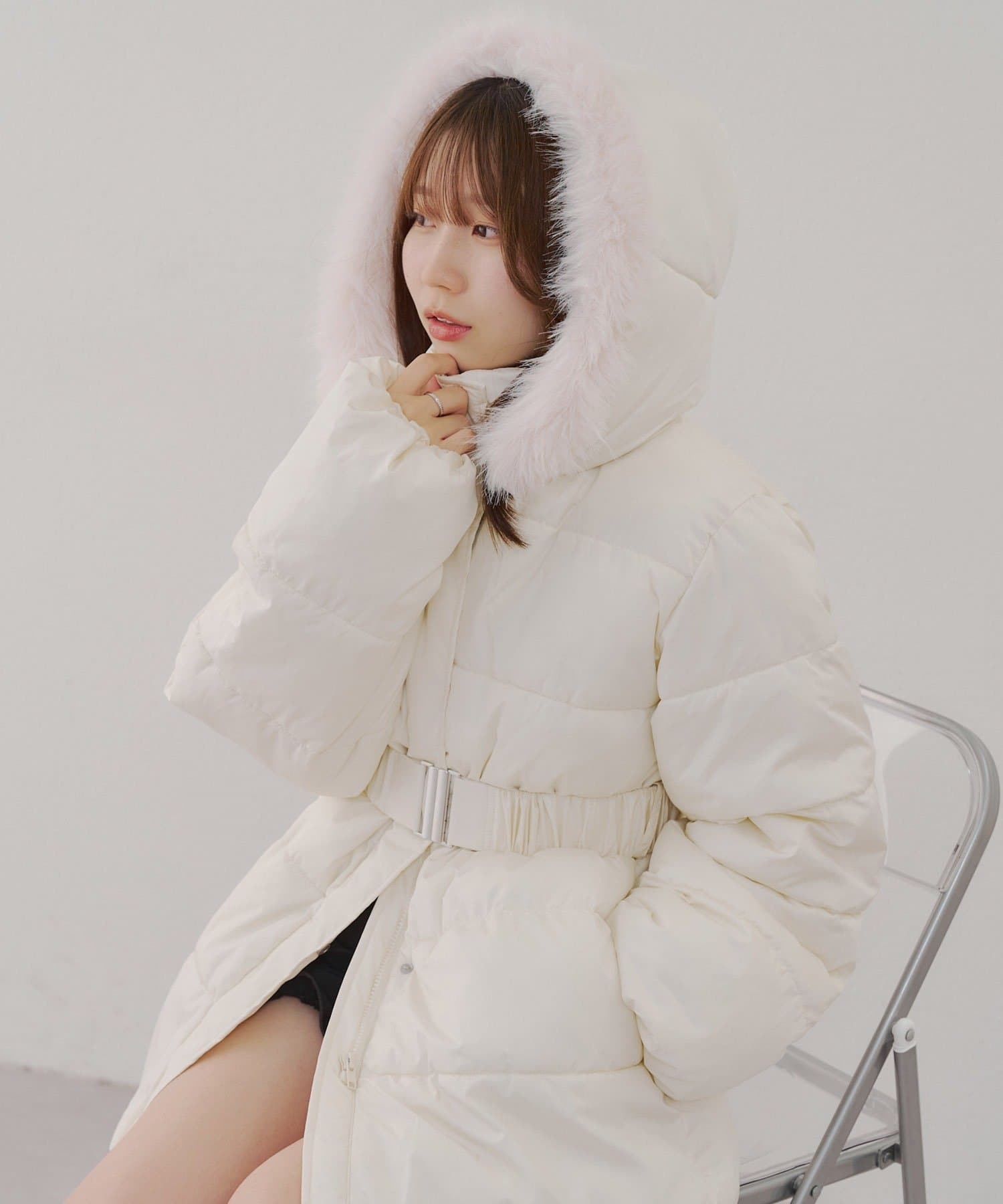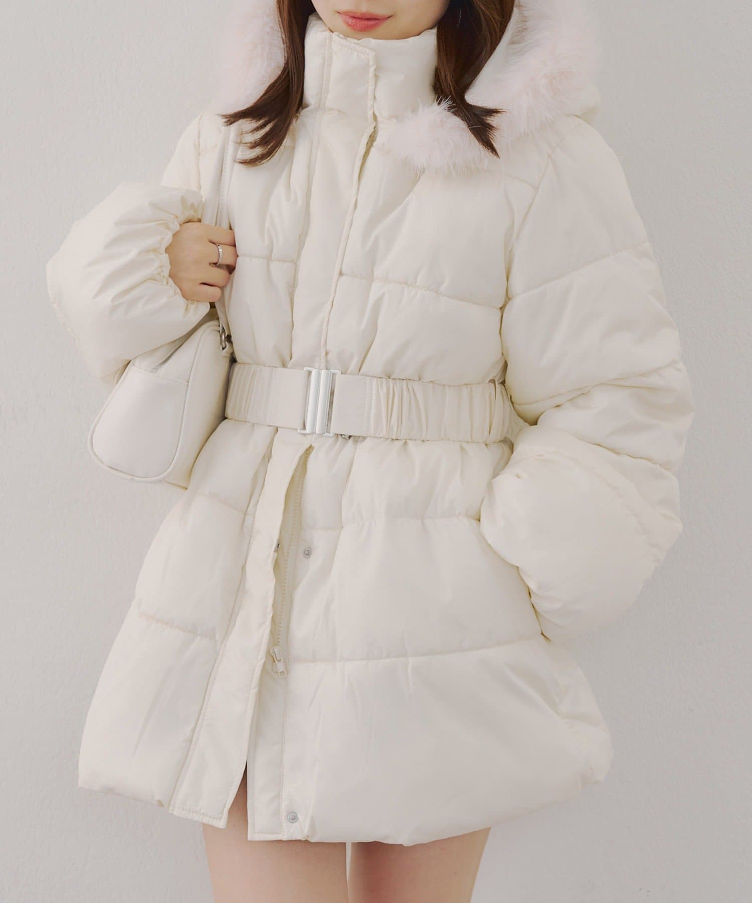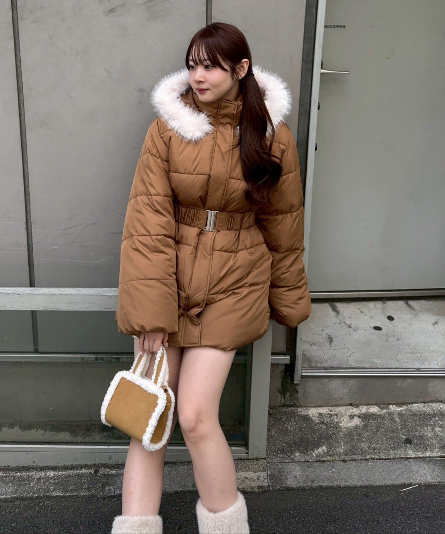 ・暖かさと可愛さを両立する、ベルト付き中綿コート。