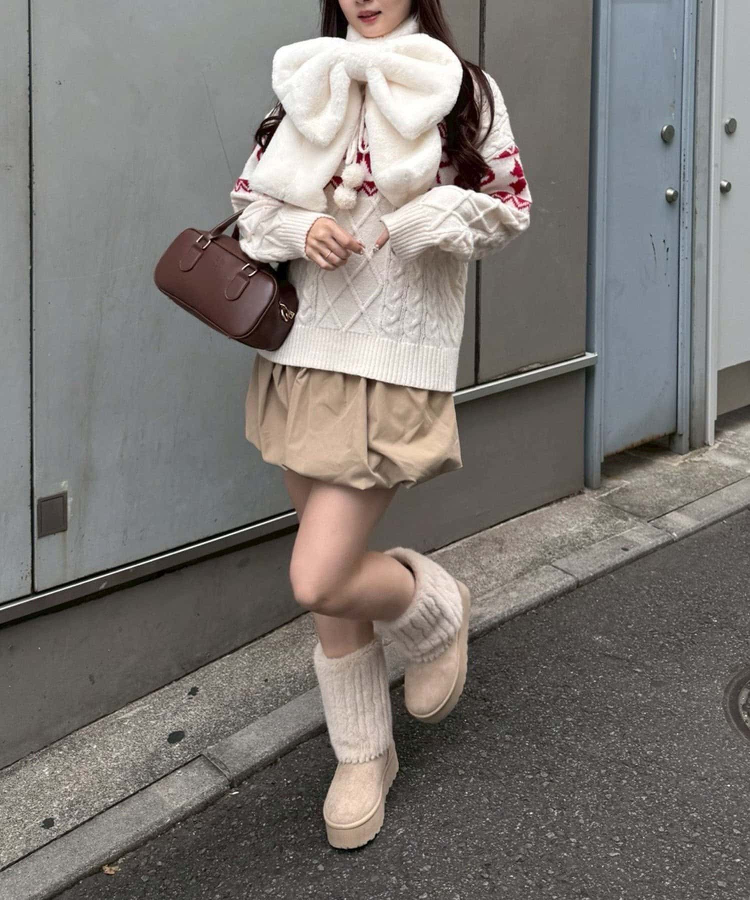 ・オーバーサイズのニットにバルーンスカート合わせで秋冬ガーリーコーデ