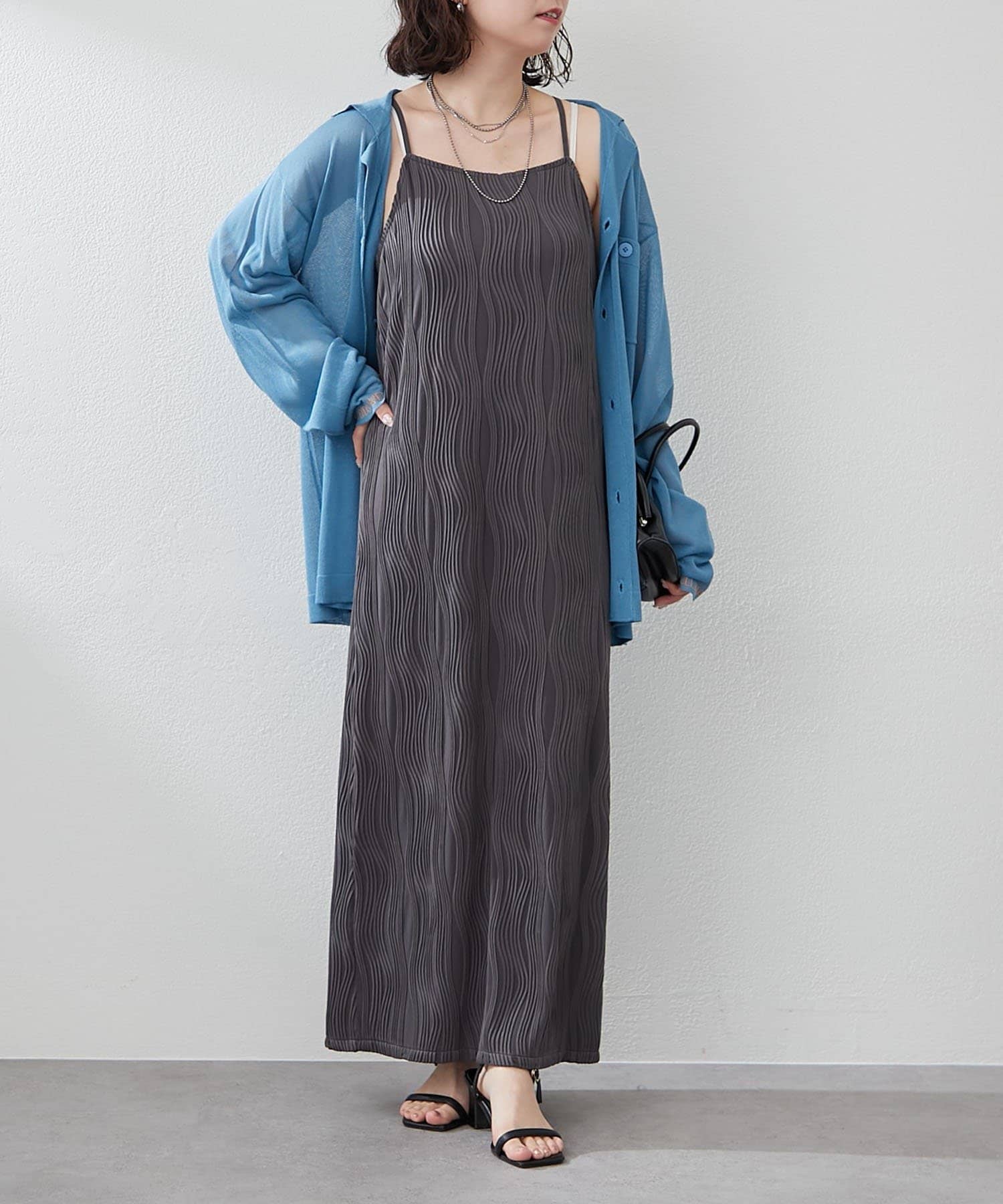 ・オトナな着こなしになるキャミインナーにシアーシャツやカーディガンを羽織ってほどよい肌見せも◎