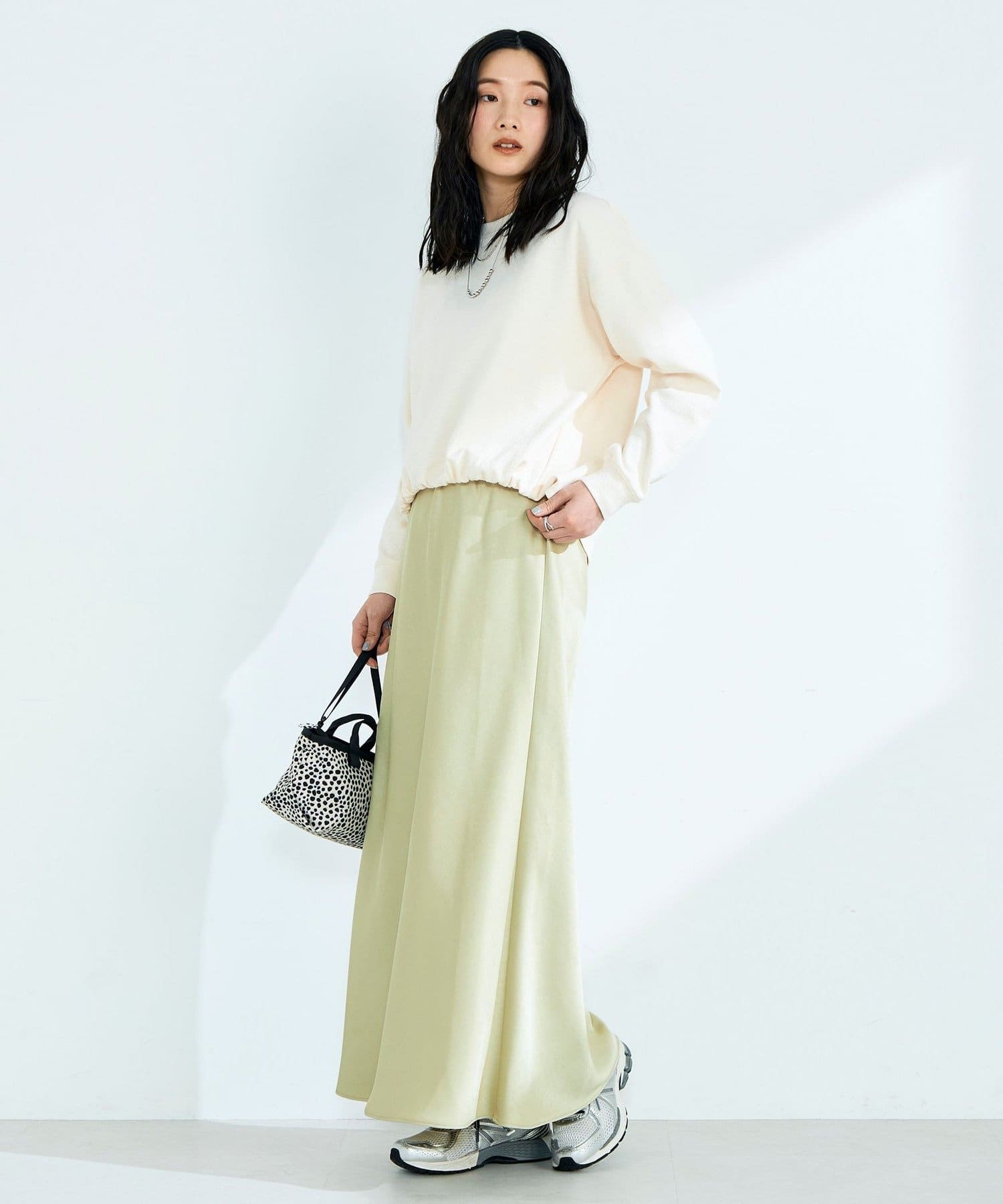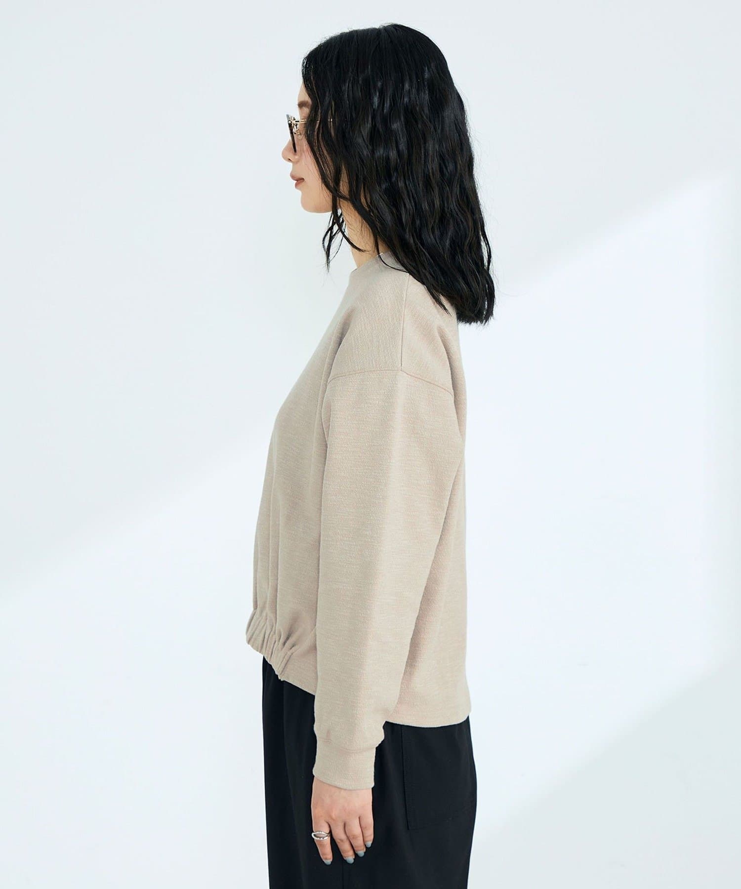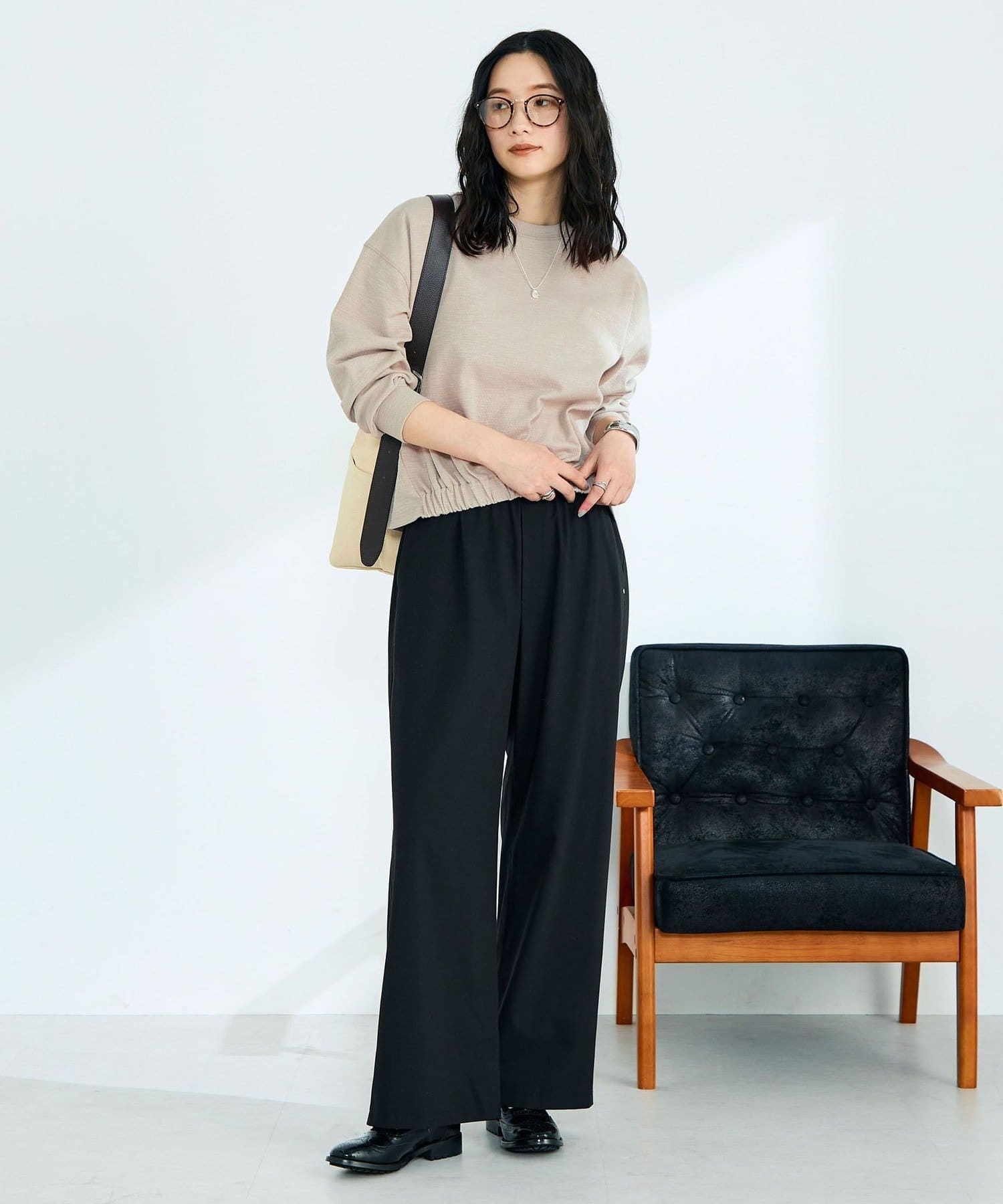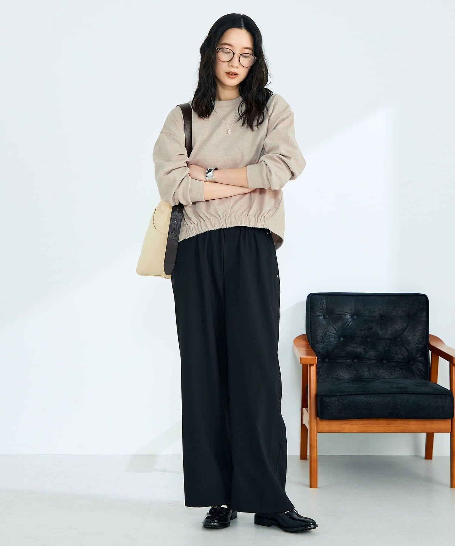 ・フロントのウエスト部分にギャザーのデザインを施し、インしなくてもバランスよく決まるシルエット
