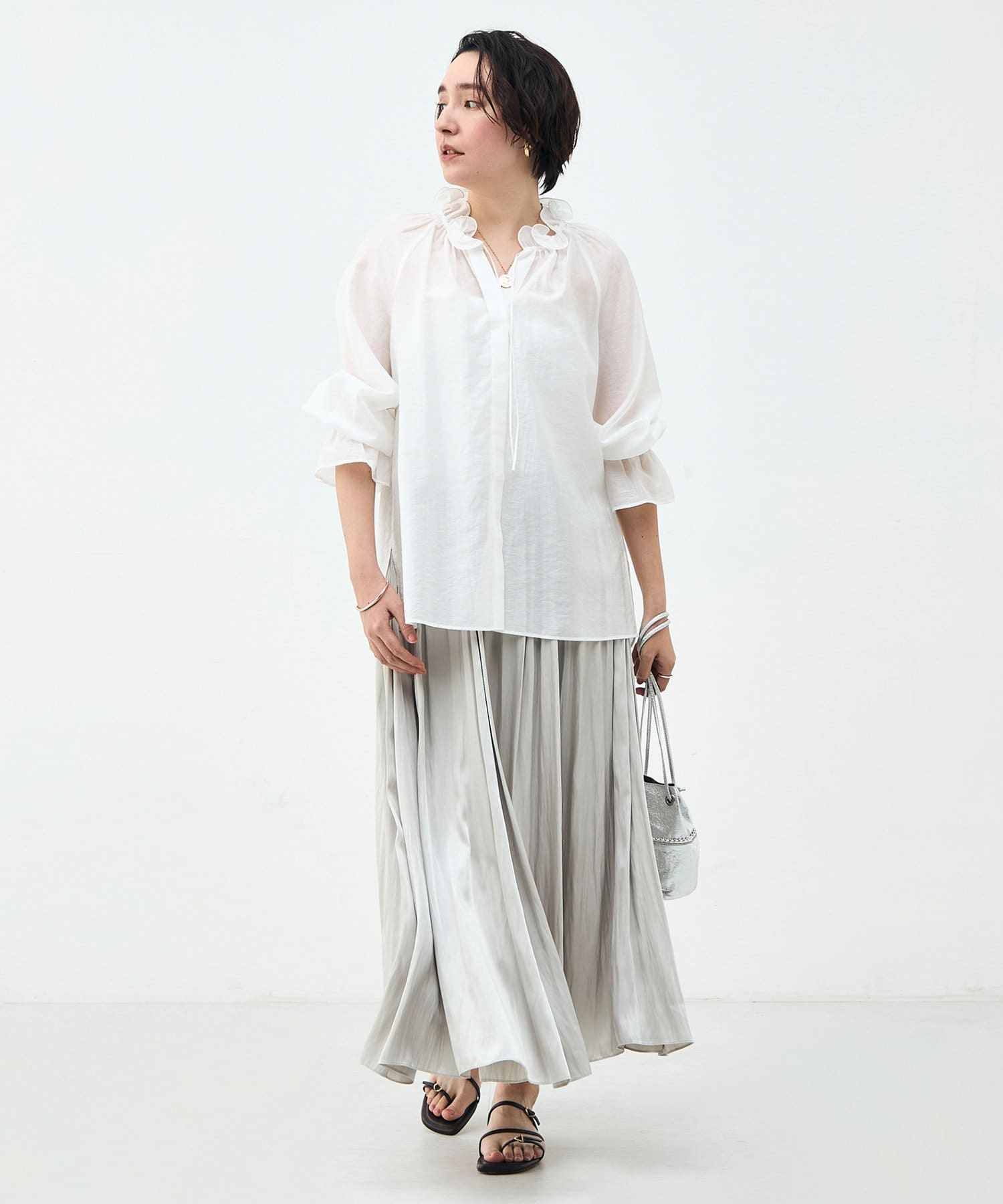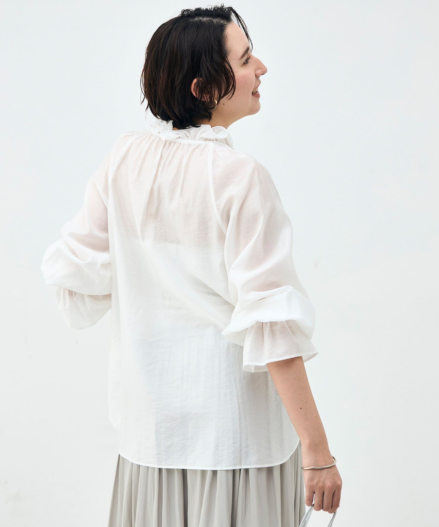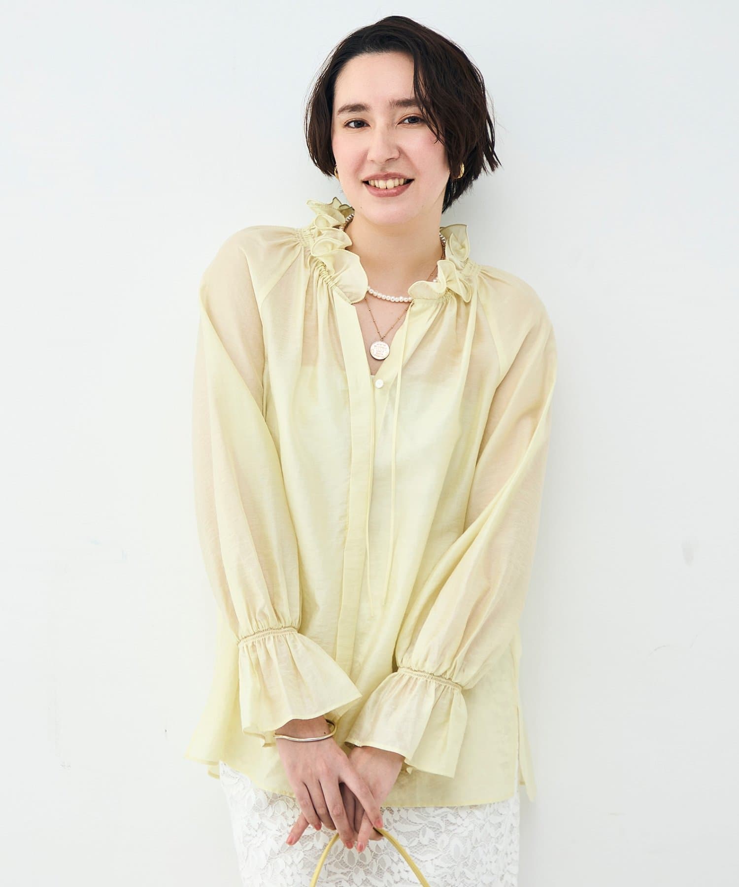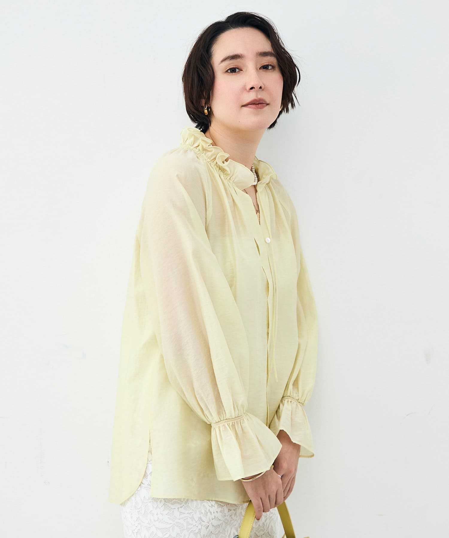 ウォッシャブルシアーオーガンジーフリルネックブラウス
