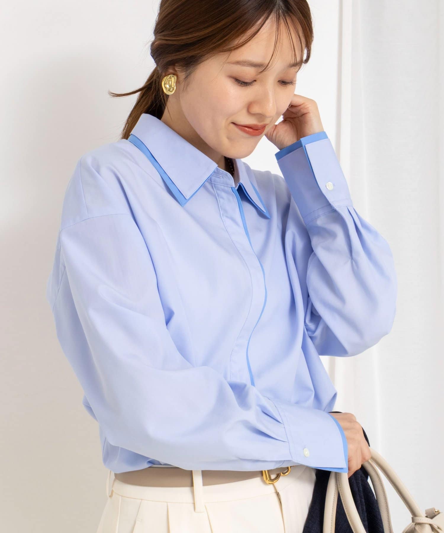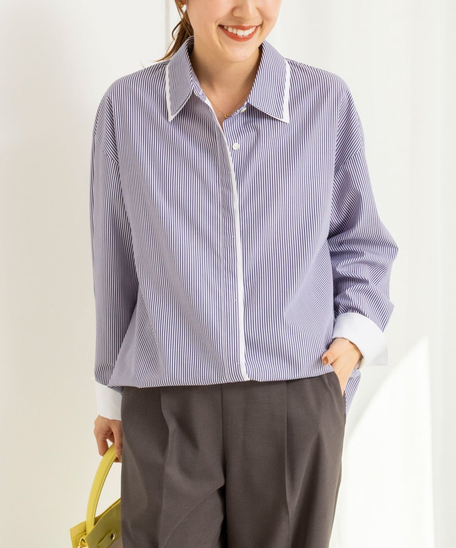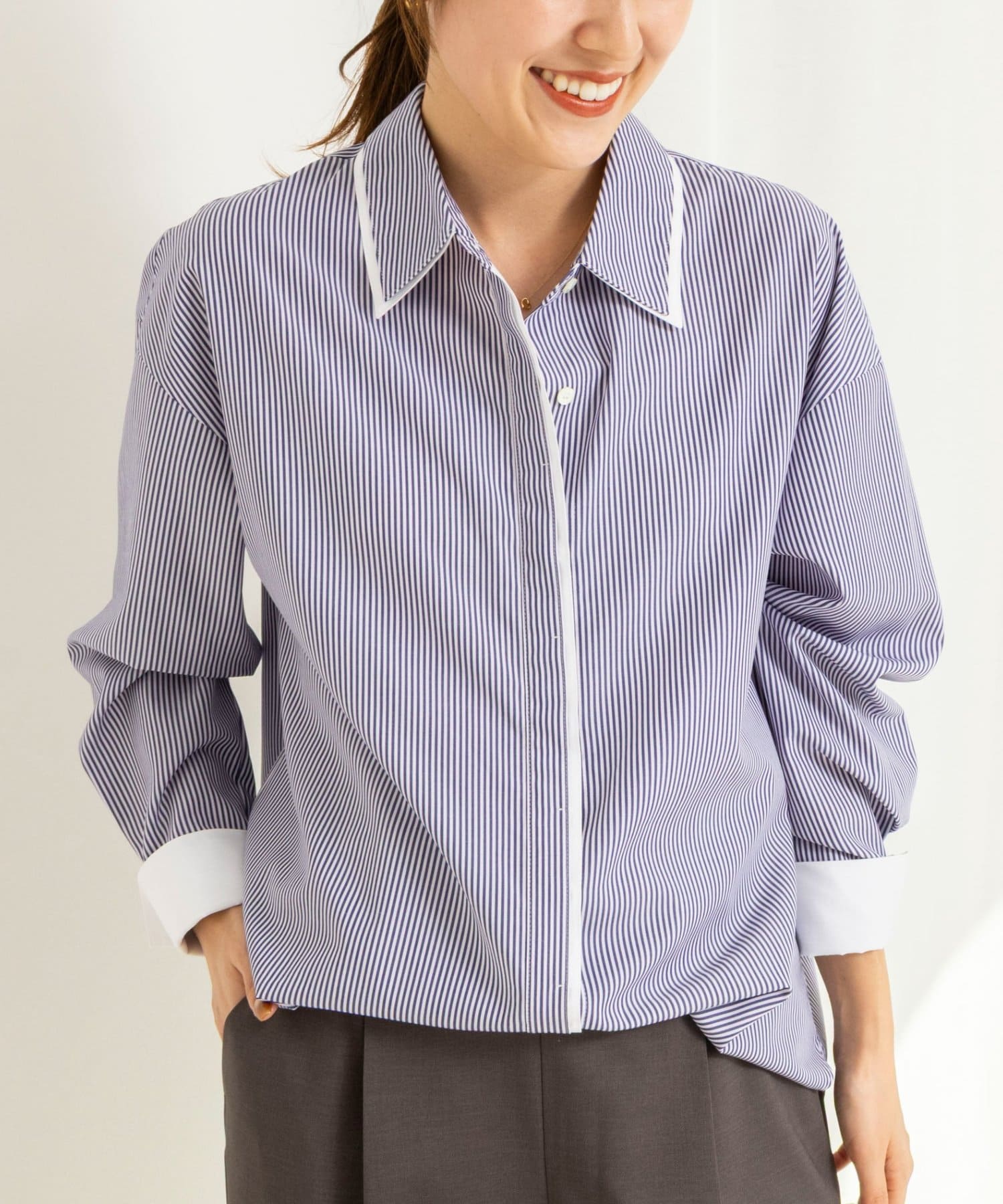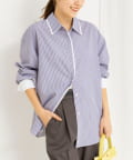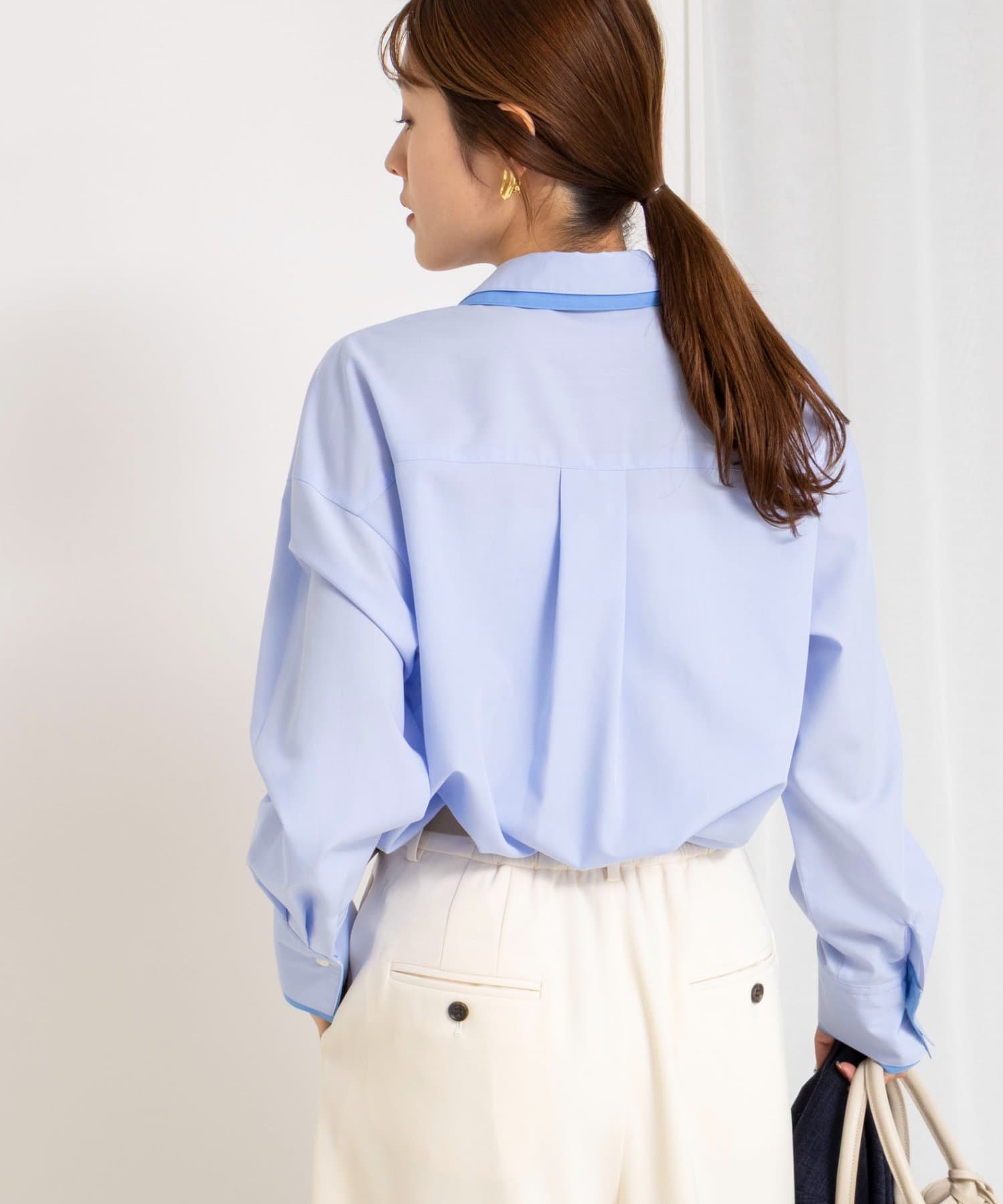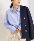 ・今季注目のレイヤード風ディテールを襟元、前立て、カフスに配したシャツ