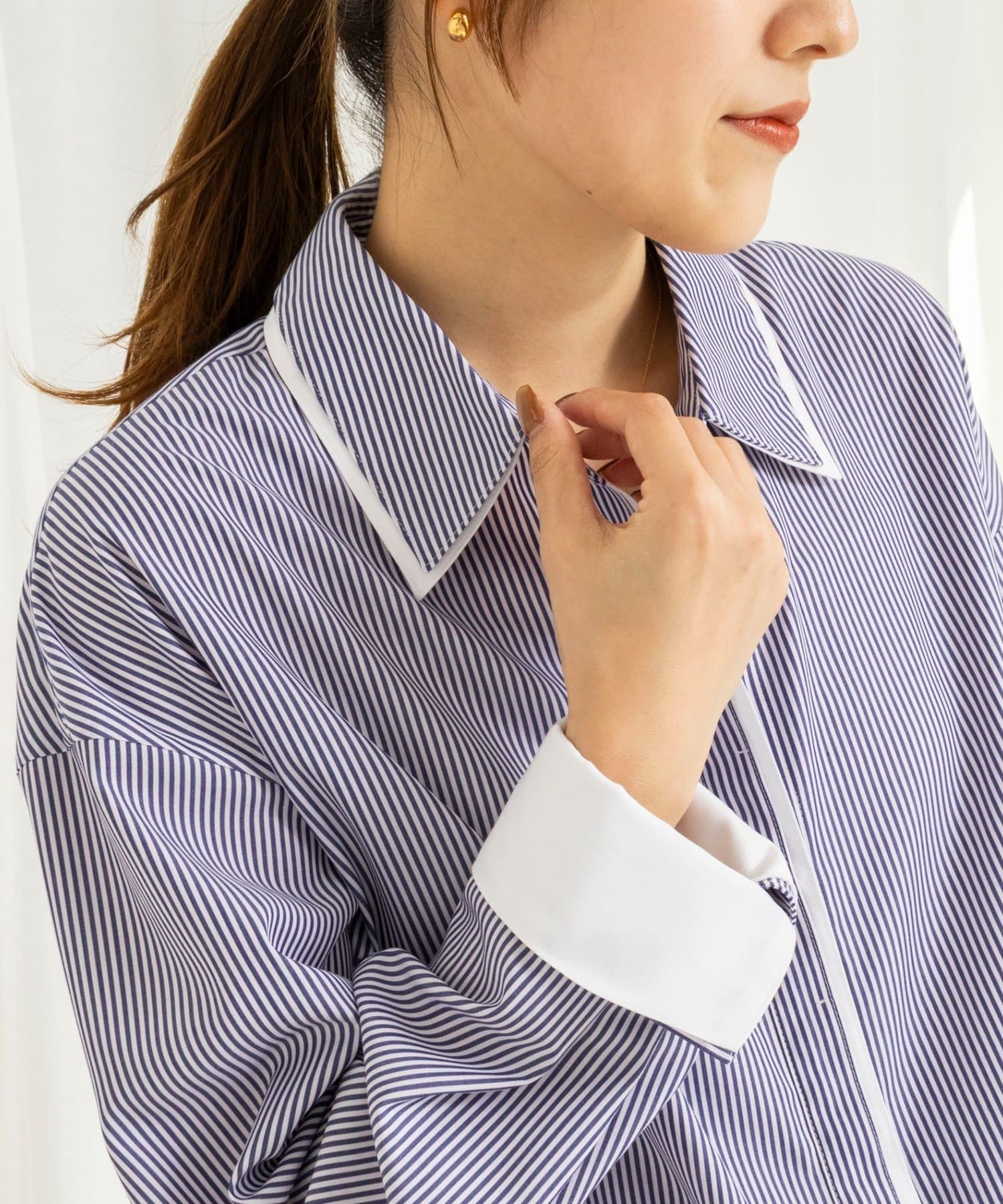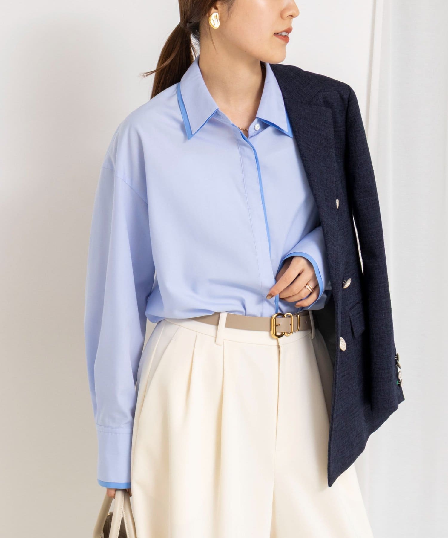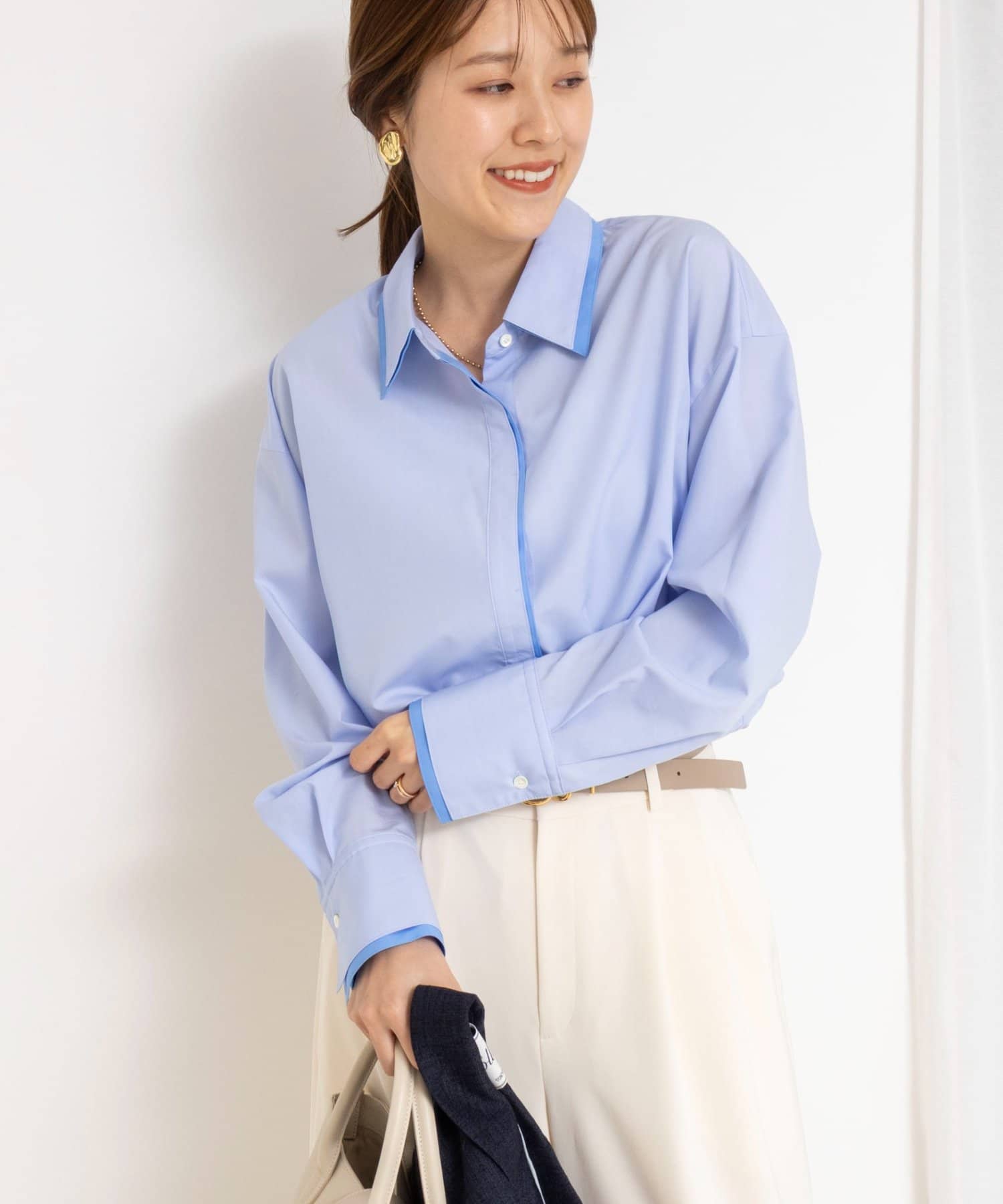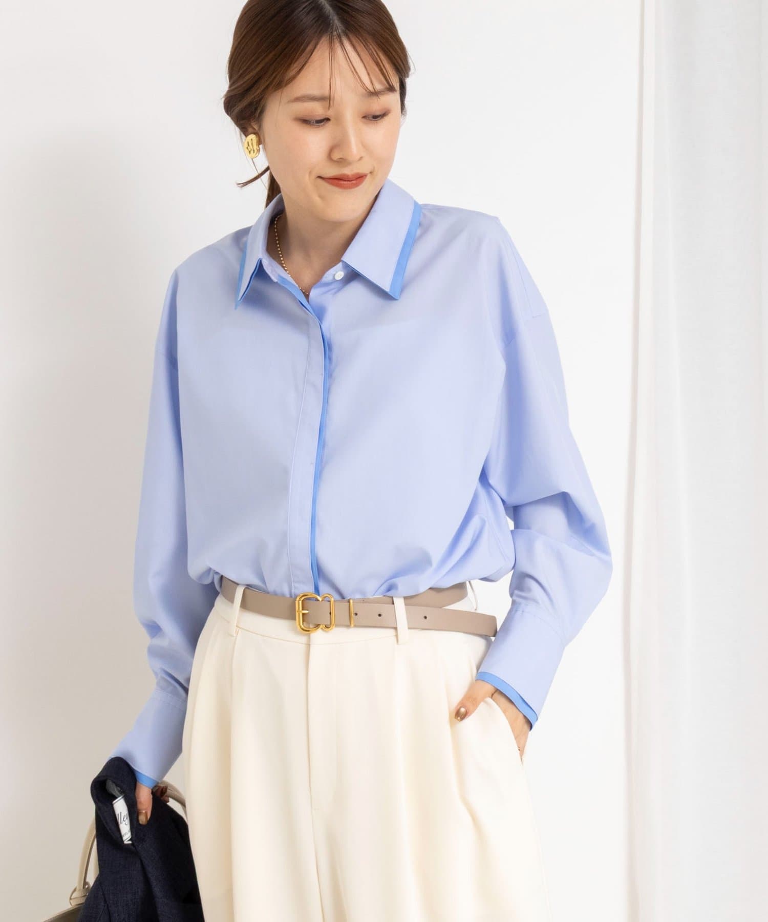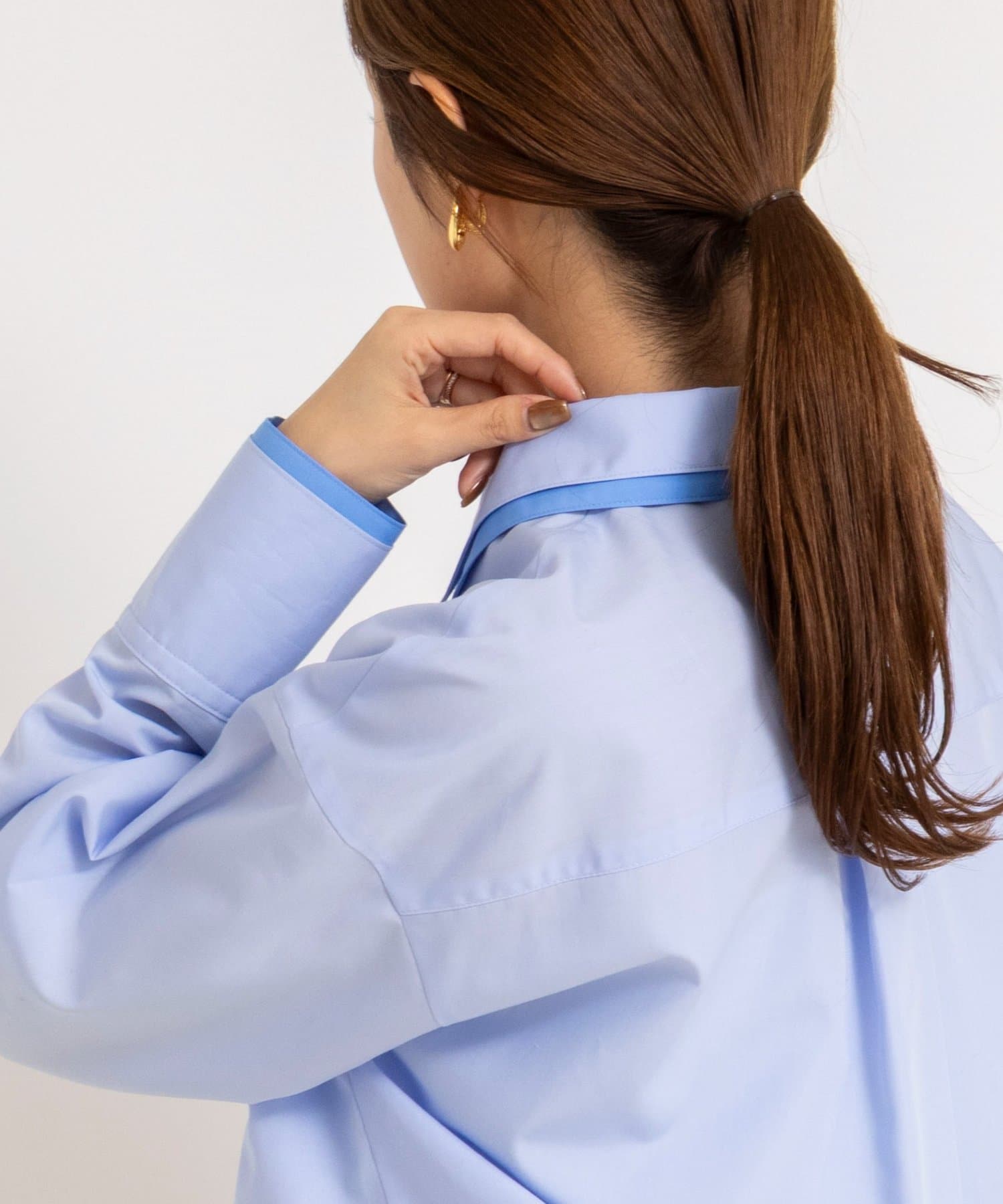 ・今季注目のレイヤード風ディテールを襟元、前立て、カフスに配したシャツ