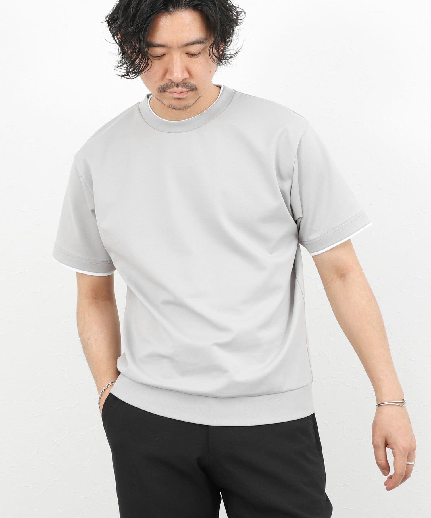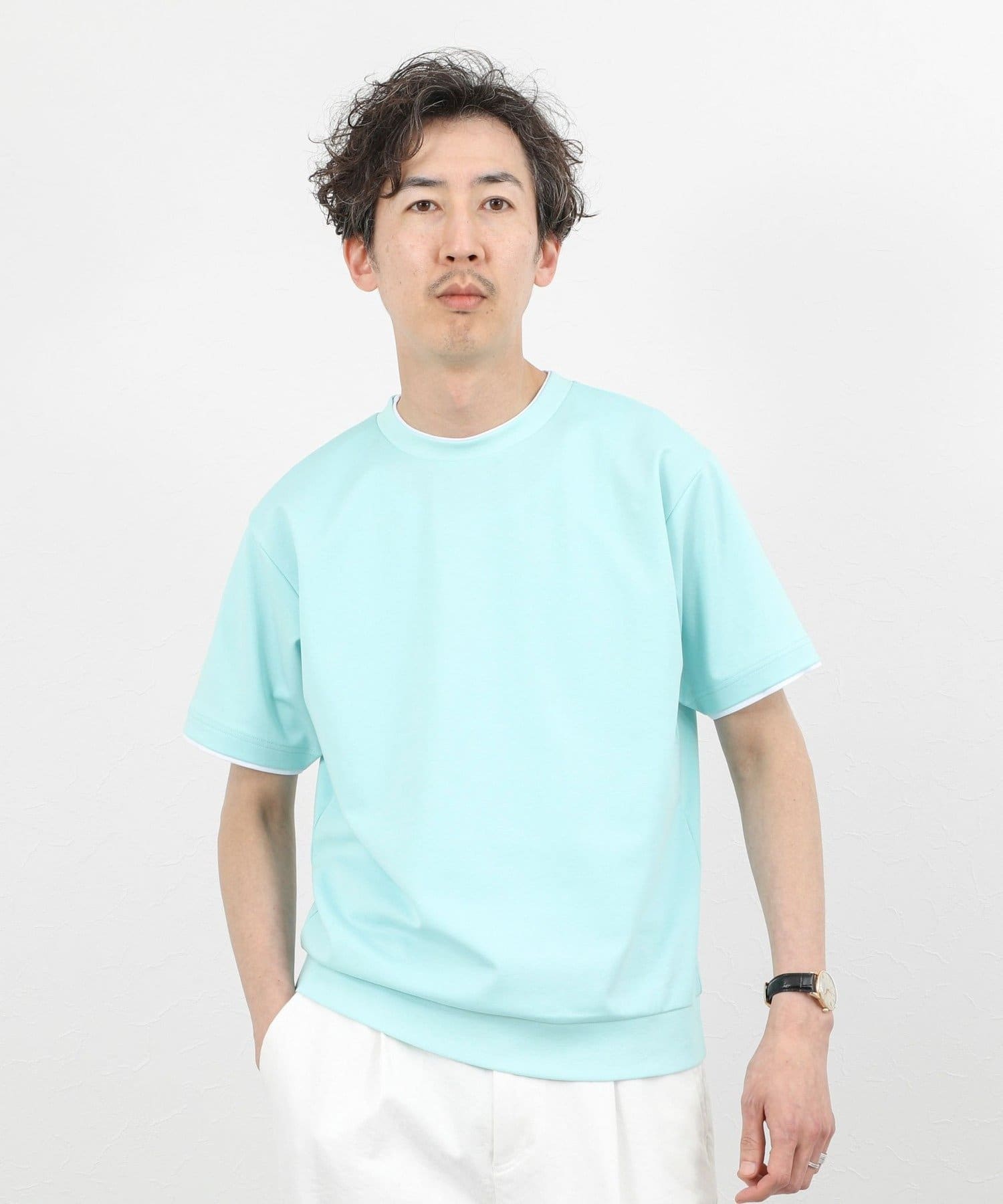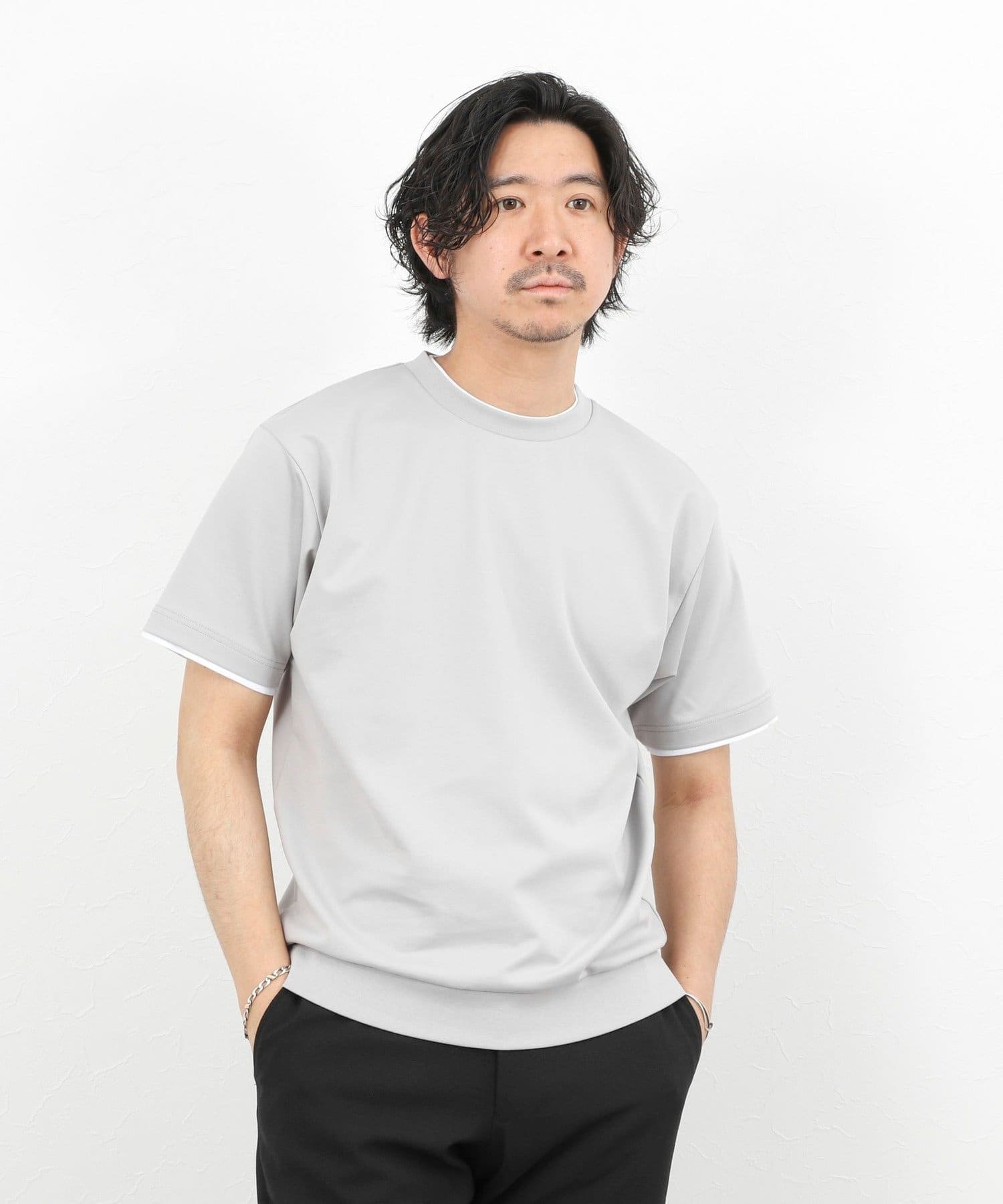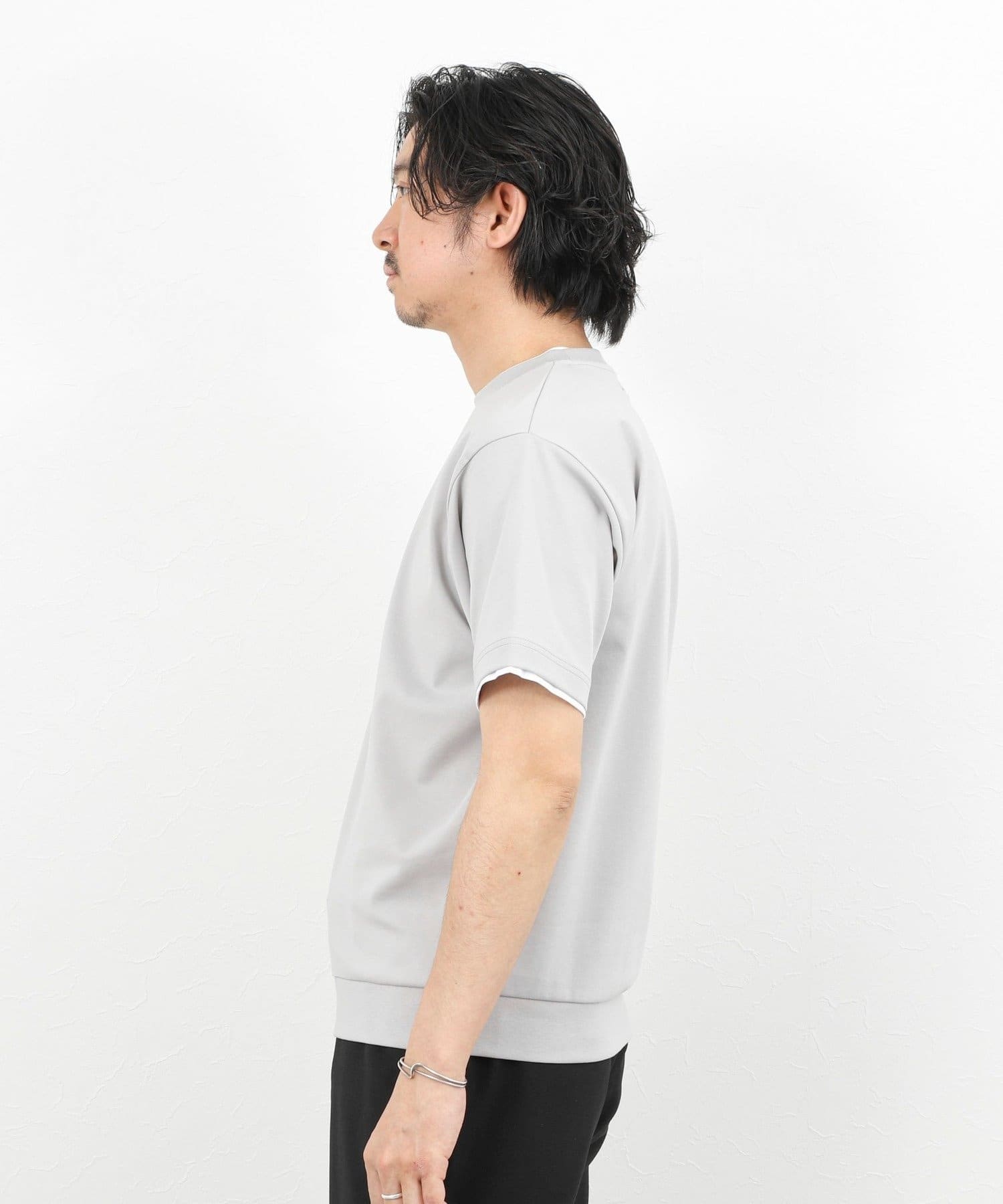 ・ネックと袖口をフェイクレイヤード仕様にした半袖Tシャツ