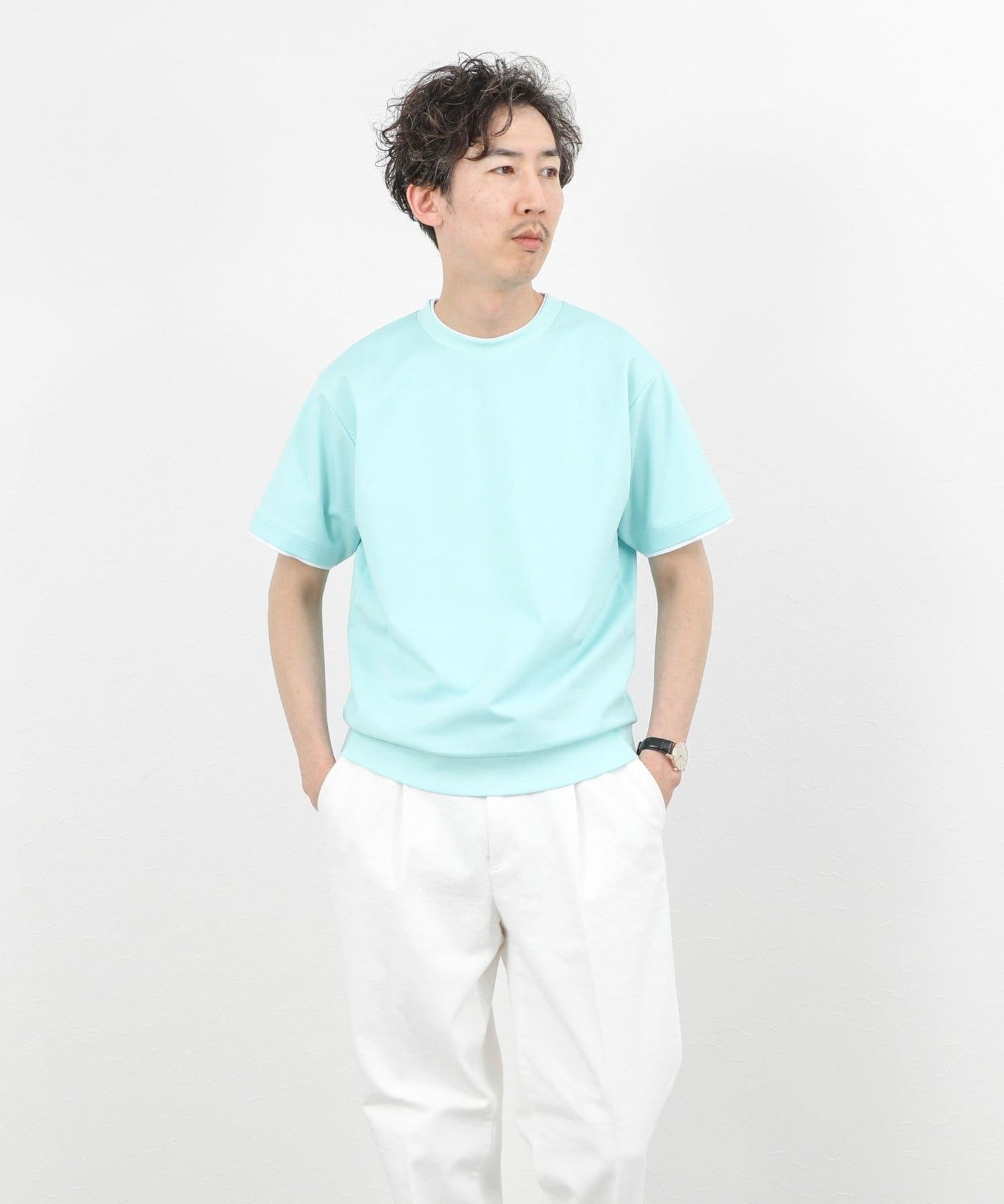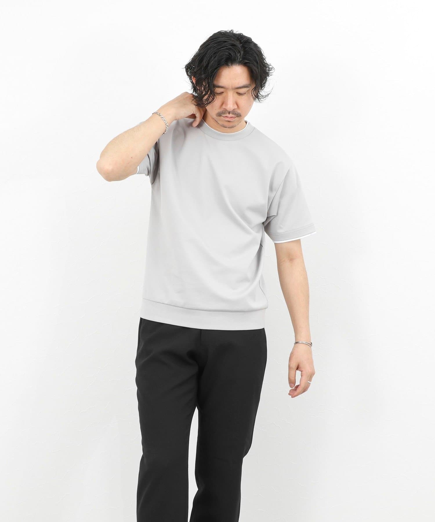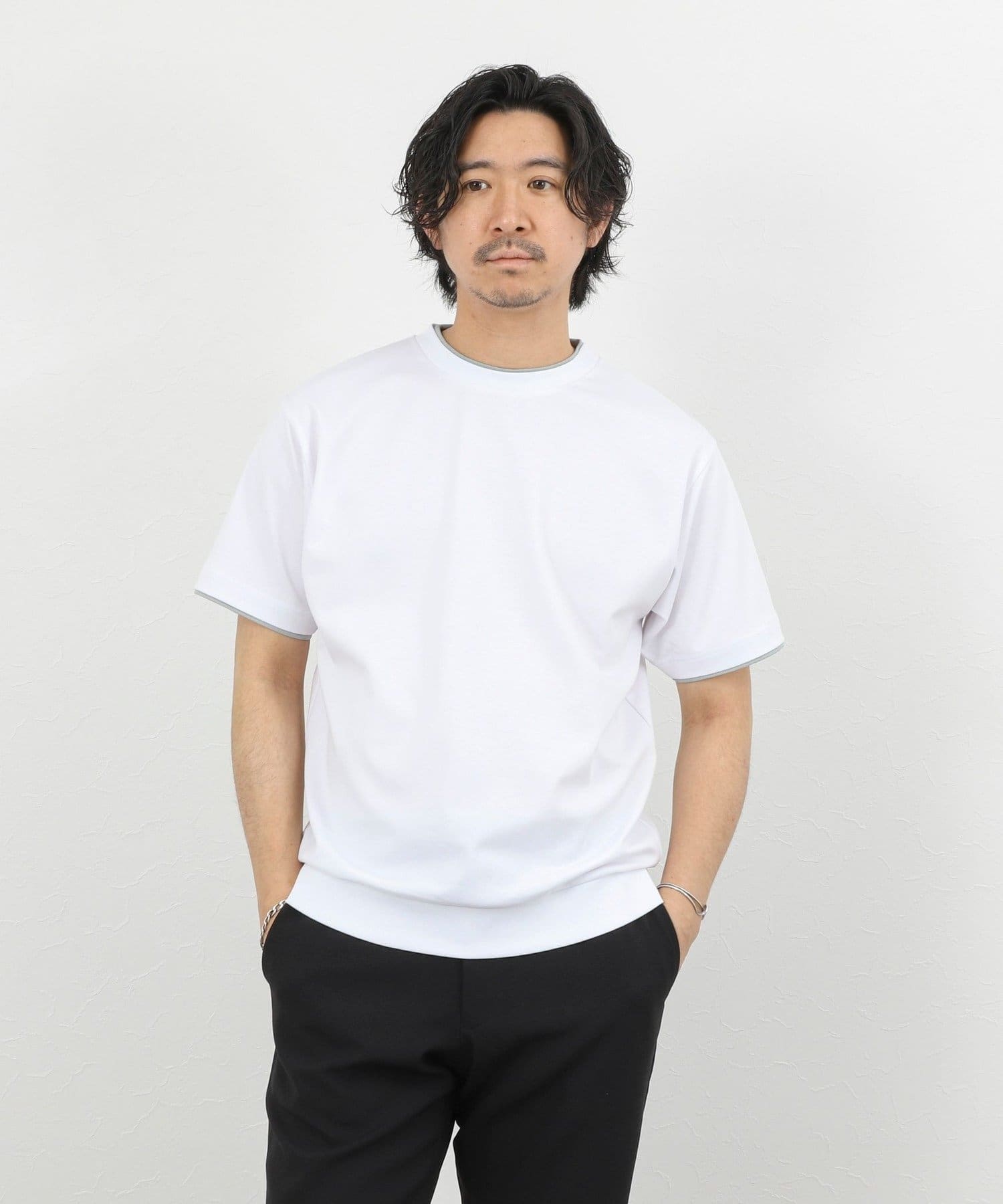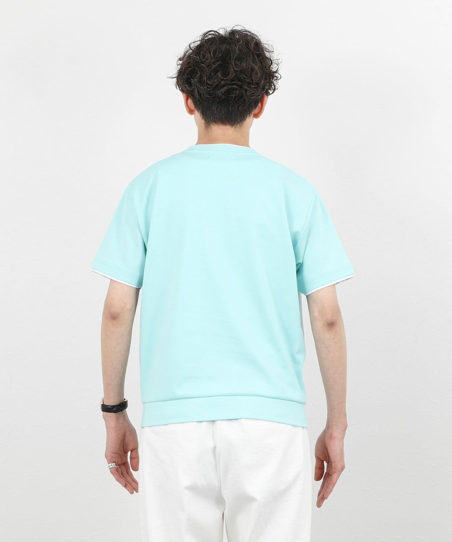 ・ネックと袖口をフェイクレイヤード仕様にした半袖Tシャツ