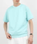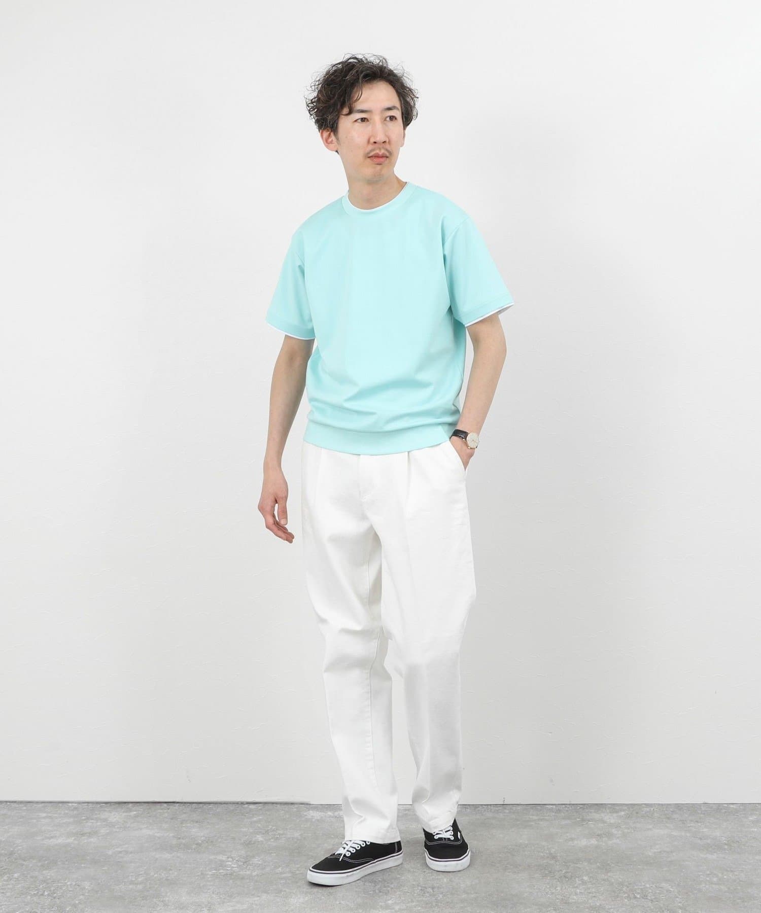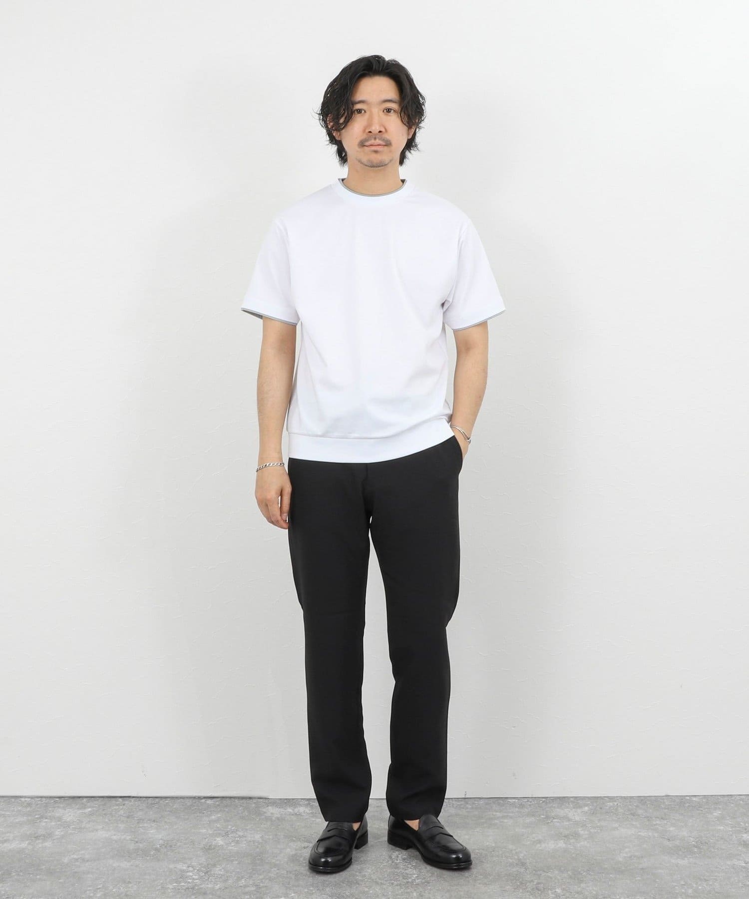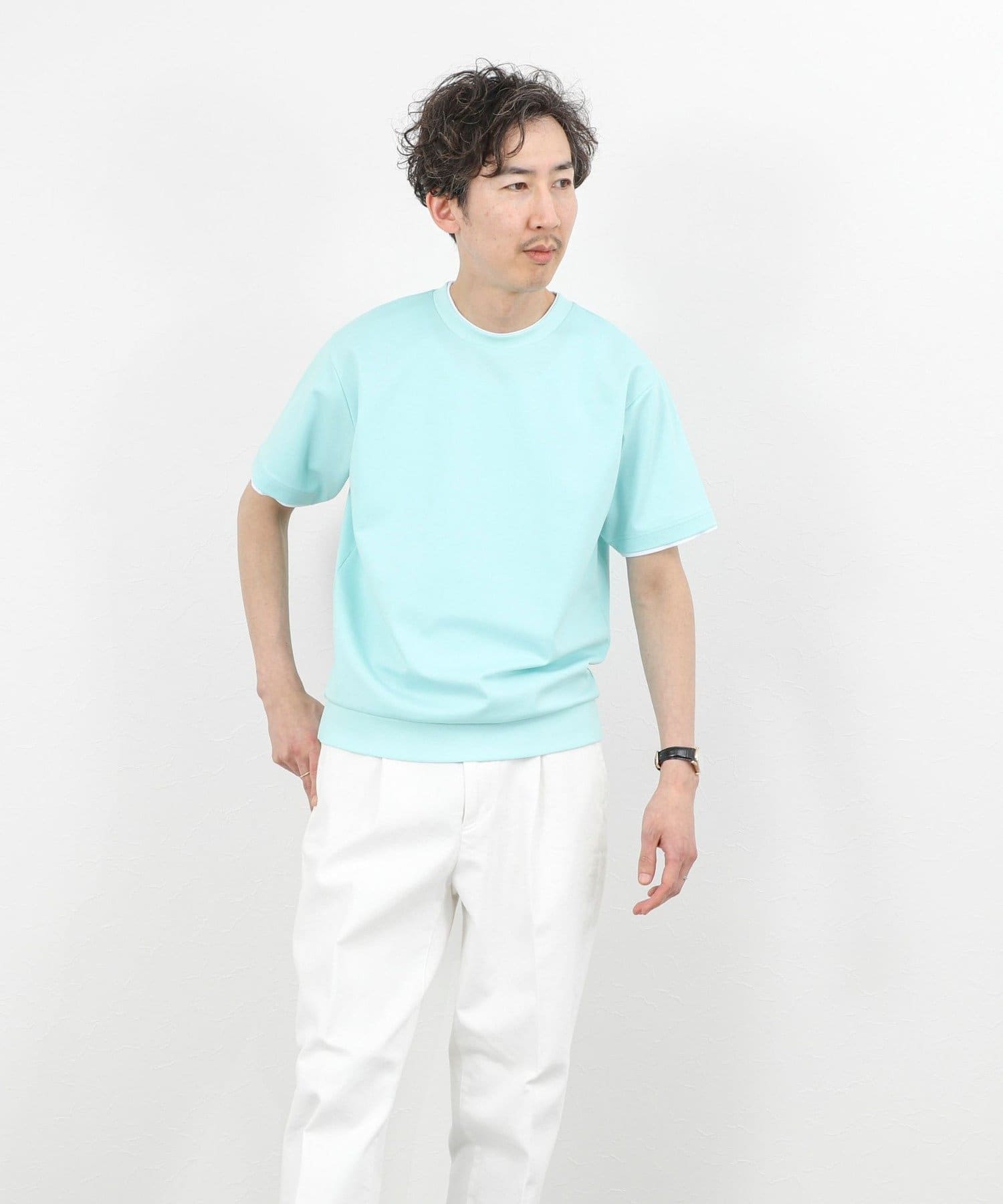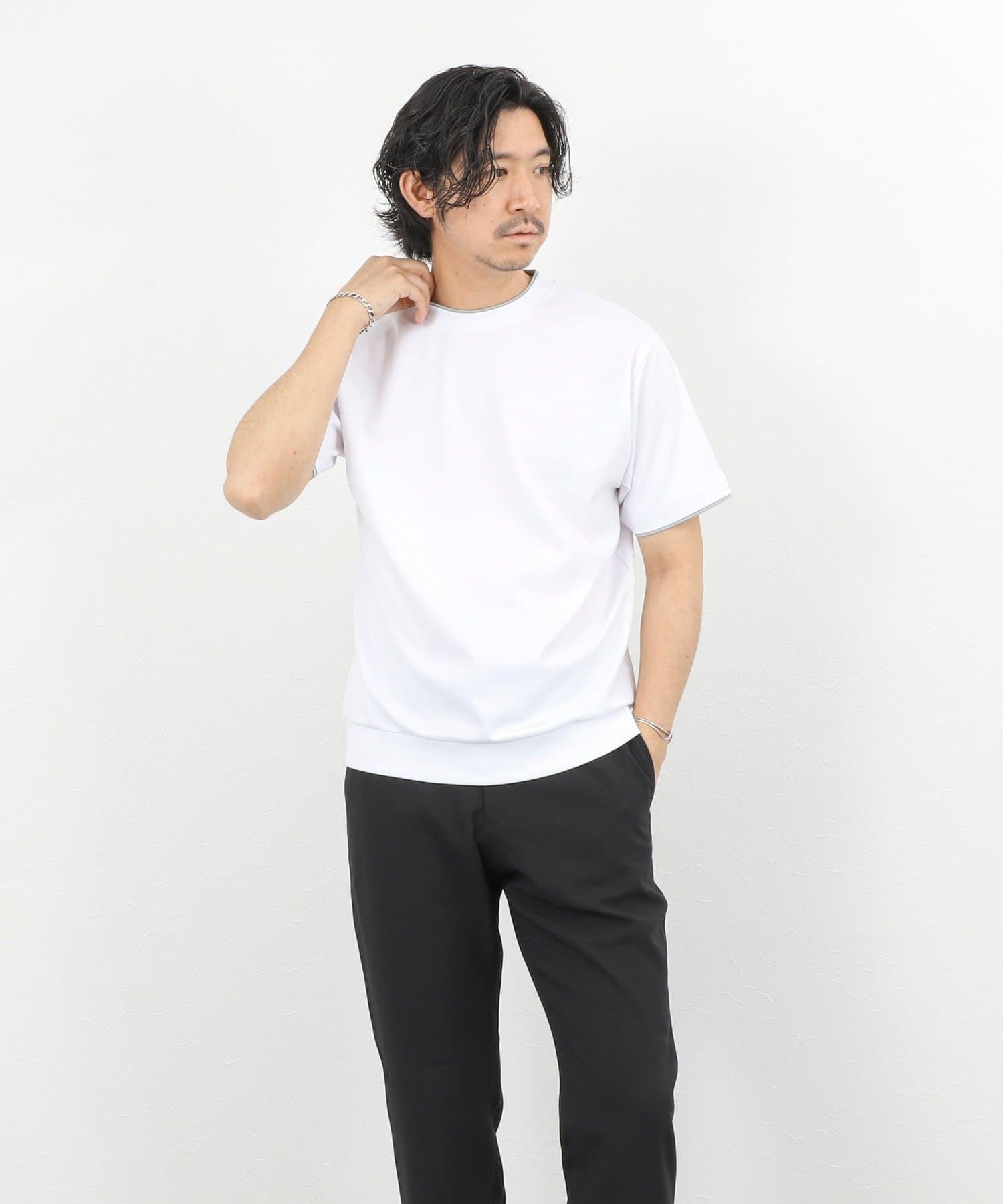 ・ネックと袖口をフェイクレイヤード仕様にした半袖Tシャツ