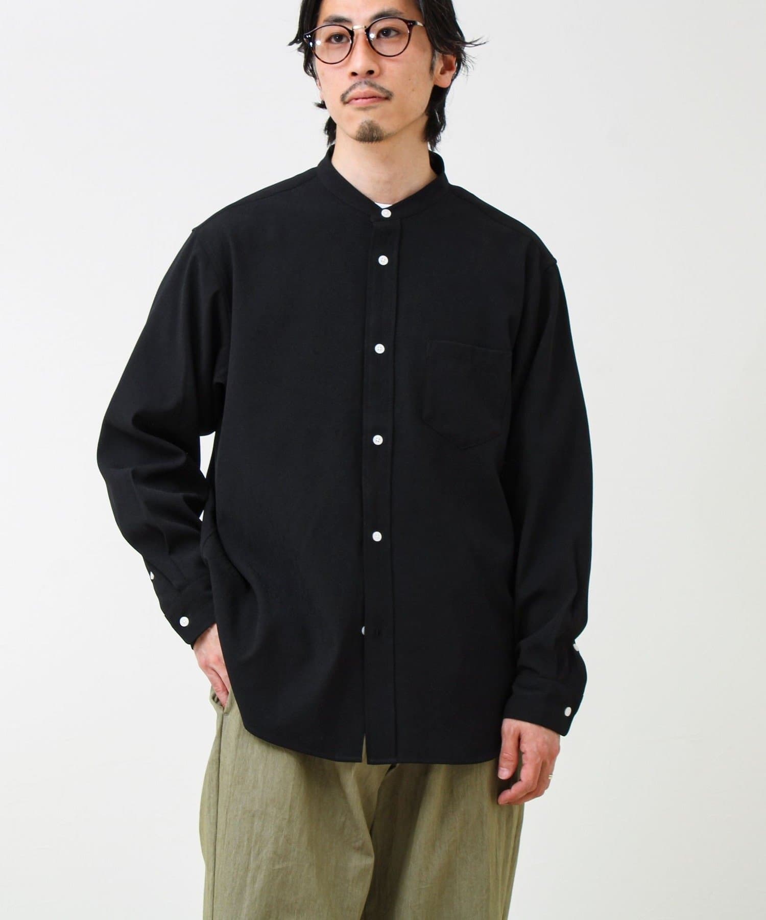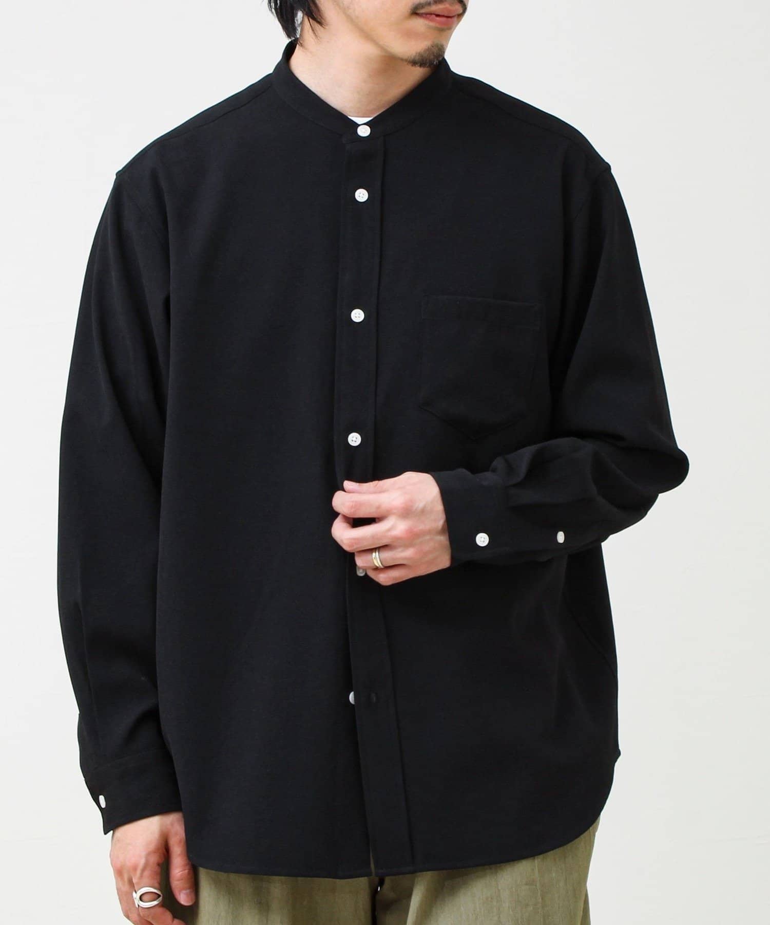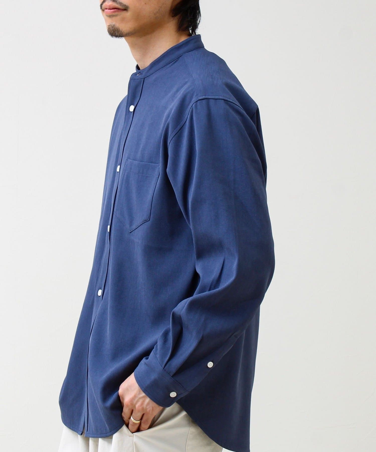 “シャツ見え×カットソーの快適さ”が叶う、軽やか素材のcrunchyバンドカラーシャツ
