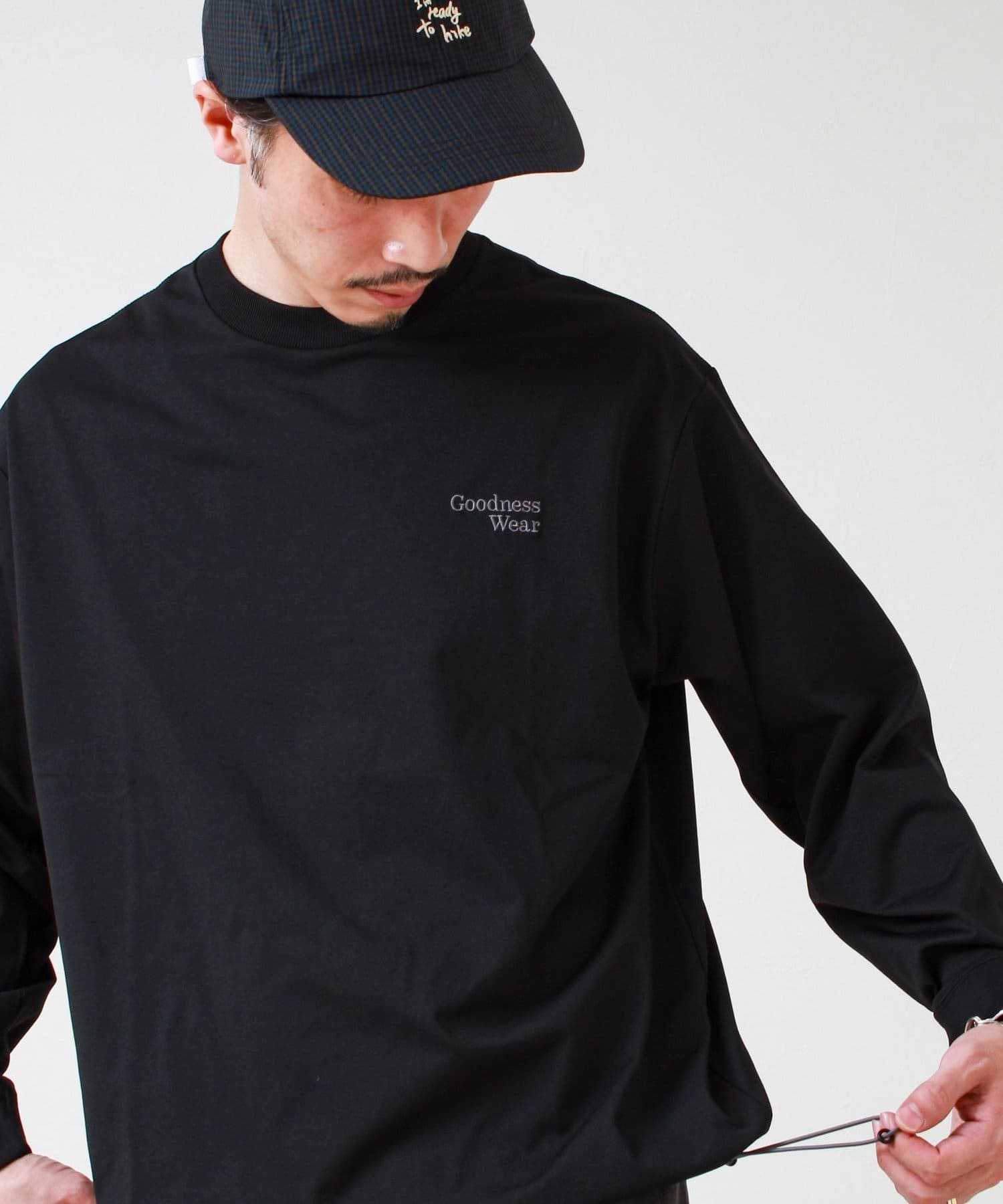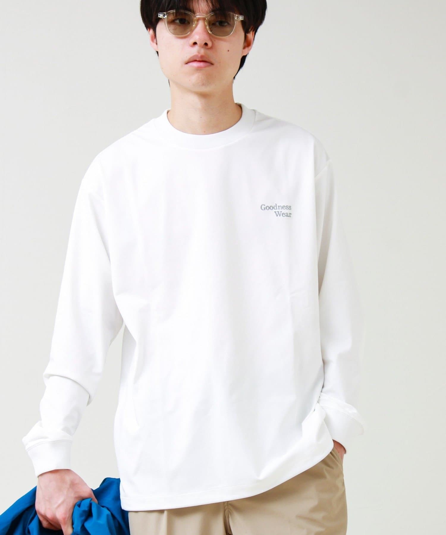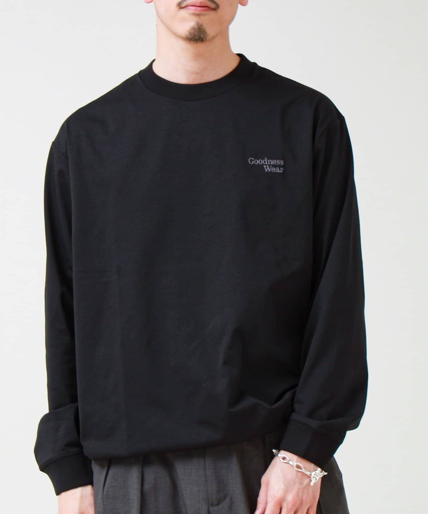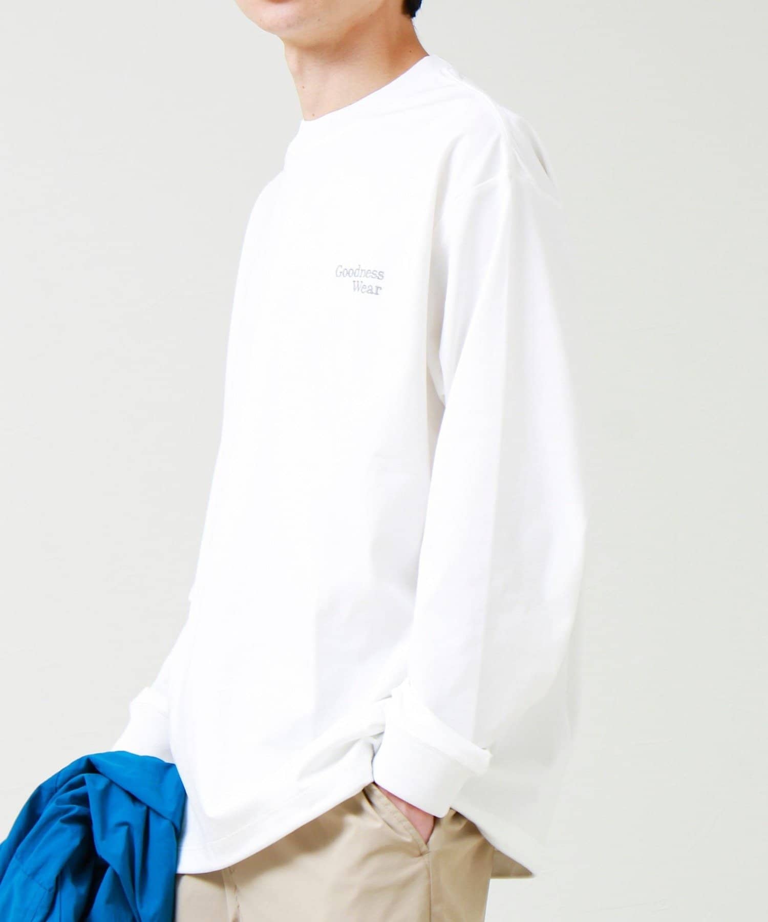 左胸には「Goodness Wear」のミニロゴ刺繍を配置し、シンプルながらアクセントの効いたデザインに。