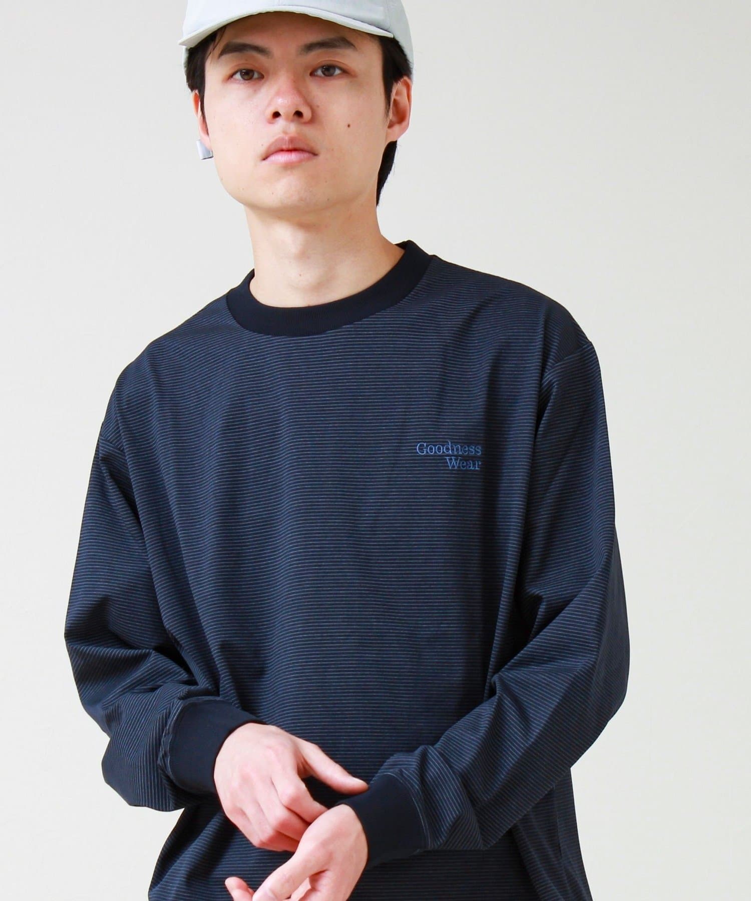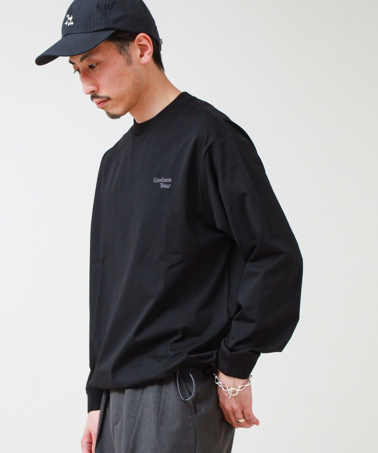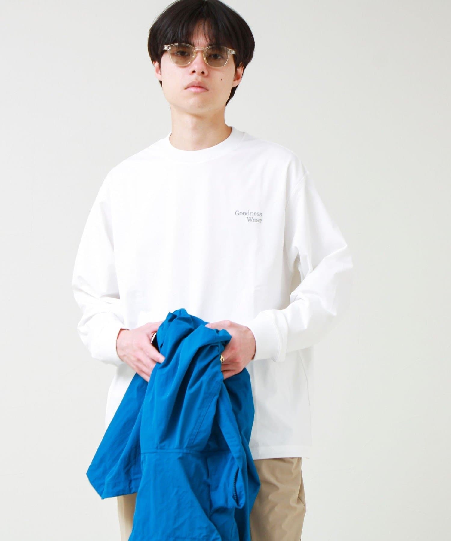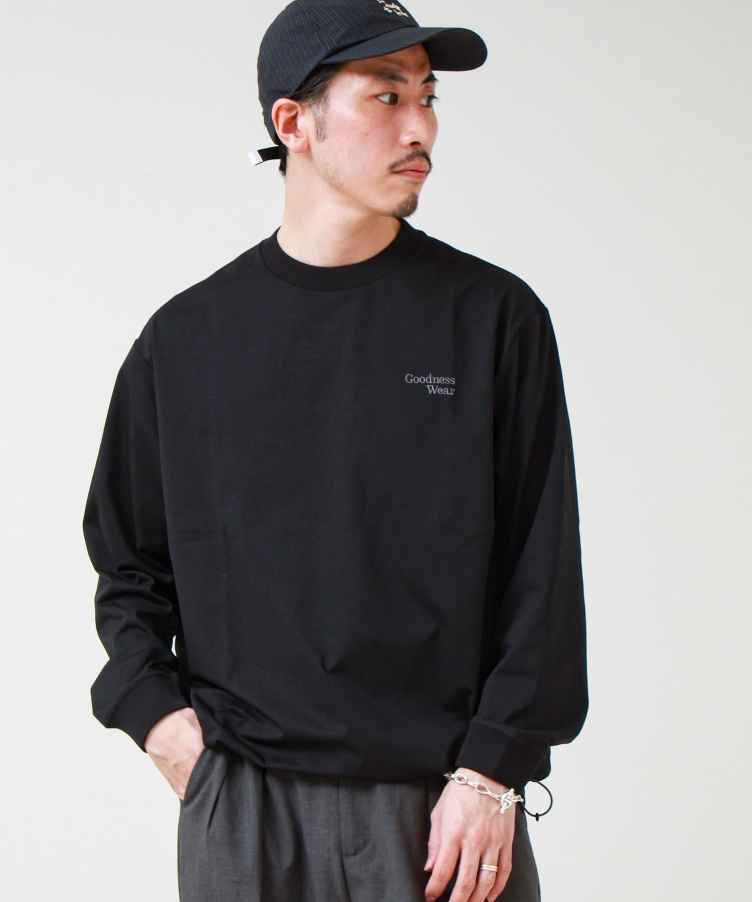 左胸には「Goodness Wear」のミニロゴ刺繍を配置し、シンプルながらアクセントの効いたデザインに。