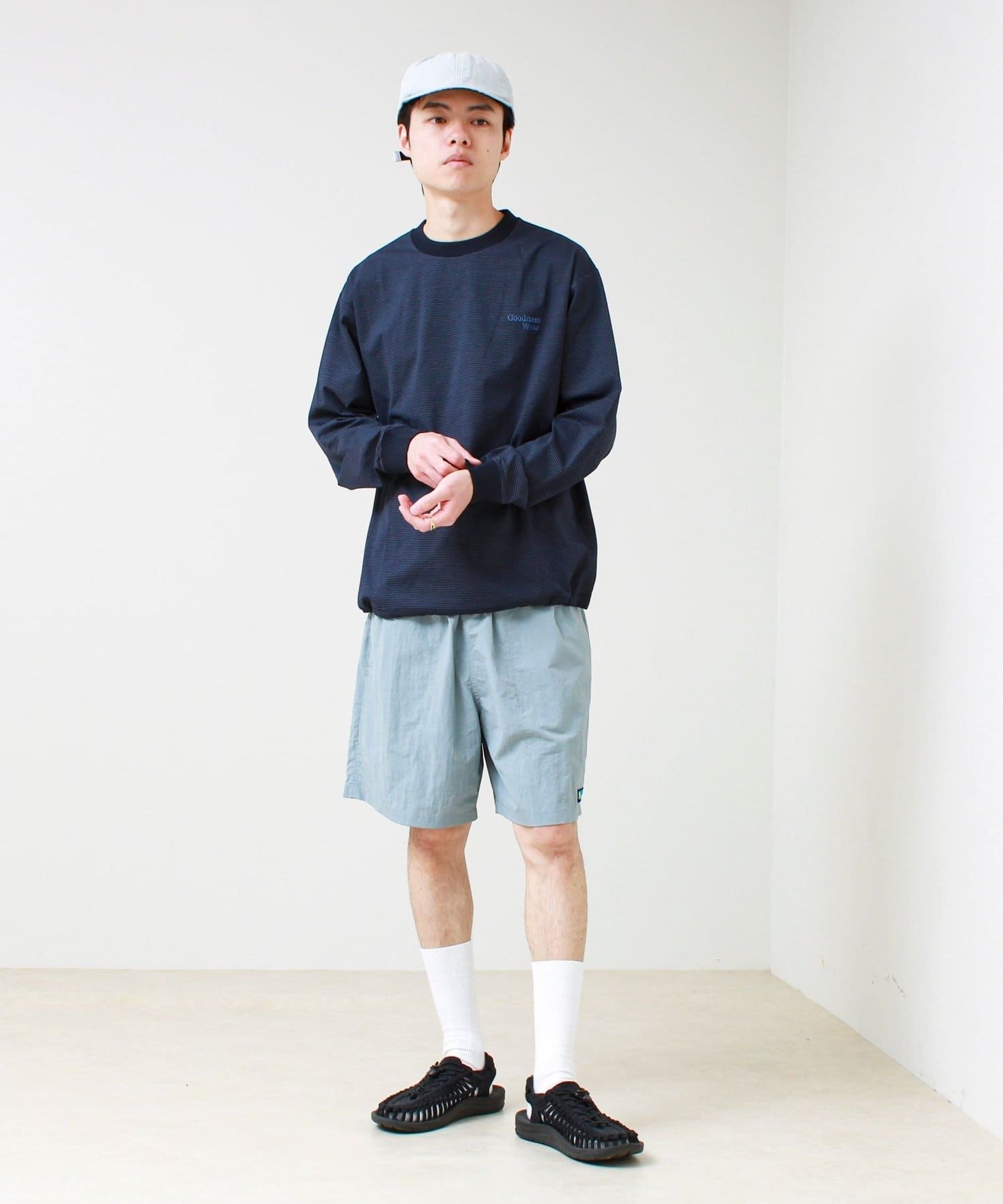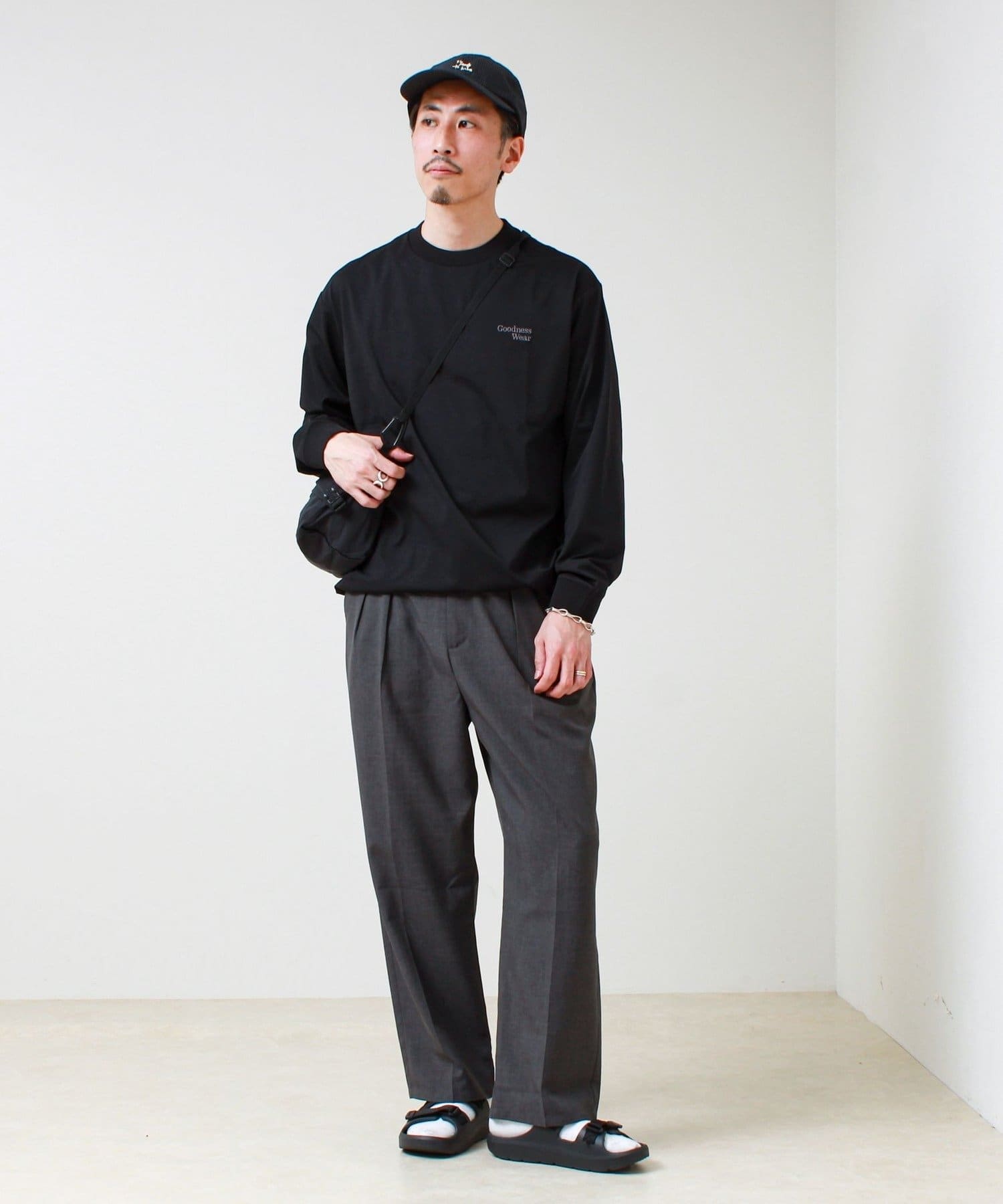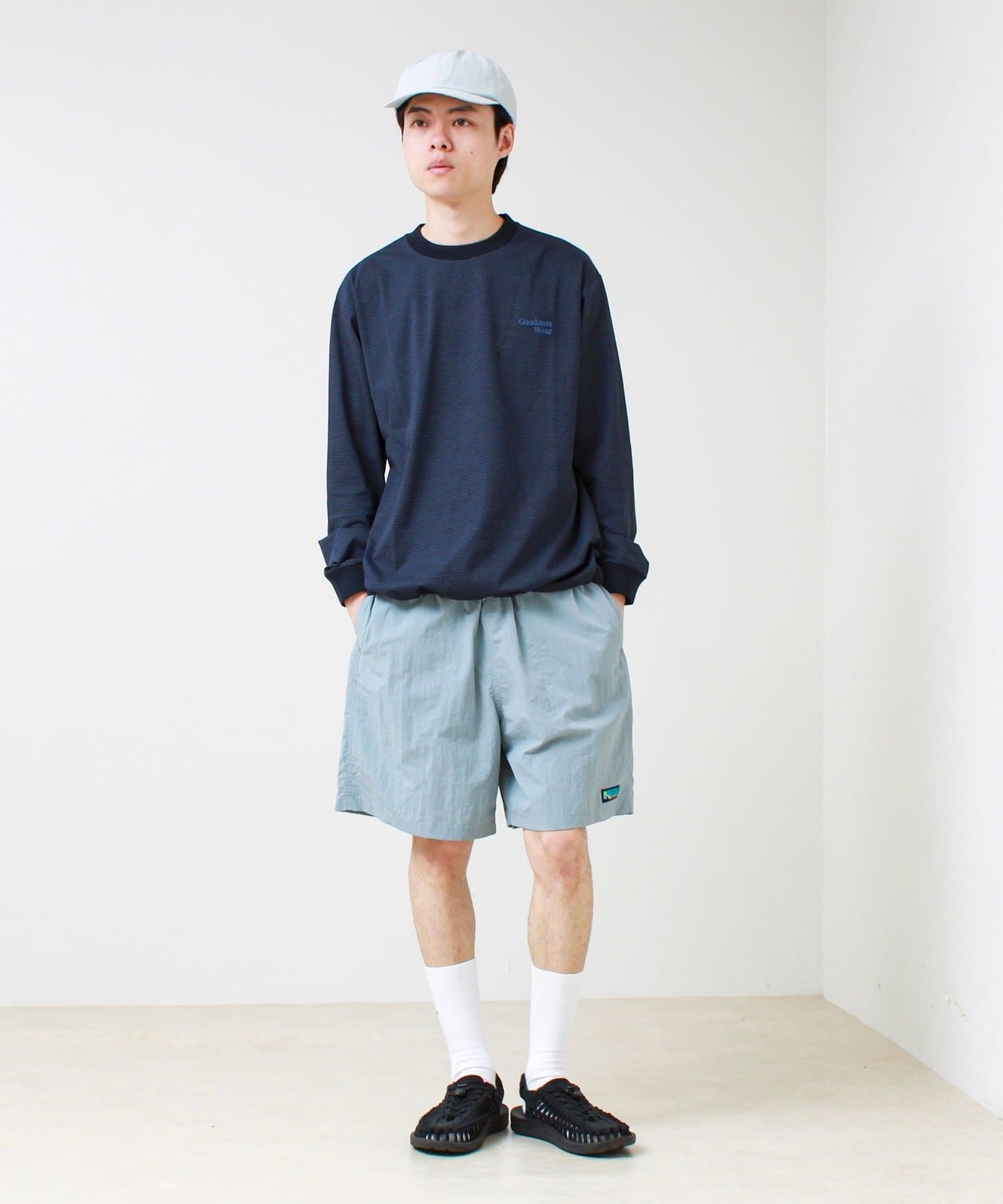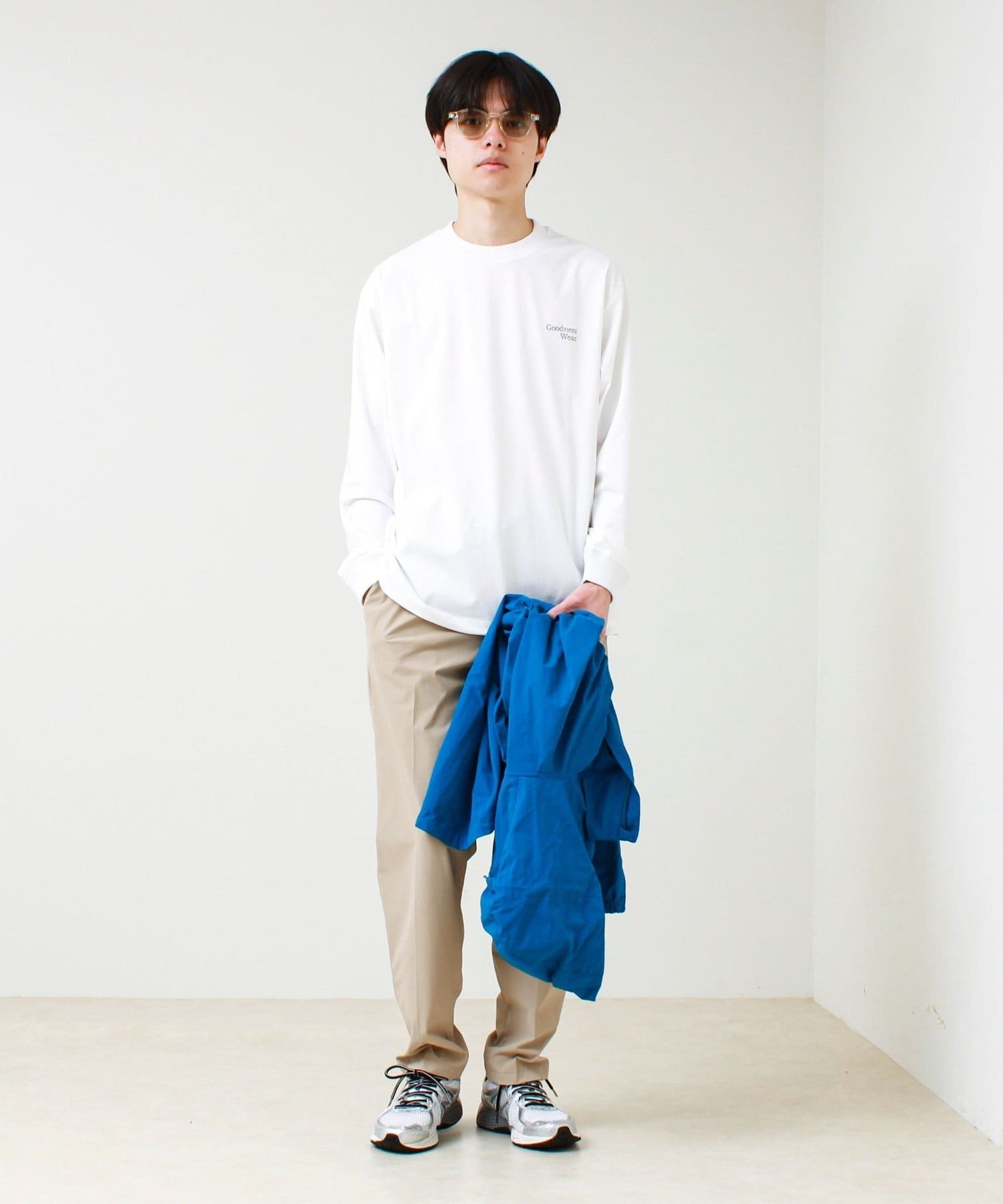 左胸には「Goodness Wear」のミニロゴ刺繍を配置し、シンプルながらアクセントの効いたデザインに。