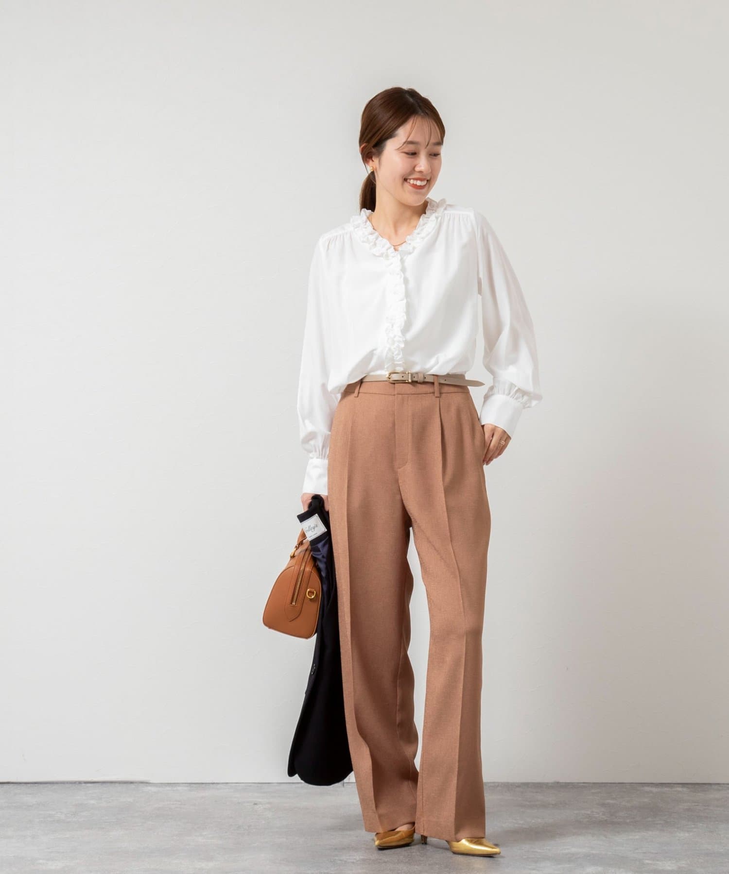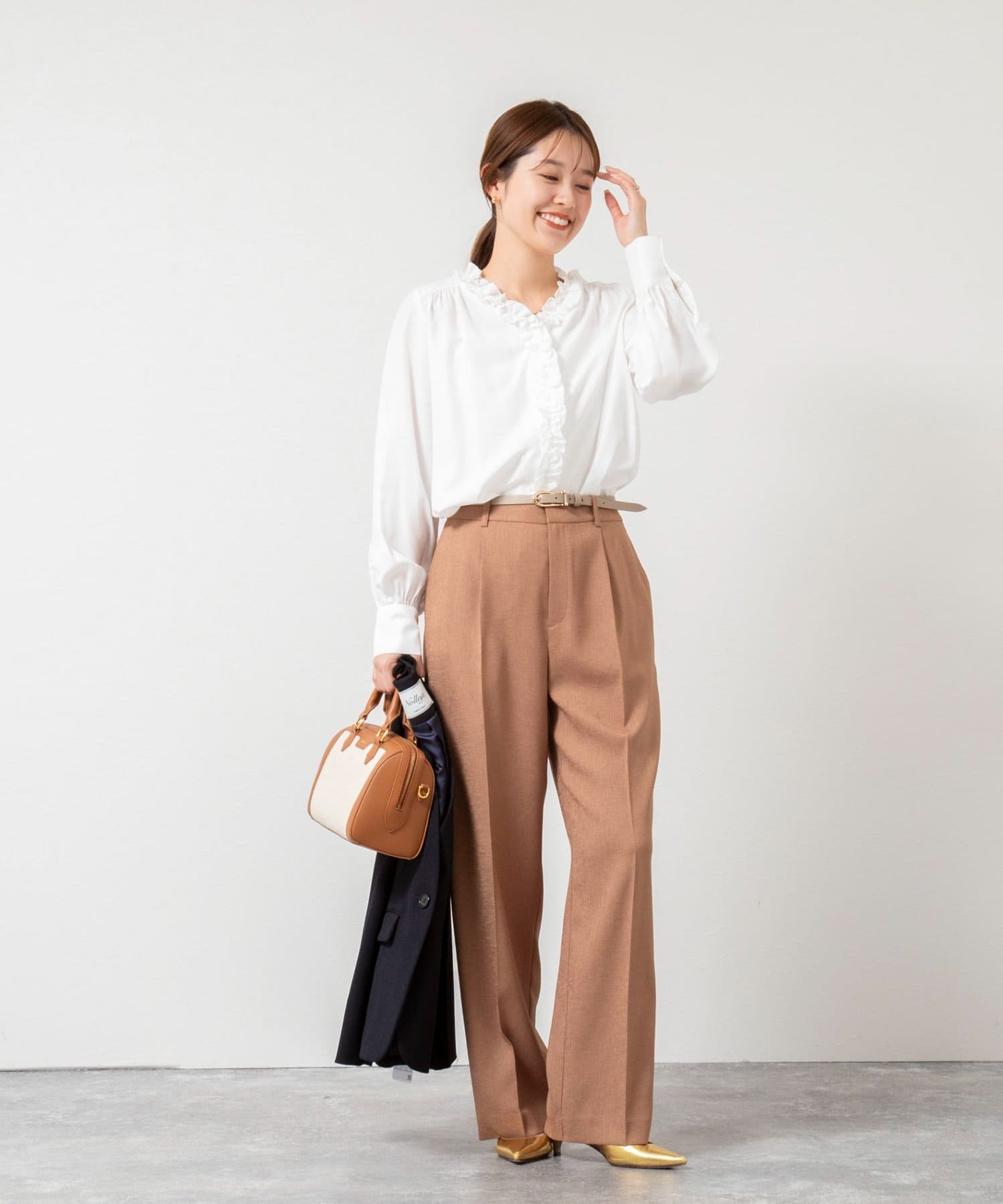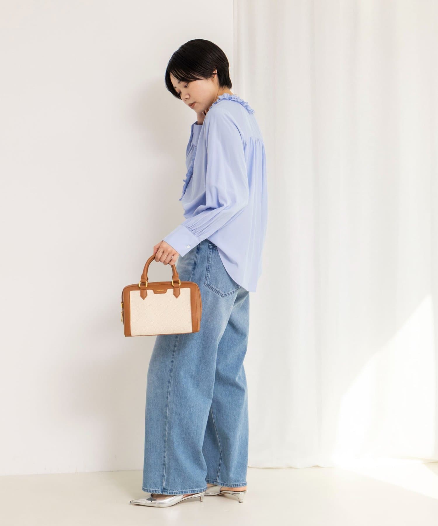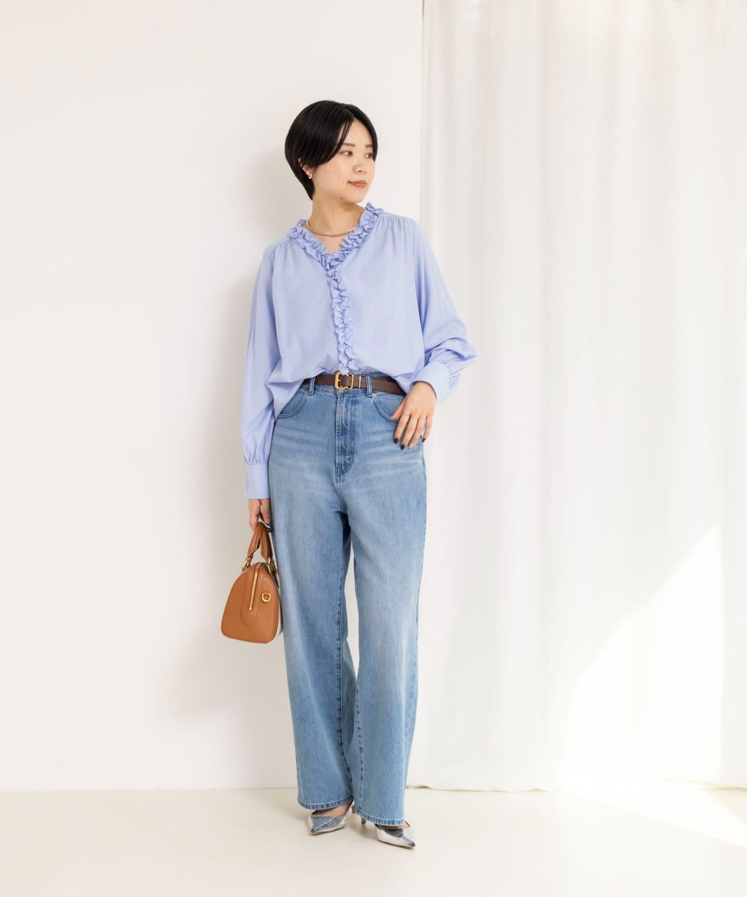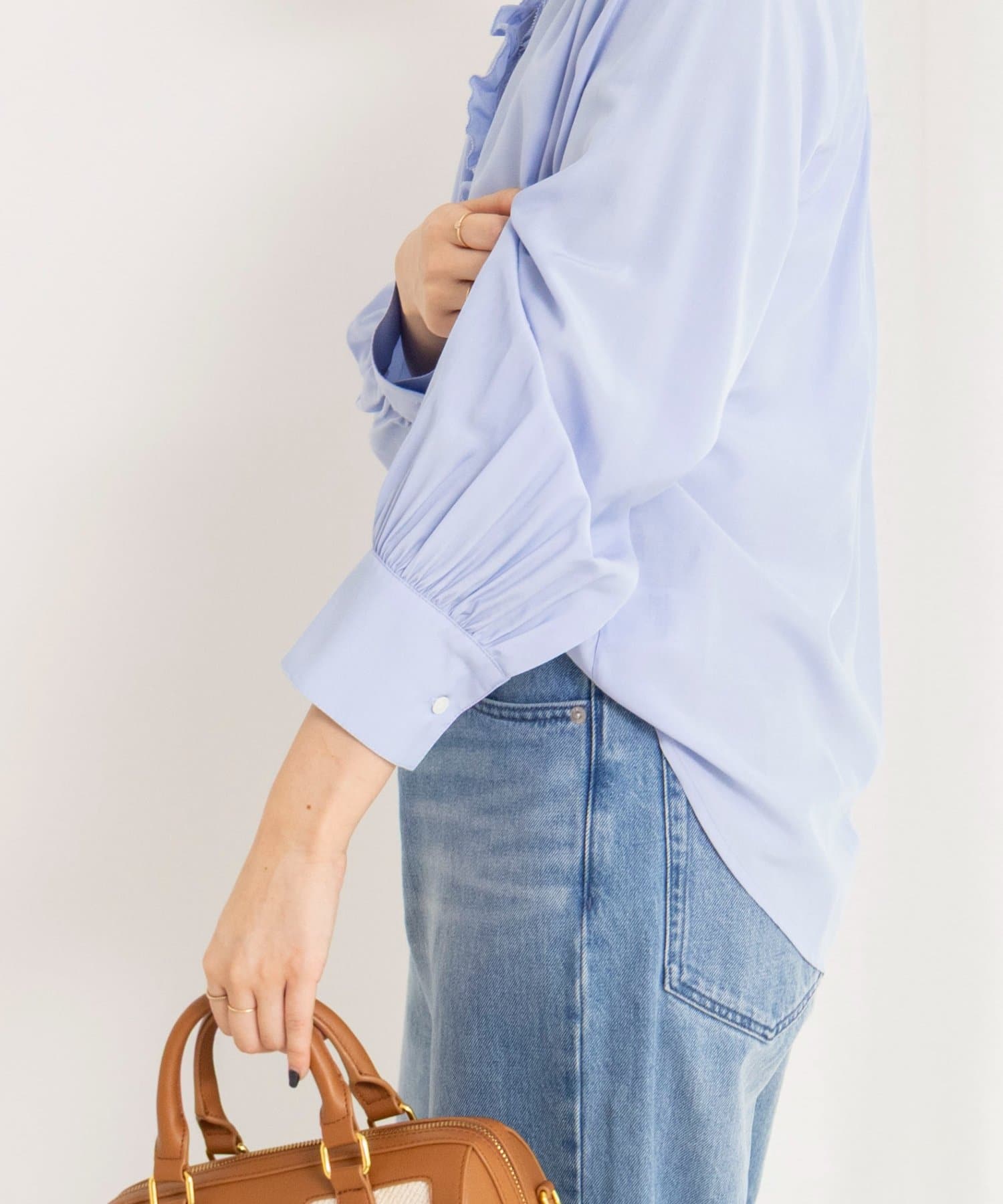 ・襟から前立てに続けてフリルの付いた華やかなブラウス