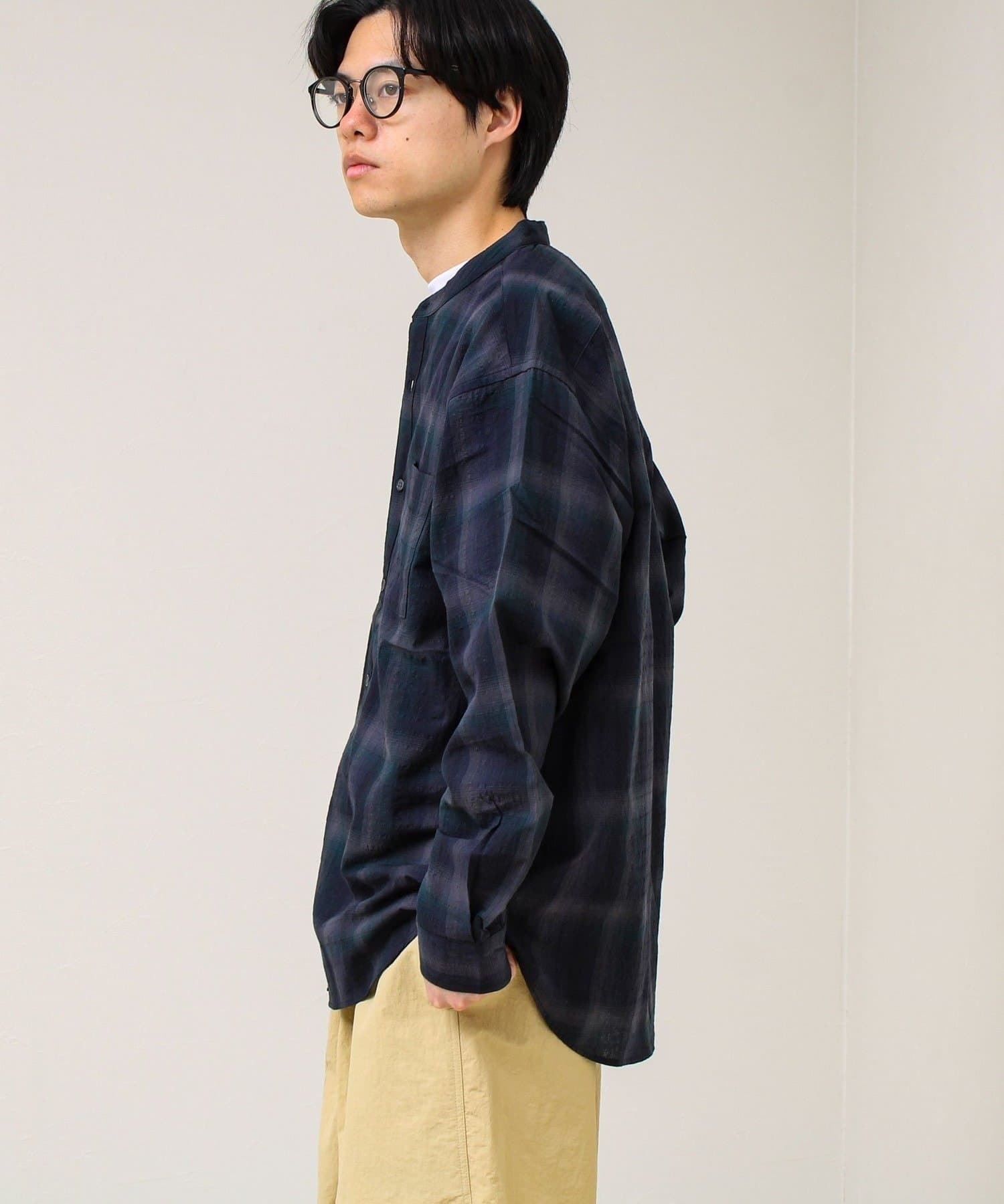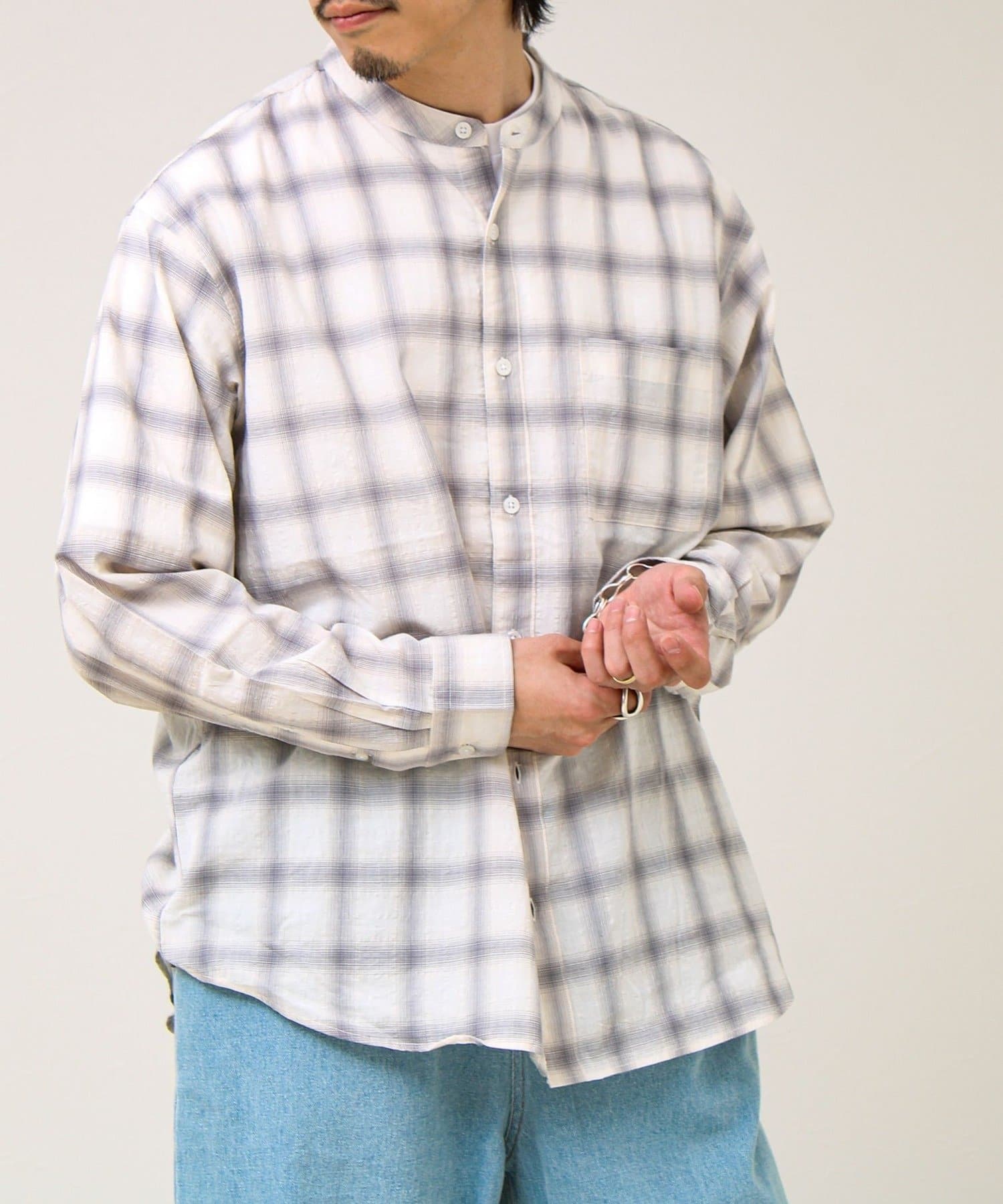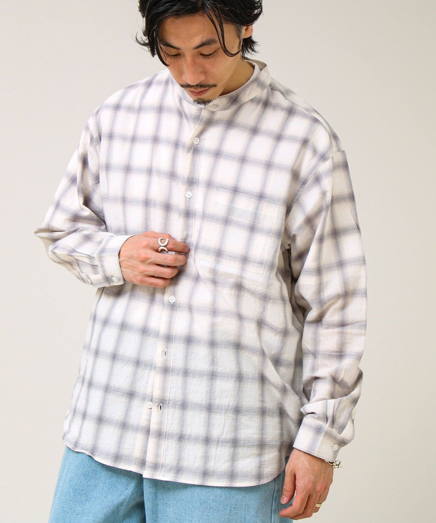 #FREDY&GLOSTER #GLOSTER #バンドカラーシャツ #チェックシャツ #テクスチャー素材 #春シャツ #夏シャツ #羽織り #軽アウター #大人カジュアル #きれいめカジュアル #レイヤード
