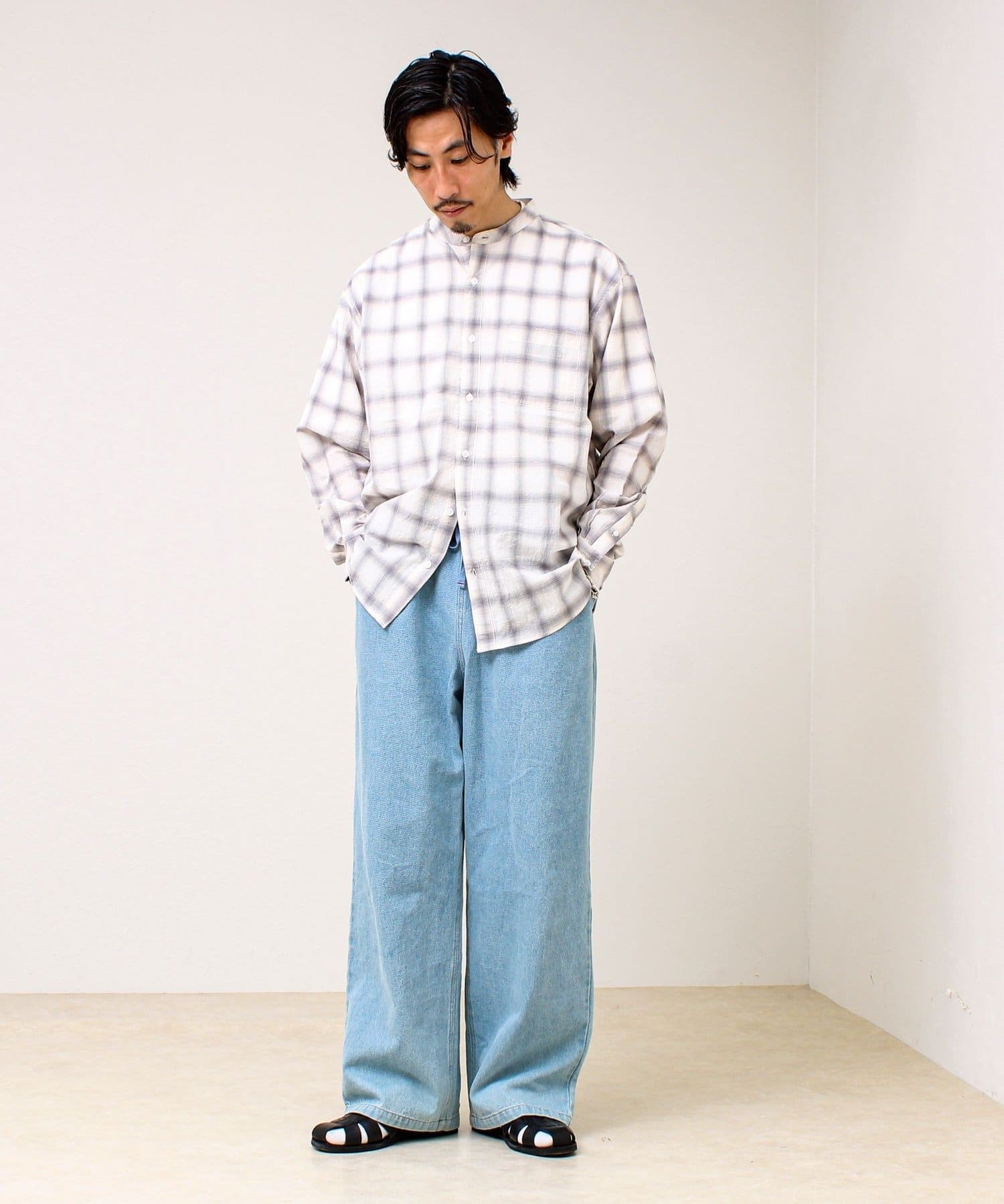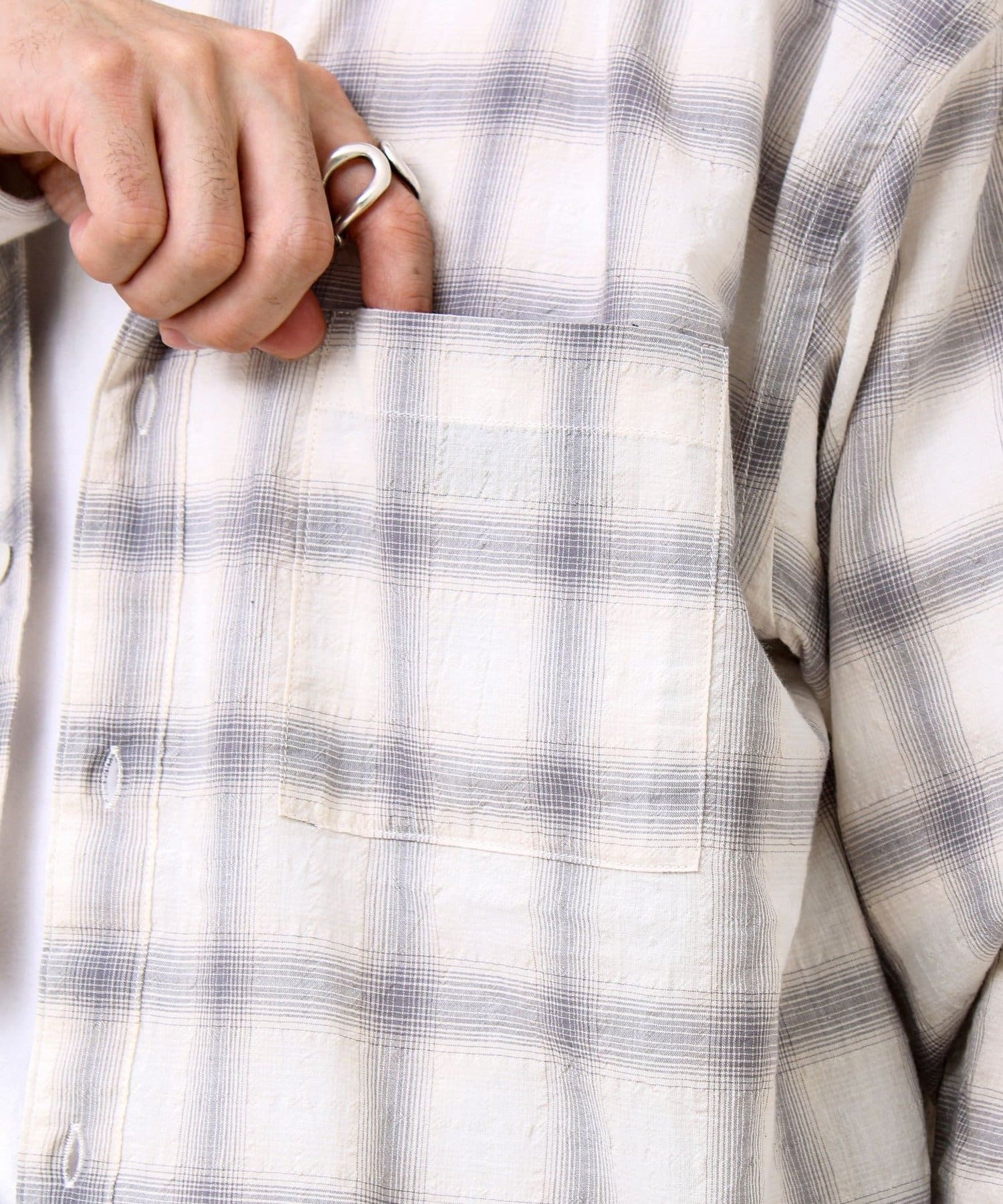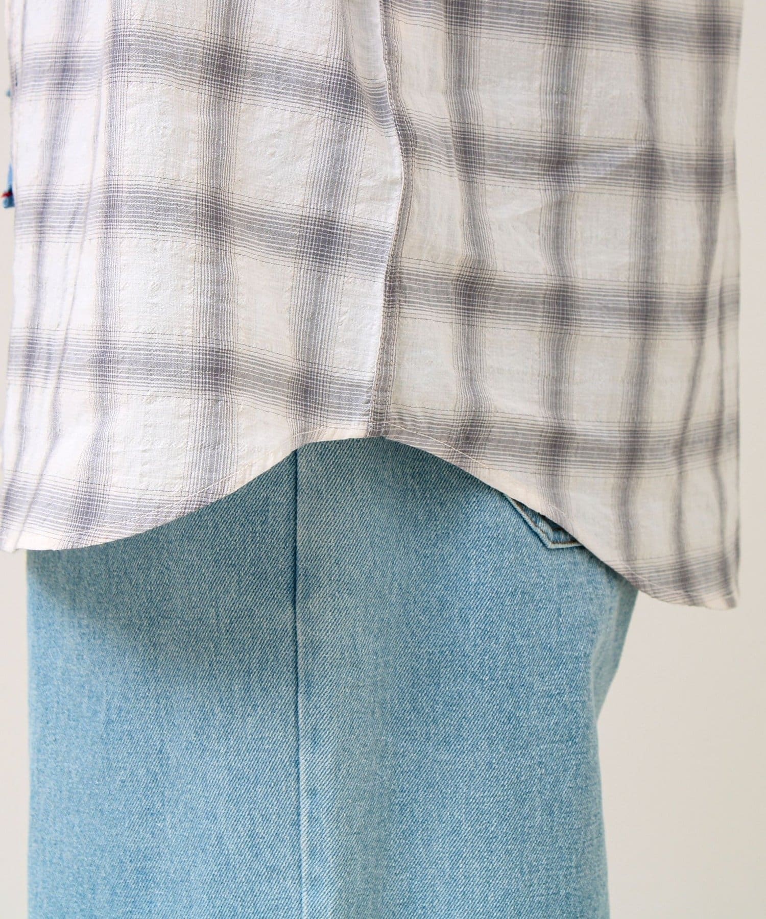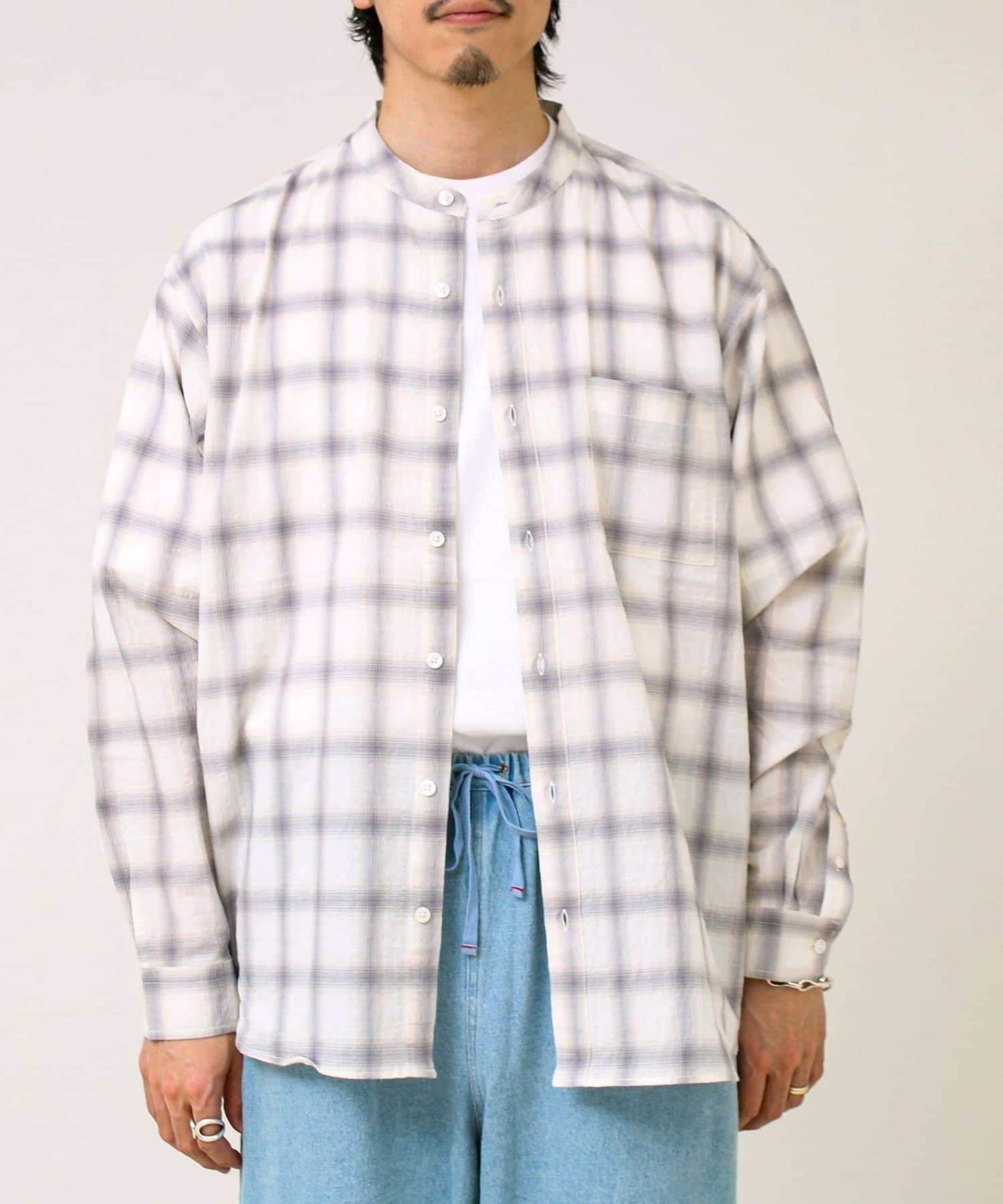 #FREDY&GLOSTER #GLOSTER #バンドカラーシャツ #チェックシャツ #テクスチャー素材 #春シャツ #夏シャツ #羽織り #軽アウター #大人カジュアル #きれいめカジュアル #レイヤード