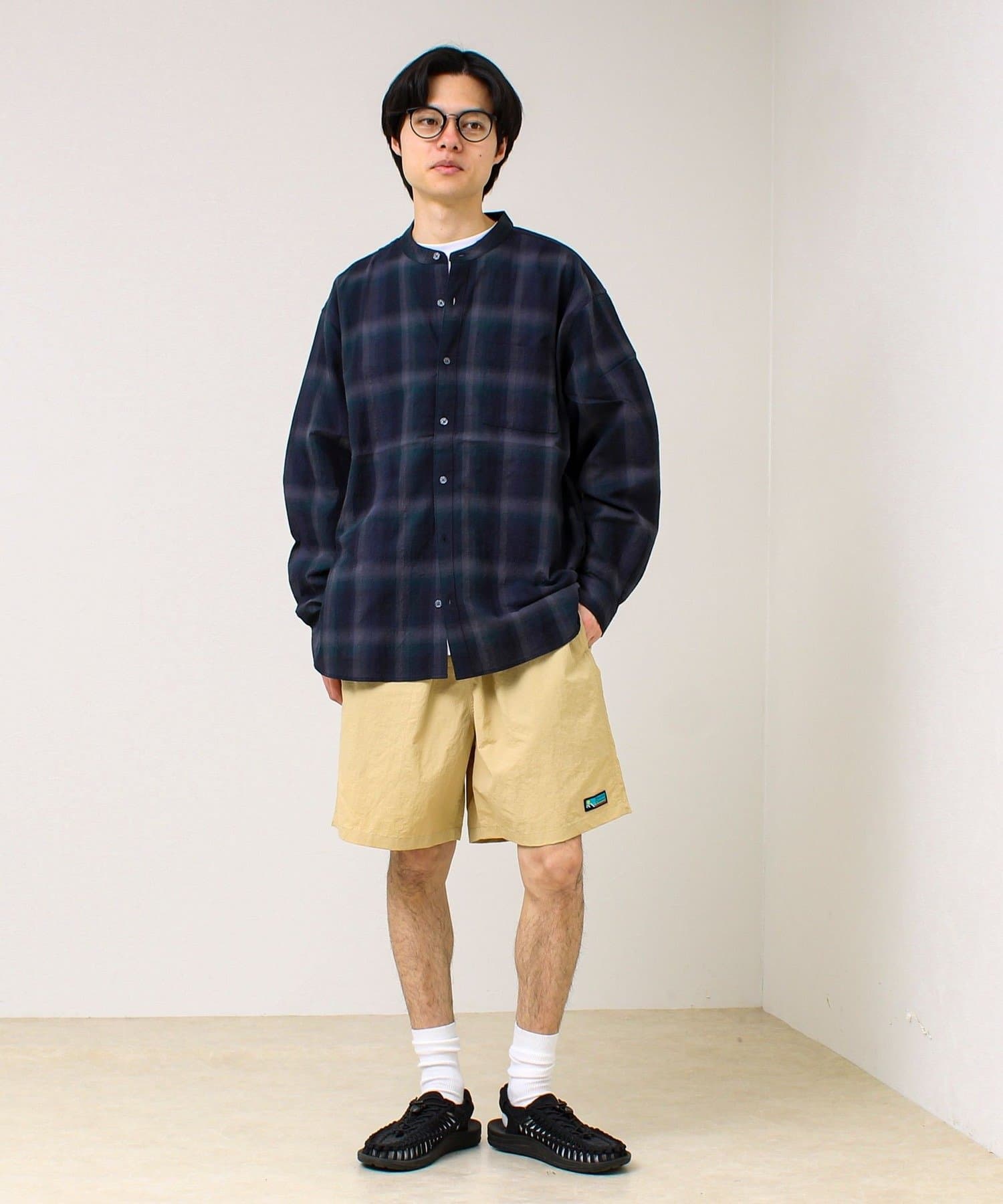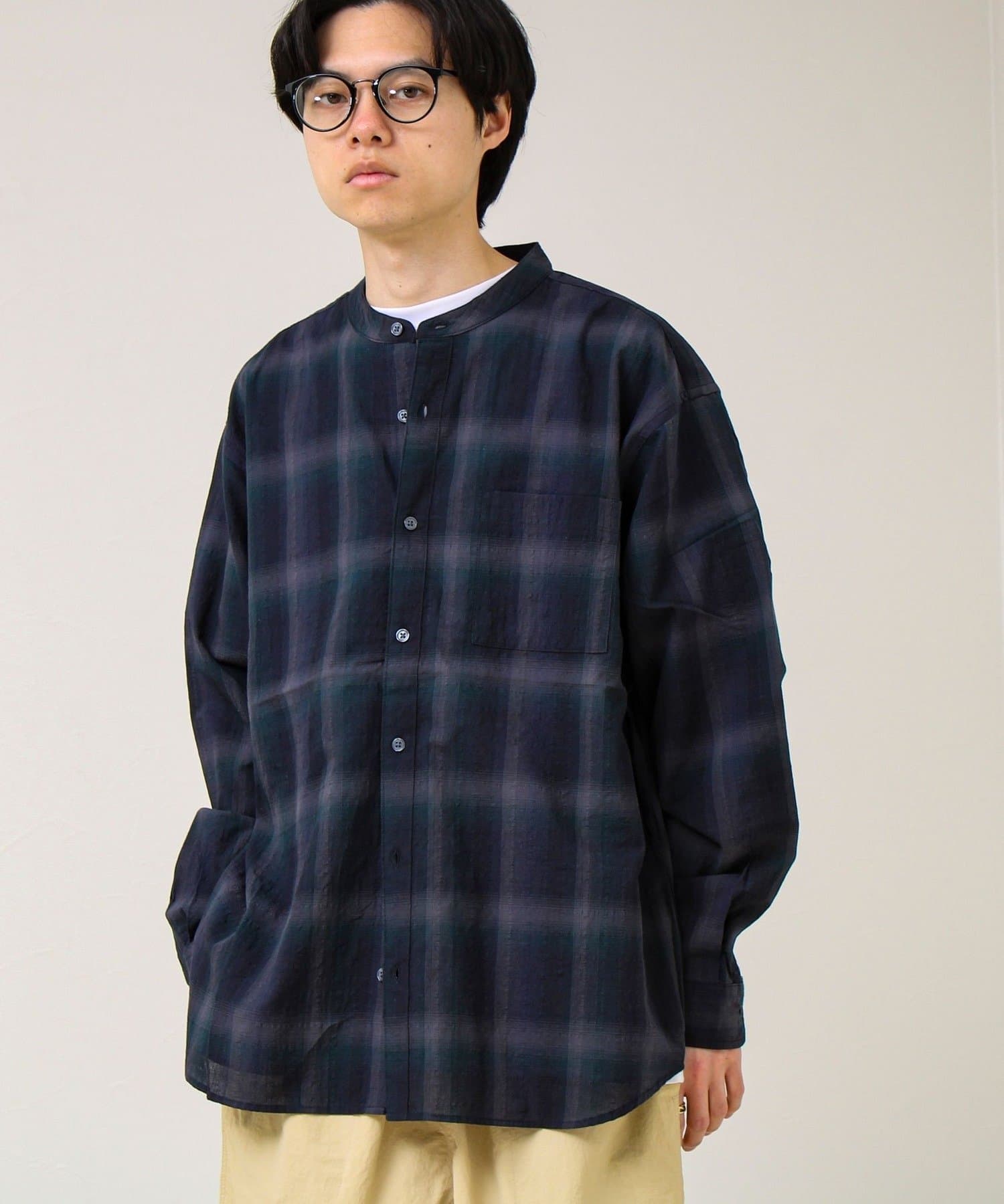 抜け感チェックで大人っぽい、軽やかバンドカラーシャツ