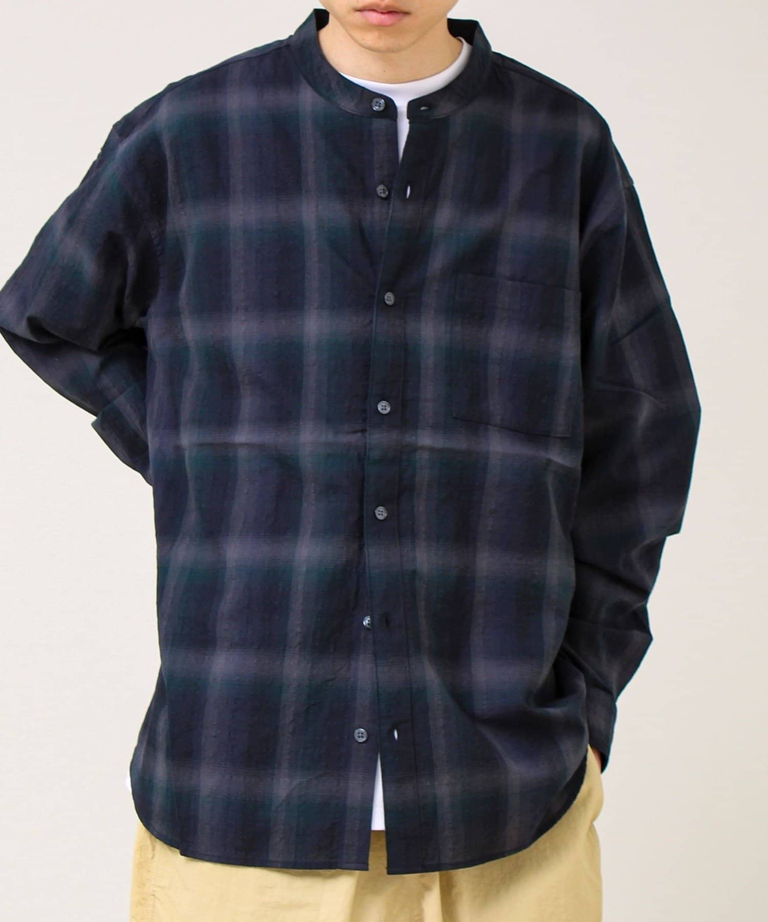 ・首元すっきりのバンドカラーで、羽織っても1枚でも“きれい見え”。Tシャツ合わせでもラフになりすぎないのが強み。