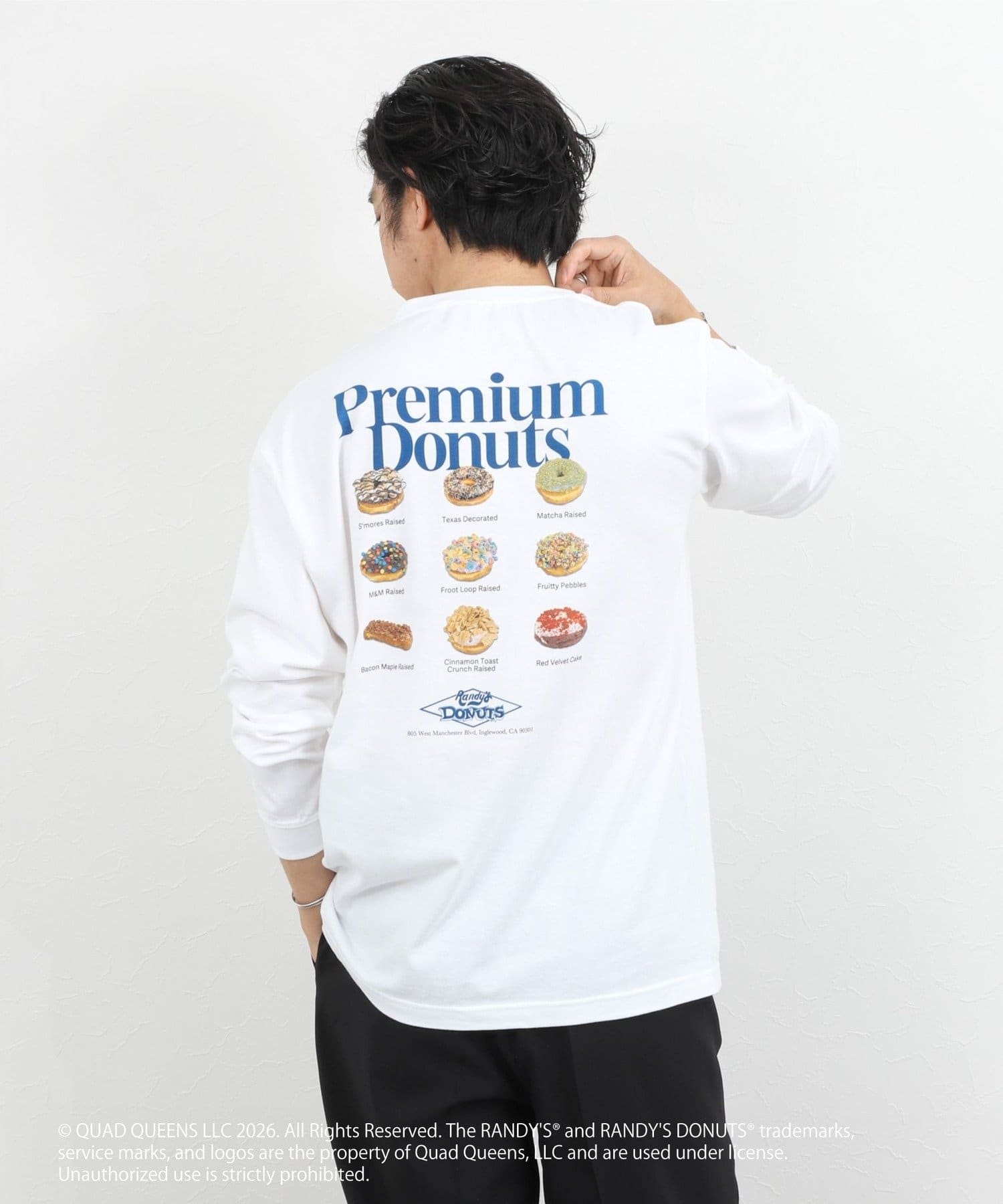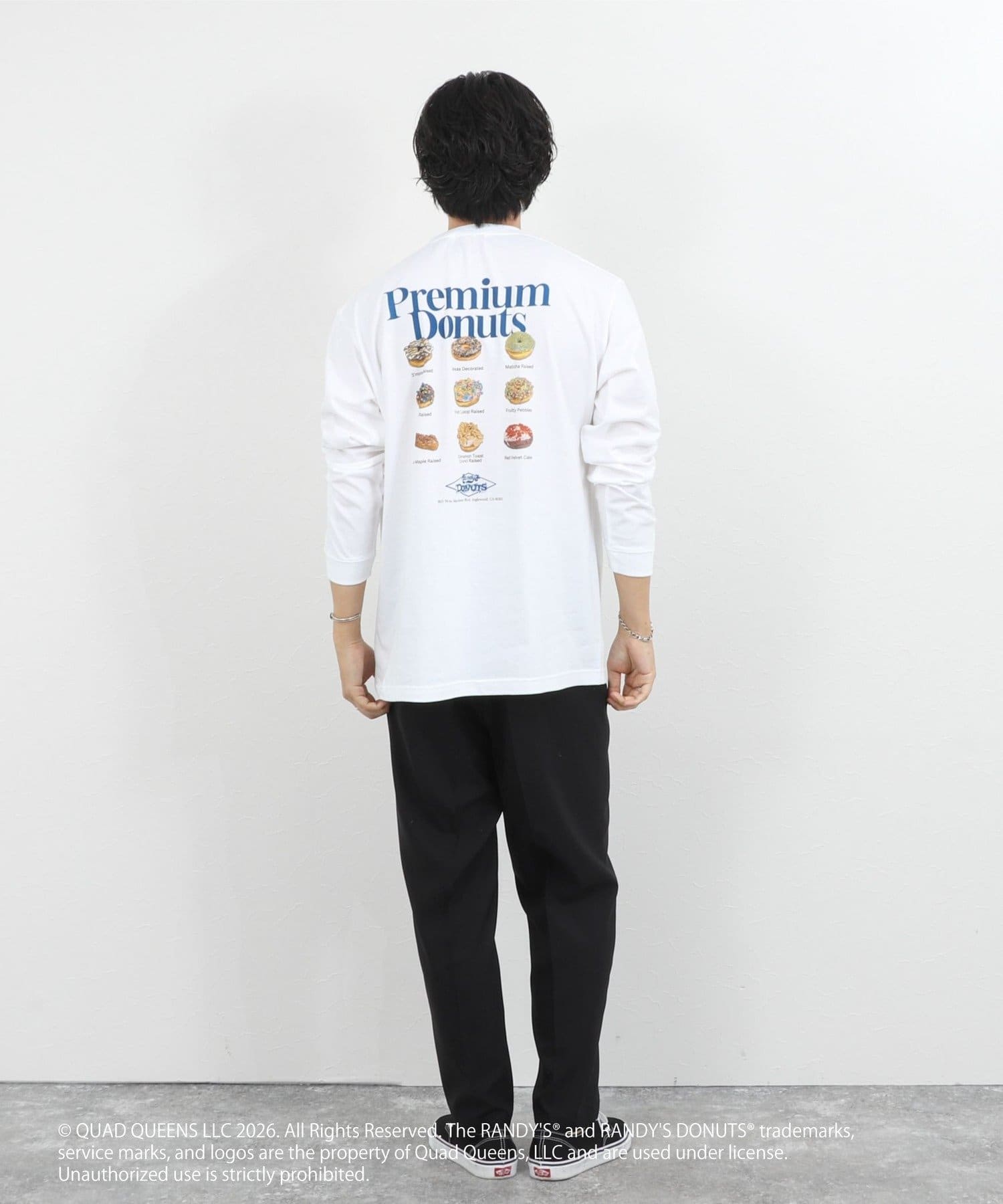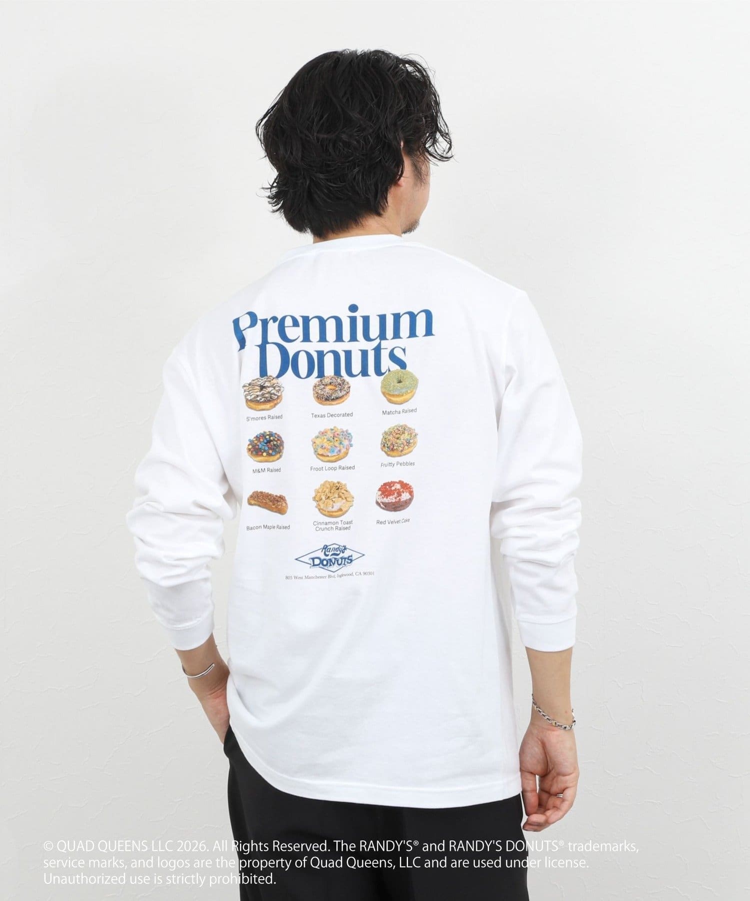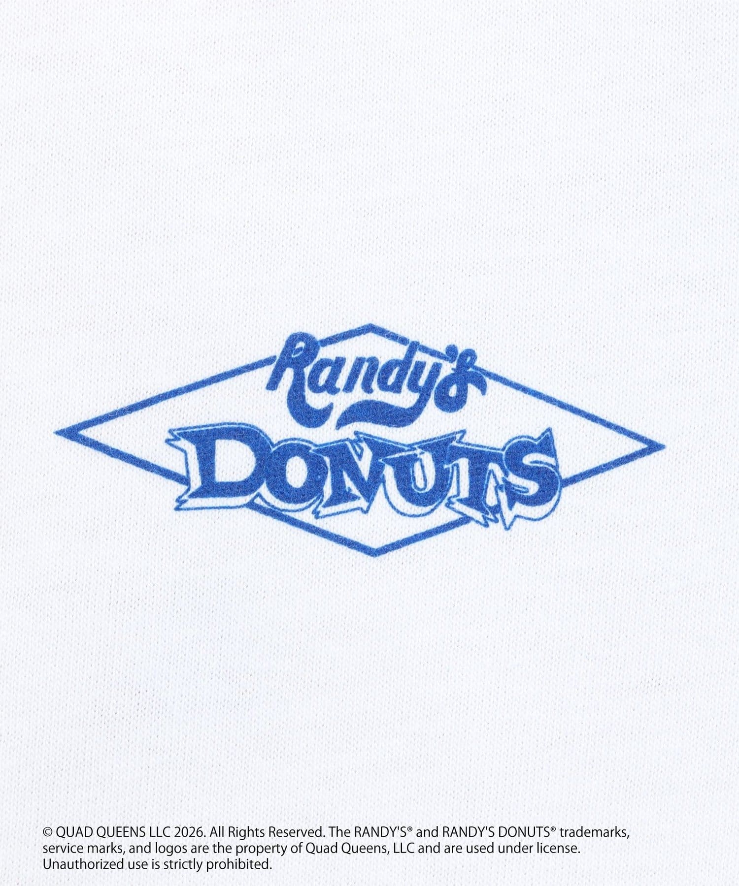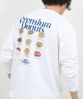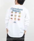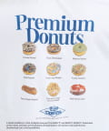 1952年にロサンゼルスで創業した大人気ドーナツ店。フロントはシンプルなロゴデザイン、バックには実際のメニューをモチーフにしたドーナツプリントを大胆に配置したデザイン。