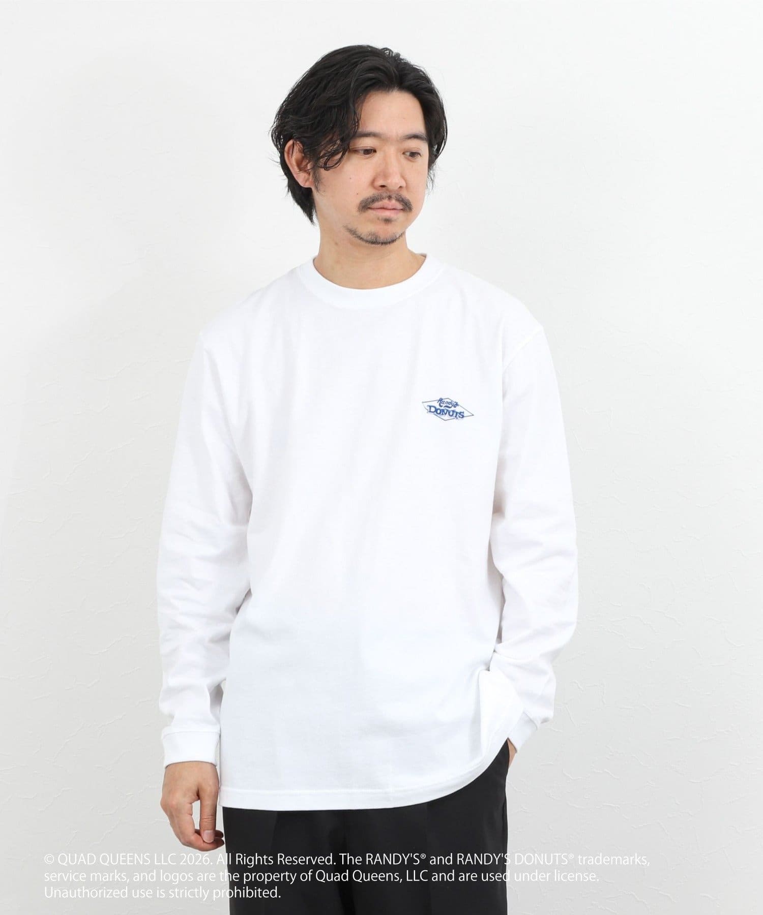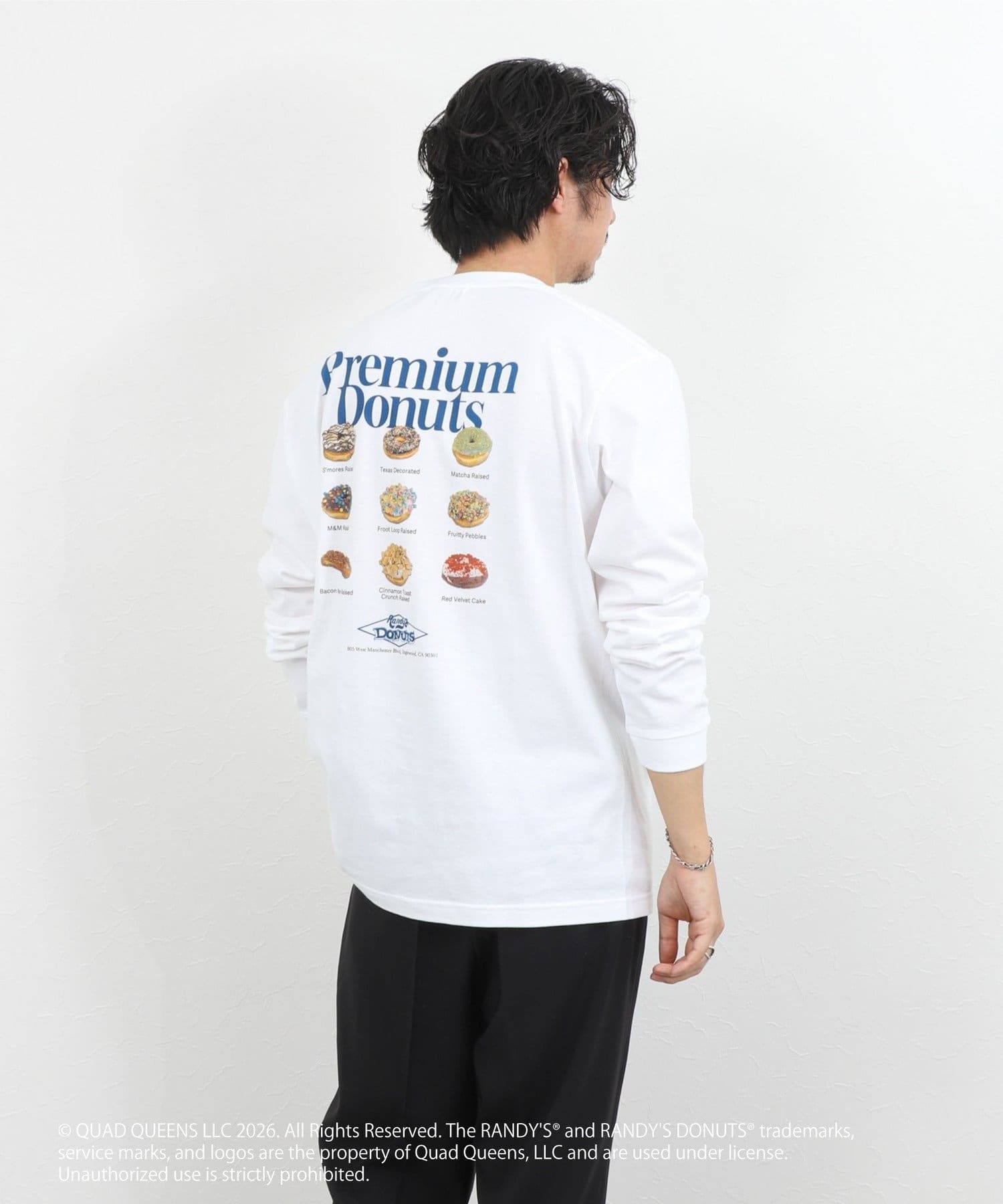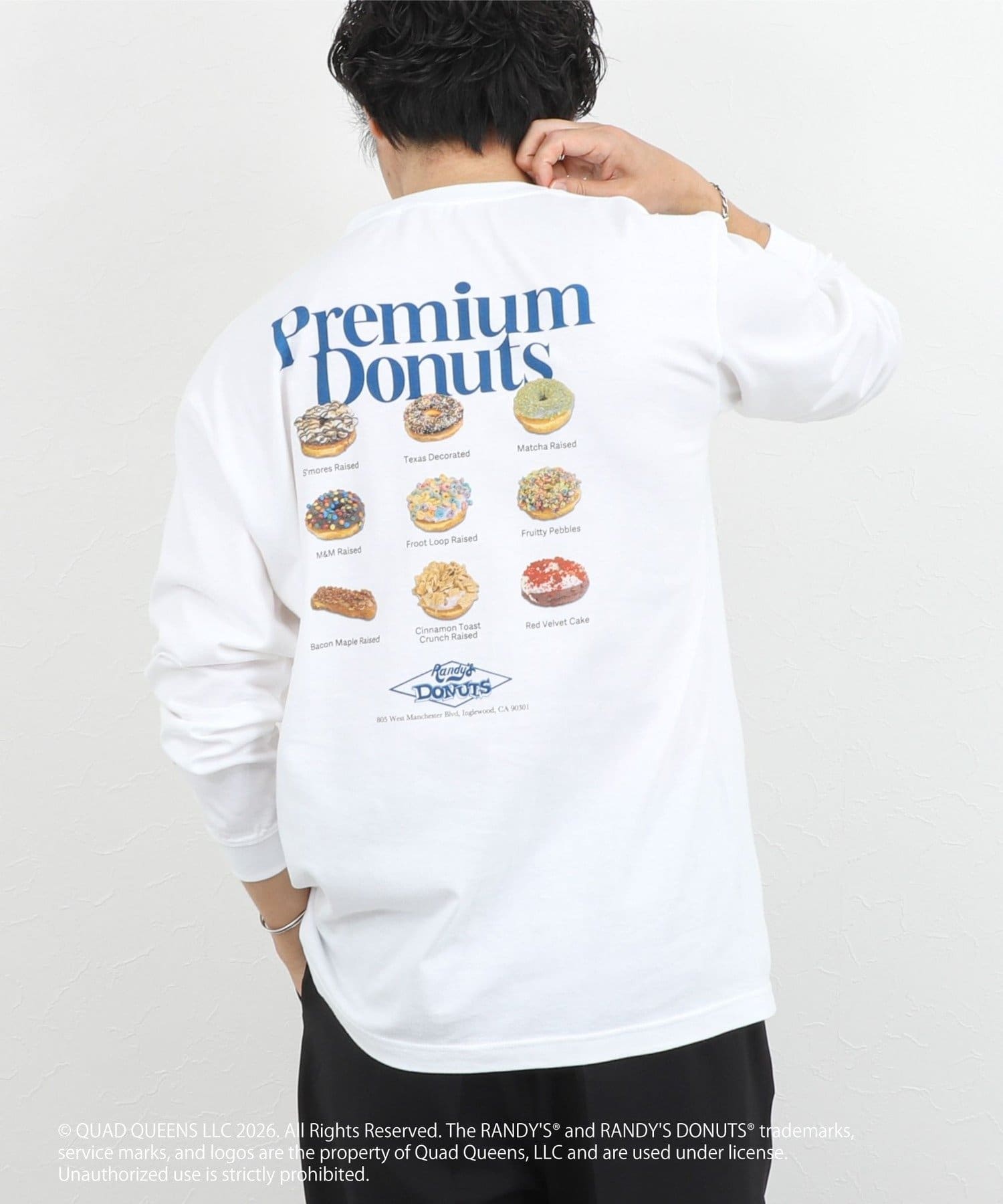 1952年にロサンゼルスで創業した大人気ドーナツ店。フロントはシンプルなロゴデザイン、バックには実際のメニューをモチーフにしたドーナツプリントを大胆に配置したデザイン。