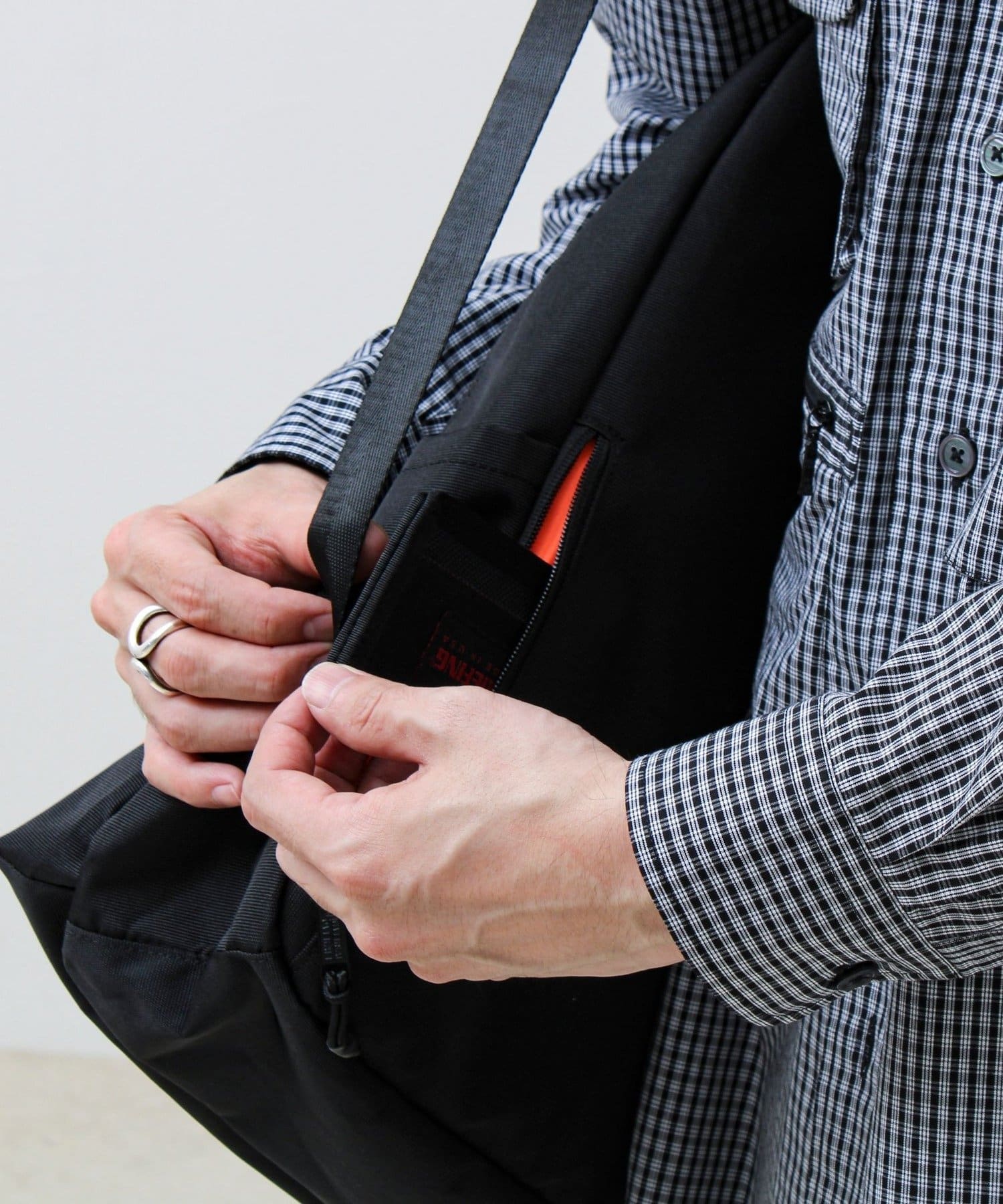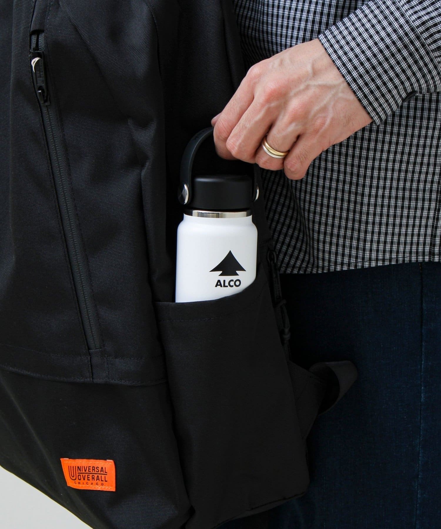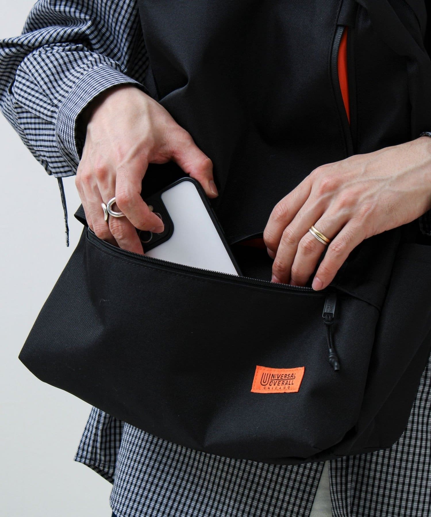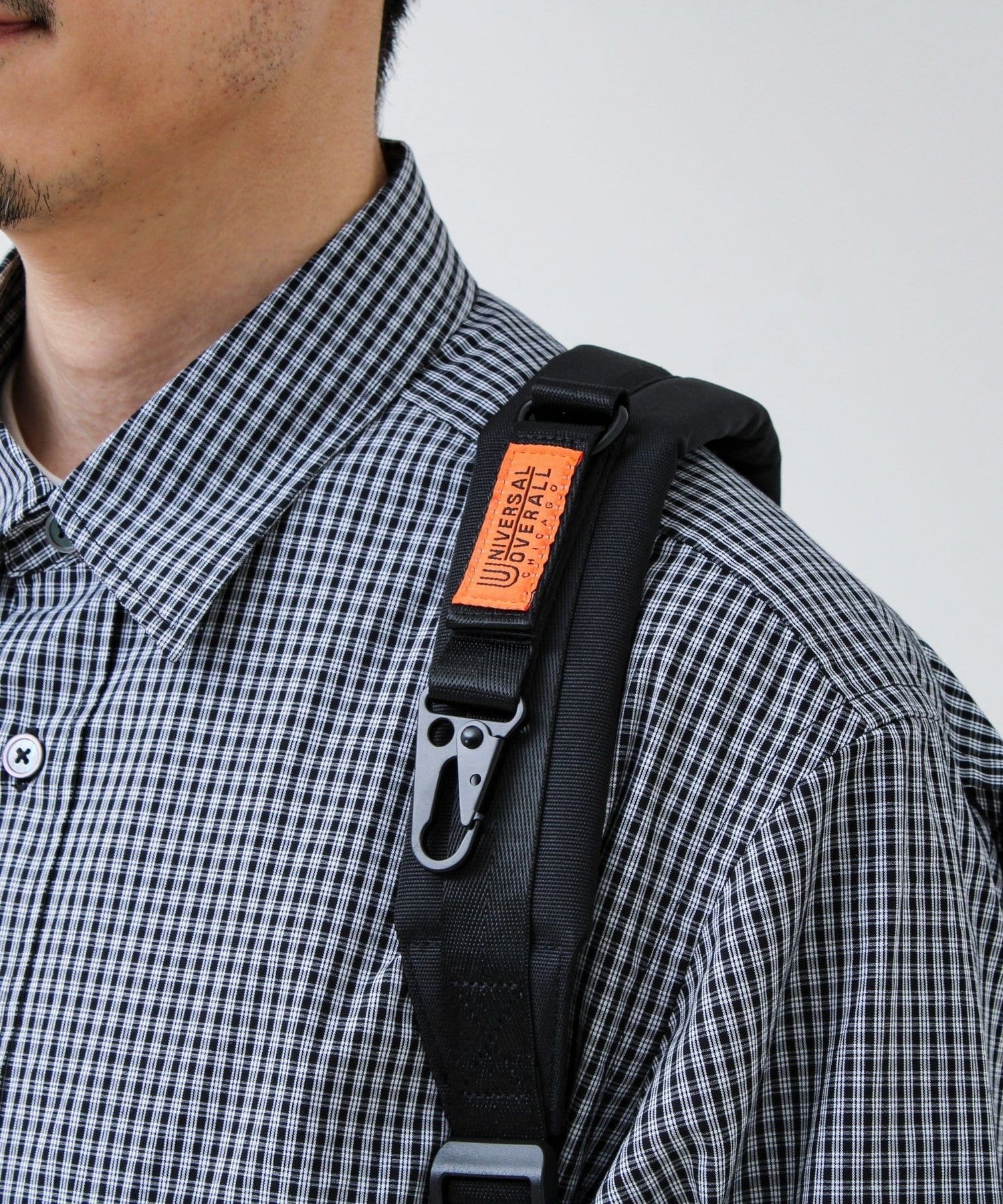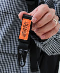 ショルダーストラップに付けたミリタリーテイストのキーパーホルダーはデザイン的にも◎ 「UNIVERSAL OVERALL」の特徴的なオレンジタグもアクセントになっています。