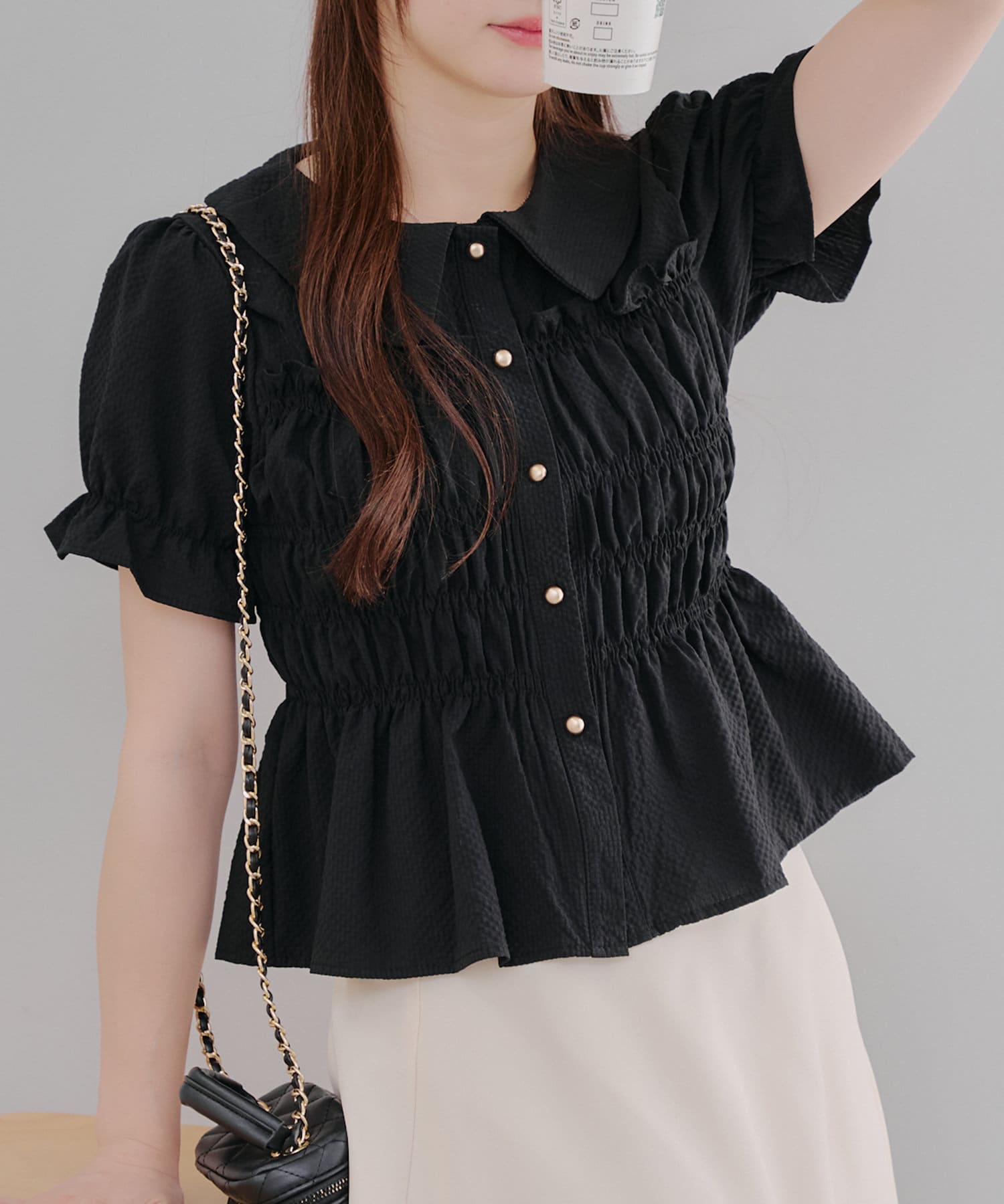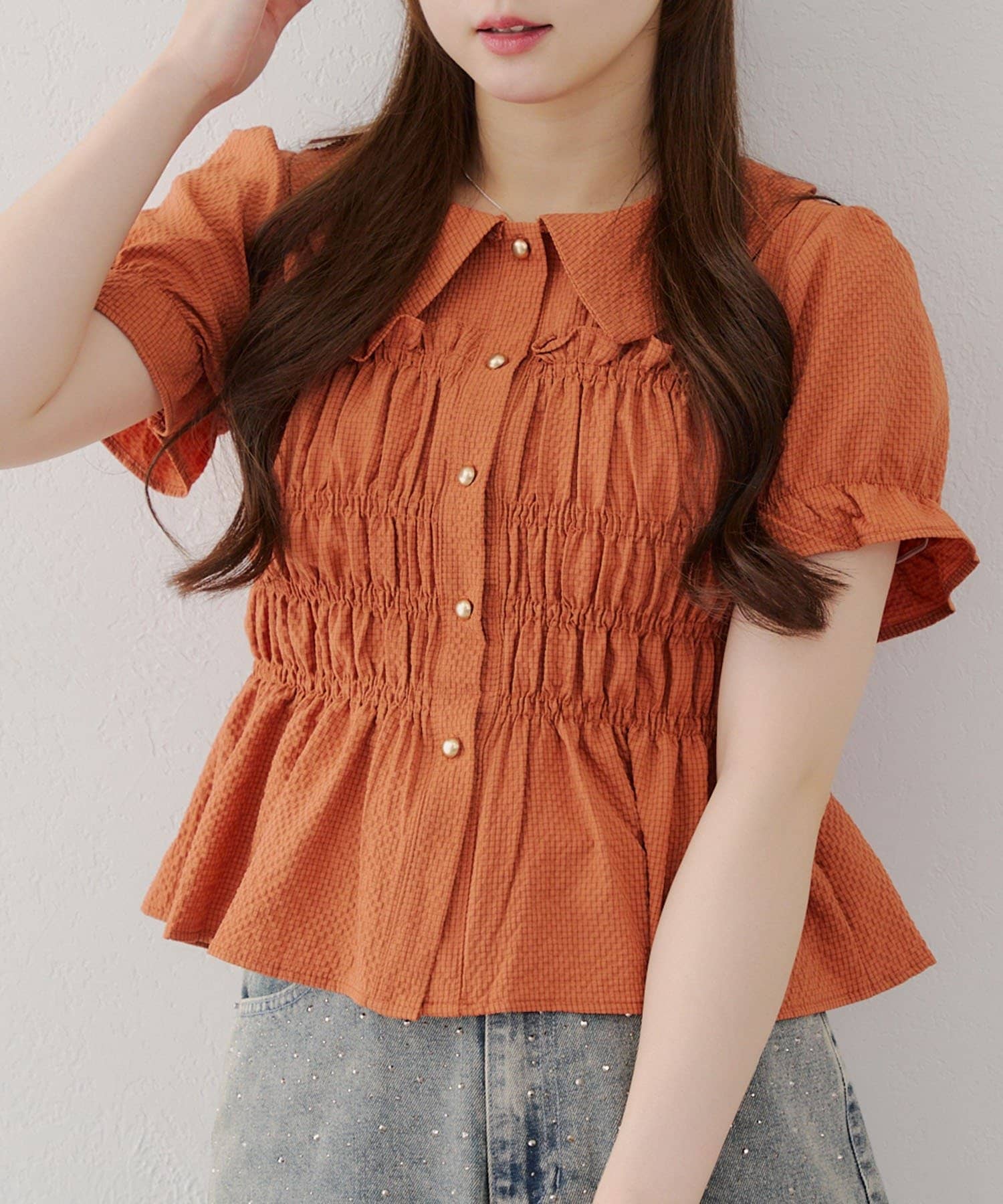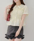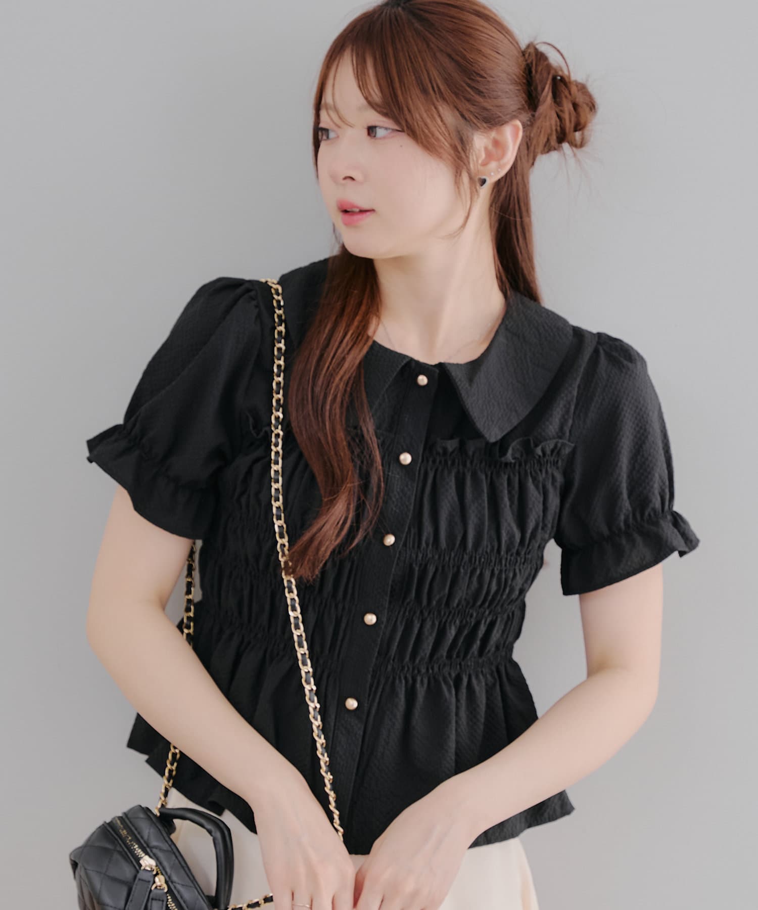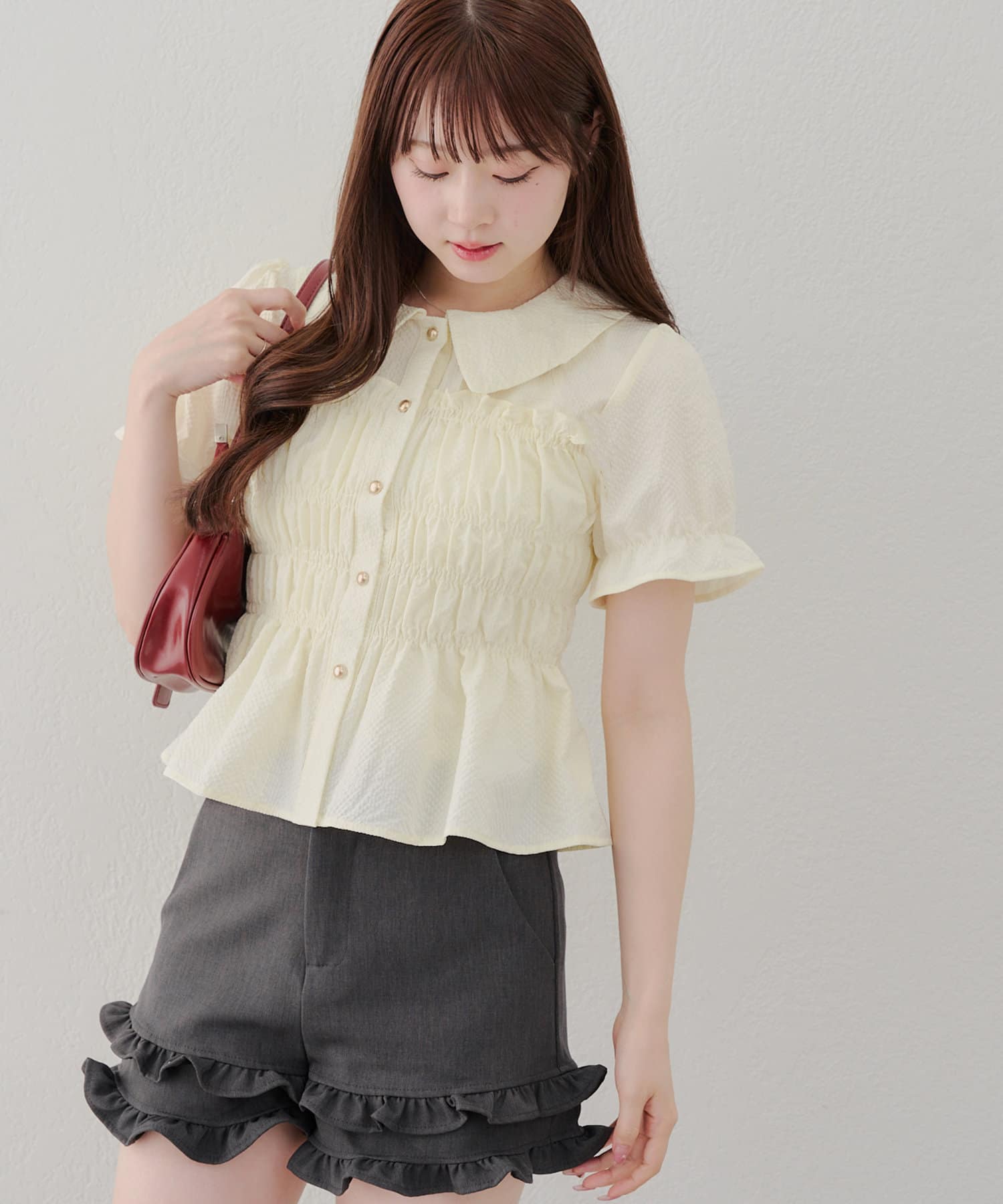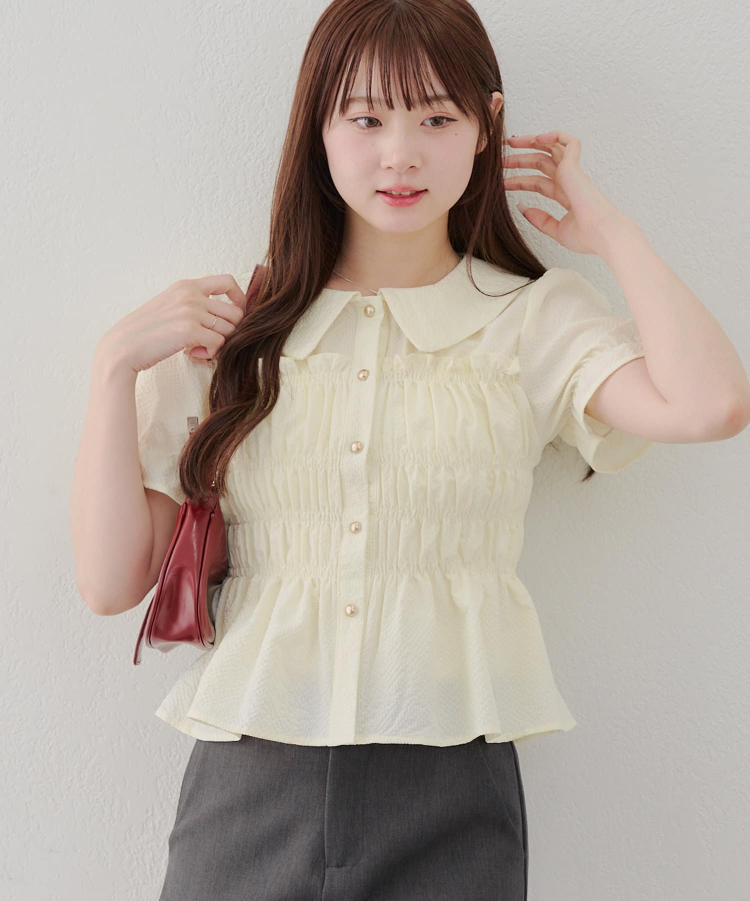 トレンド韓国ガーリーコーデに♪シャーリング衿付ブラウス