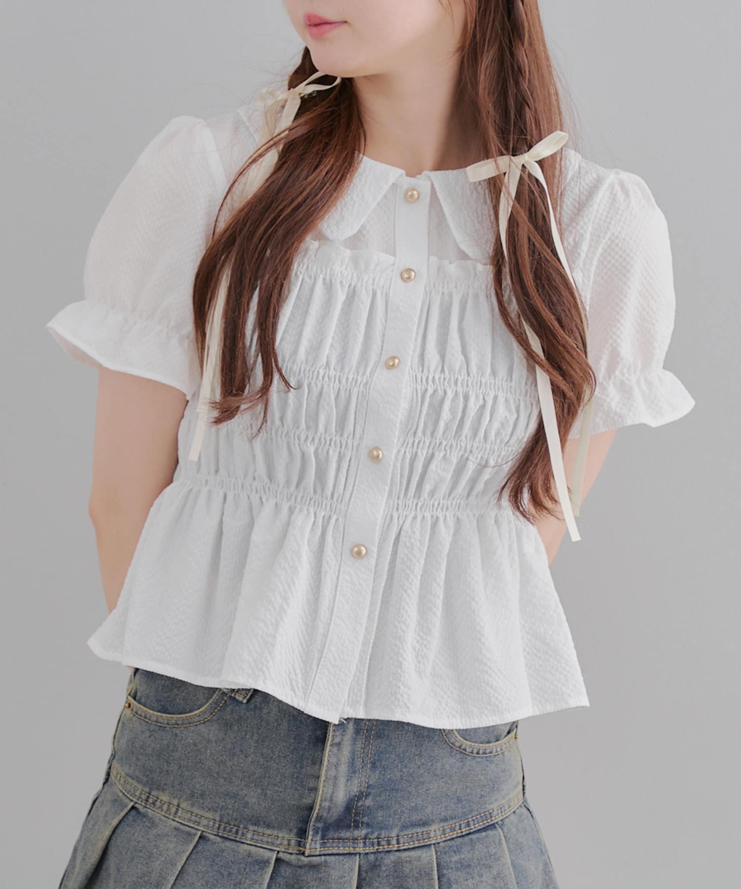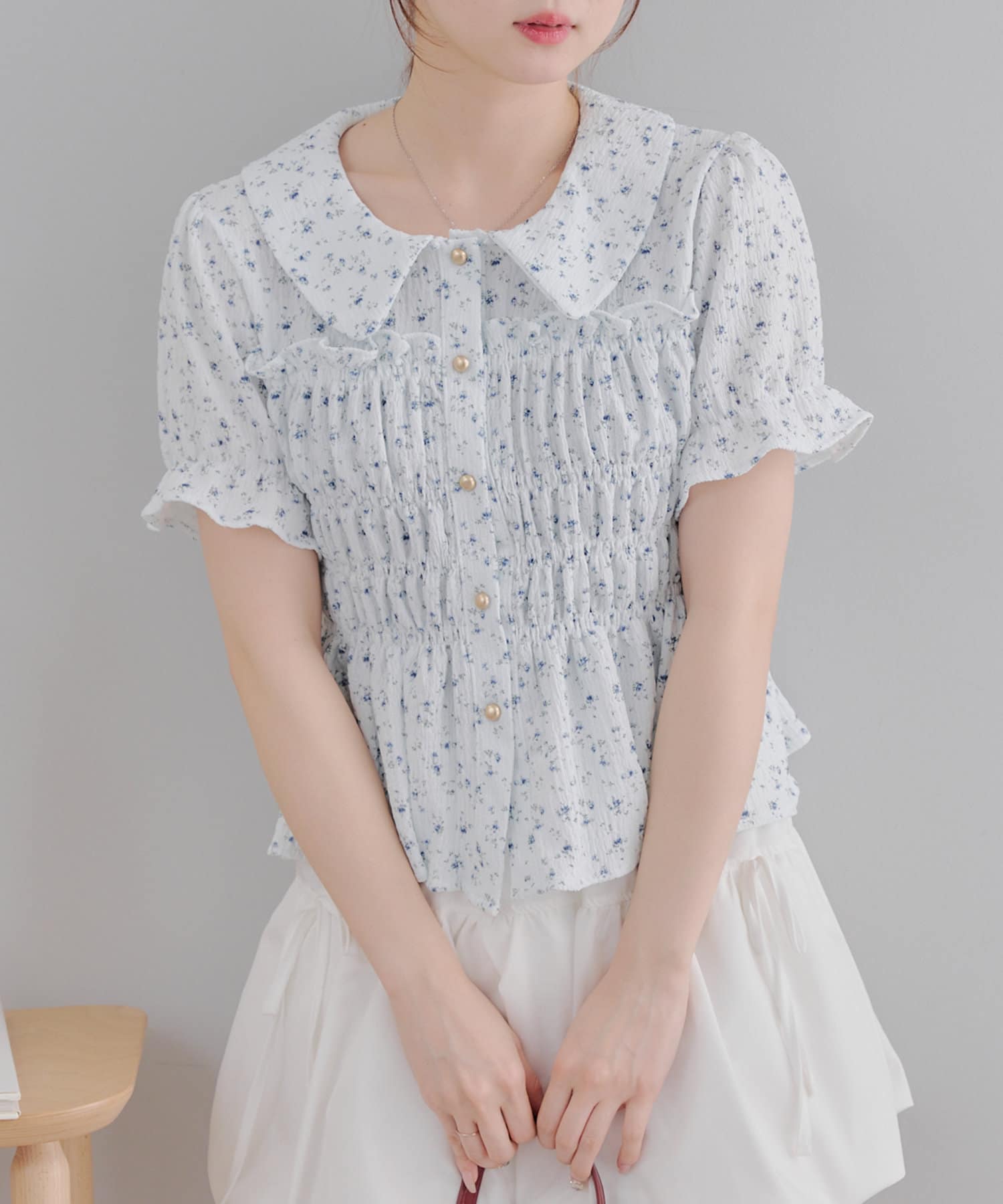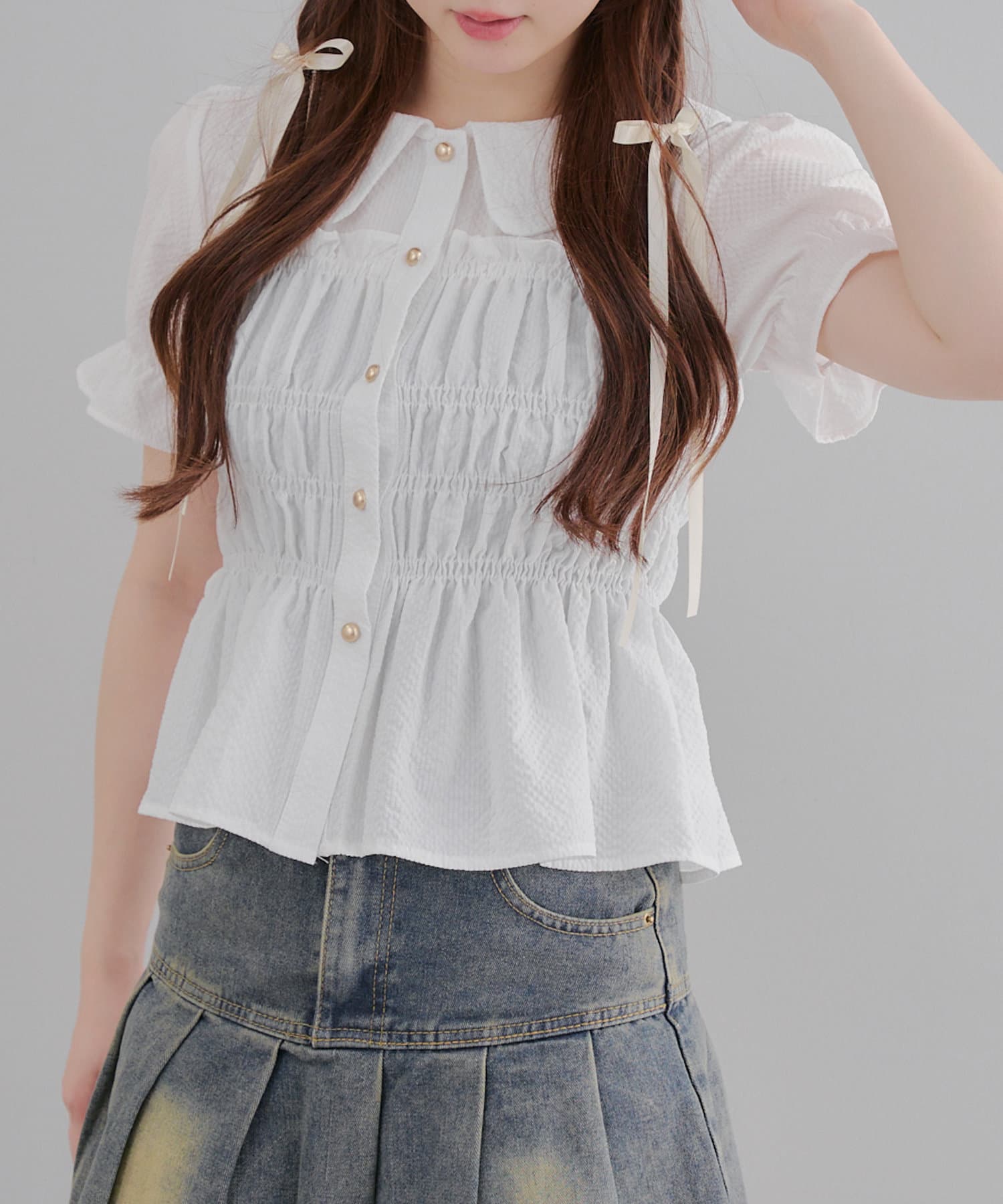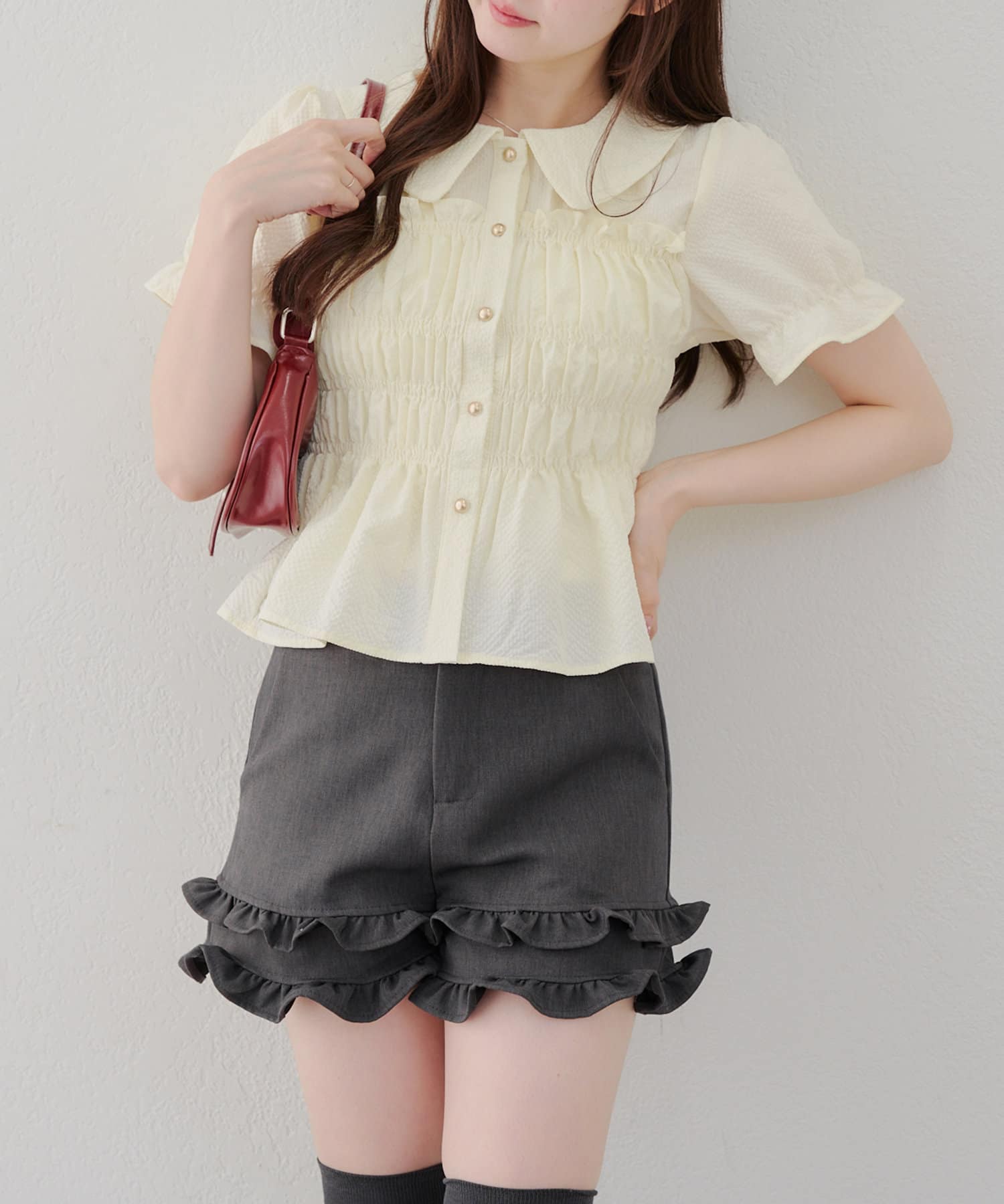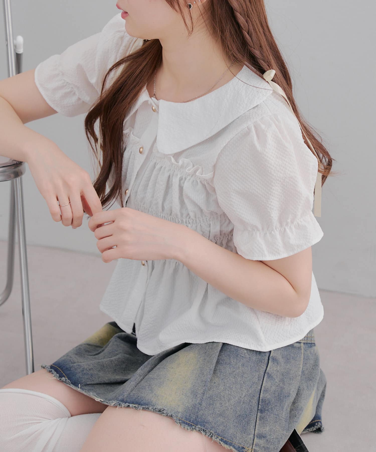 トレンド韓国ガーリーコーデに♪シャーリング衿付ブラウス