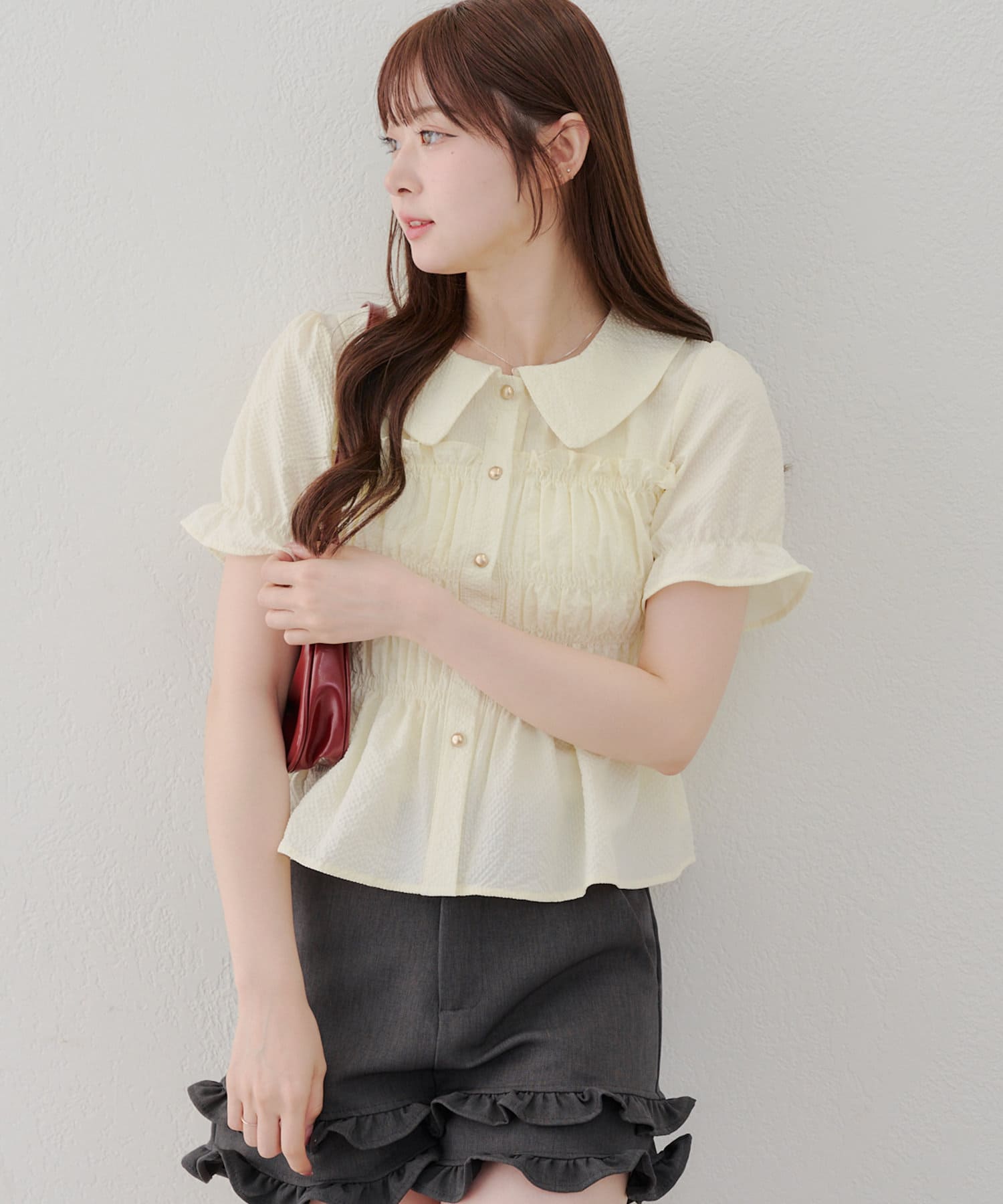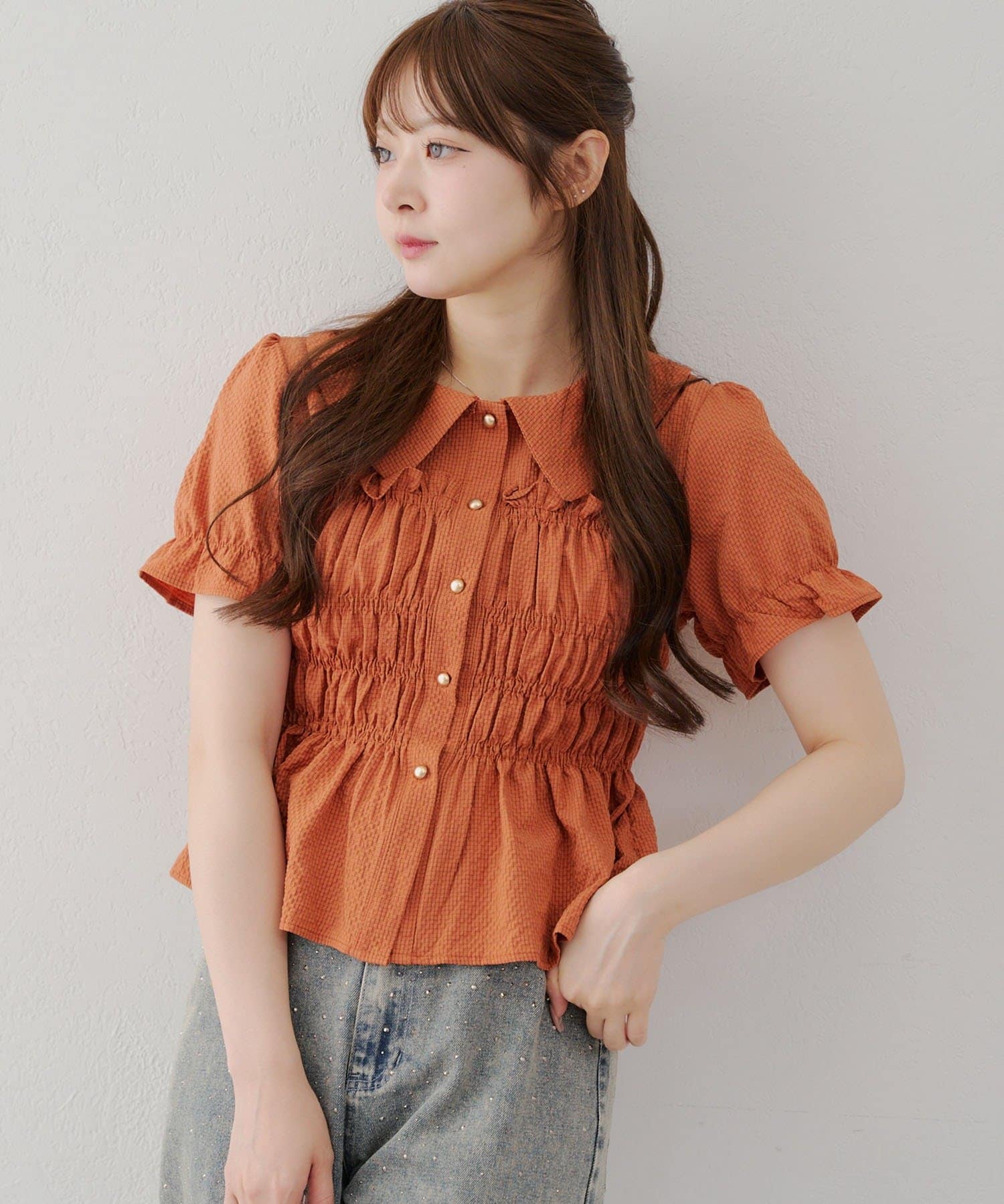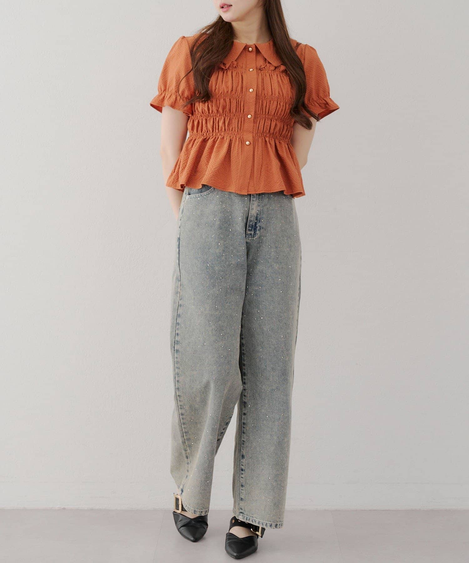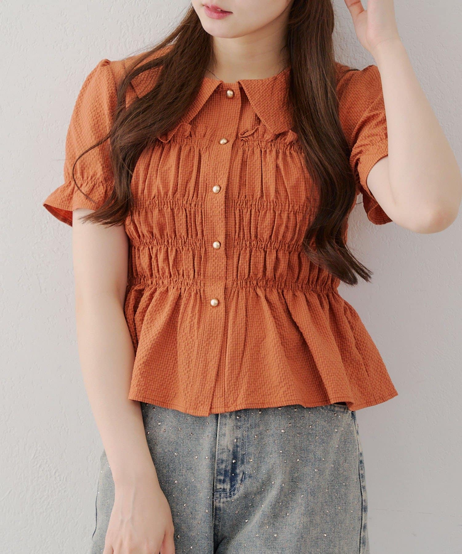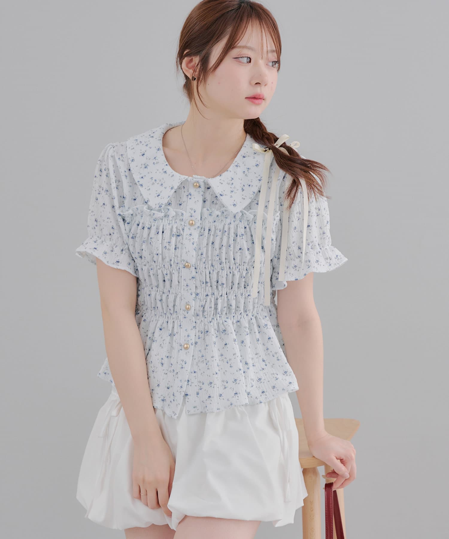 トレンド韓国ガーリーコーデに♪シャーリング衿付ブラウス