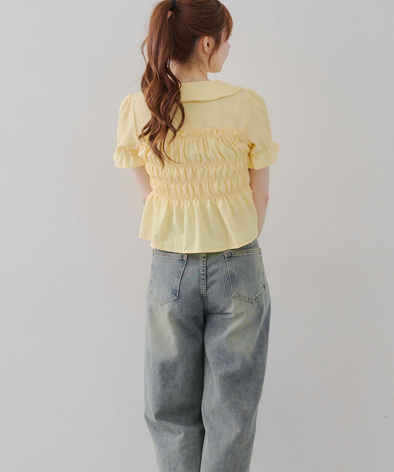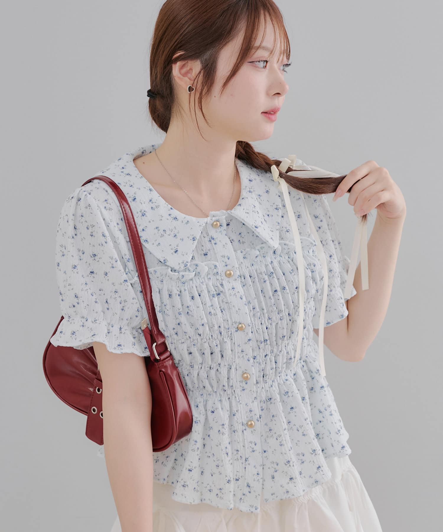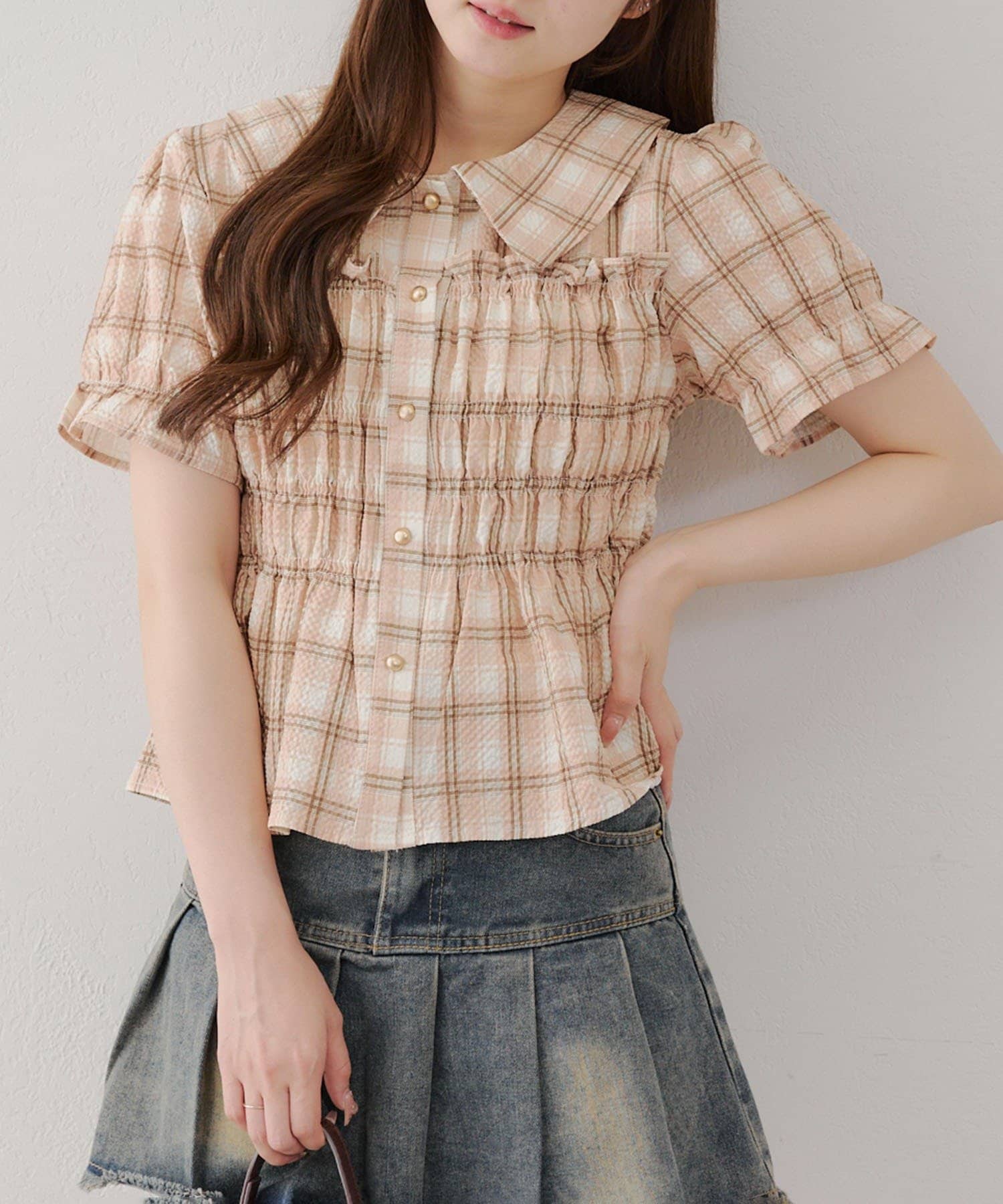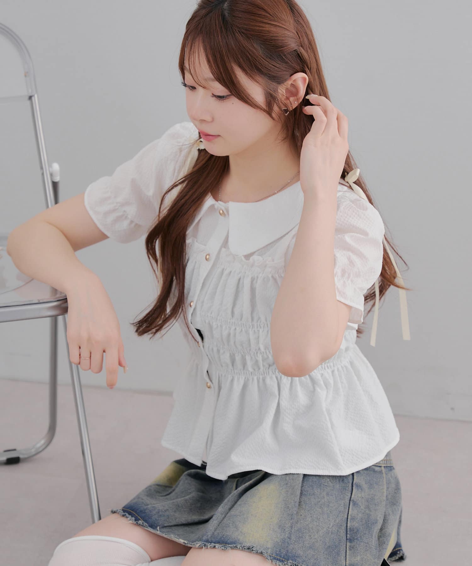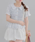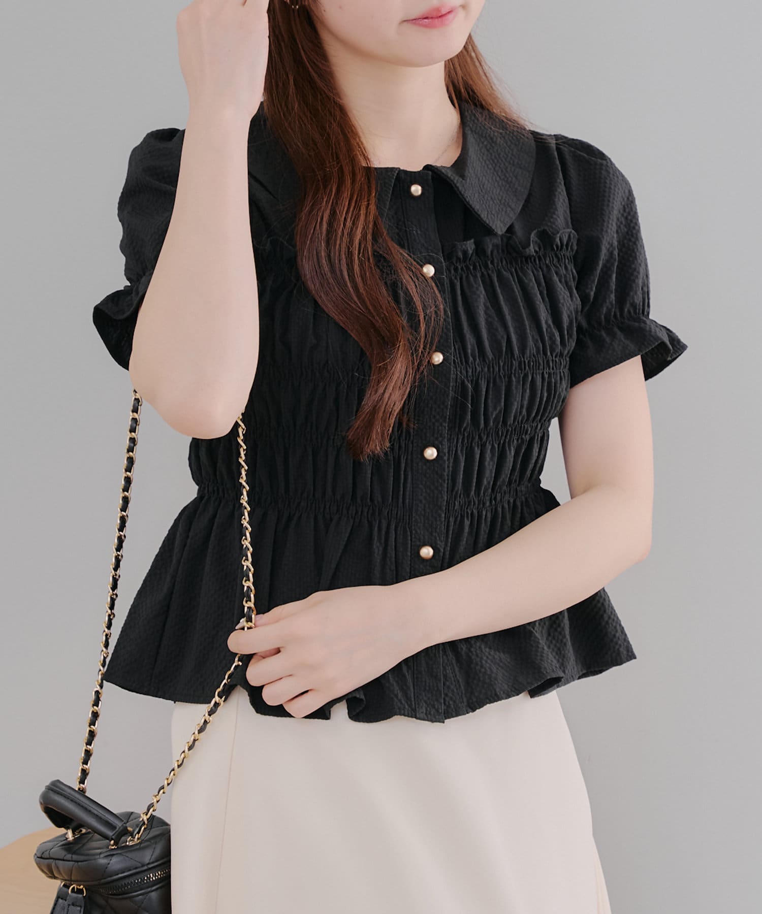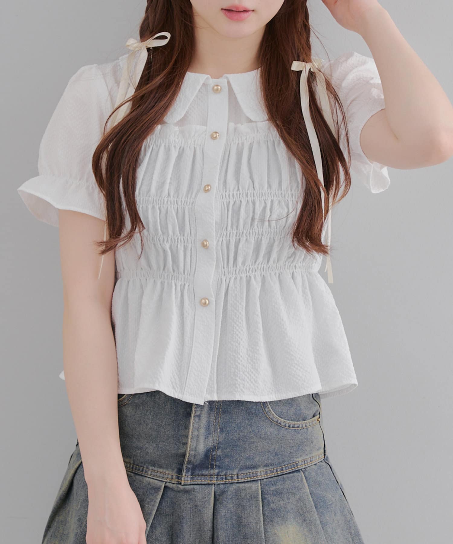 トレンド韓国ガーリーコーデに♪シャーリング衿付ブラウス